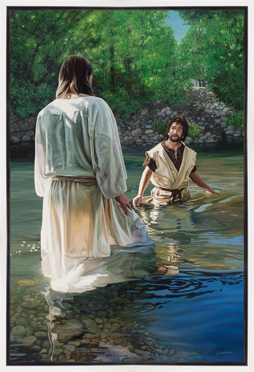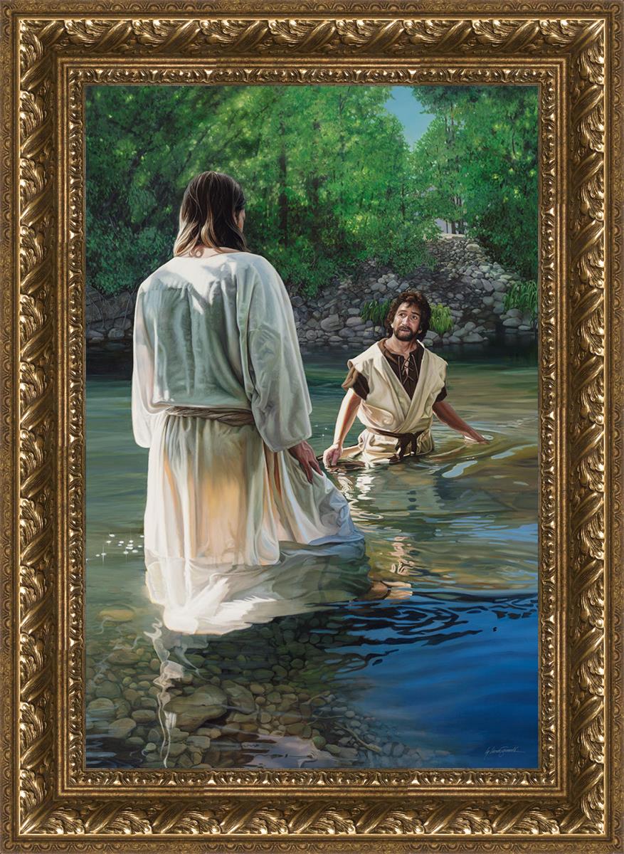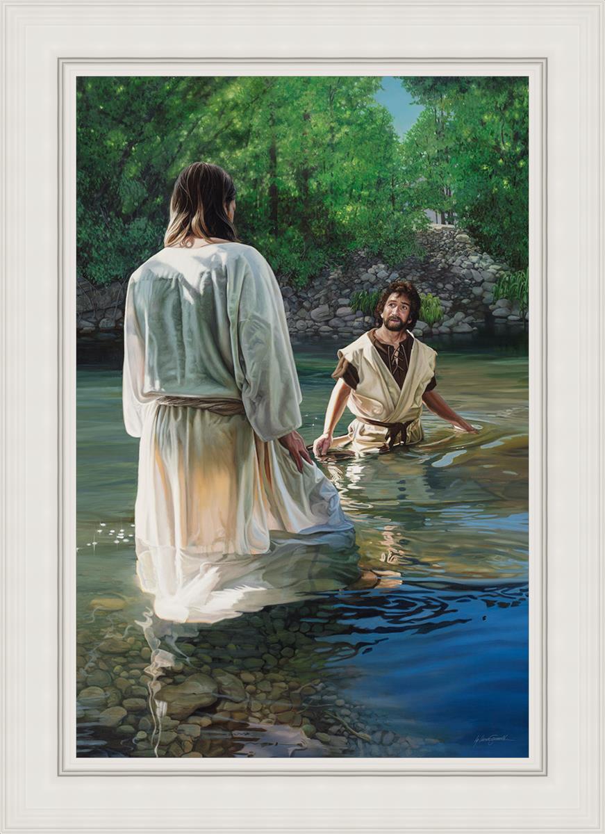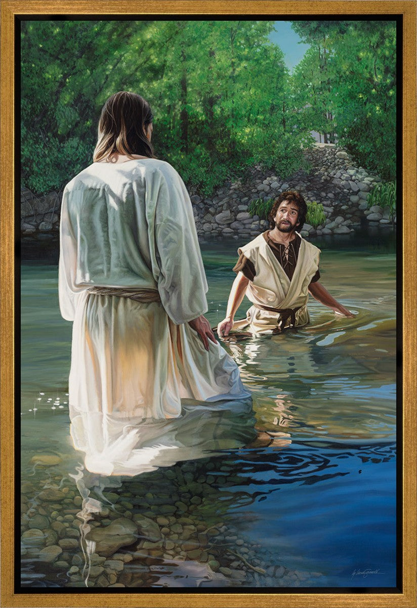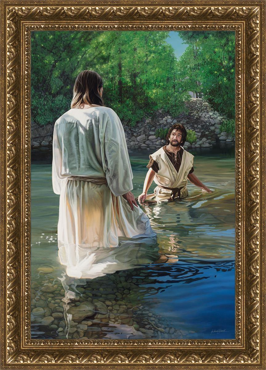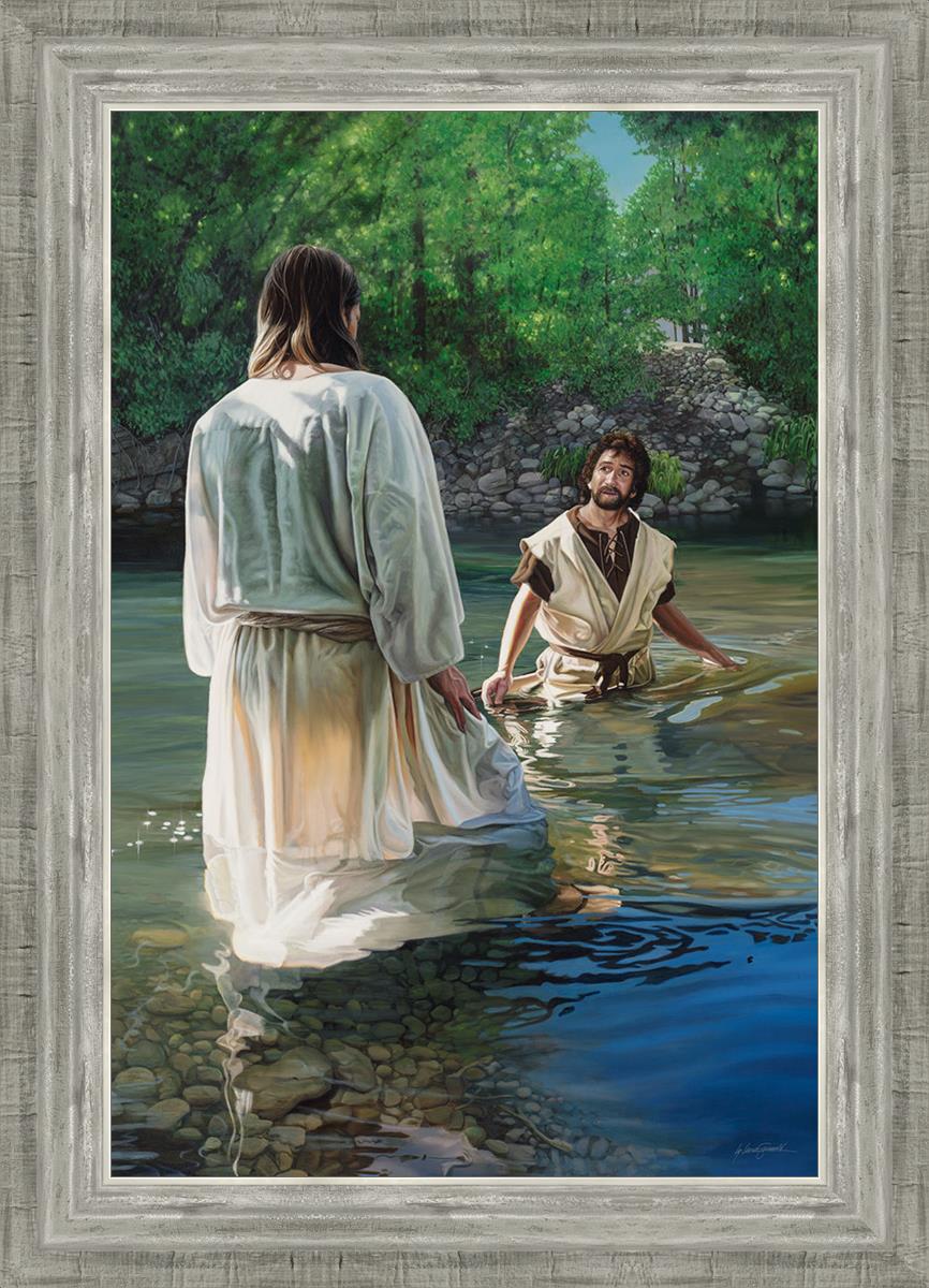 This beautiful painting by Liz Lemon Swindle depicts Jesus Christ being baptized by John the Baptist. Her depiction is of him entering the water, a special moment different from many depictions demonstrating his actual baptism.