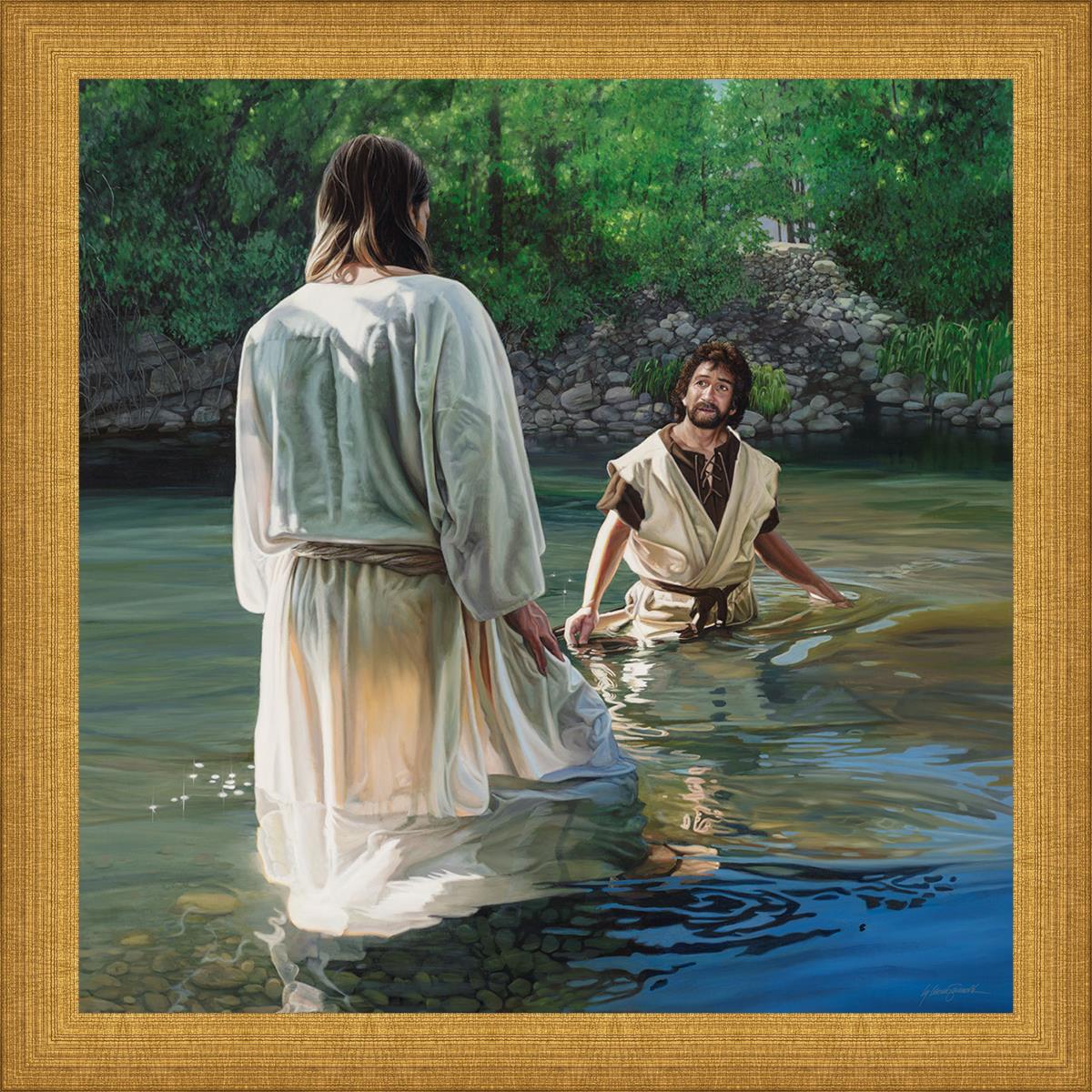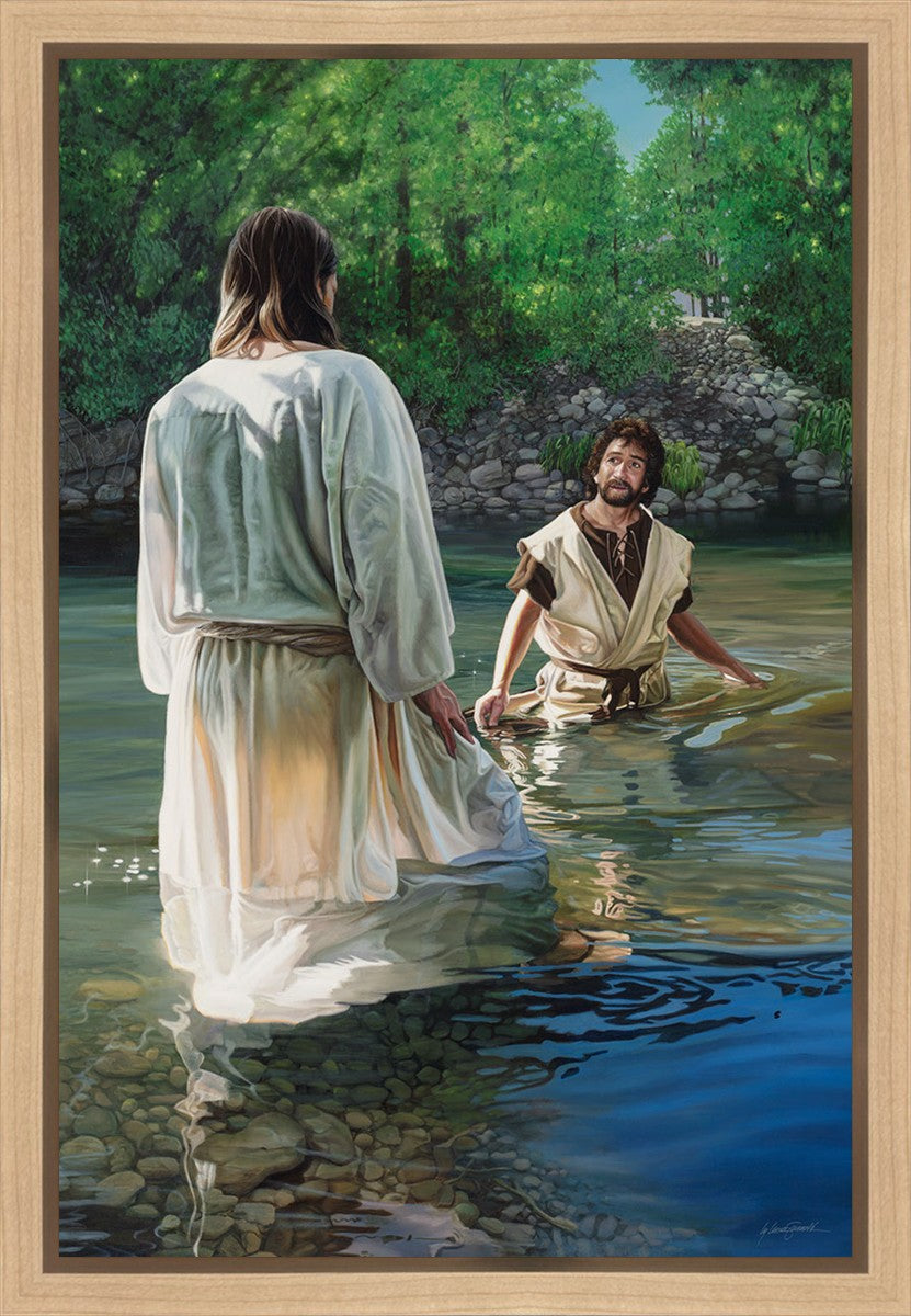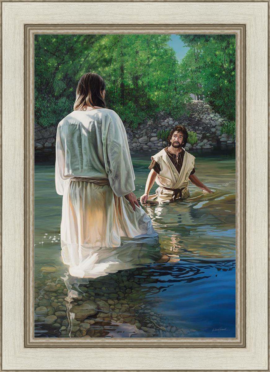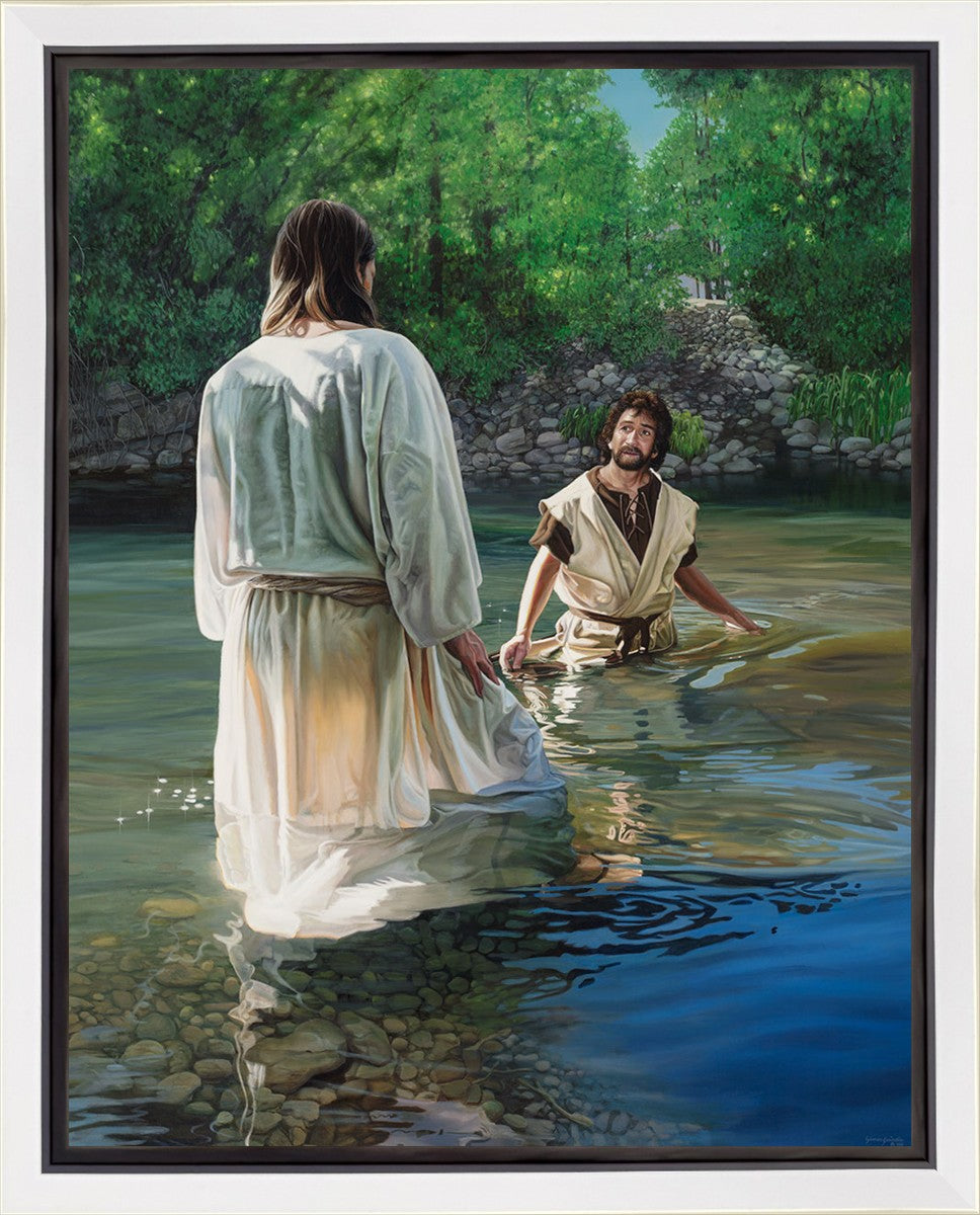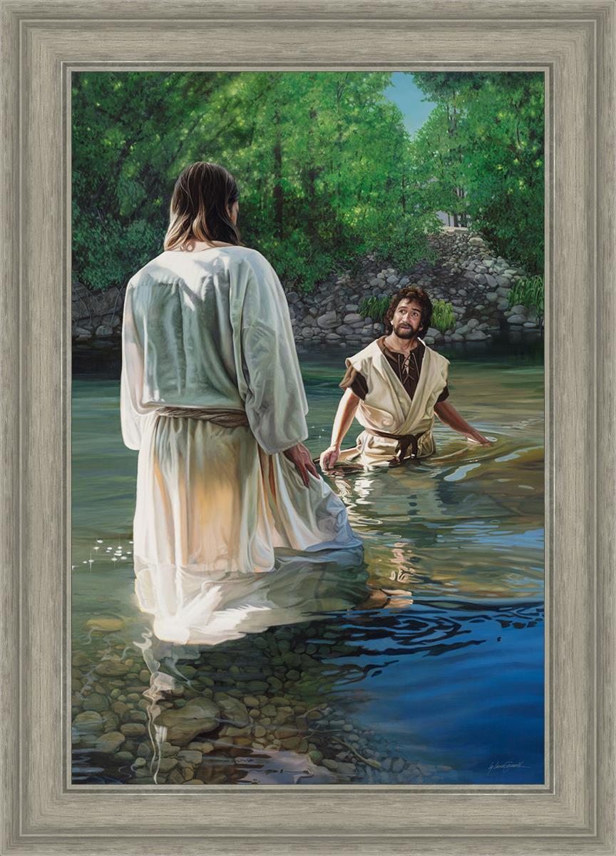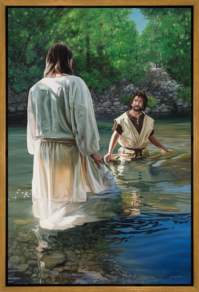 This beautiful painting by Liz Lemon Swindle depicts Jesus Christ being baptized by John the Baptist. Her depiction is of him entering the water, a special moment different from many depictions demonstrating his actual baptism.