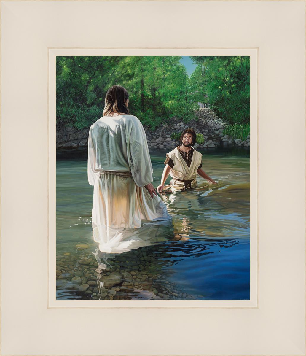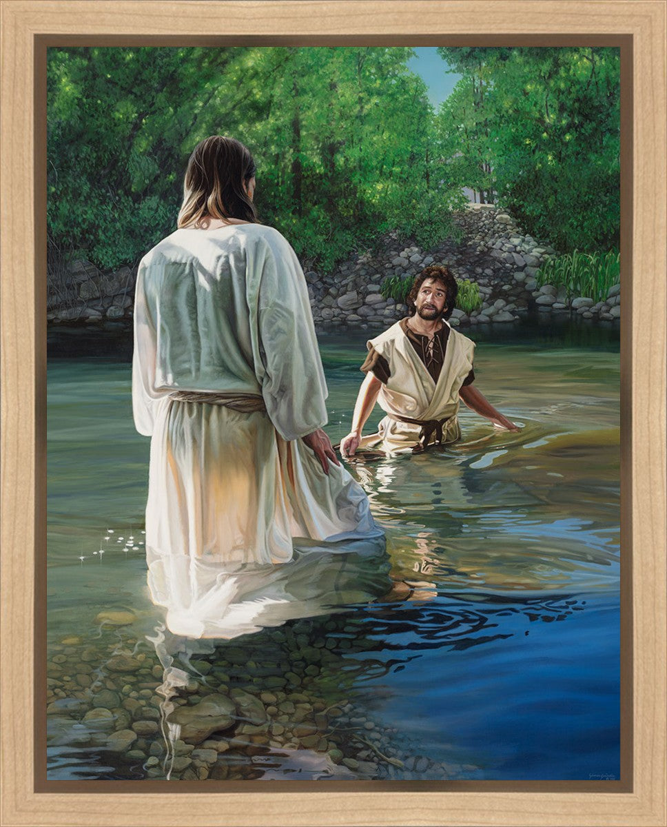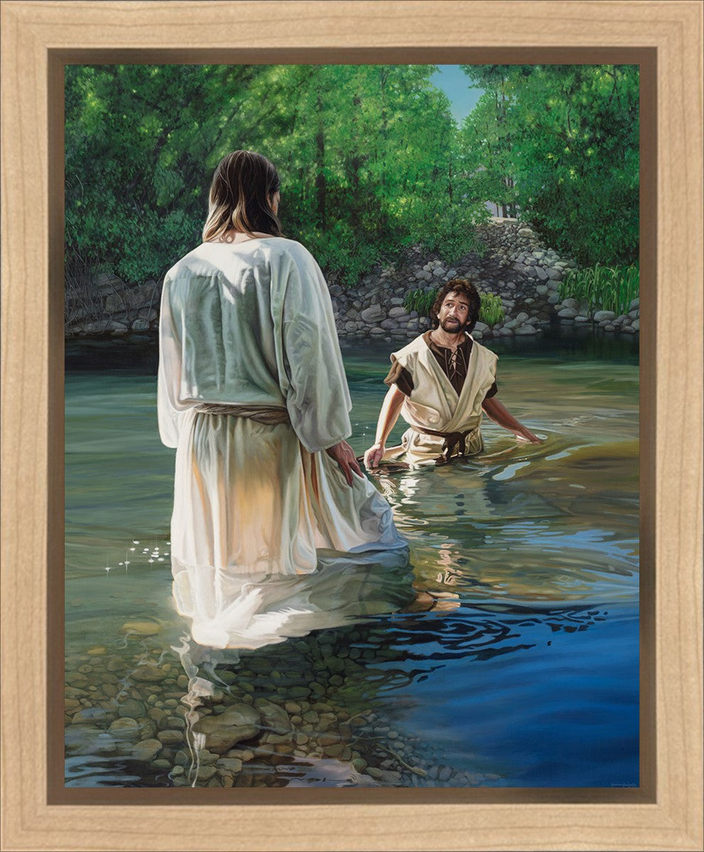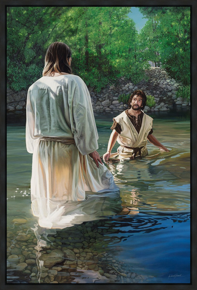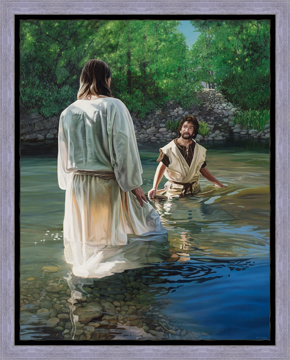 This beautiful painting by Liz Lemon Swindle depicts Jesus Christ being baptized by John the Baptist. Her depiction is of him entering the water, a special moment different from many depictions demonstrating his actual baptism.