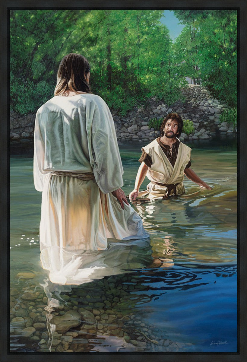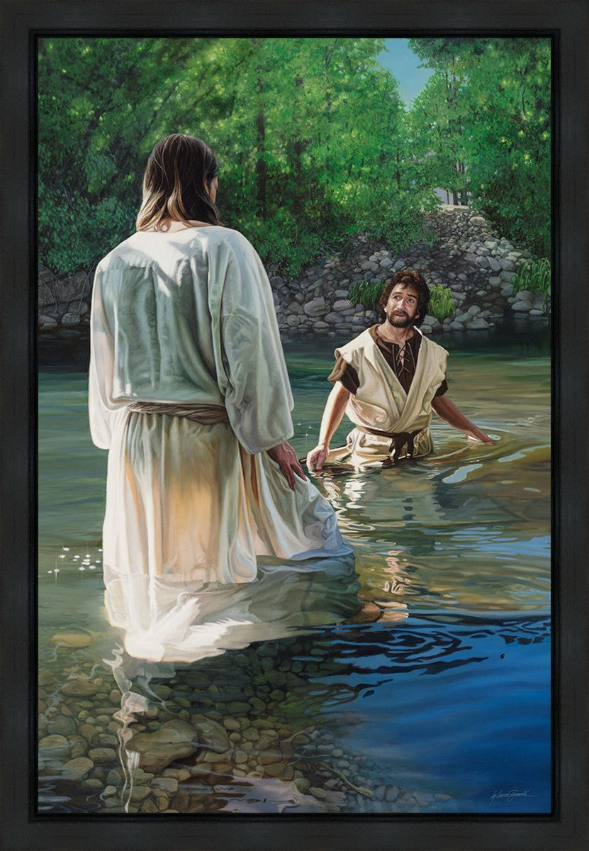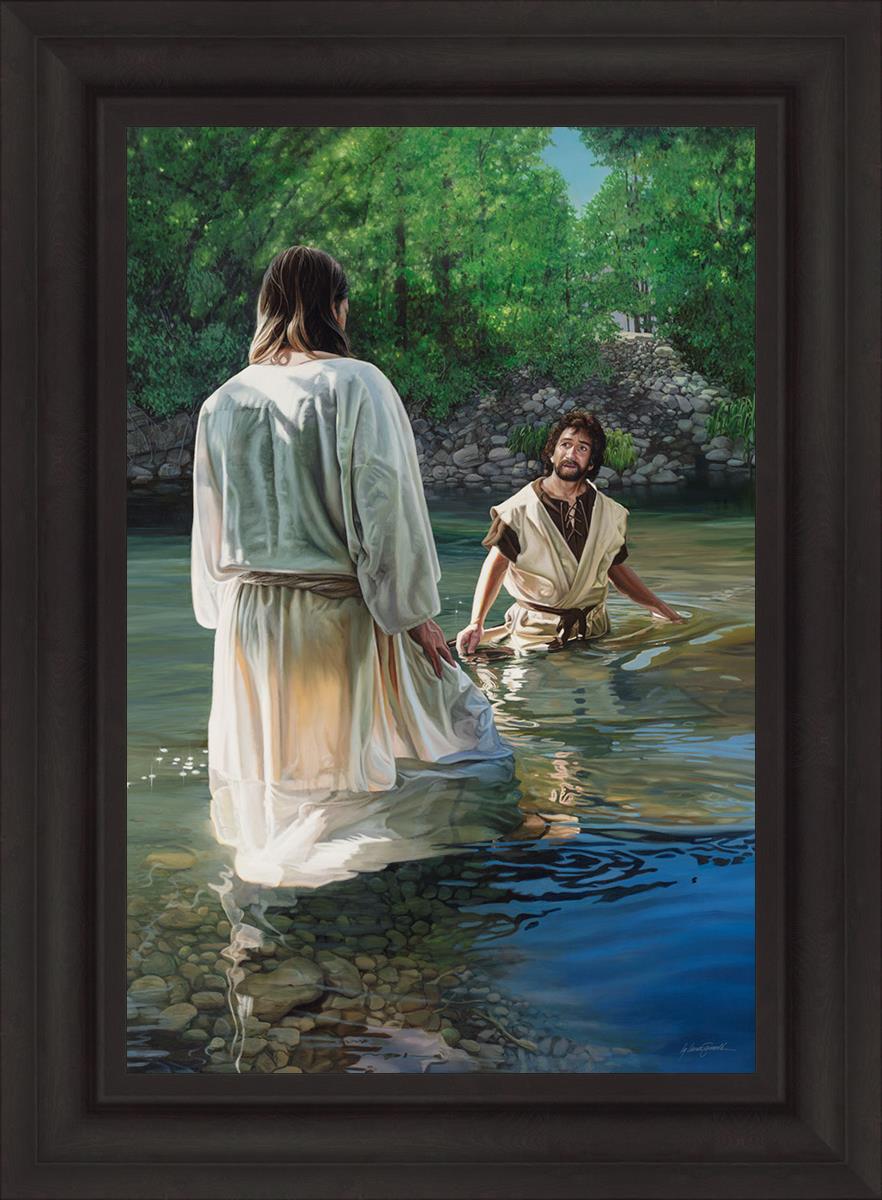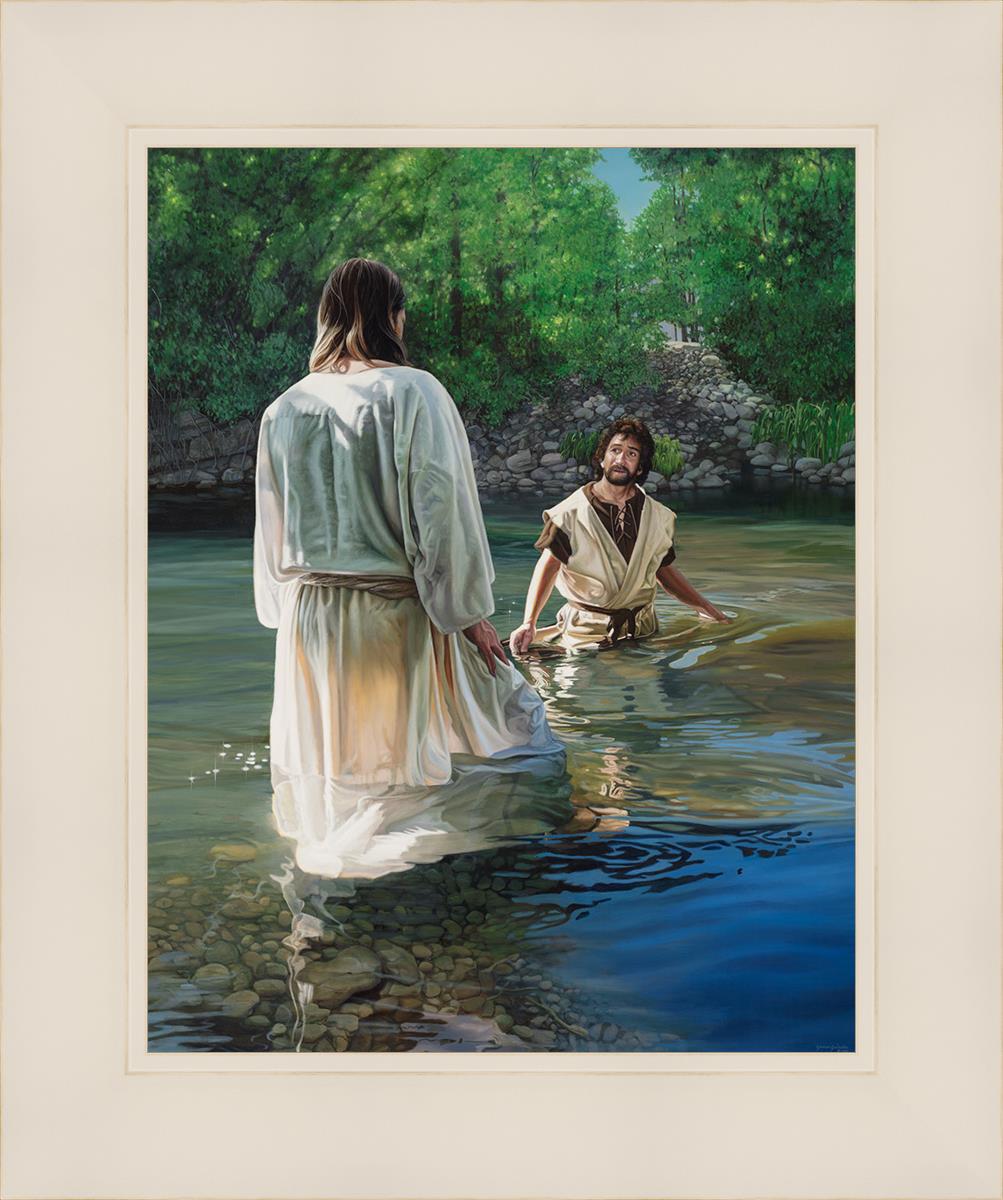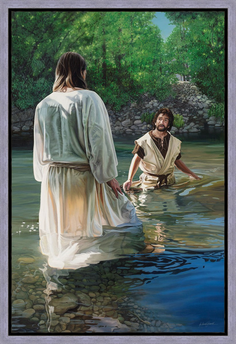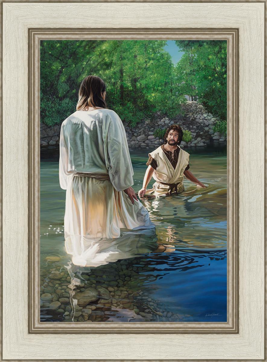 This beautiful painting by Liz Lemon Swindle depicts Jesus Christ being baptized by John the Baptist. Her depiction is of him entering the water, a special moment different from many depictions demonstrating his actual baptism.
