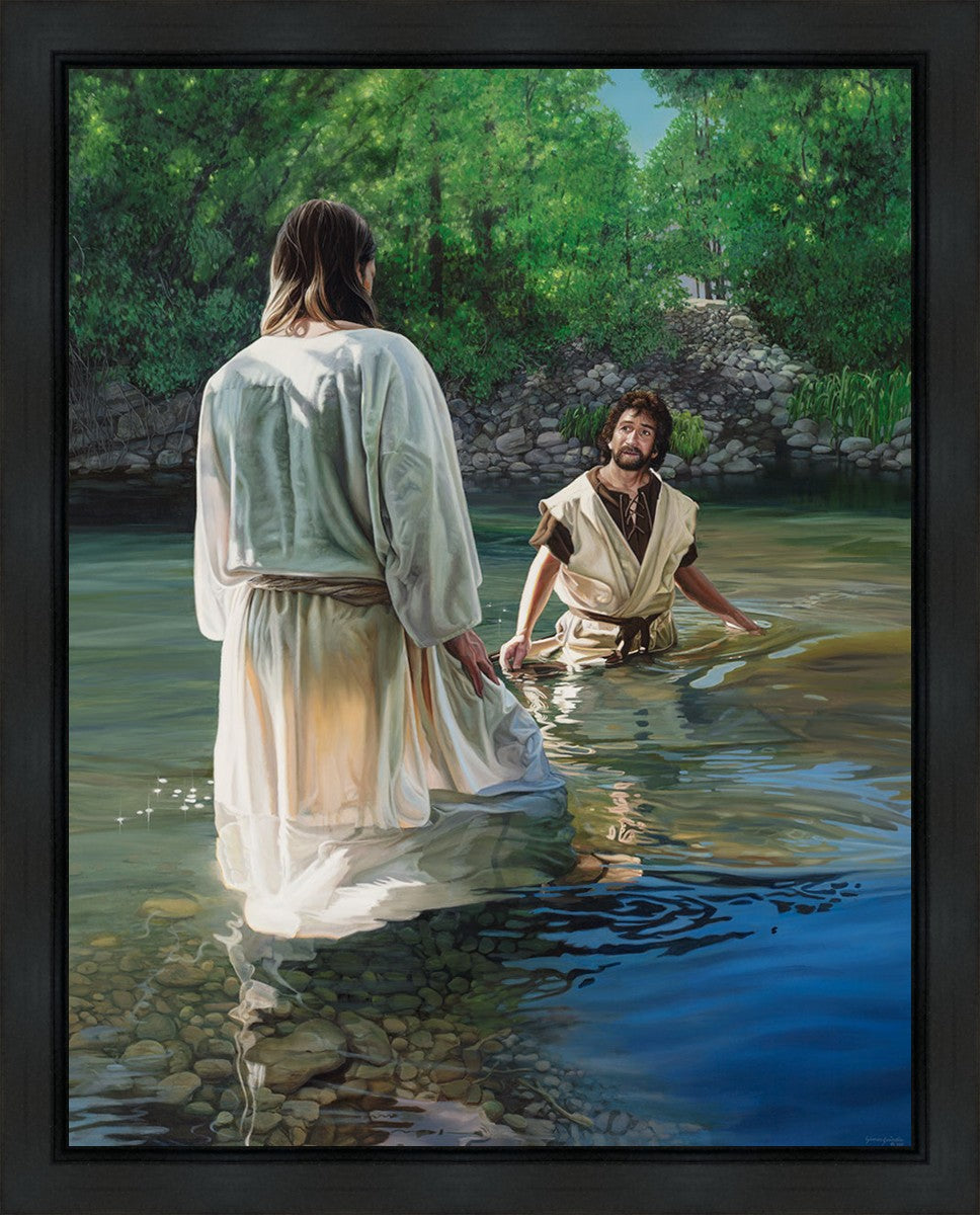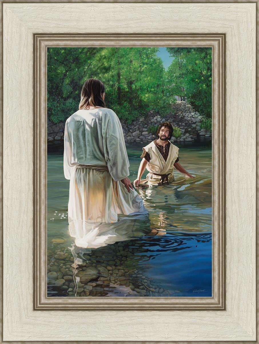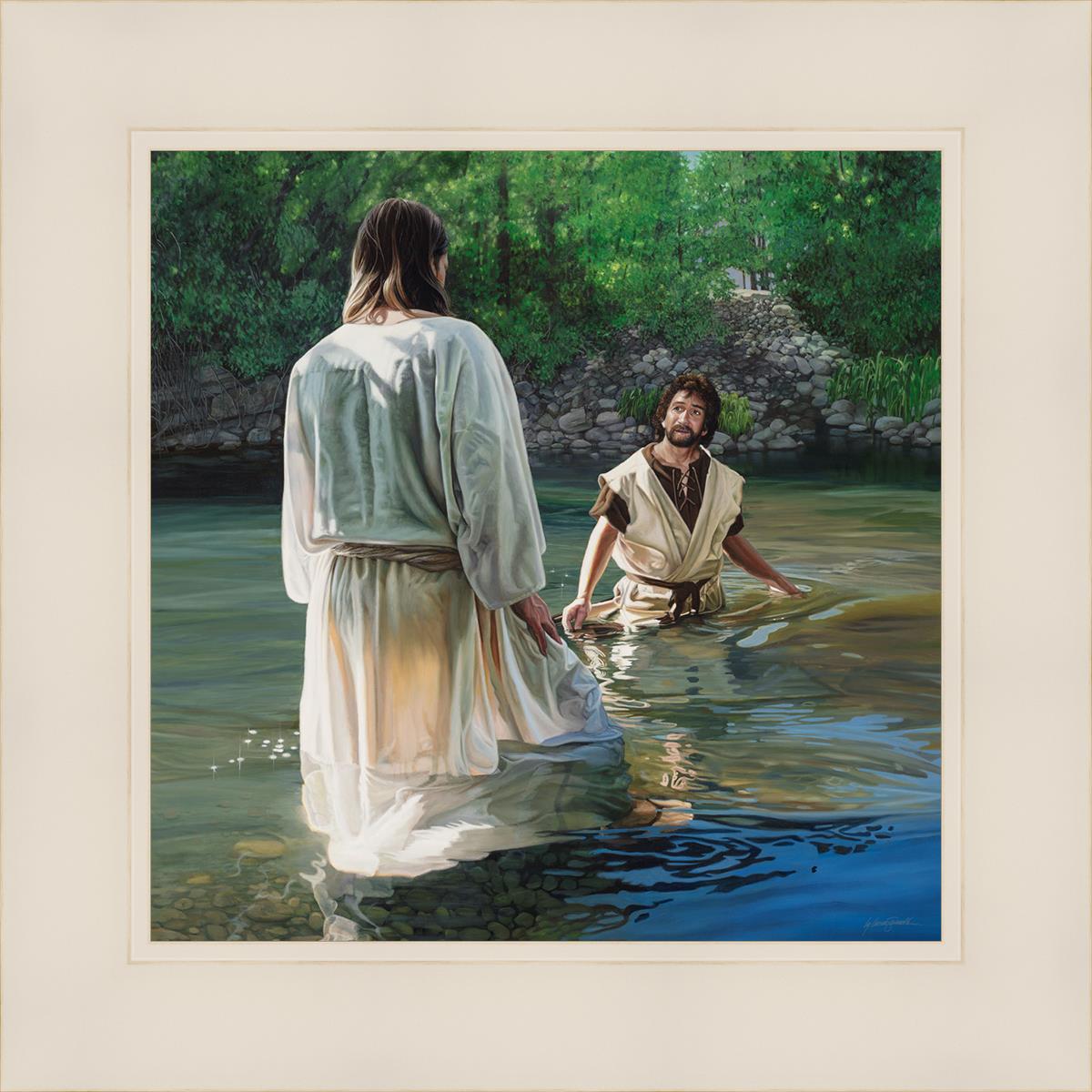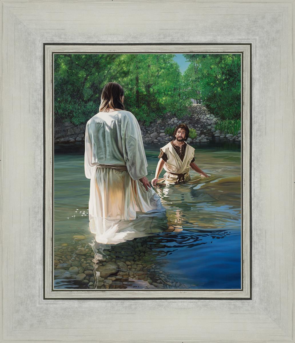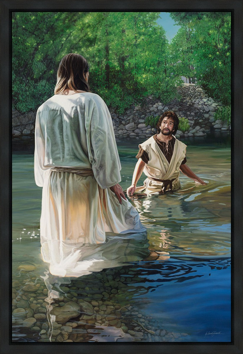 This beautiful painting by Liz Lemon Swindle depicts Jesus Christ being baptized by John the Baptist. Her depiction is of him entering the water, a special moment different from many depictions demonstrating his actual baptism.