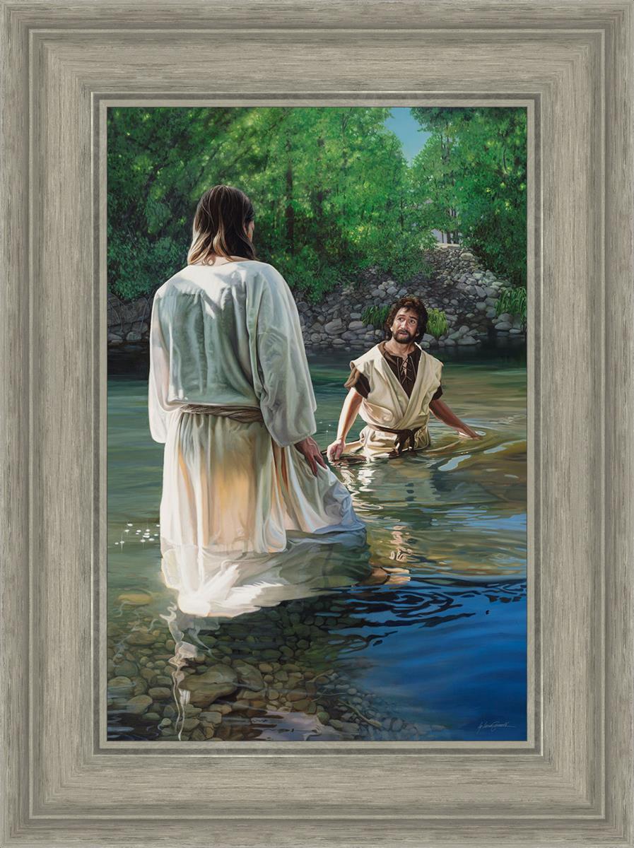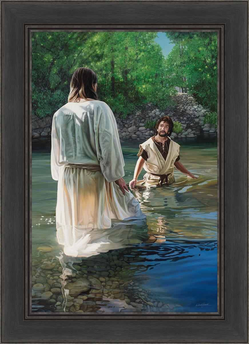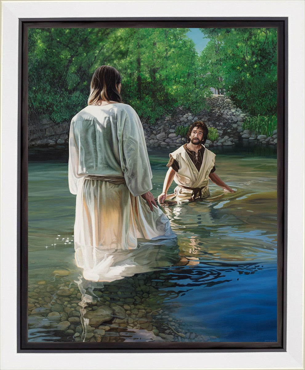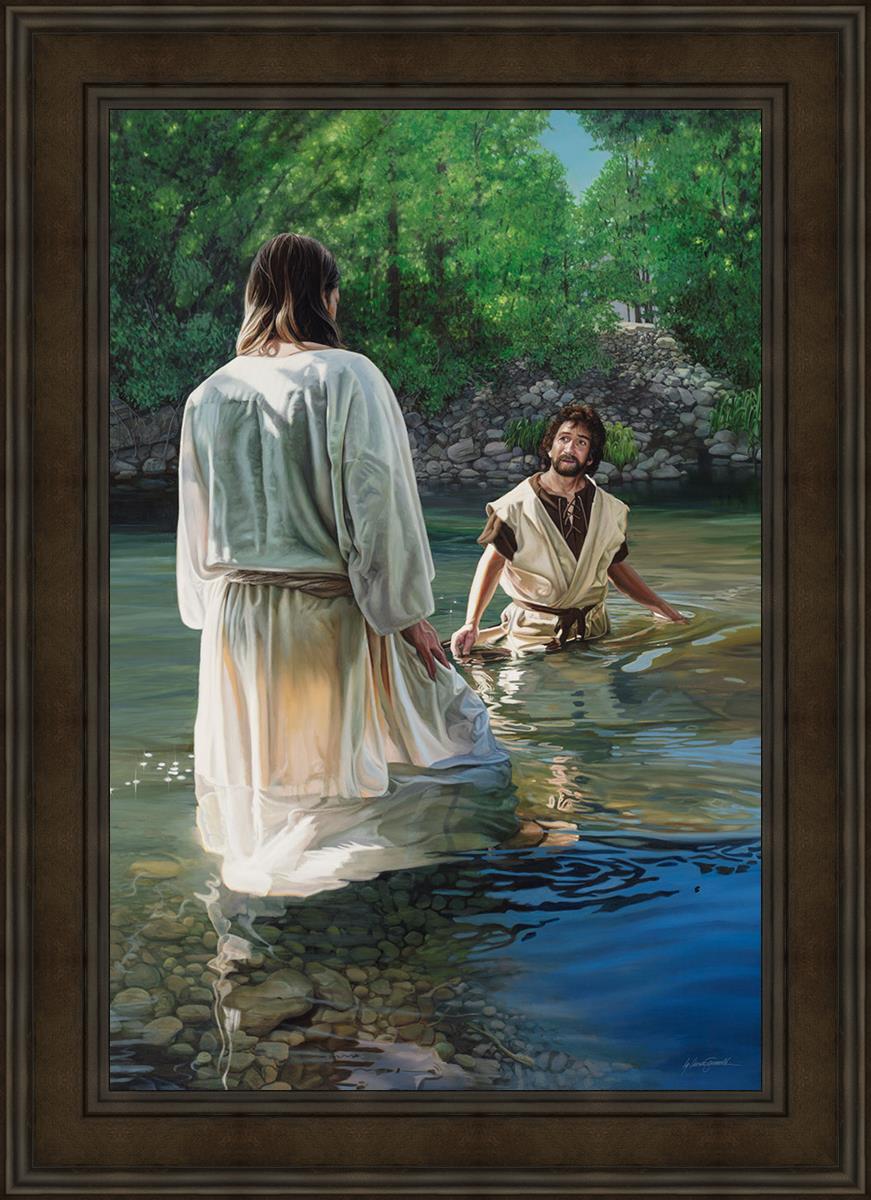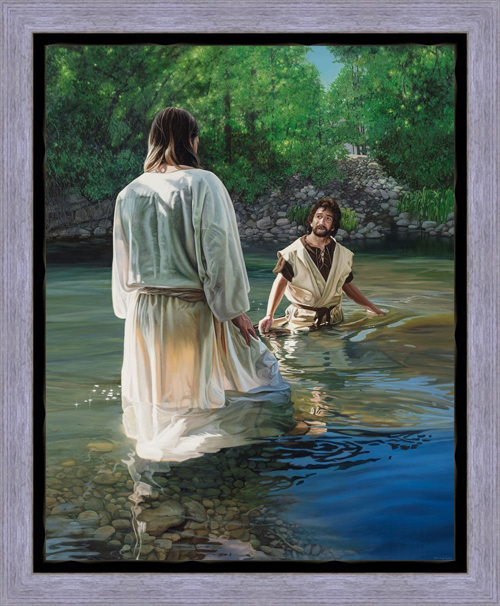 This beautiful painting by Liz Lemon Swindle depicts Jesus Christ being baptized by John the Baptist. Her depiction is of him entering the water, a special moment different from many depictions demonstrating his actual baptism.