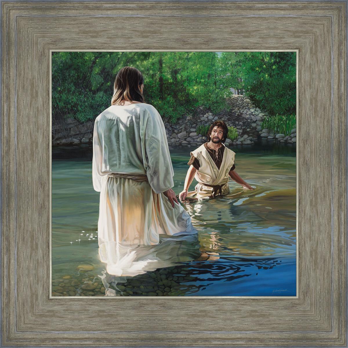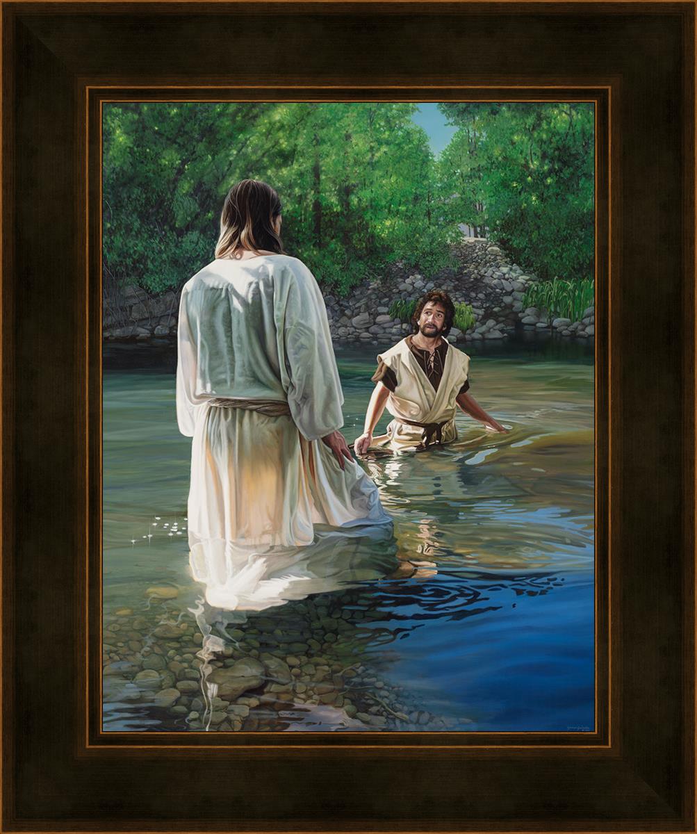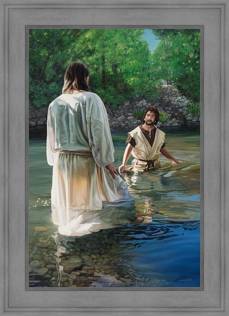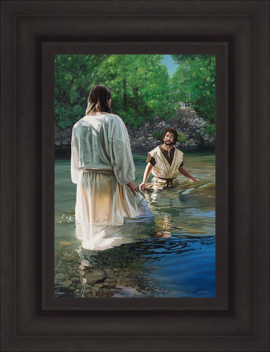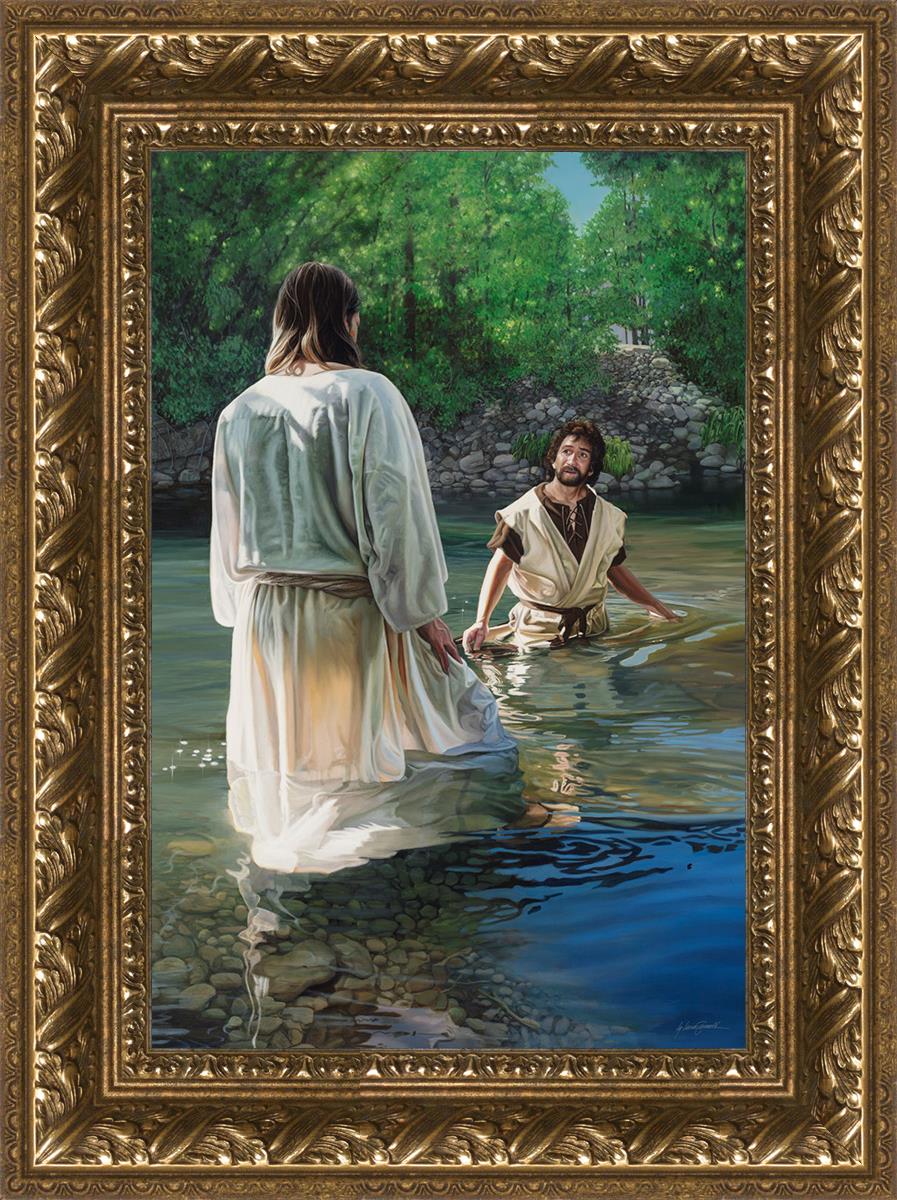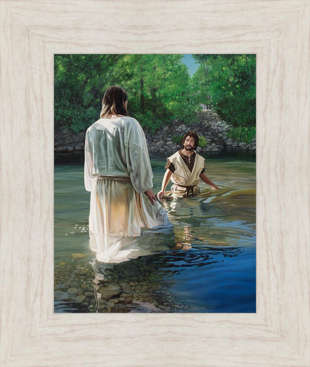 This beautiful painting by Liz Lemon Swindle depicts Jesus Christ being baptized by John the Baptist. Her depiction is of him entering the water, a special moment different from many depictions demonstrating his actual baptism.