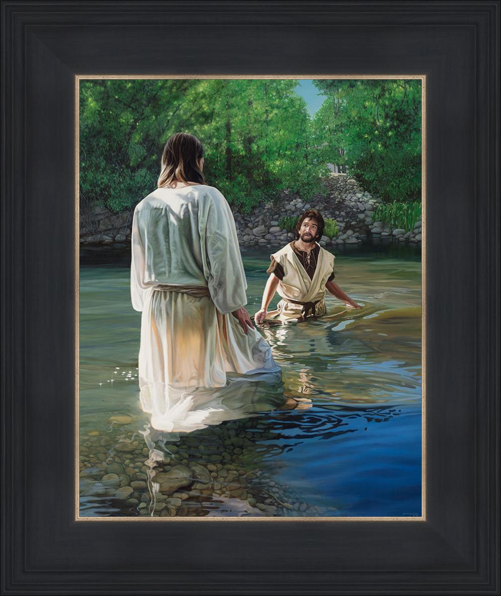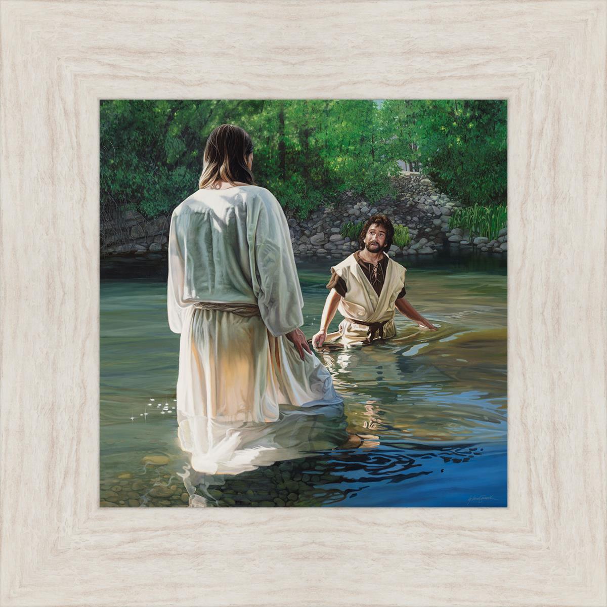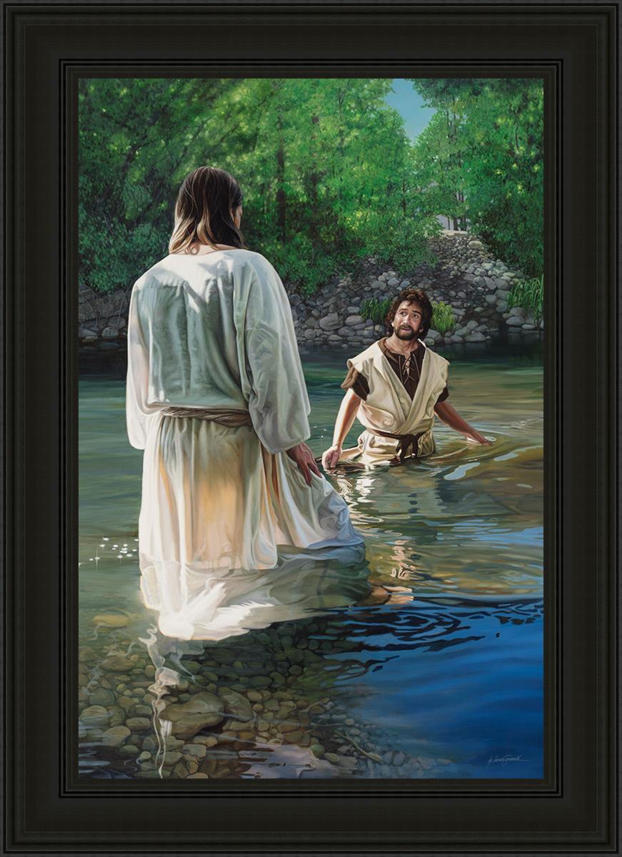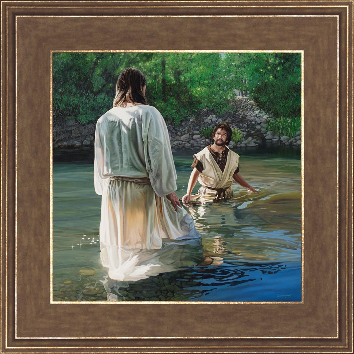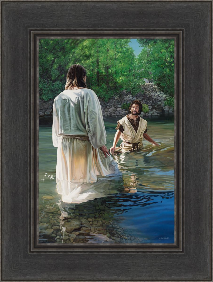 This beautiful painting by Liz Lemon Swindle depicts Jesus Christ being baptized by John the Baptist. Her depiction is of him entering the water, a special moment different from many depictions demonstrating his actual baptism.