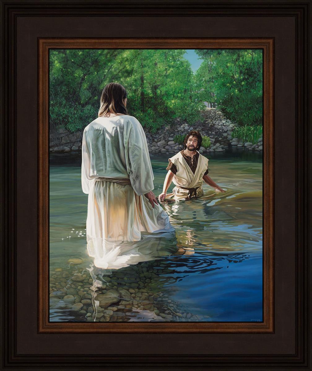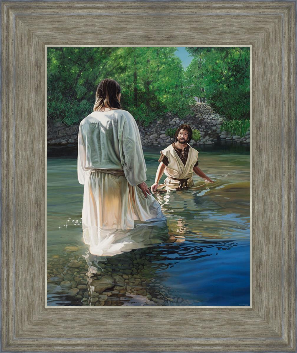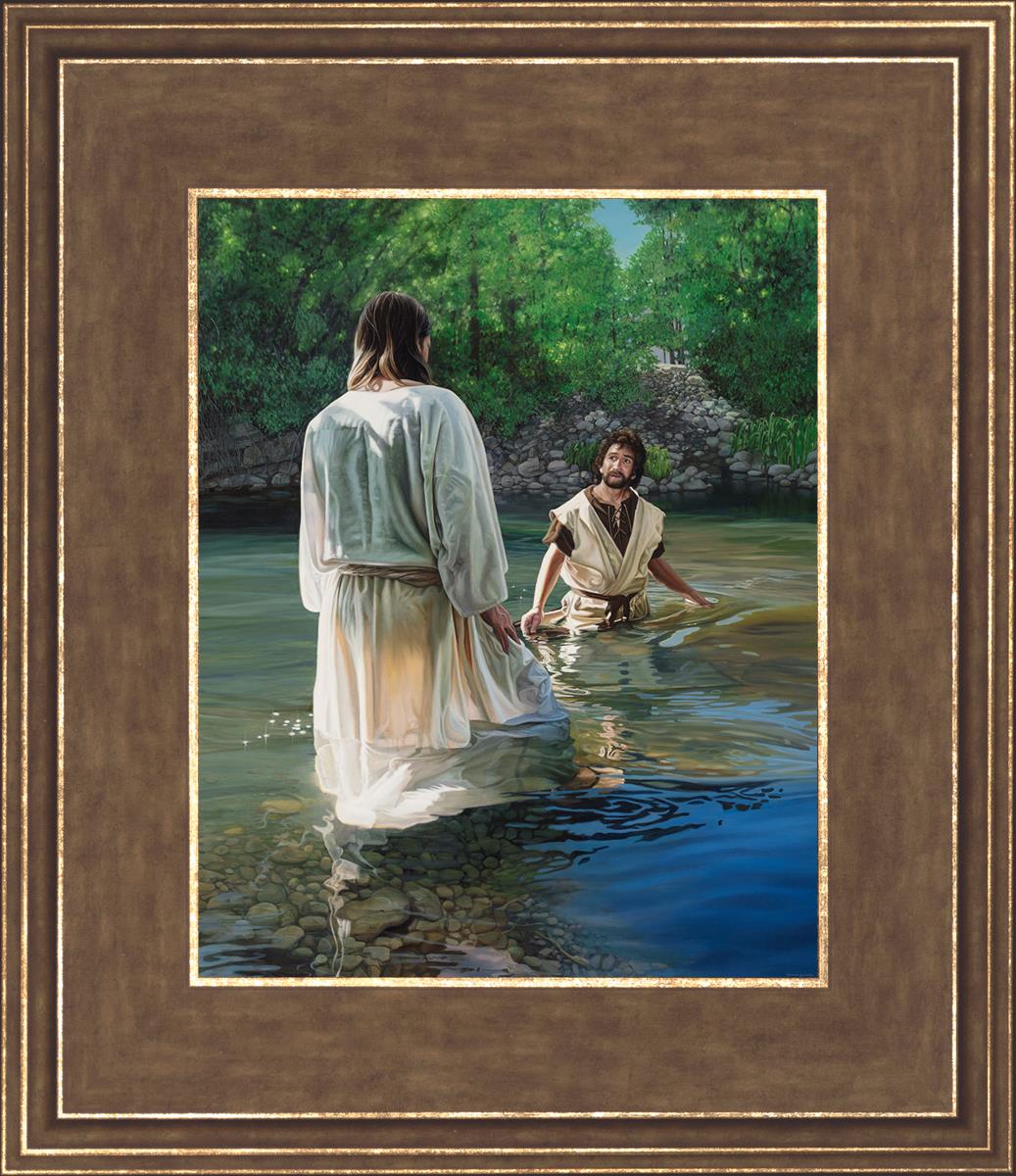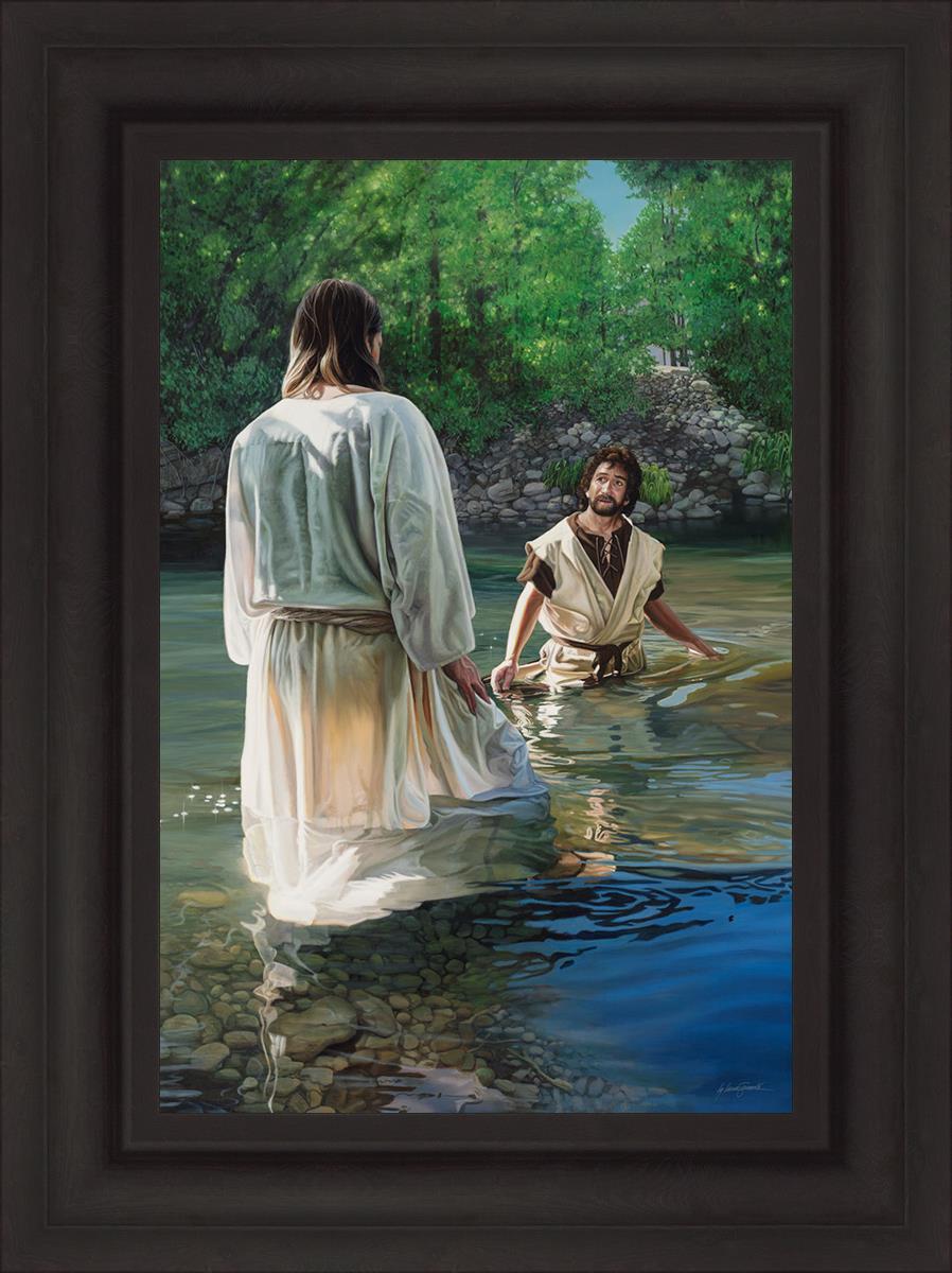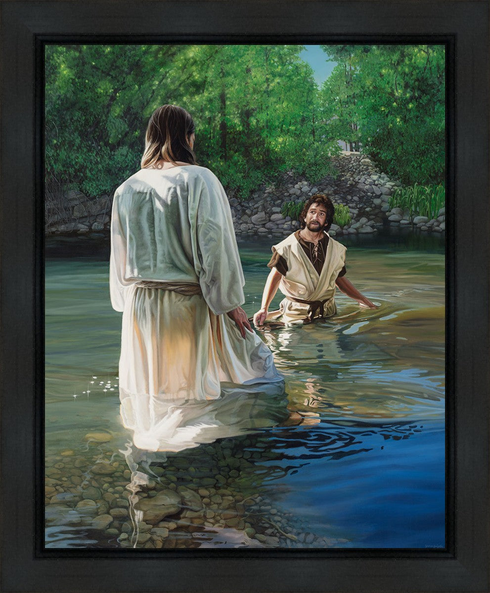 This beautiful painting by Liz Lemon Swindle depicts Jesus Christ being baptized by John the Baptist. Her depiction is of him entering the water, a special moment different from many depictions demonstrating his actual baptism.