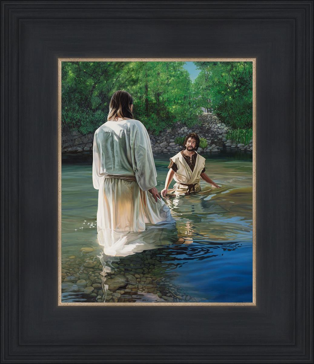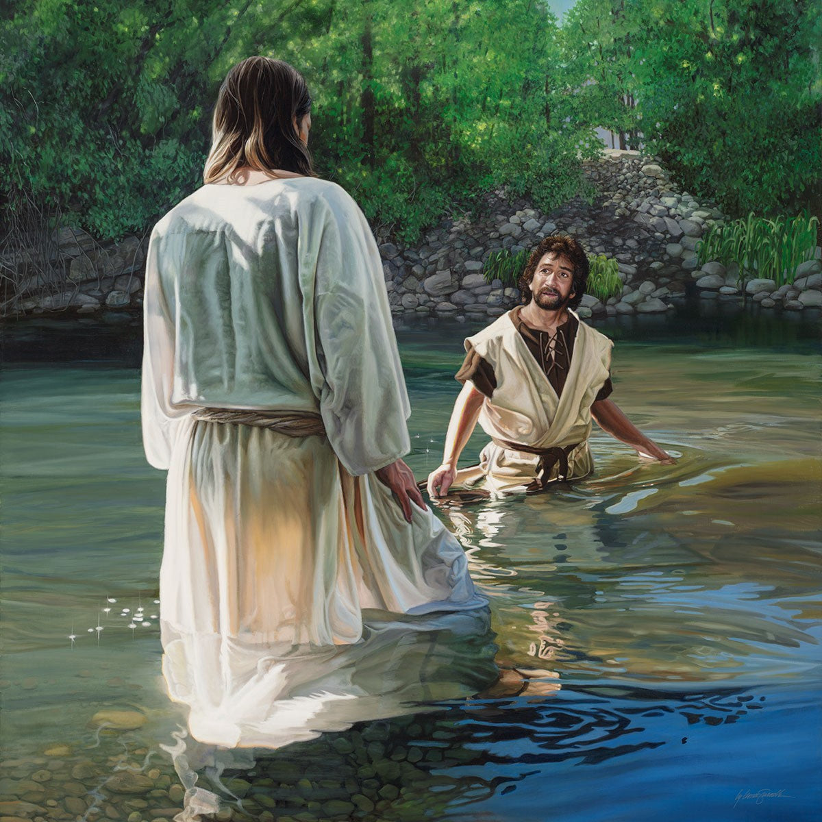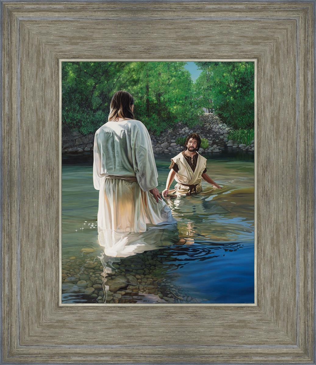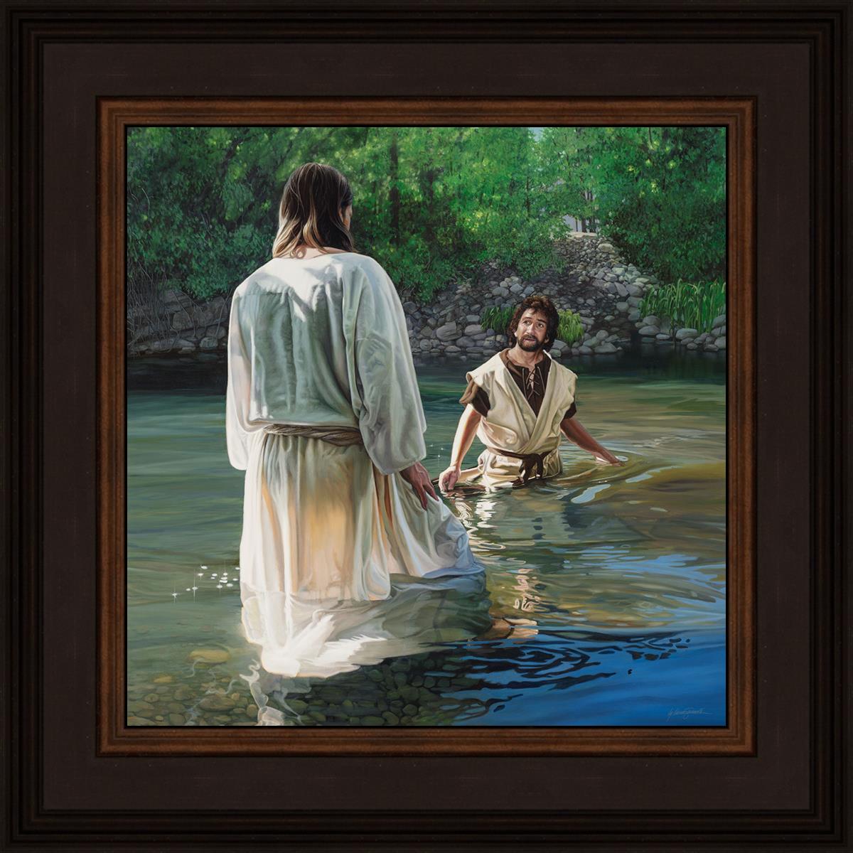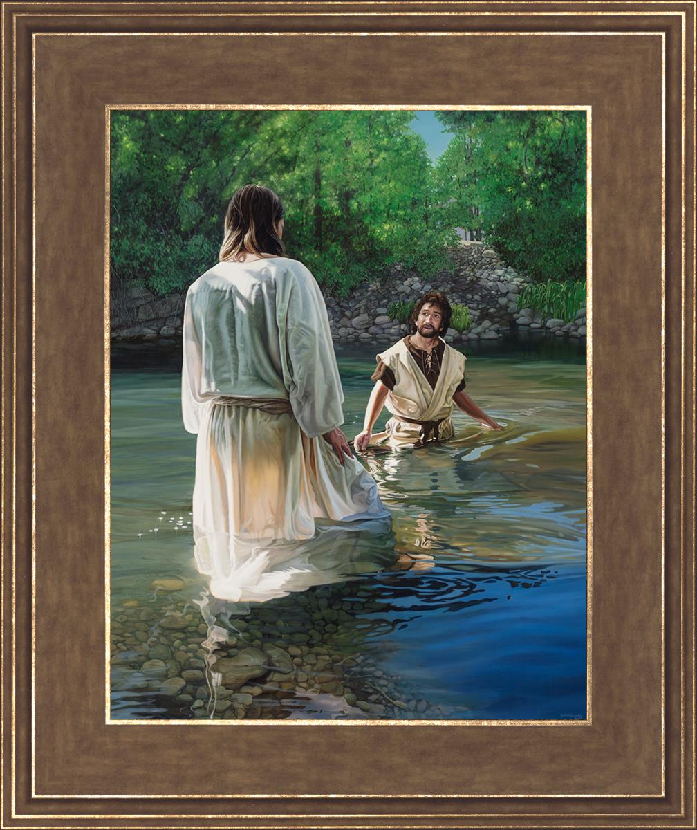 This beautiful painting by Liz Lemon Swindle depicts Jesus Christ being baptized by John the Baptist. Her depiction is of him entering the water, a special moment different from many depictions demonstrating his actual baptism.