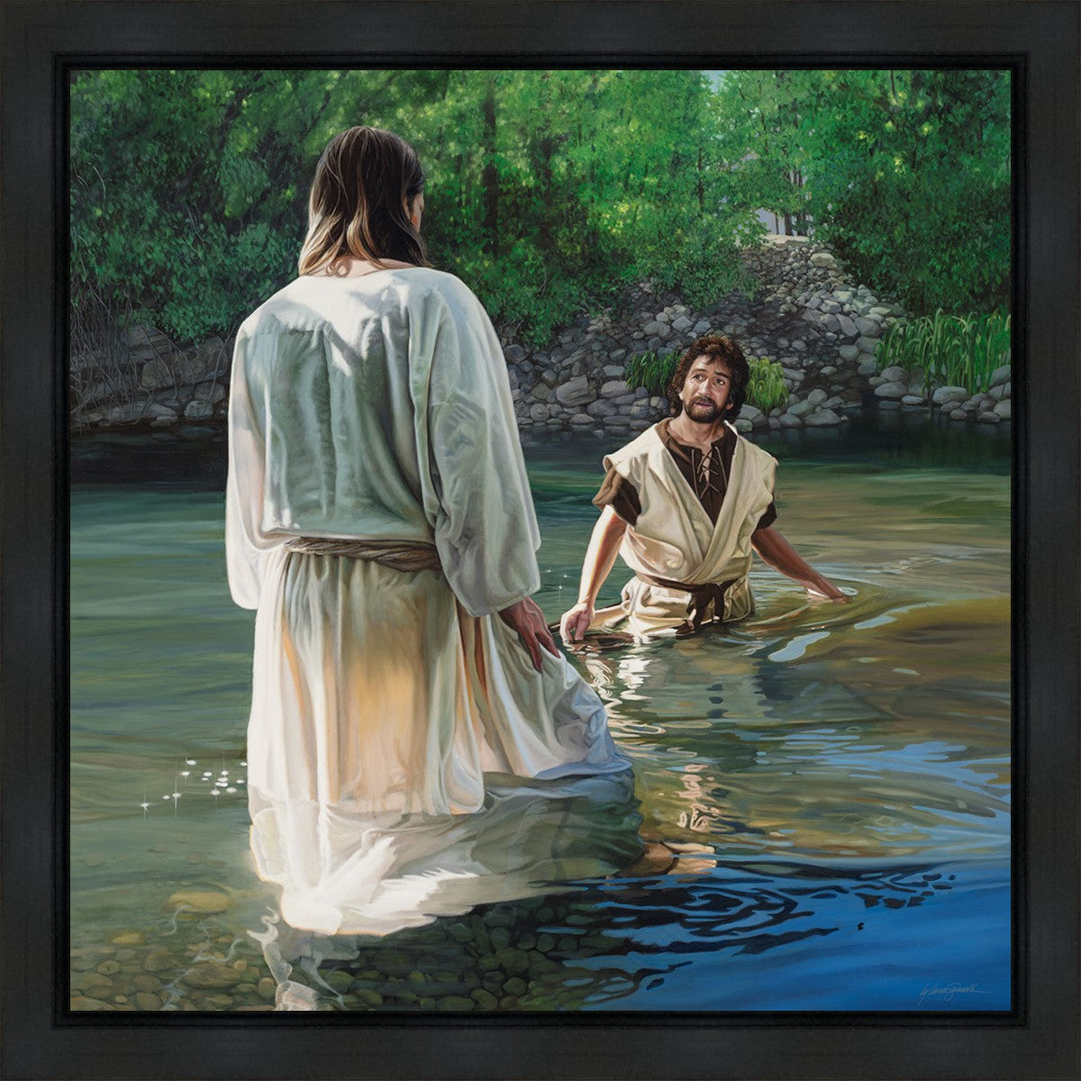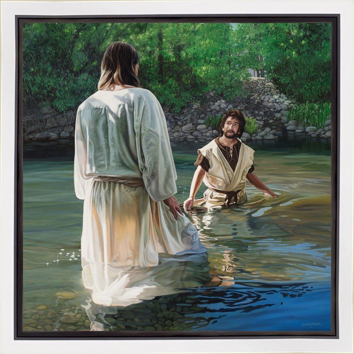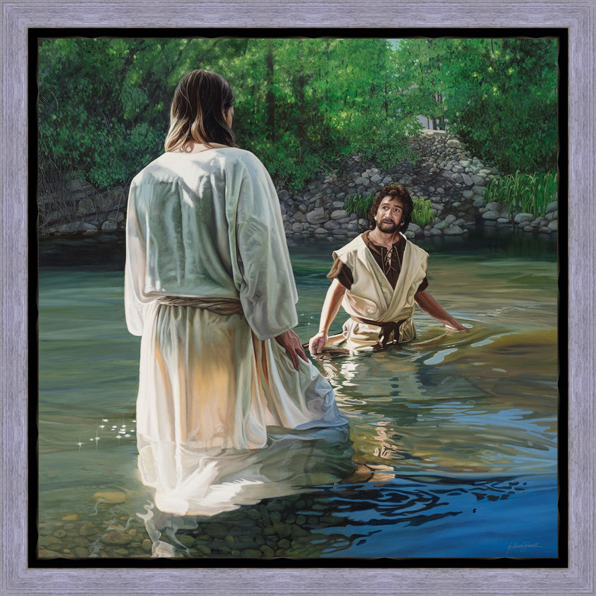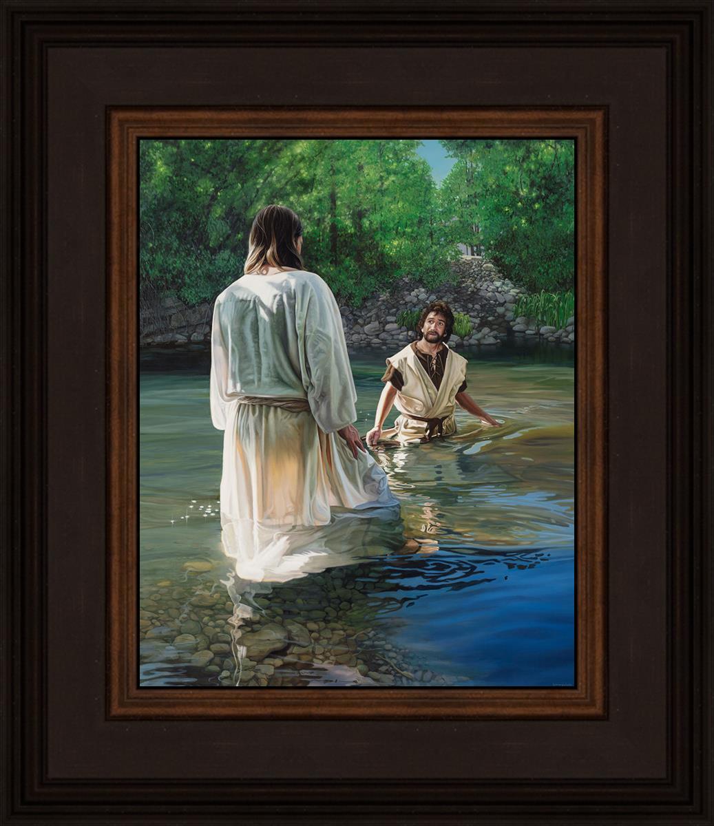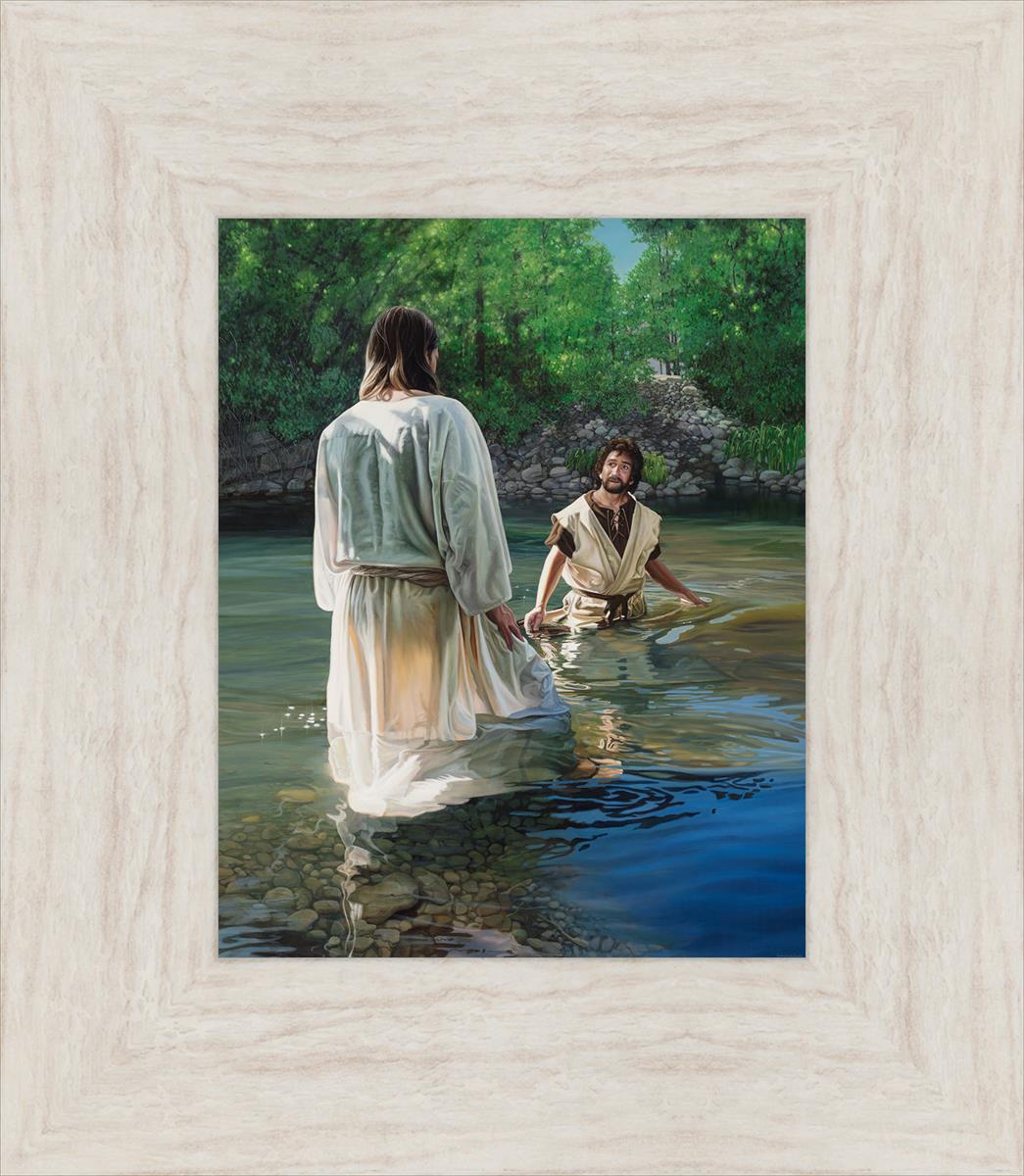This beautiful painting by Liz Lemon Swindle depicts Jesus Christ being baptized by John the Baptist. Her depiction is of him entering the water, a special moment different from many depictions demonstrating his actual baptism.