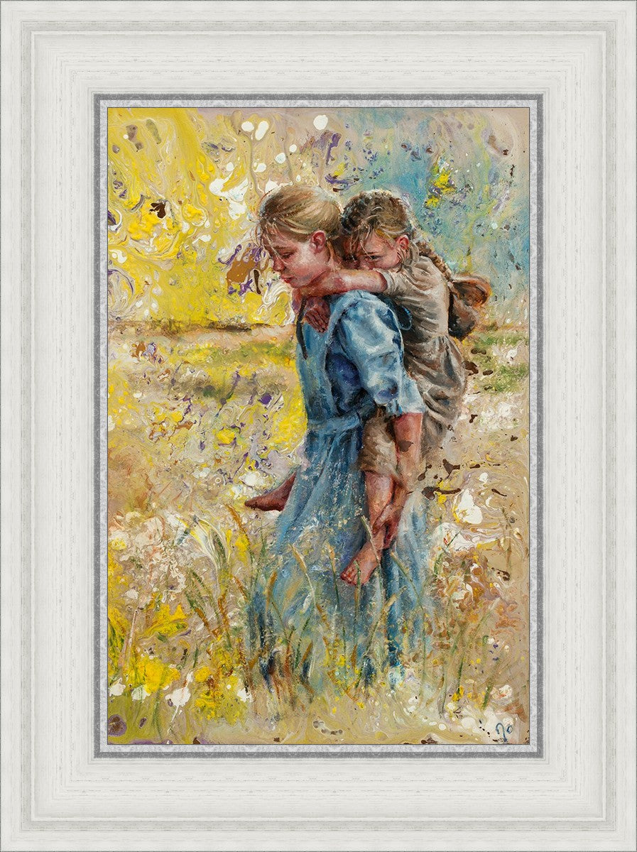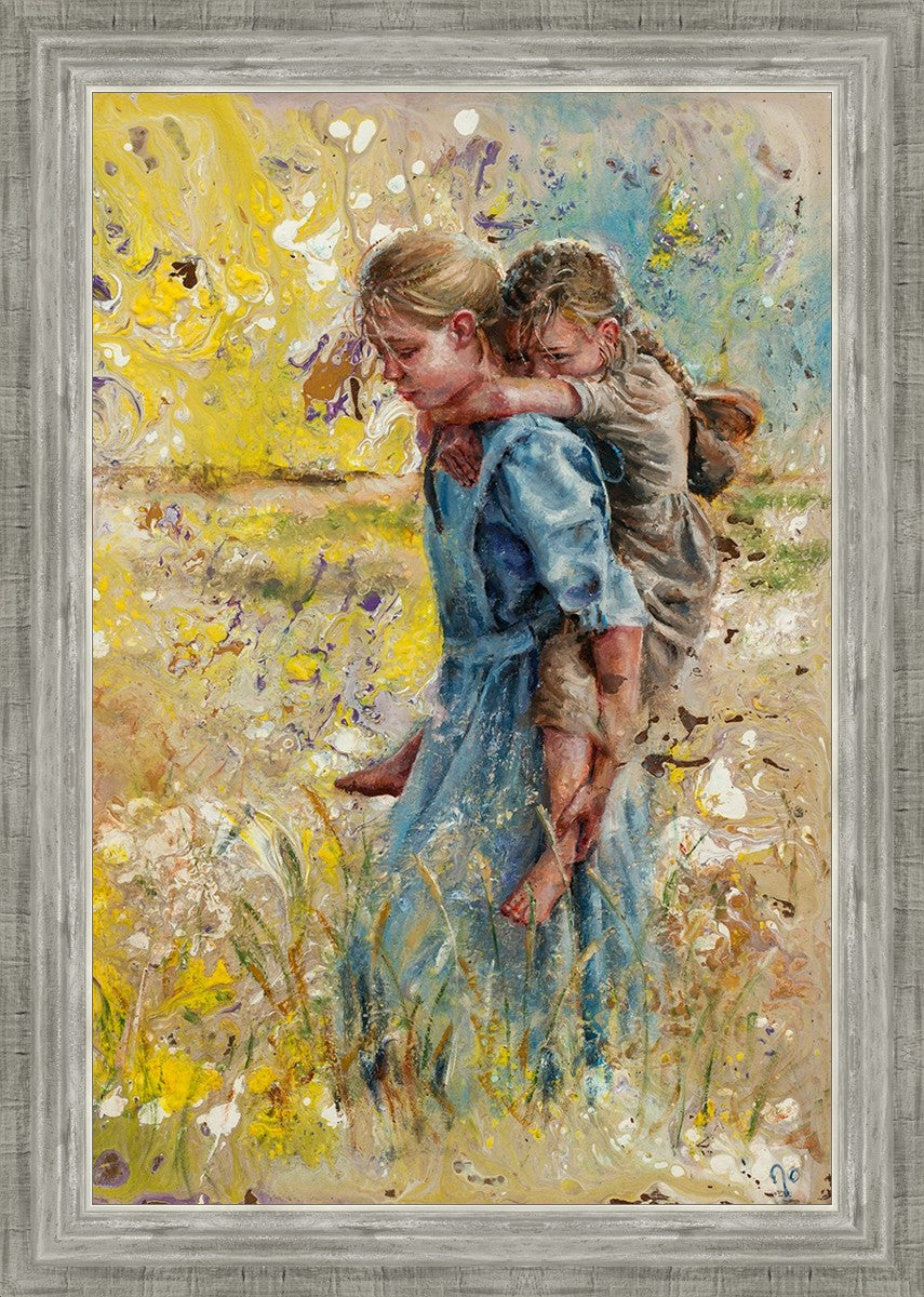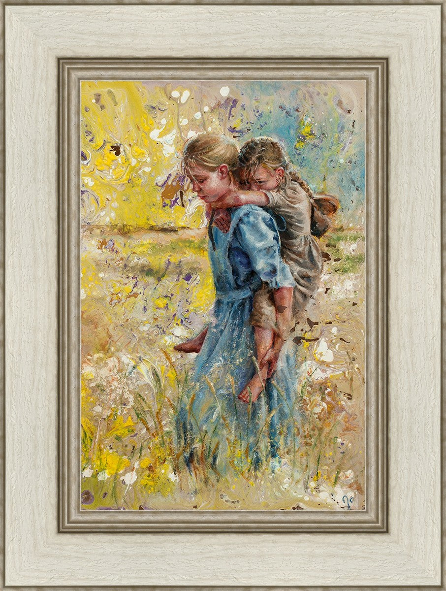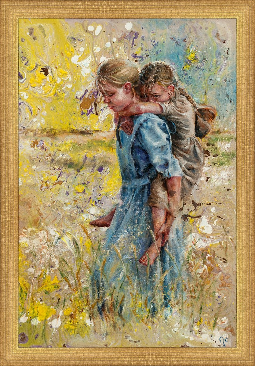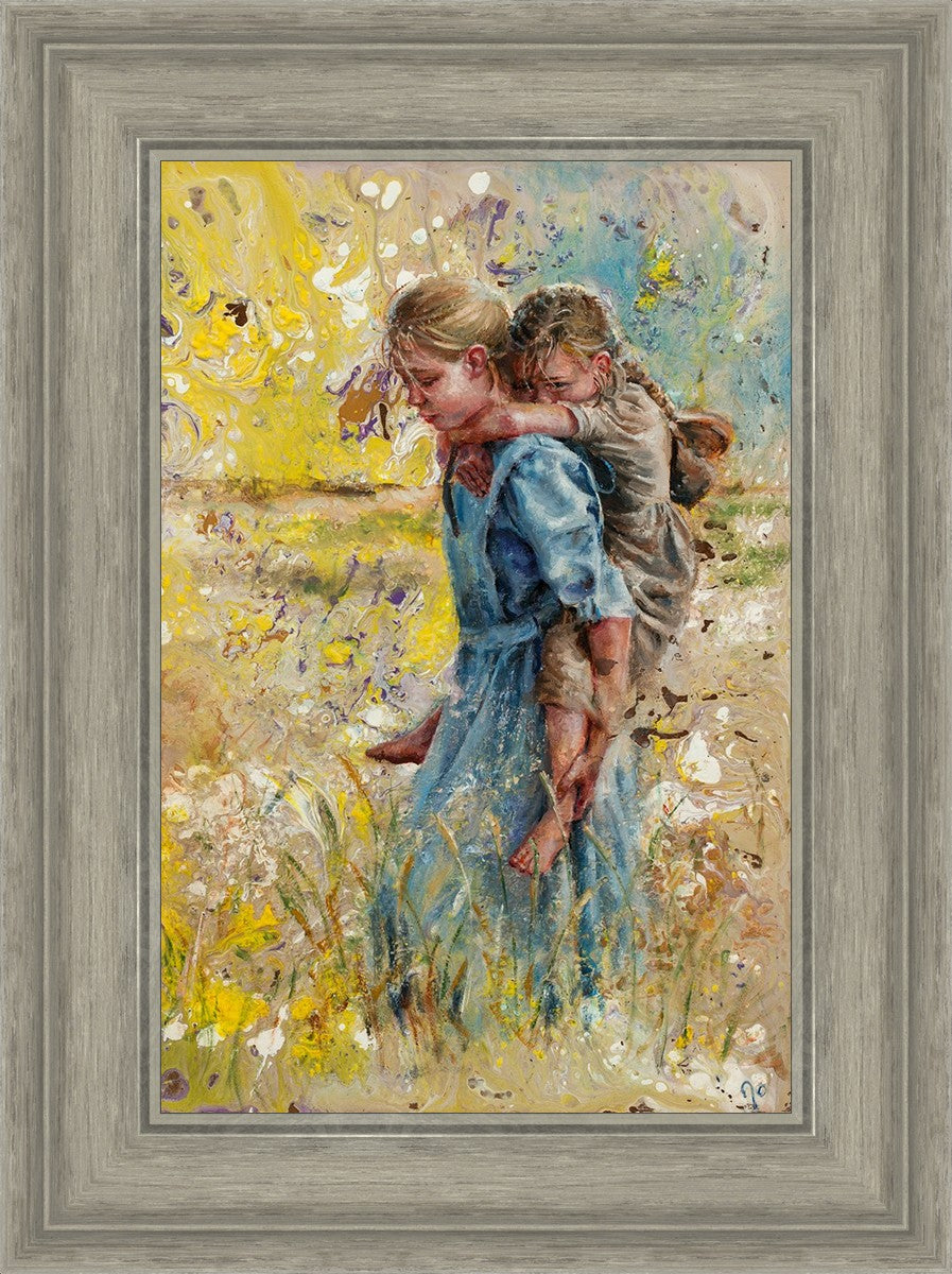 Painting of two pioneer sisters on the trail to Zion. The youngest, exhusted by the day'stravel is carried into camp by her older sister.