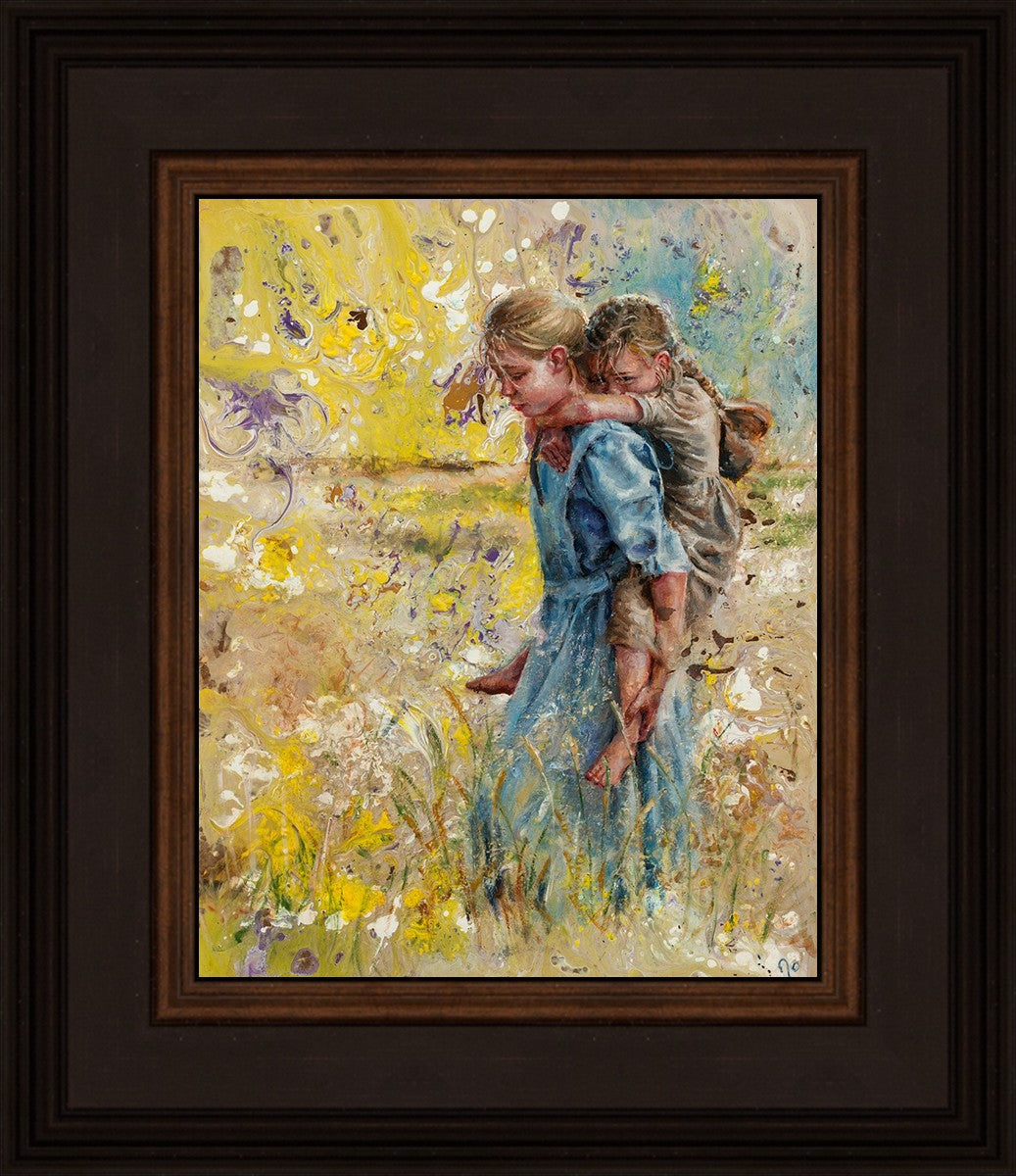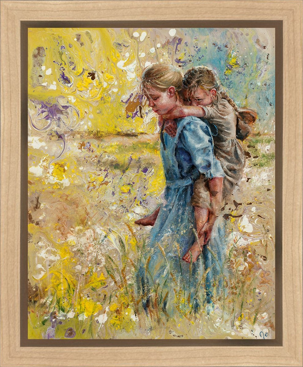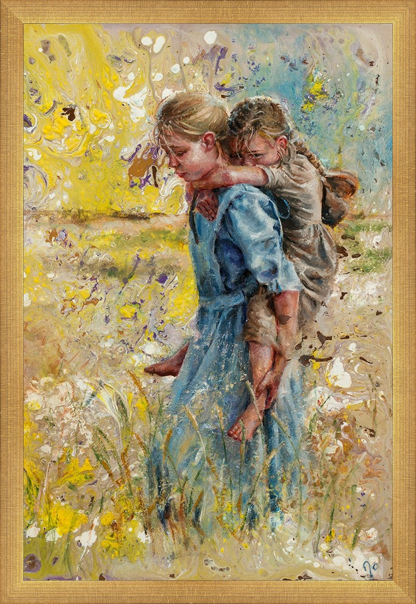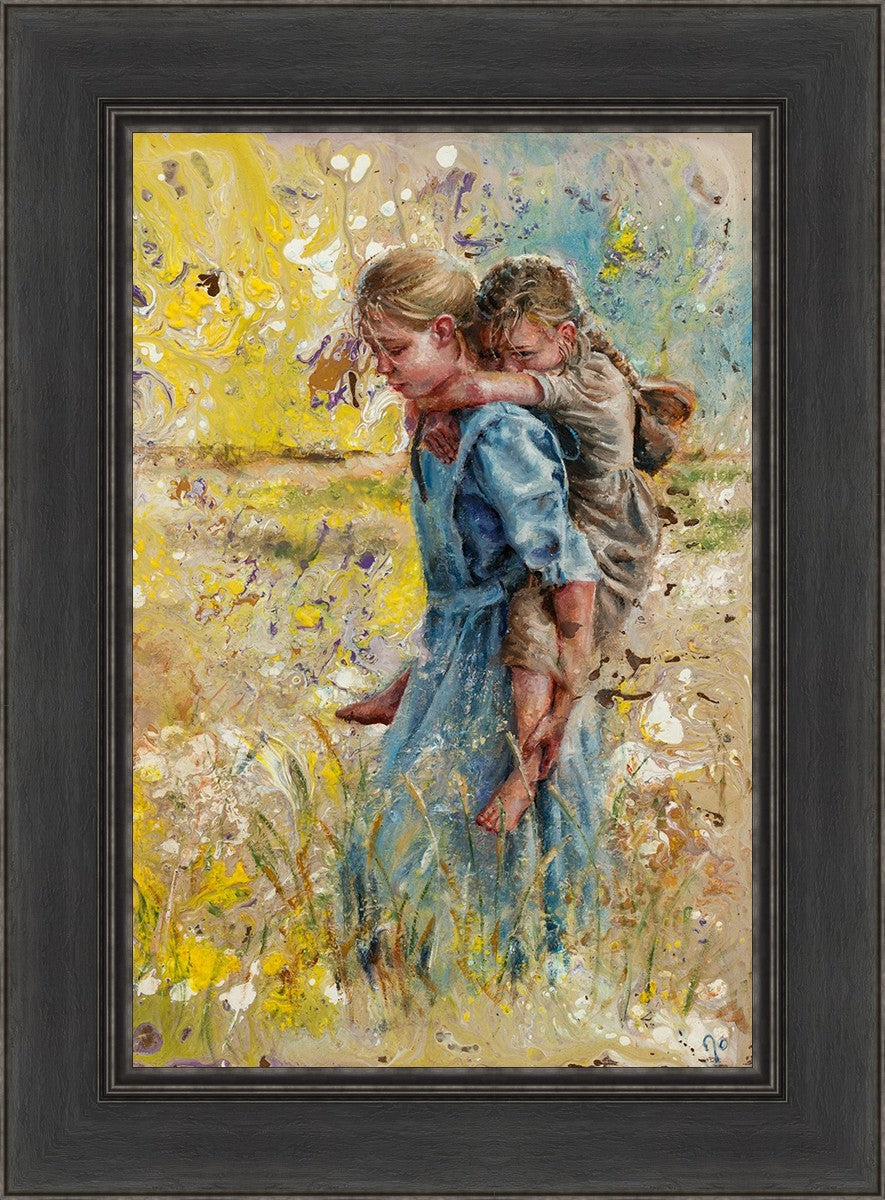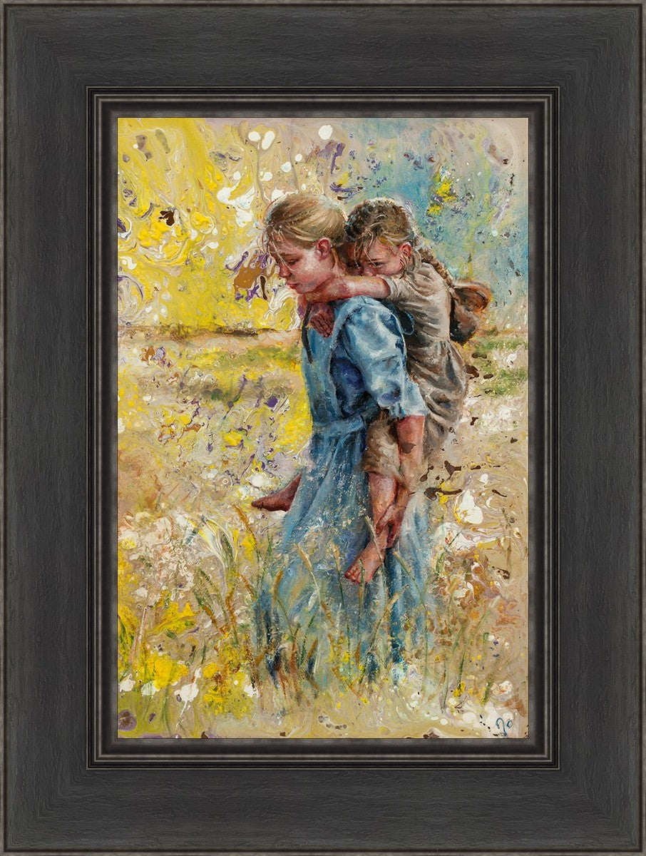 Painting of two pioneer sisters on the trail to Zion. The youngest, exhusted by the day'stravel is carried into camp by her older sister.