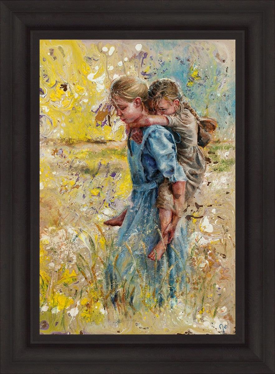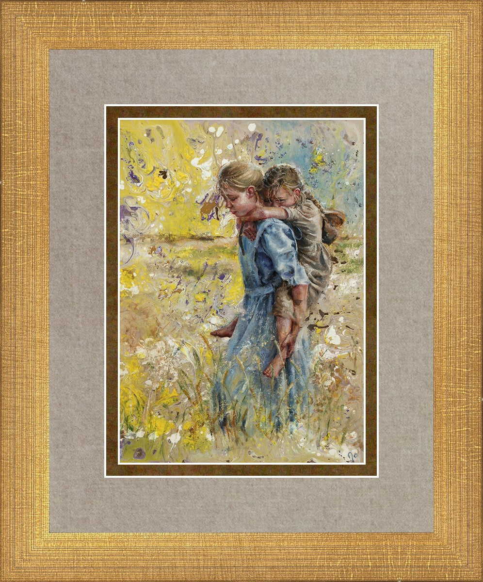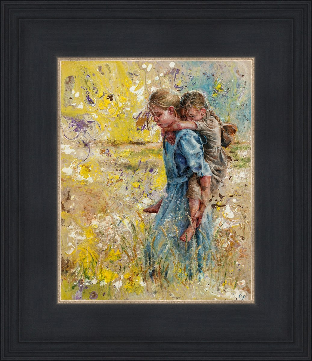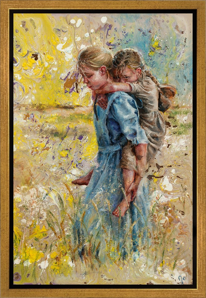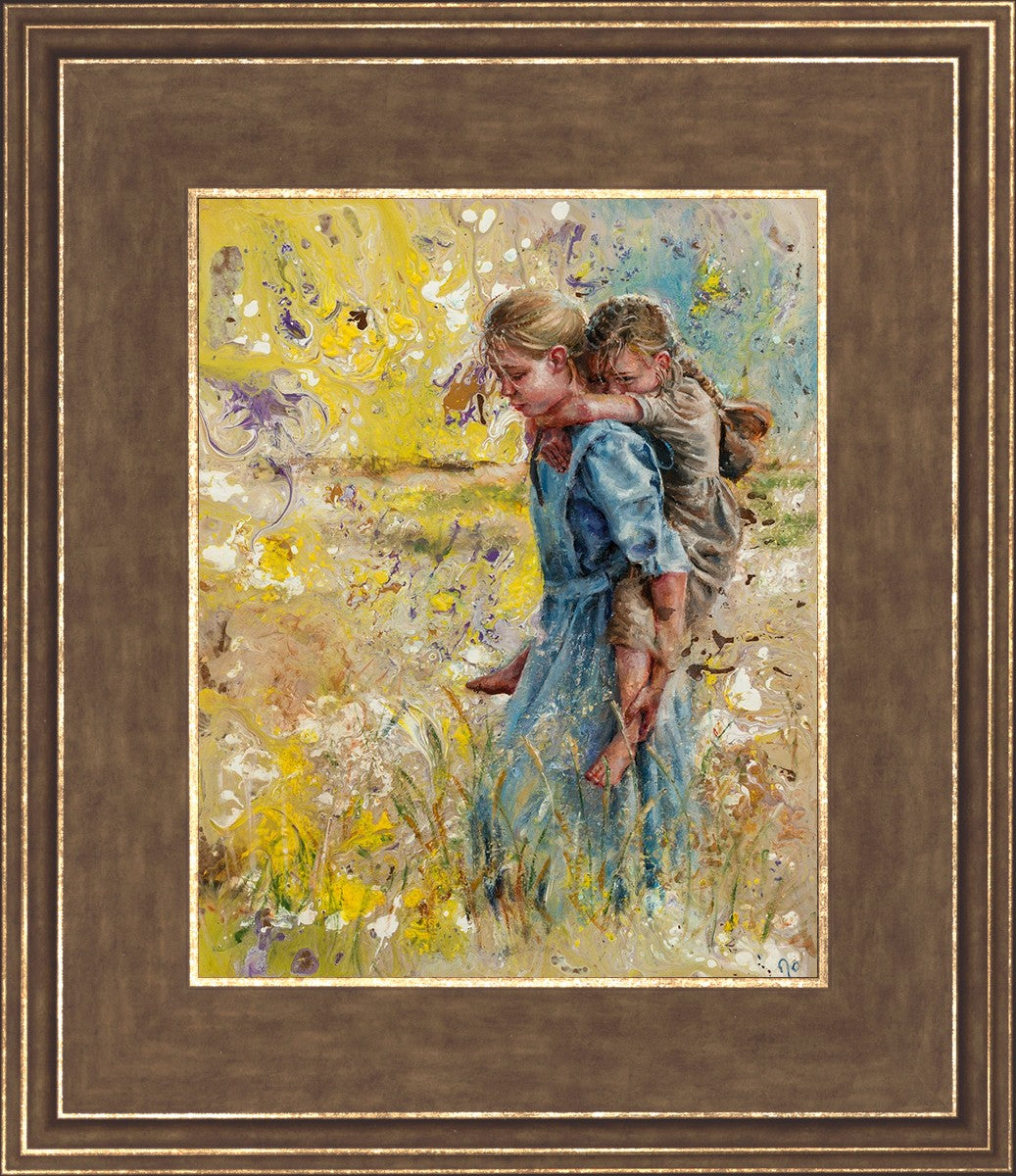 Painting of two pioneer sisters on the trail to Zion. The youngest, exhusted by the day'stravel is carried into camp by her older sister.
