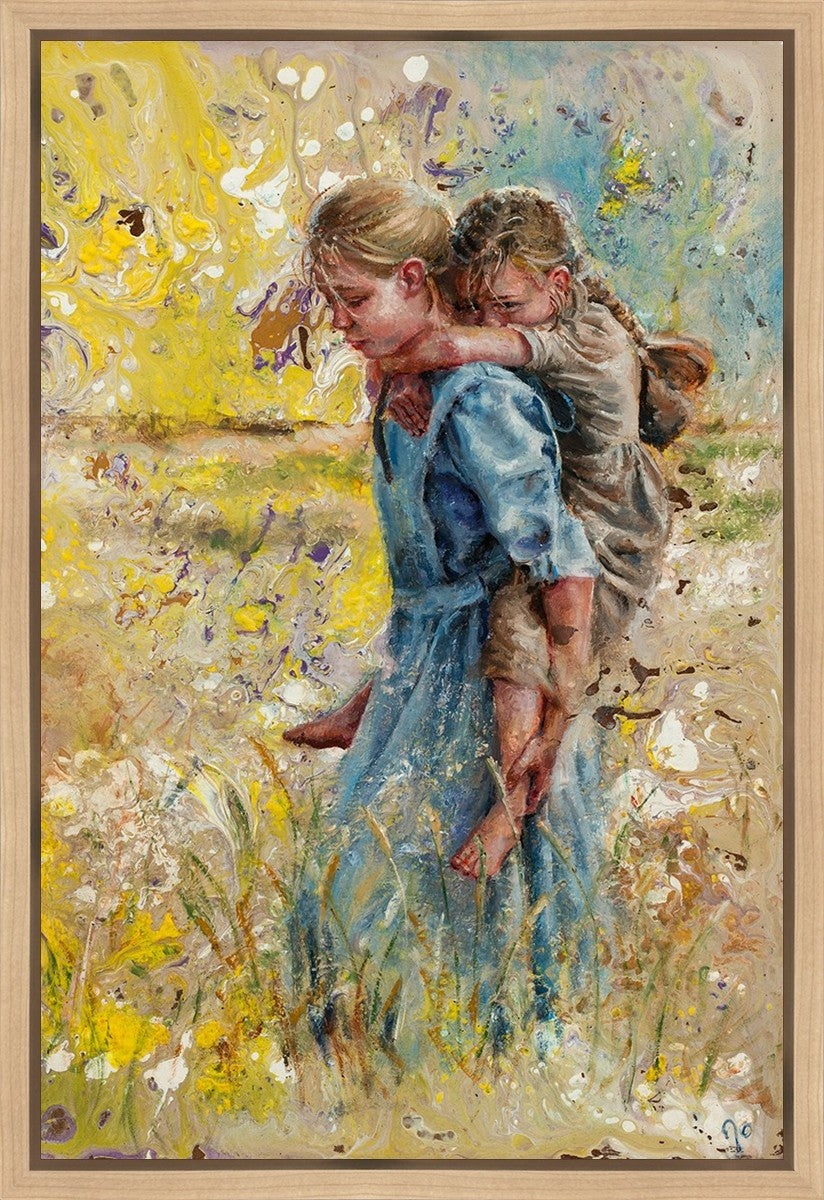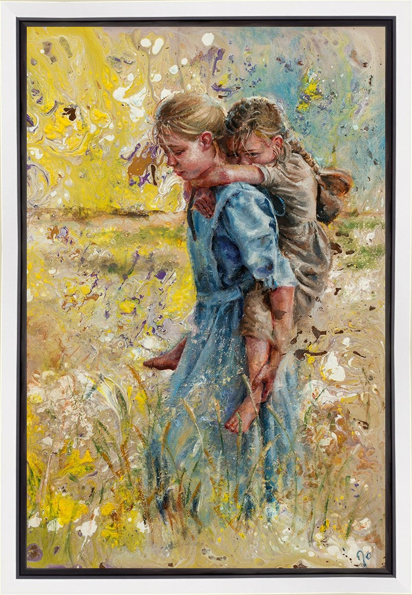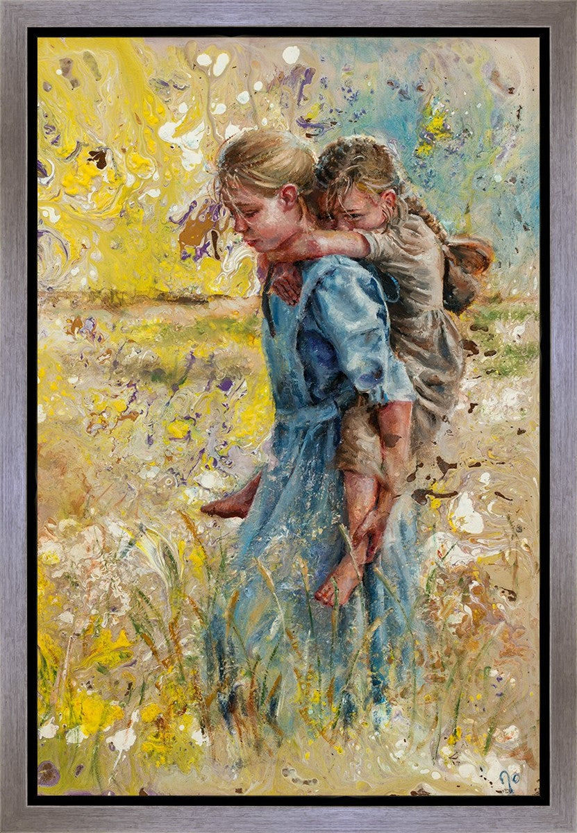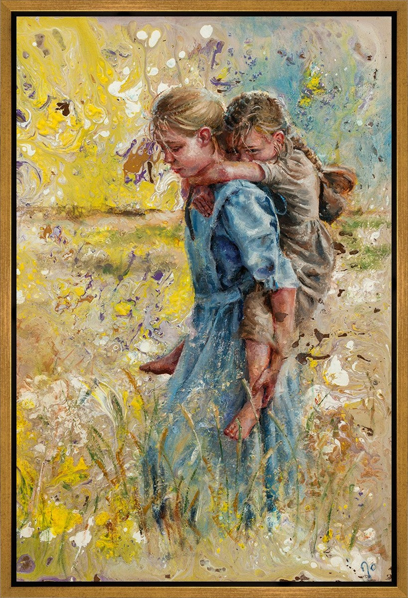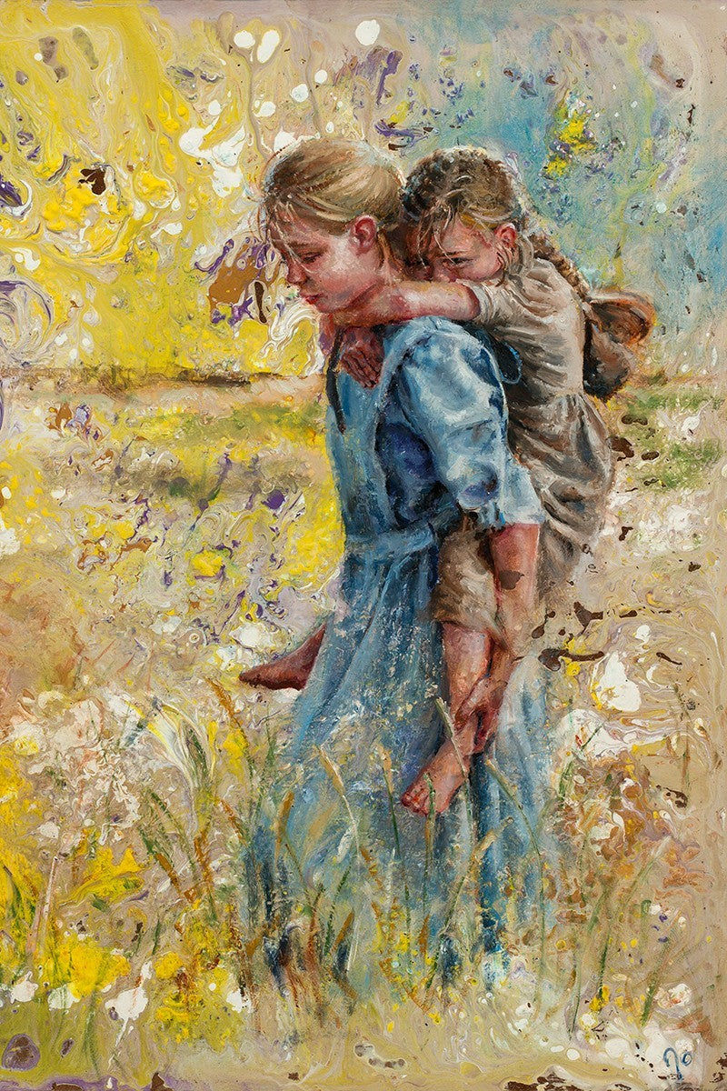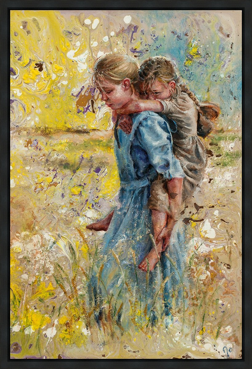 Painting of two pioneer sisters on the trail to Zion. The youngest, exhusted by the day'stravel is carried into camp by her older sister.