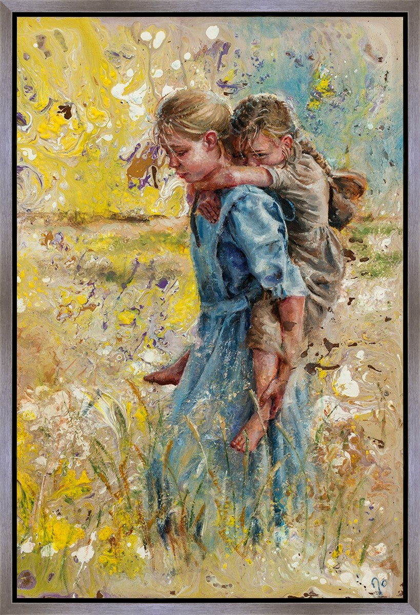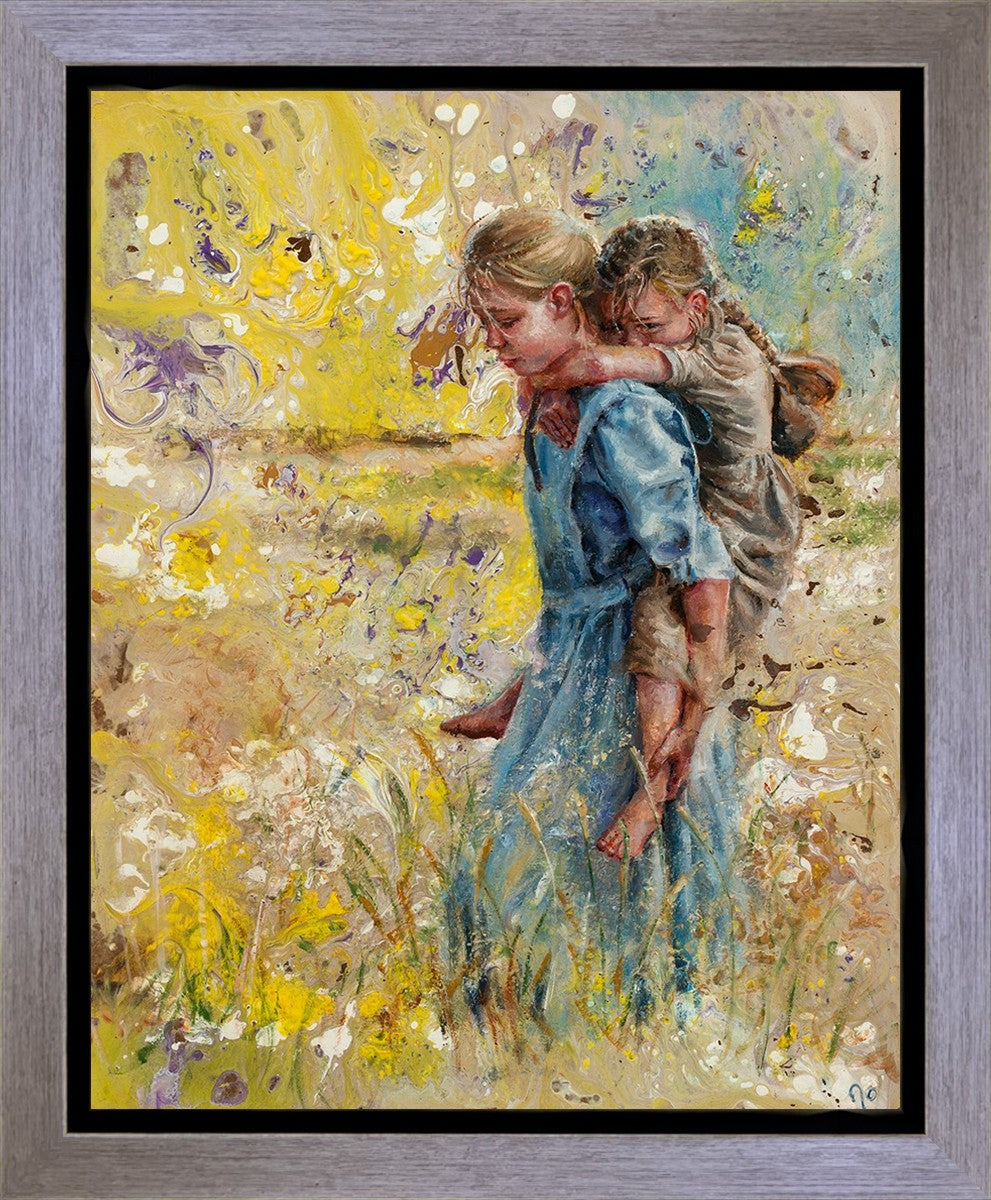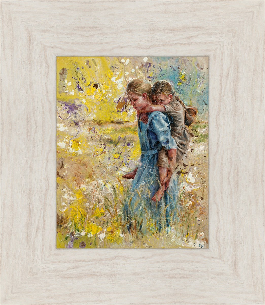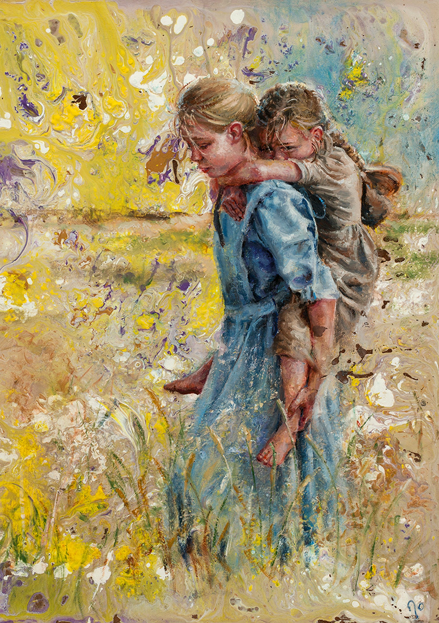 Painting of two pioneer sisters on the trail to Zion. The youngest, exhusted by the day'stravel is carried into camp by her older sister.