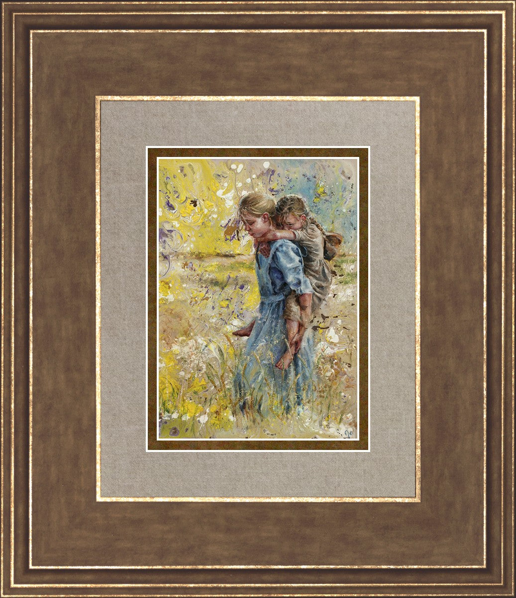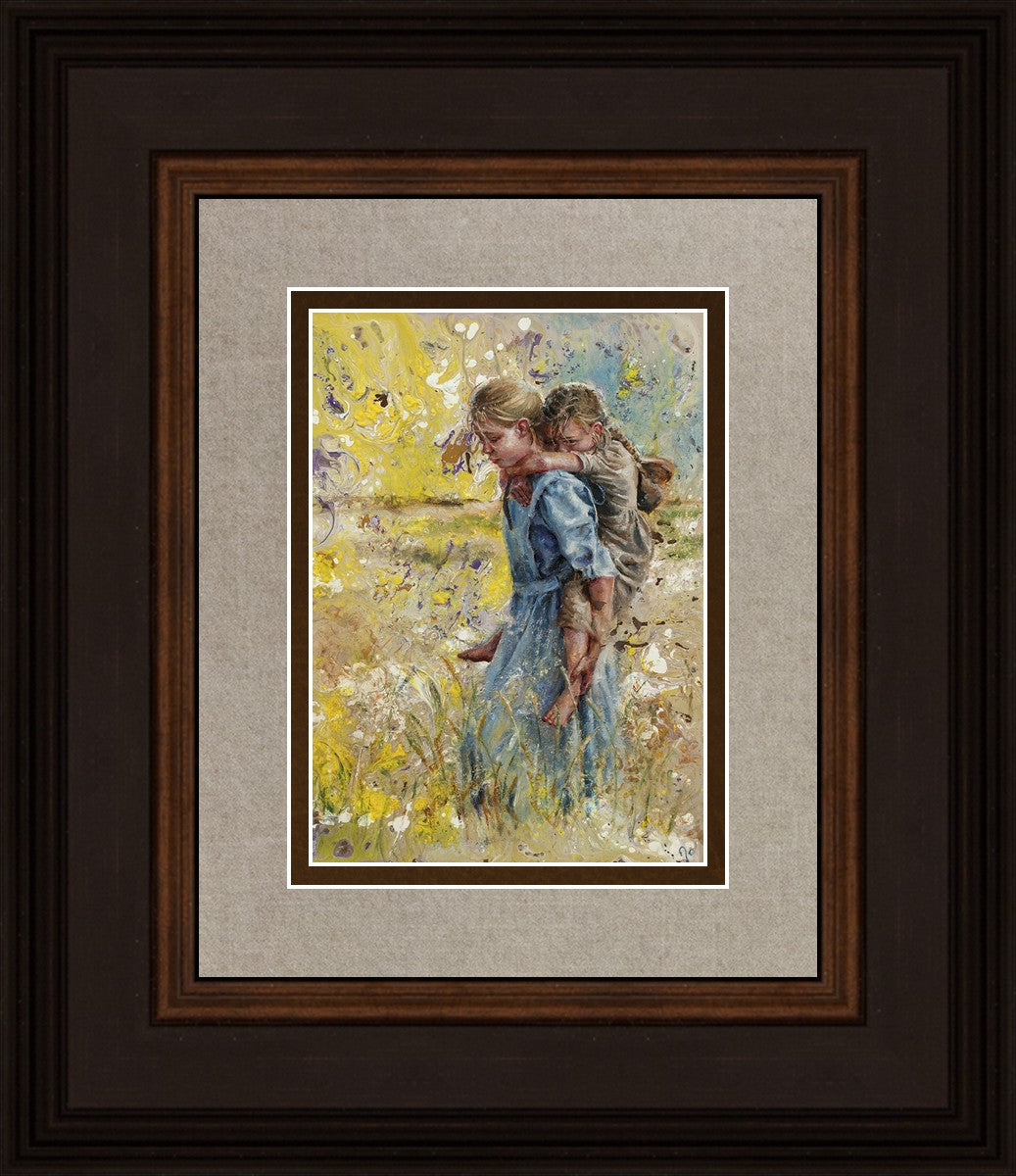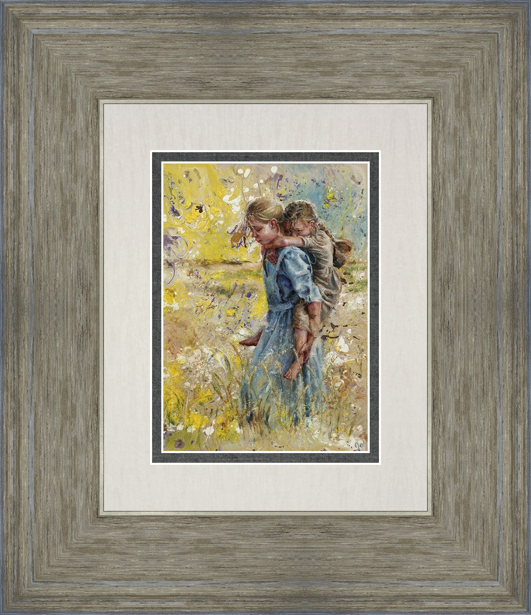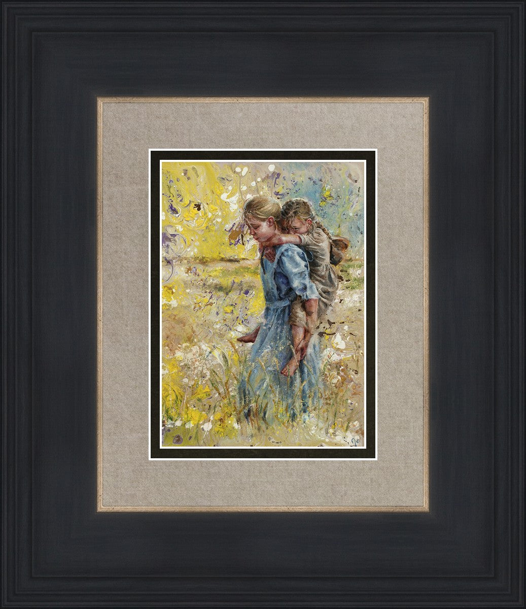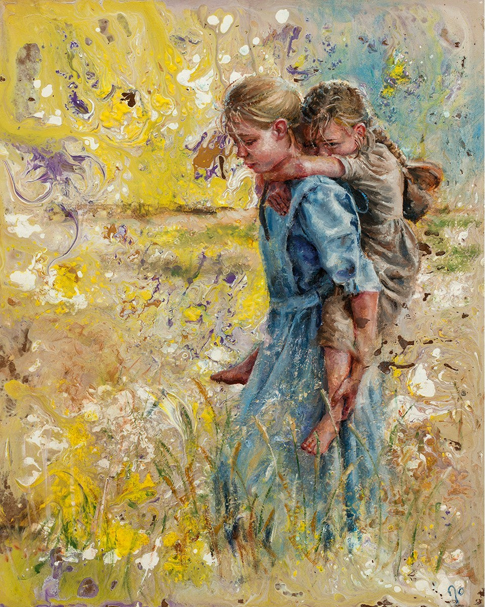 Painting of two pioneer sisters on the trail to Zion. The youngest, exhusted by the day'stravel is carried into camp by her older sister.