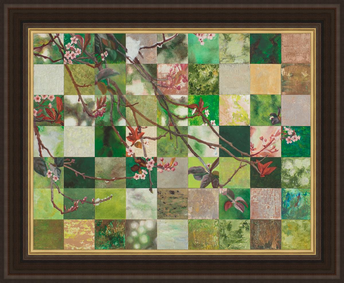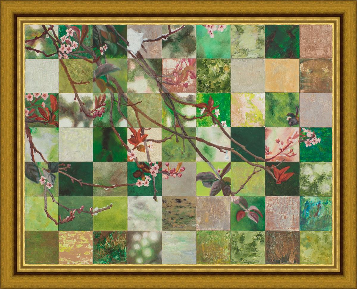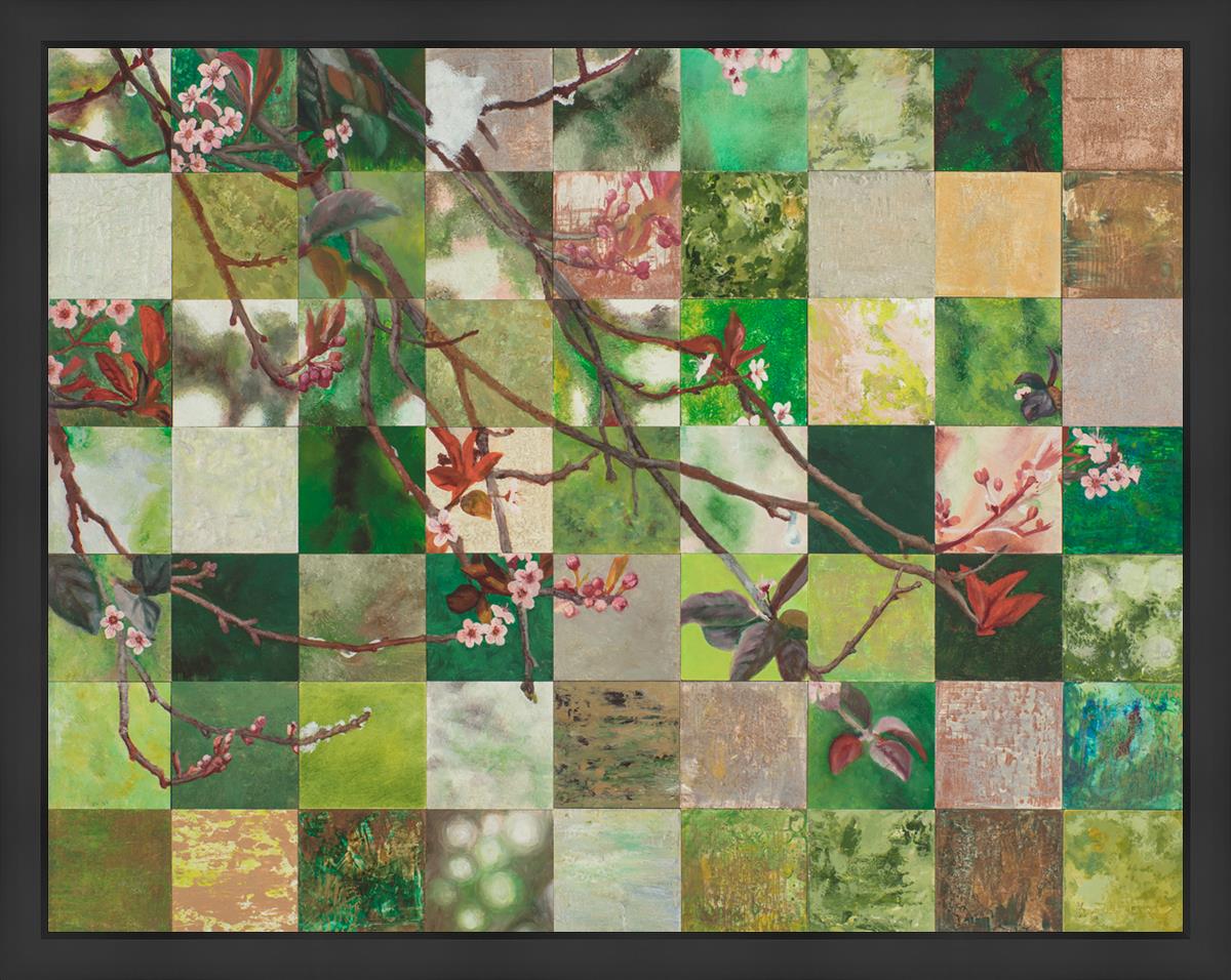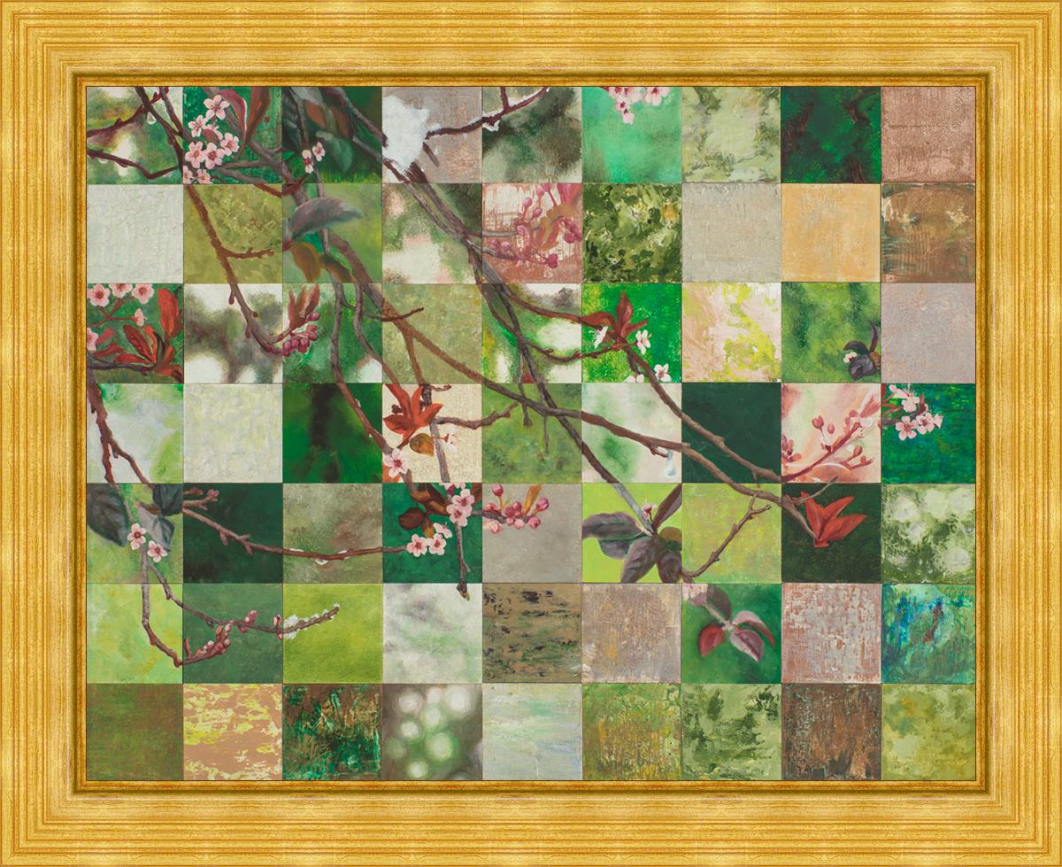 This piece is composed with 63 individual panels of the same branch on different days in the spring.