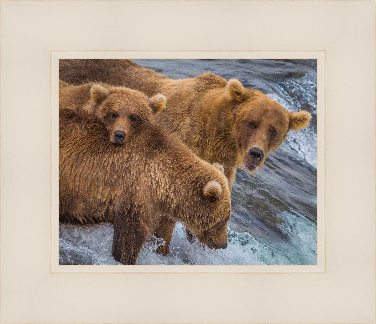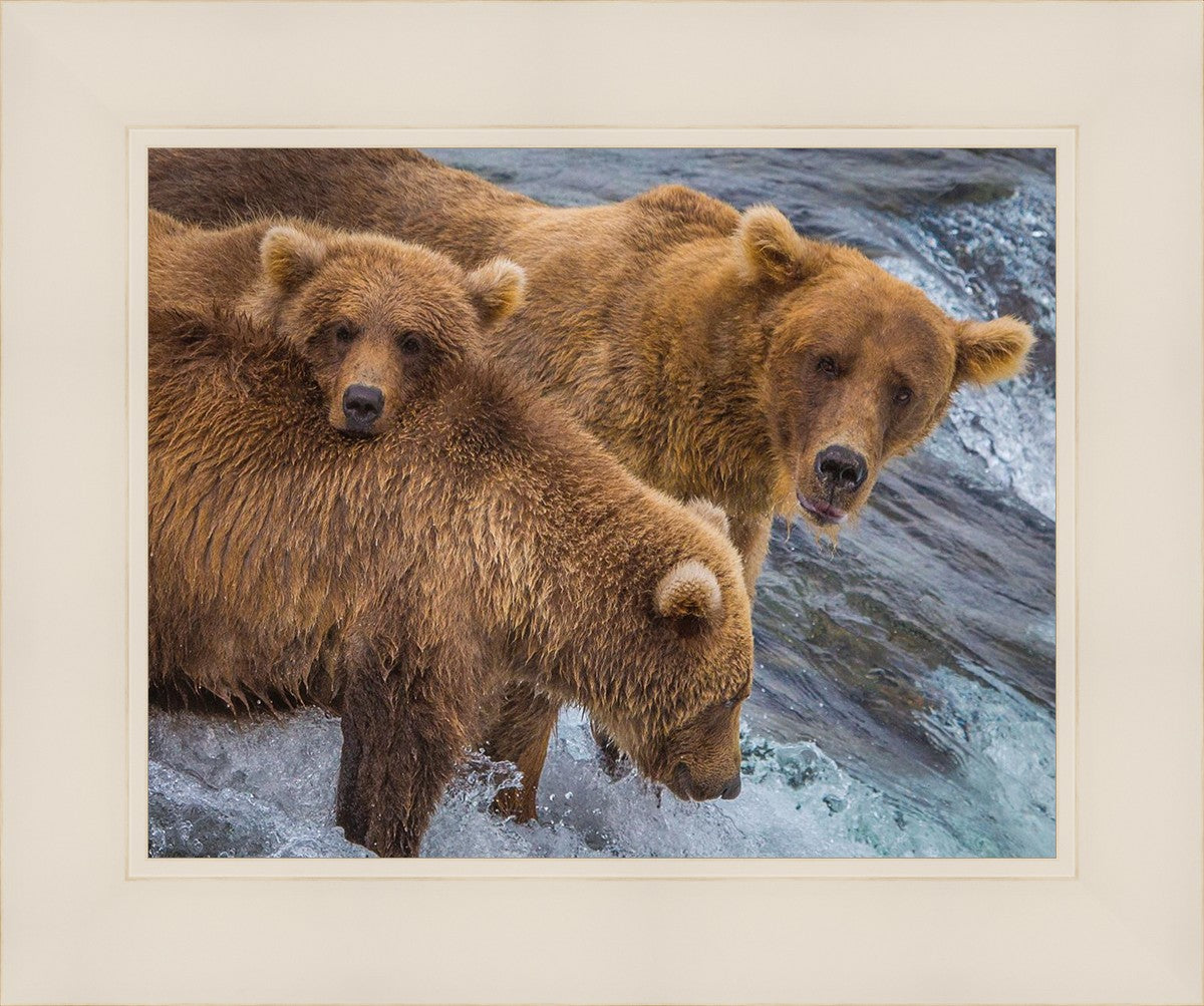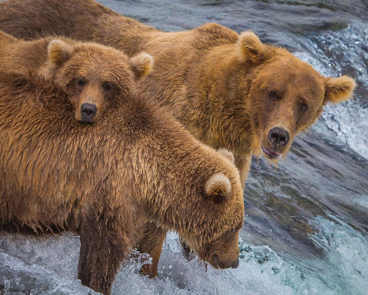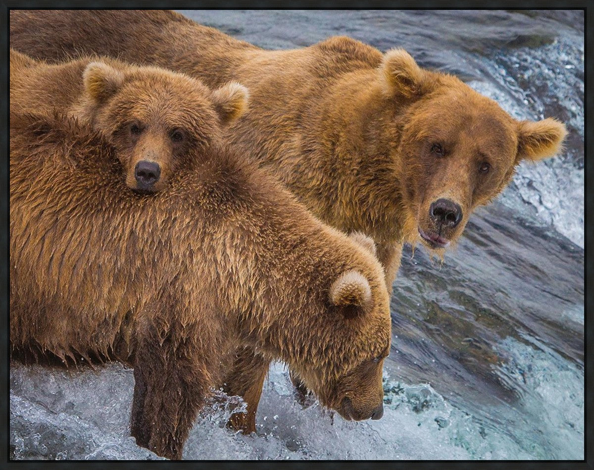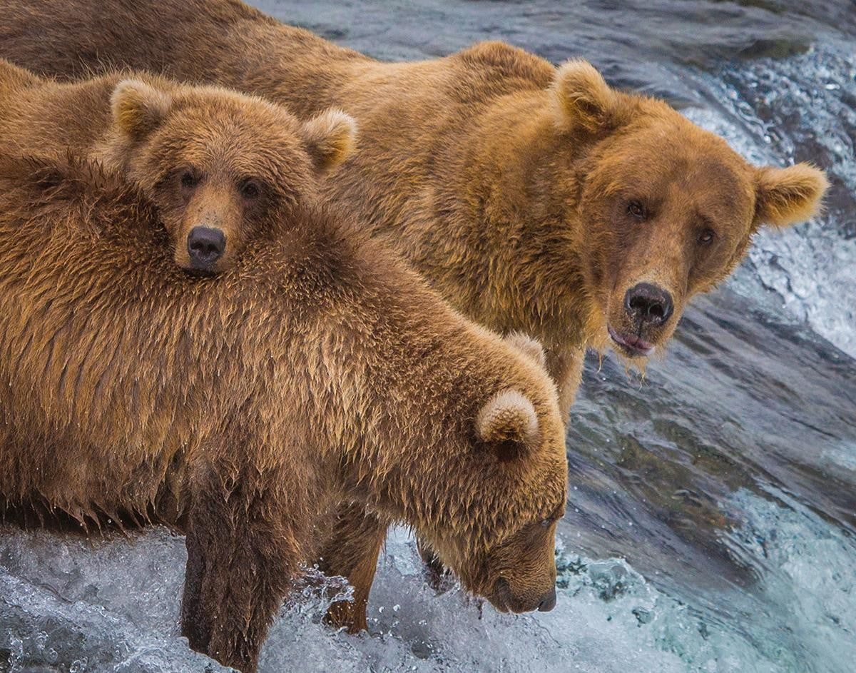 A family of grizzly bears dine at the rapids on the Katmai RIver in Alaska