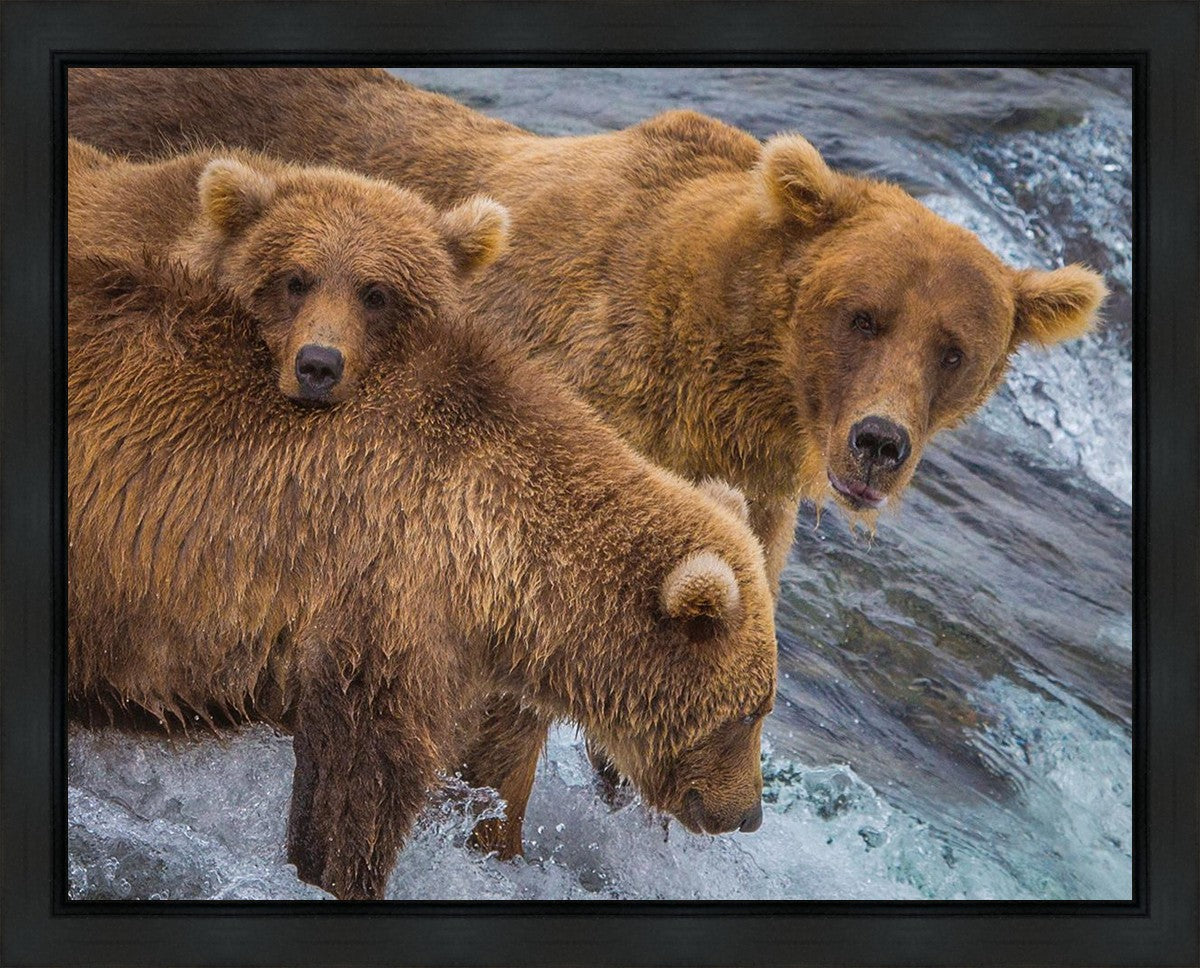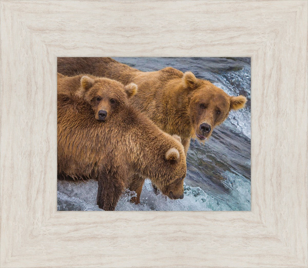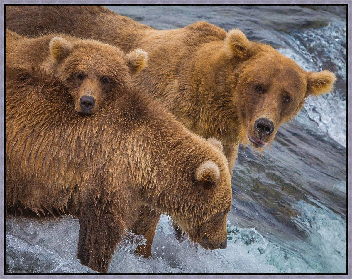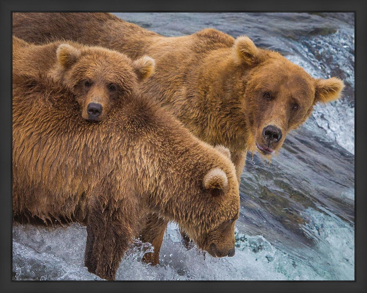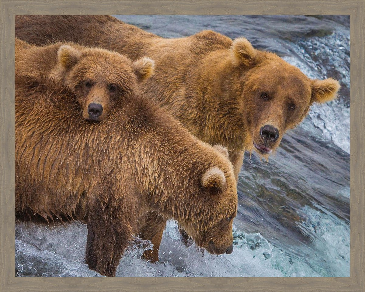 A family of grizzly bears dine at the rapids on the Katmai RIver in Alaska