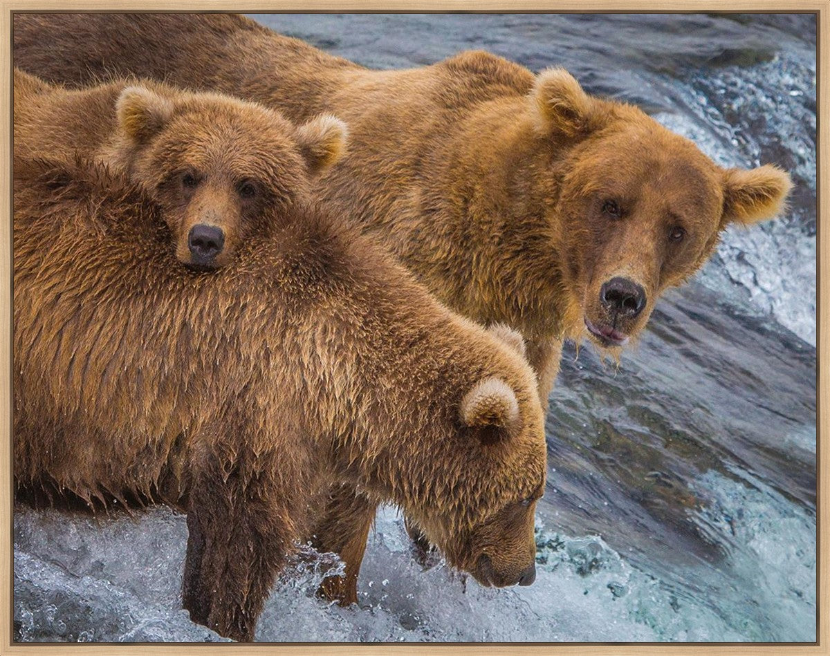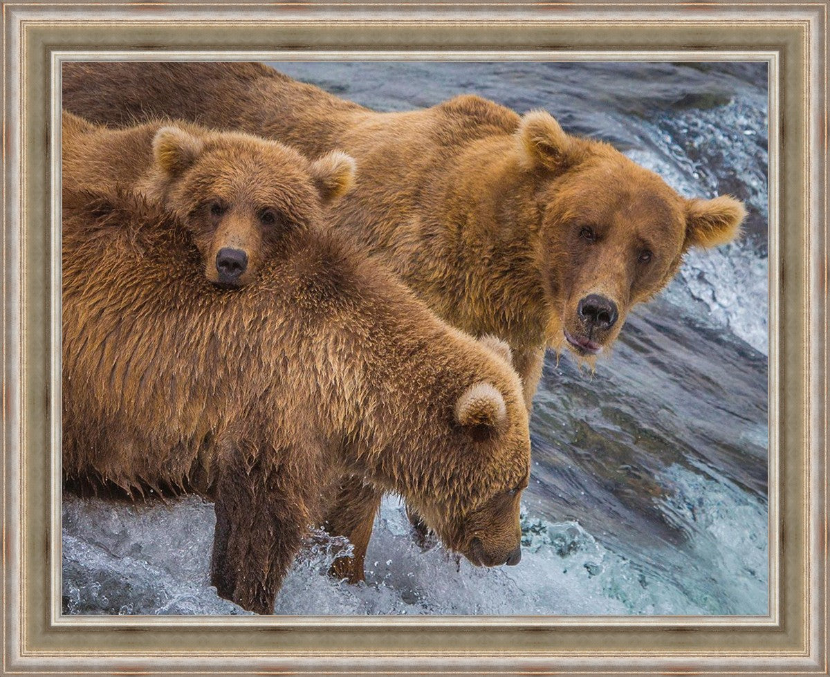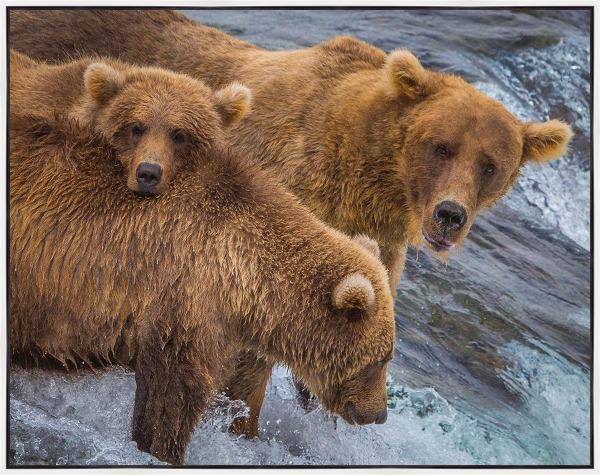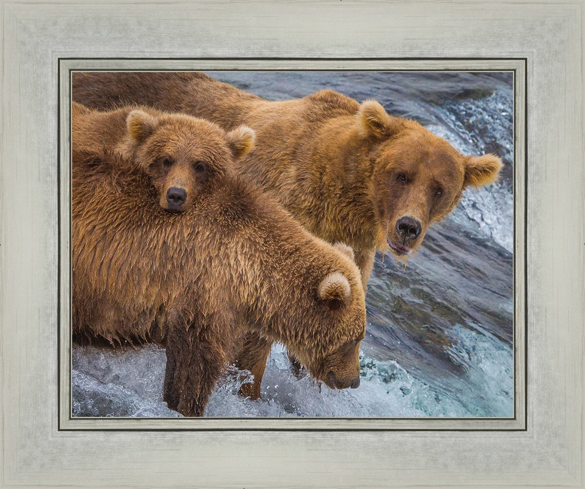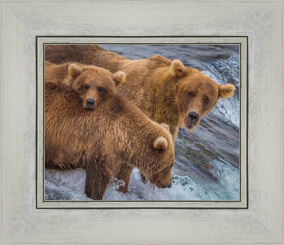 A family of grizzly bears dine at the rapids on the Katmai RIver in Alaska