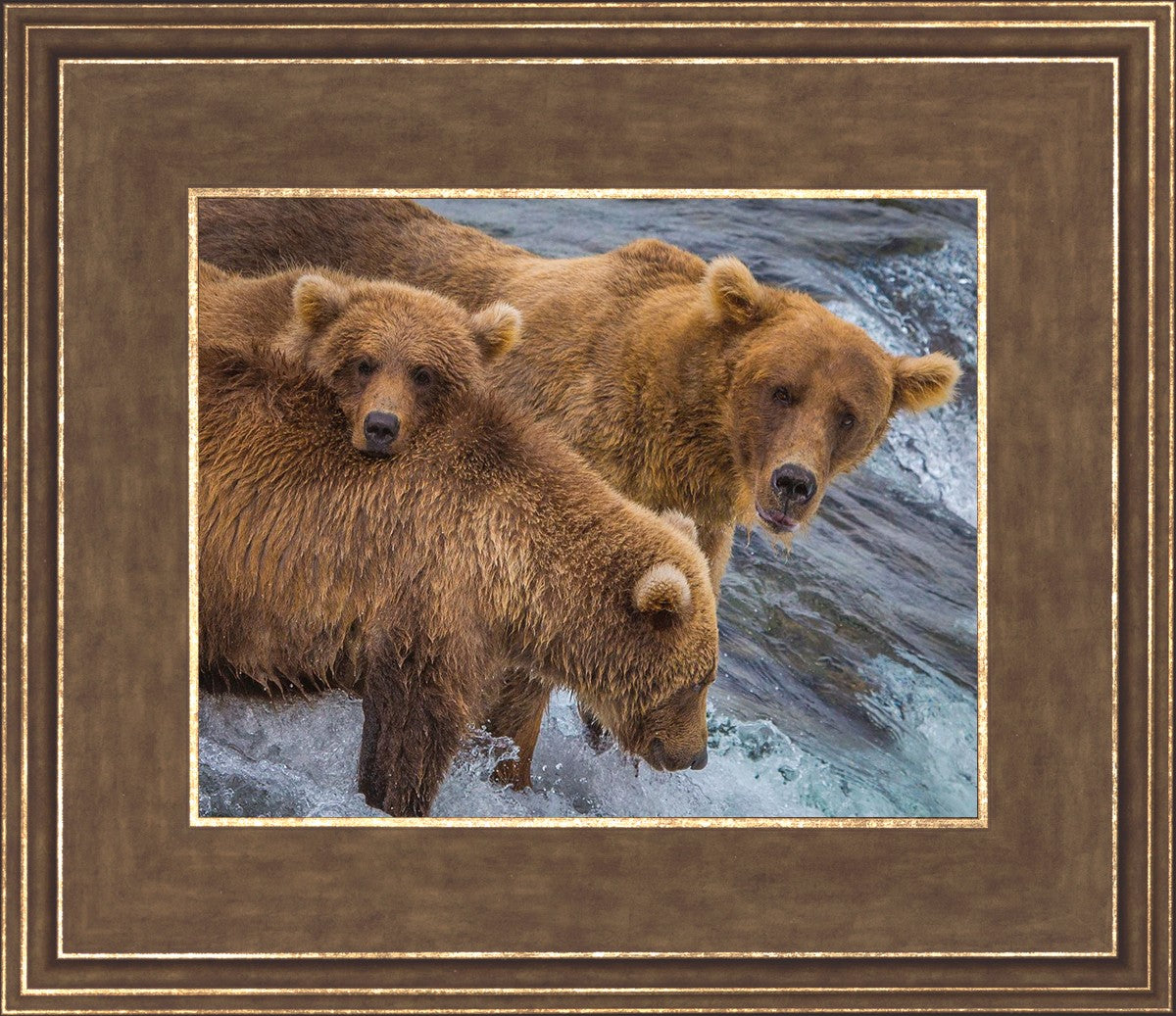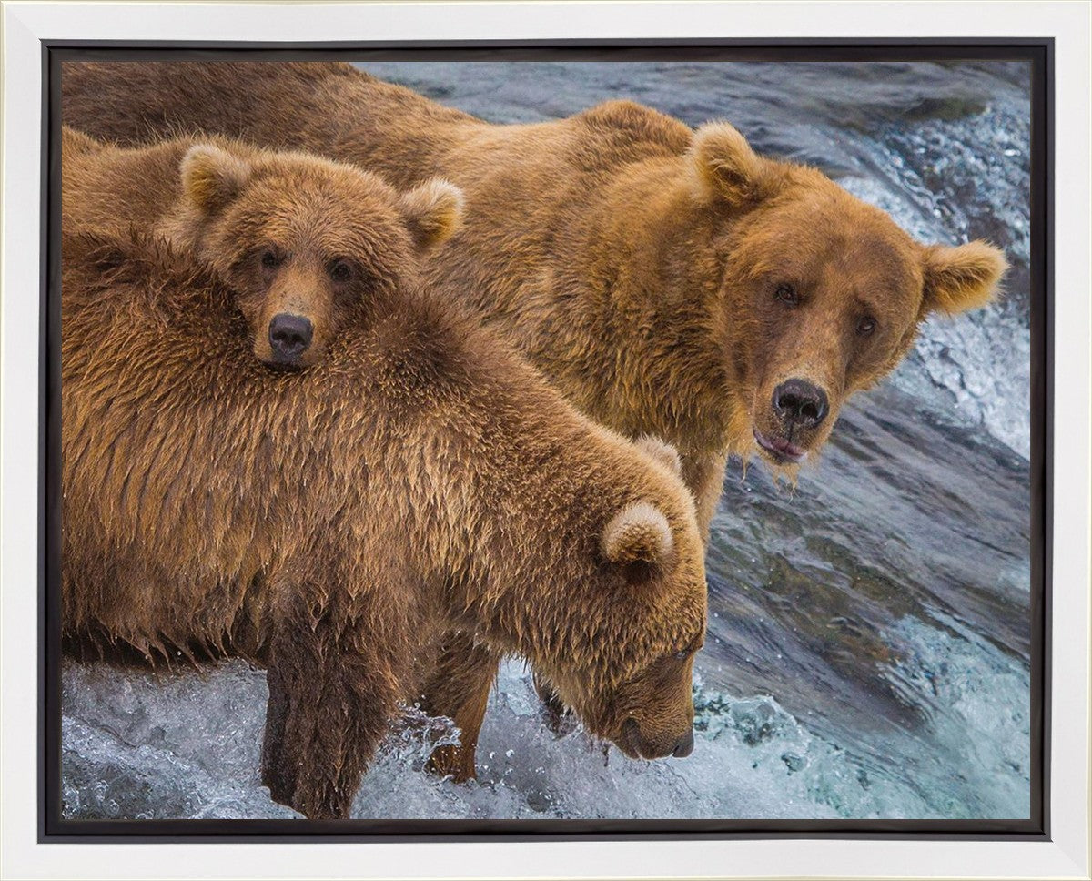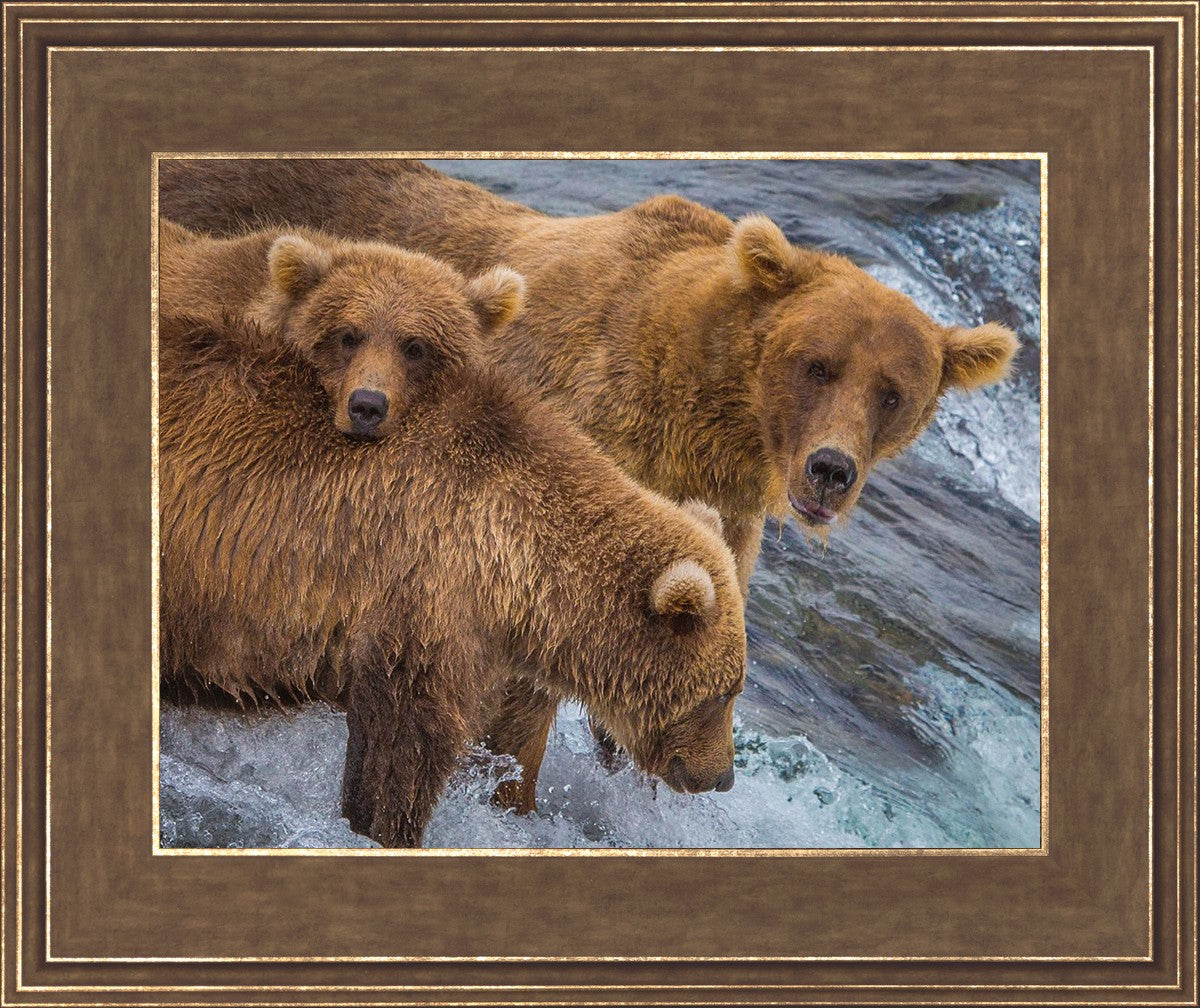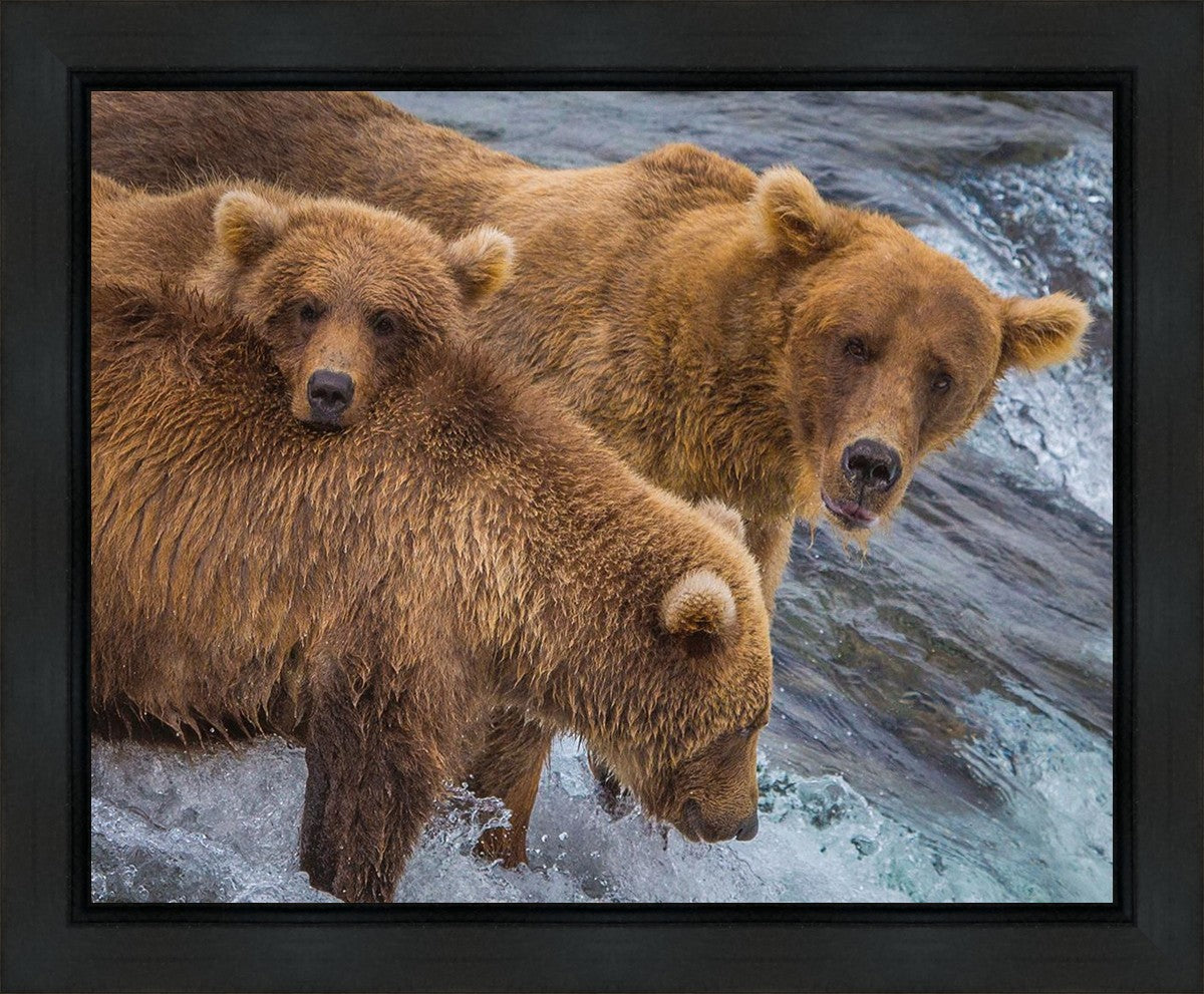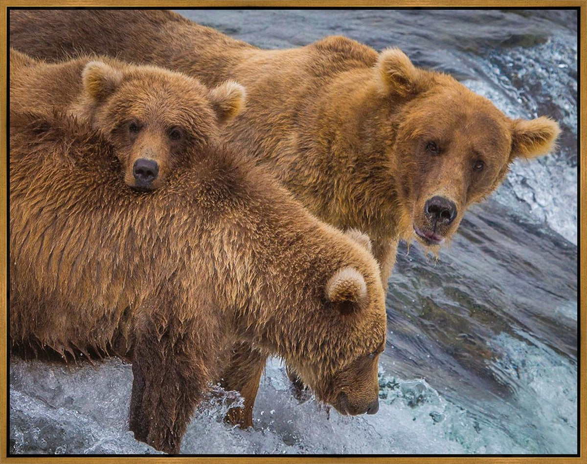 A family of grizzly bears dine at the rapids on the Katmai RIver in Alaska