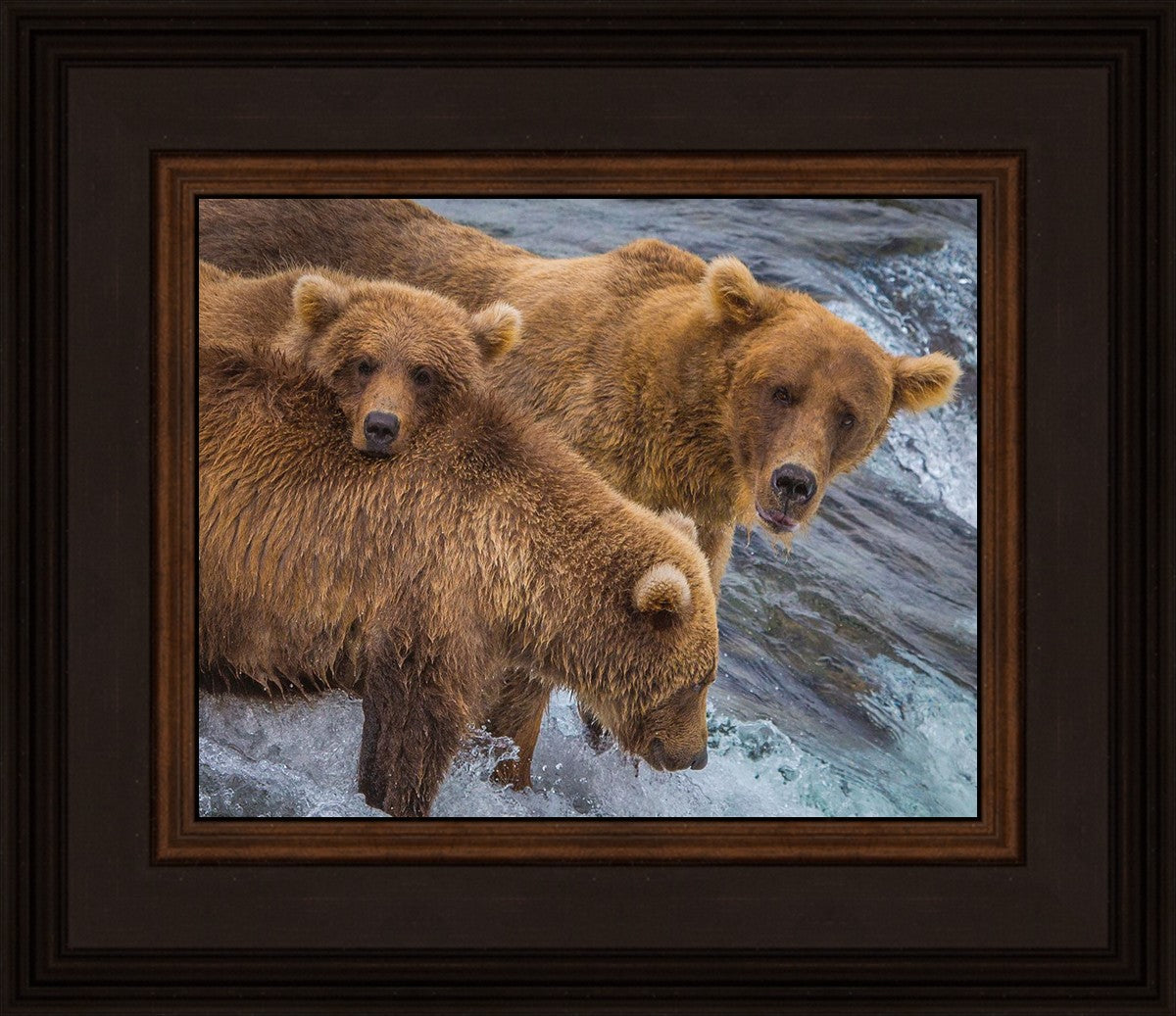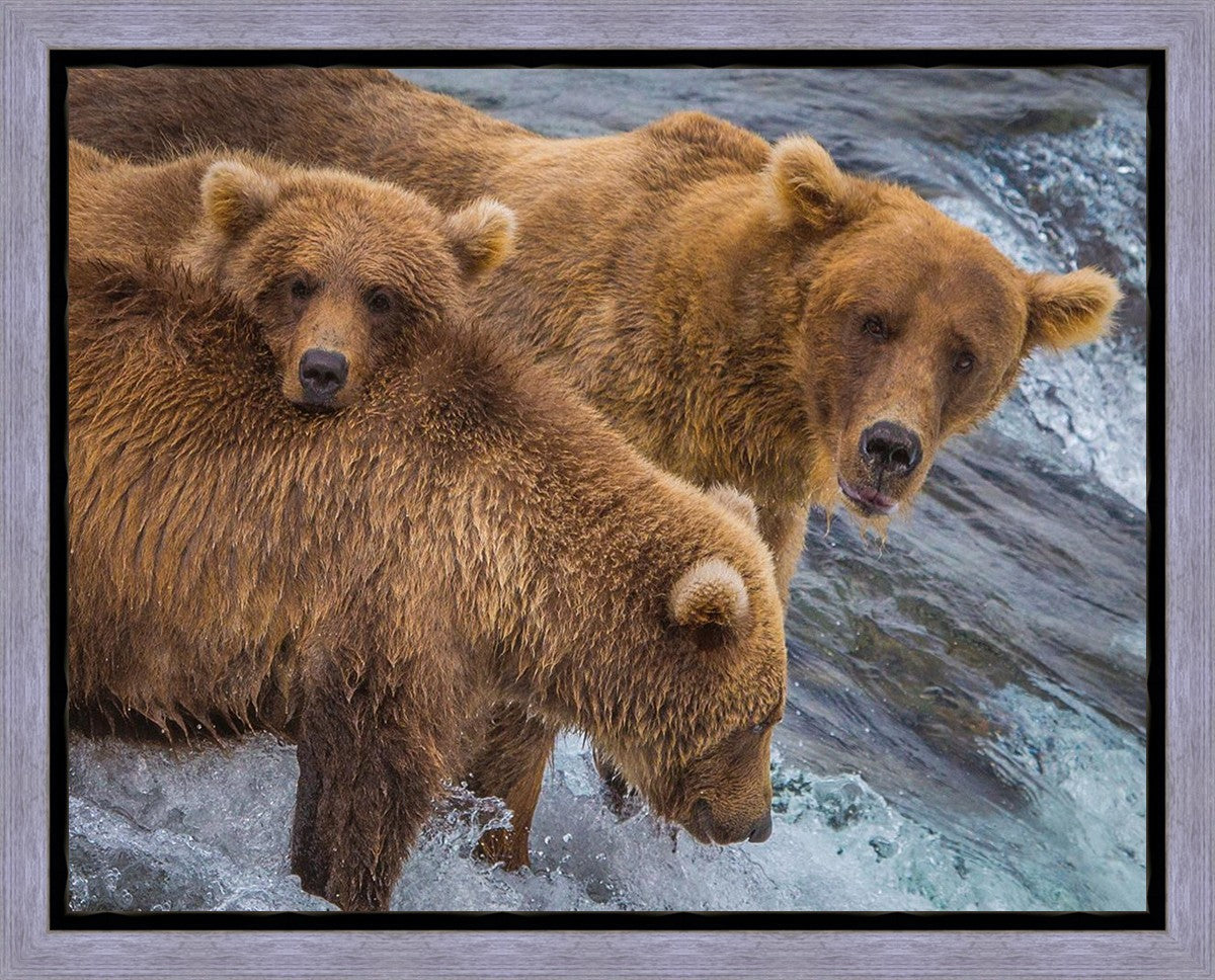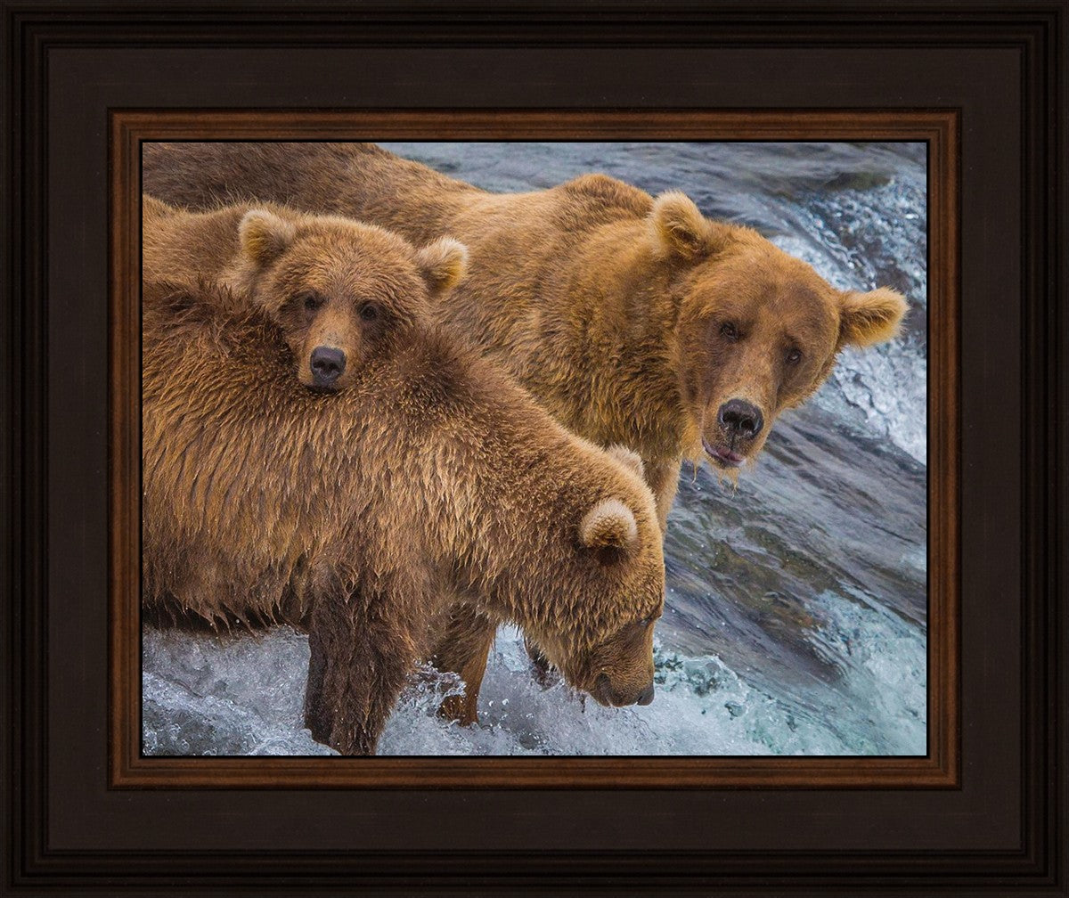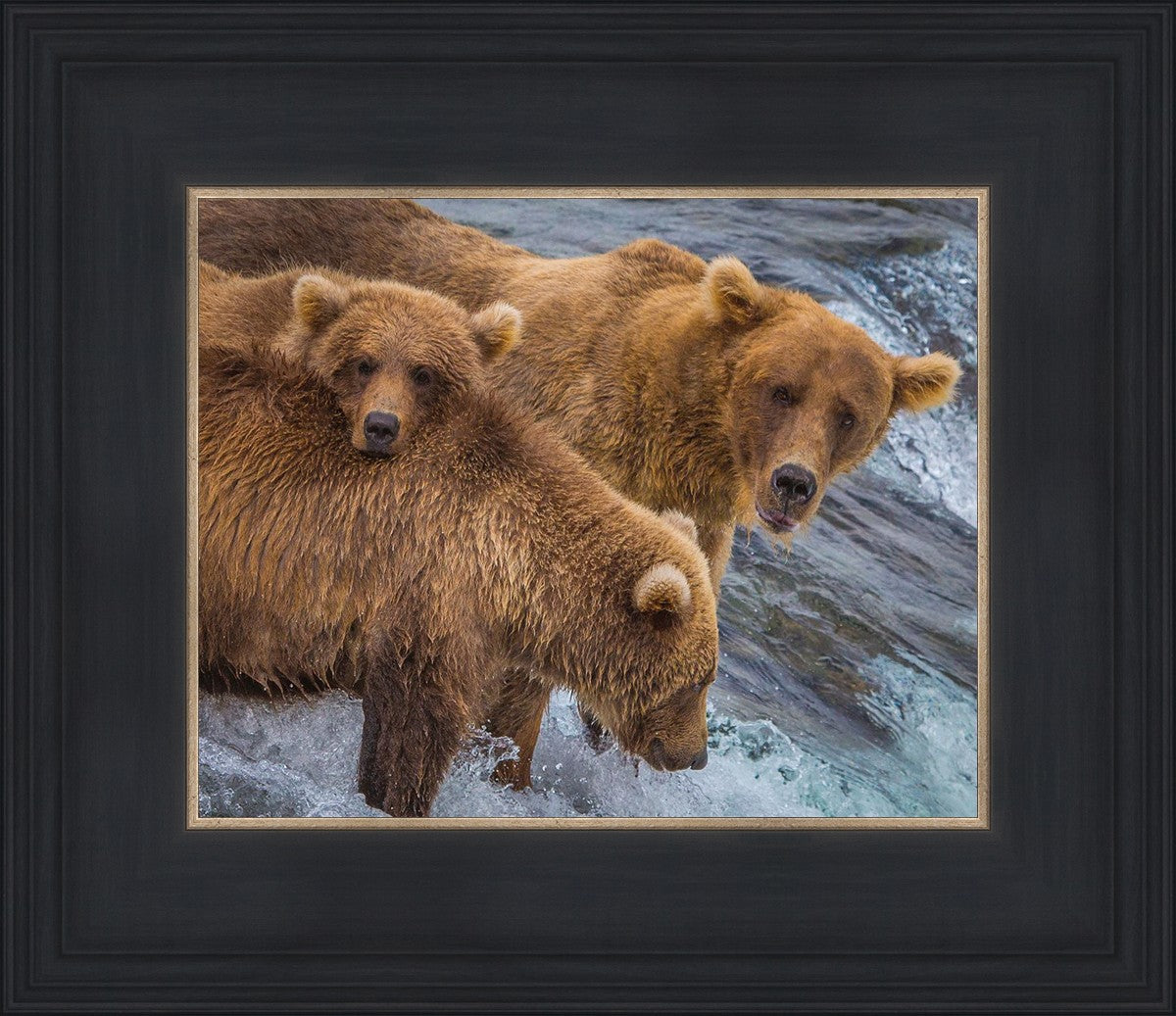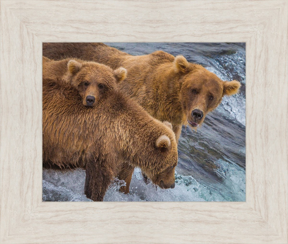 A family of grizzly bears dine at the rapids on the Katmai RIver in Alaska