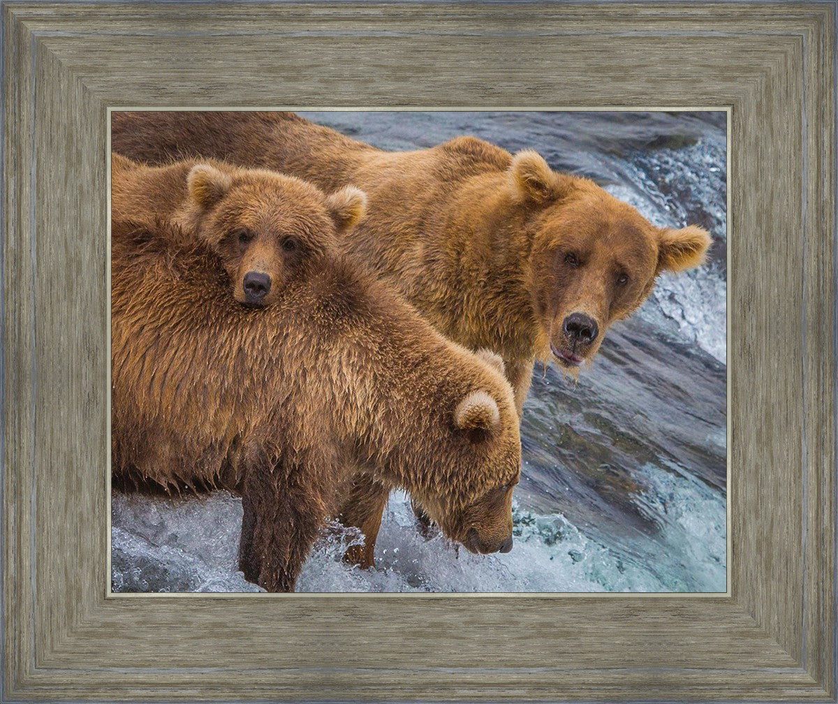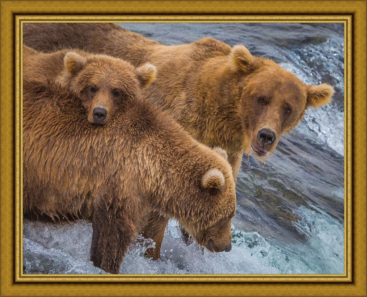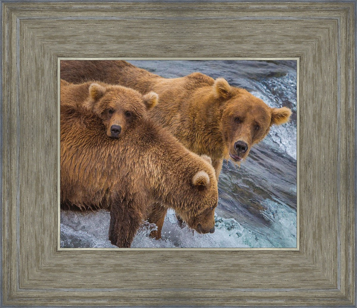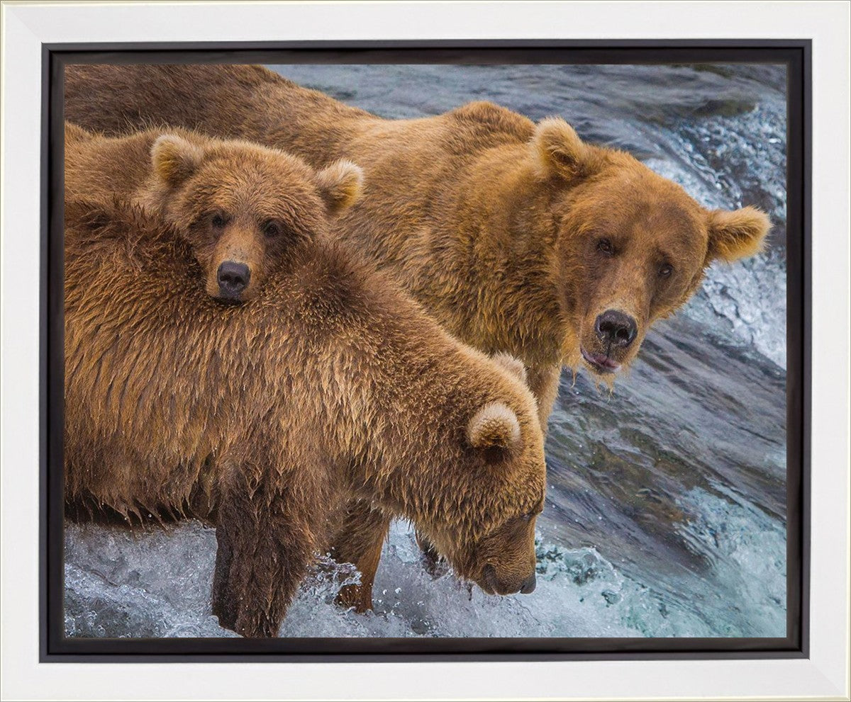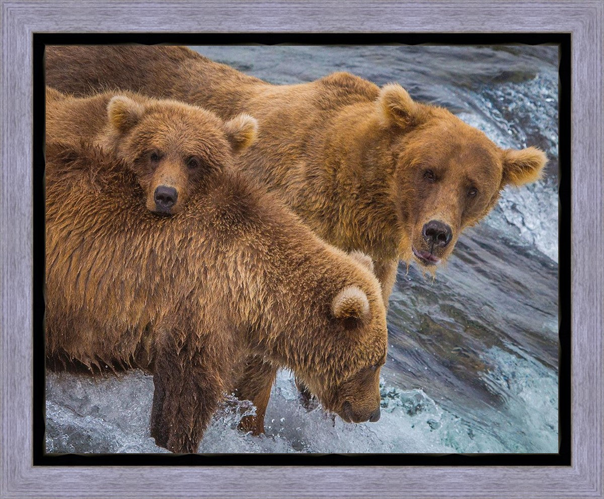 A family of grizzly bears dine at the rapids on the Katmai RIver in Alaska