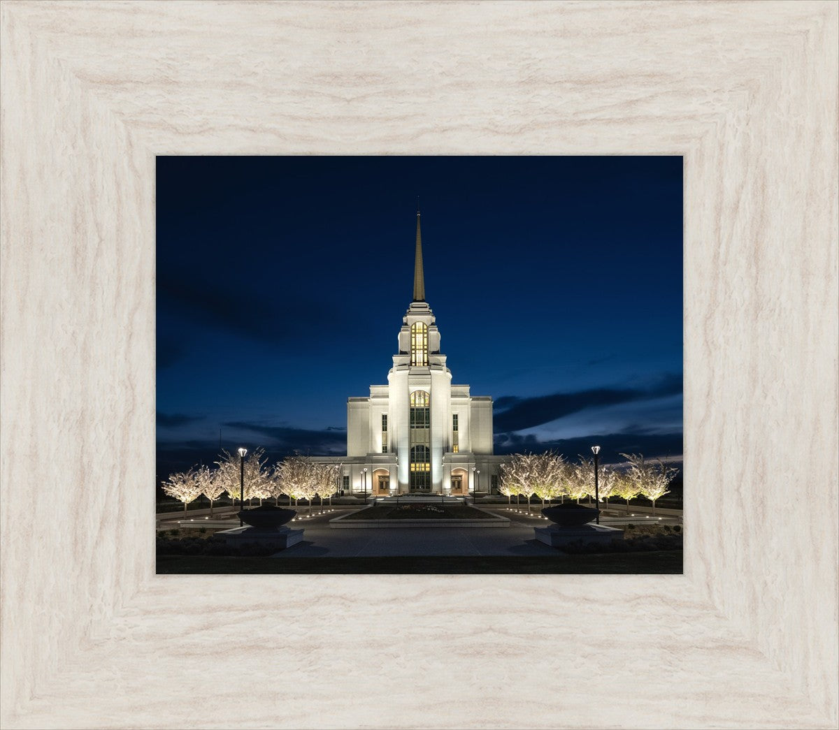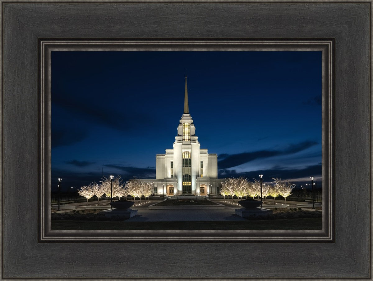 As the cherry trees were in full bloom this last spring and the Temple was preparing for the open house, I was able to capture this shot from the front as the sky turned dark and the Temple lights grew bright.