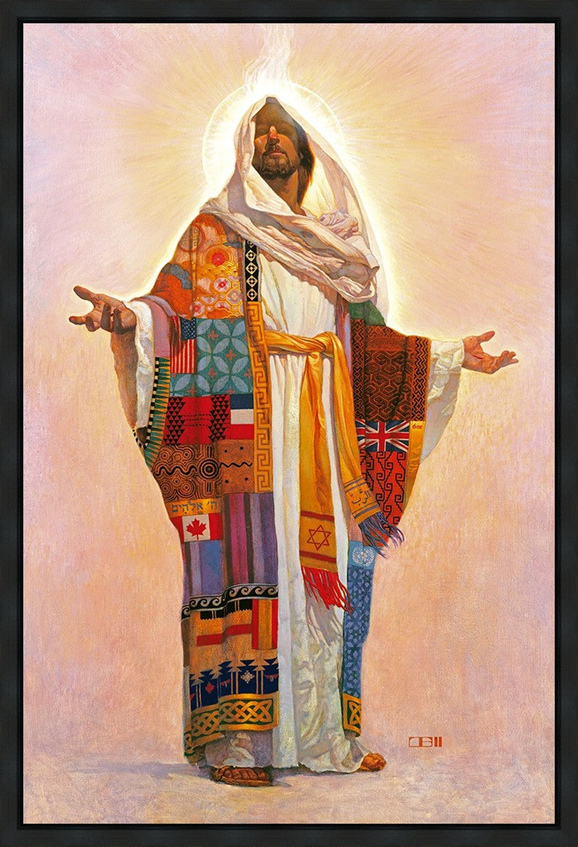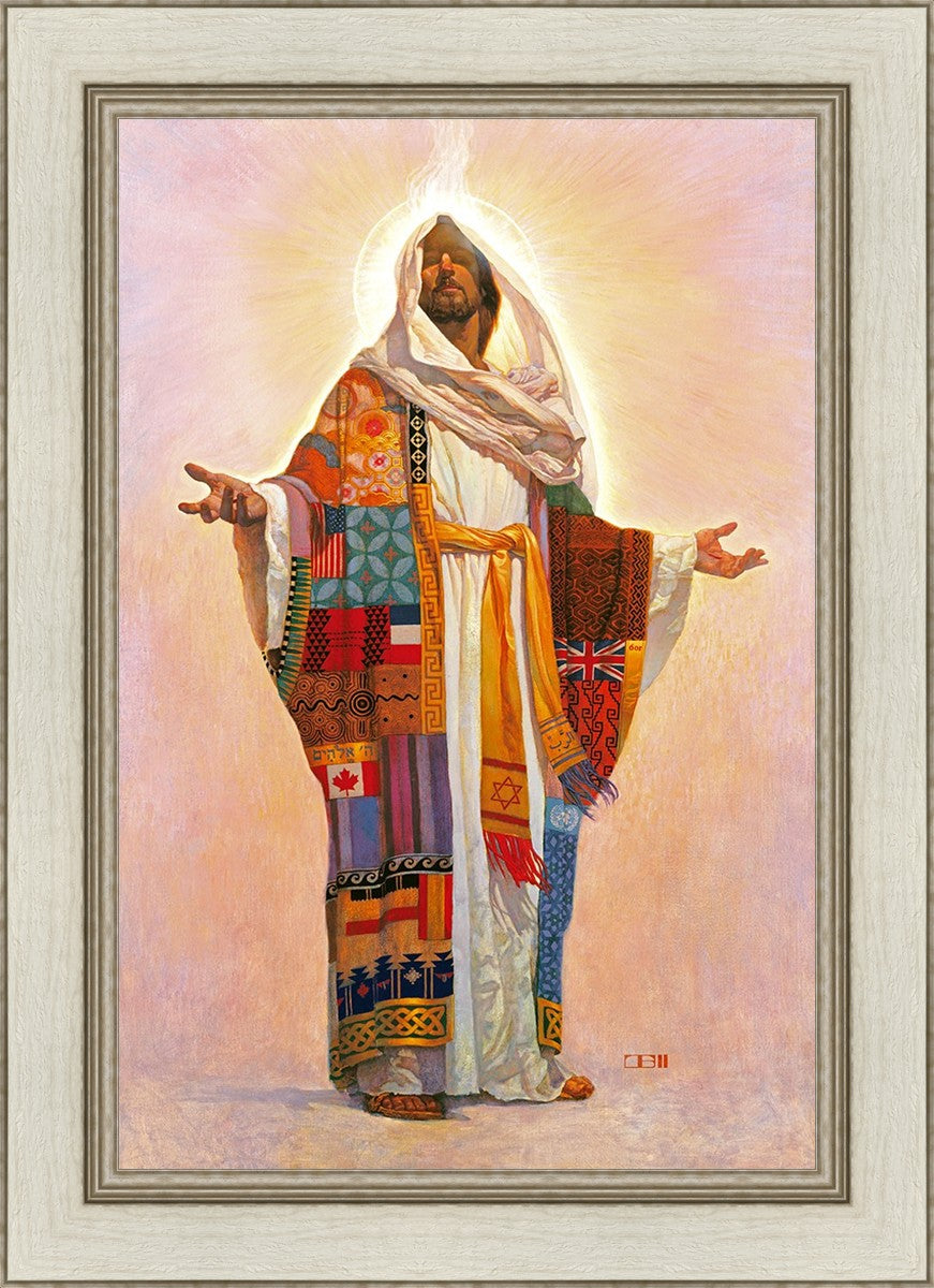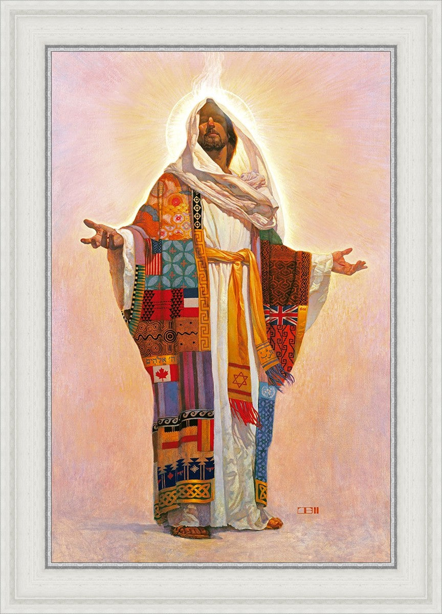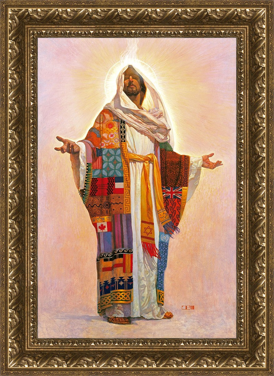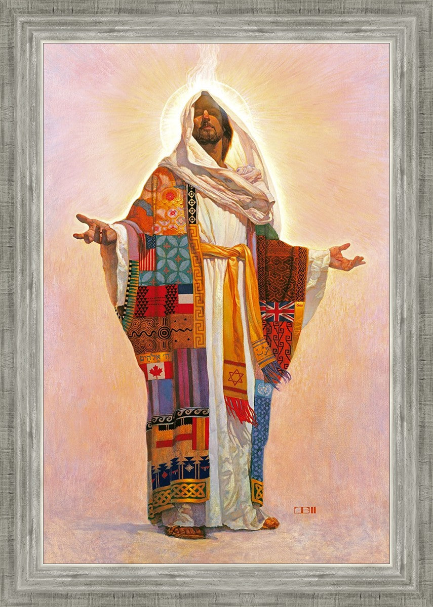 I think we have no concept of how Jesus Christ actually looks; therefore, I have not clearly indicated His features here. Because He is Lord, He represents all the people of the world. On His coat are flags of the nations and fabrics of the cultures of the world. All the colors of the coat represent the sin that He took on Himself on our behalf. The white robe under the coat represents His pureness, His being totally without sin. The golden sash is referred to in Scripture as being worn by royalty. He is truly Lord of All!.