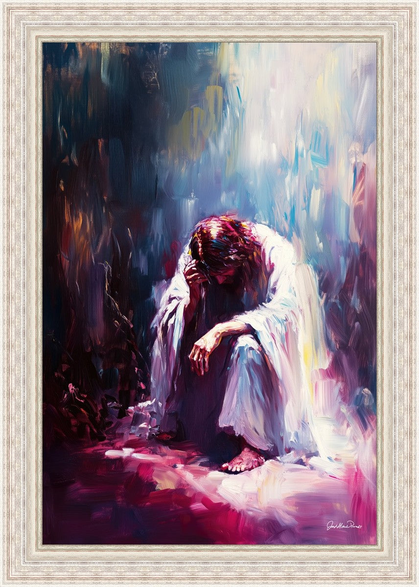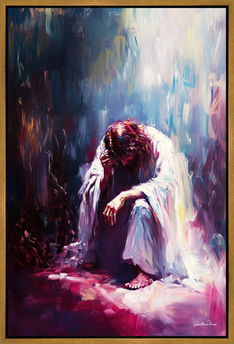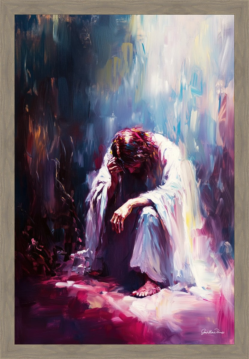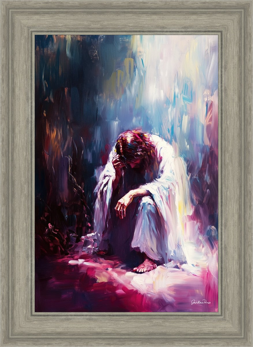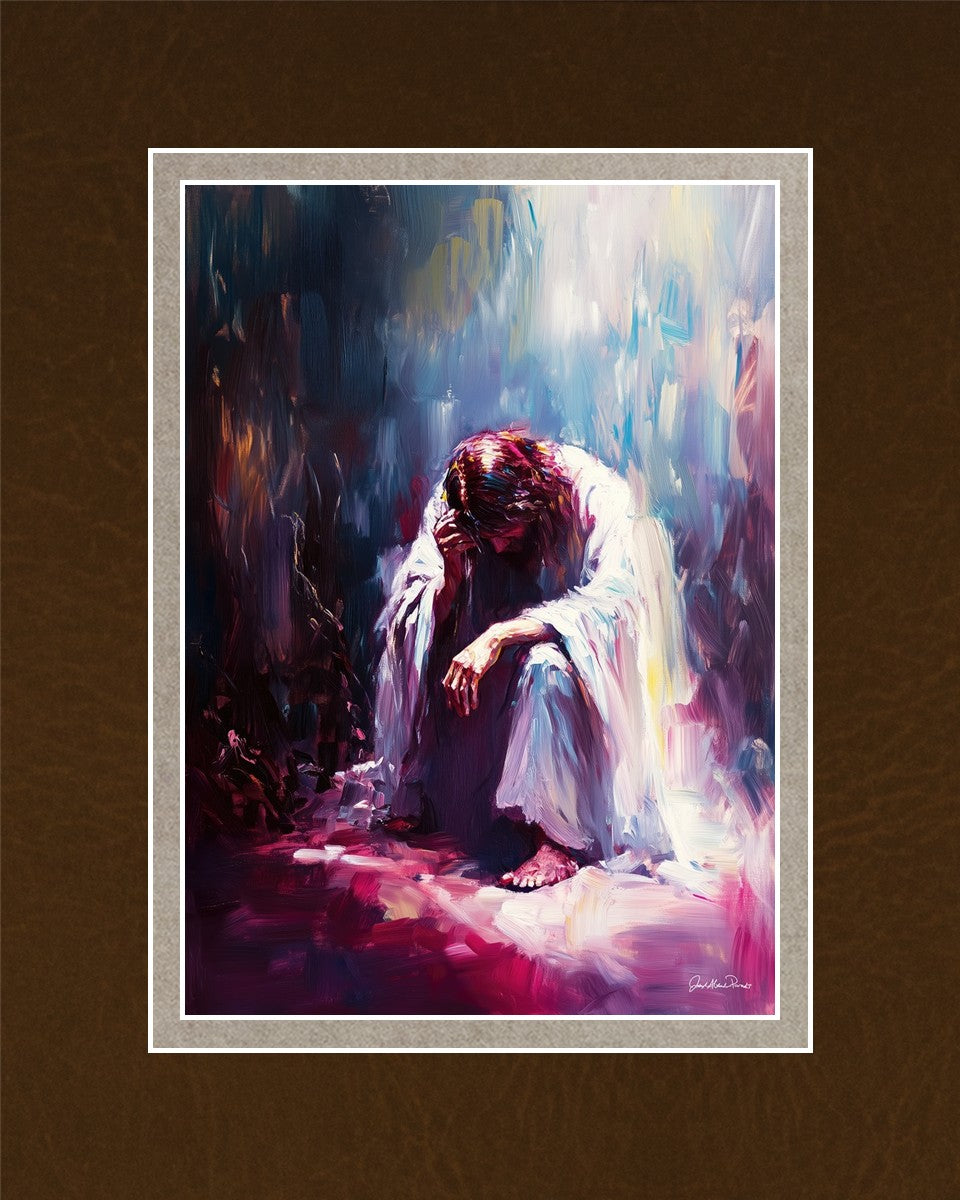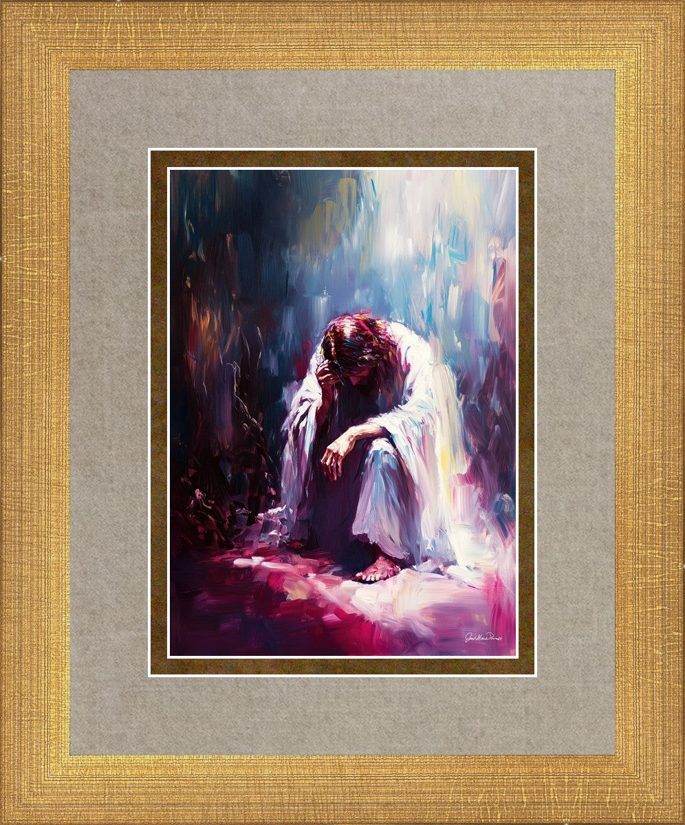 This artwork is a very intimate and poignant moment depicting the Lord resting between His miracle of performing the Atonement in the Garden of Gethsemane, having drunk from that bitter cup. It is a heartfelt reminder of what the Lord did for each of us, and is meant to invoke gratitude for His ultimate act of charity.