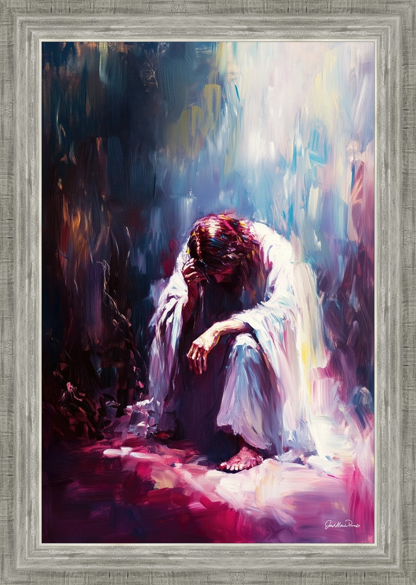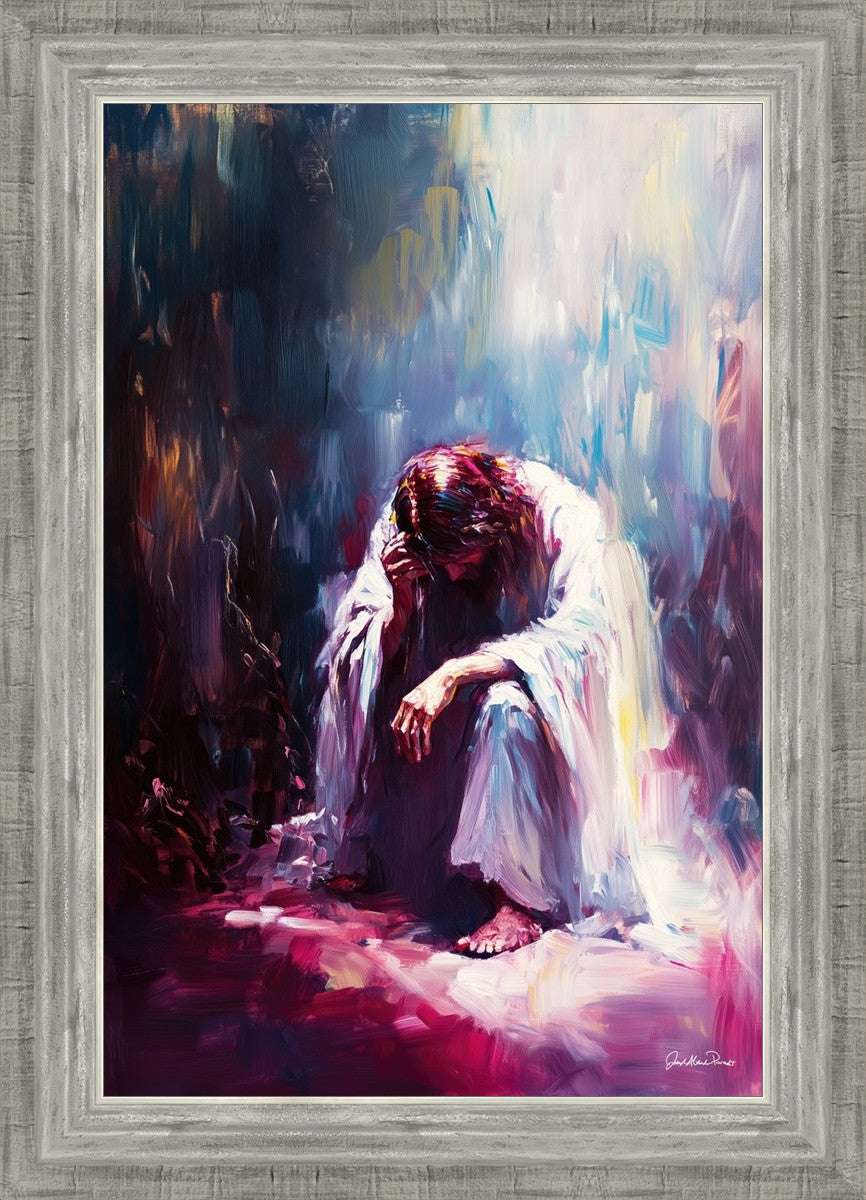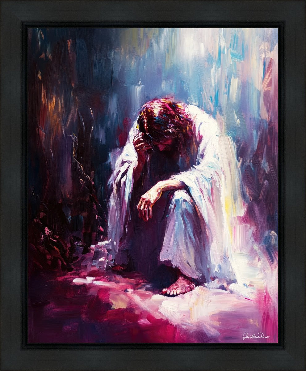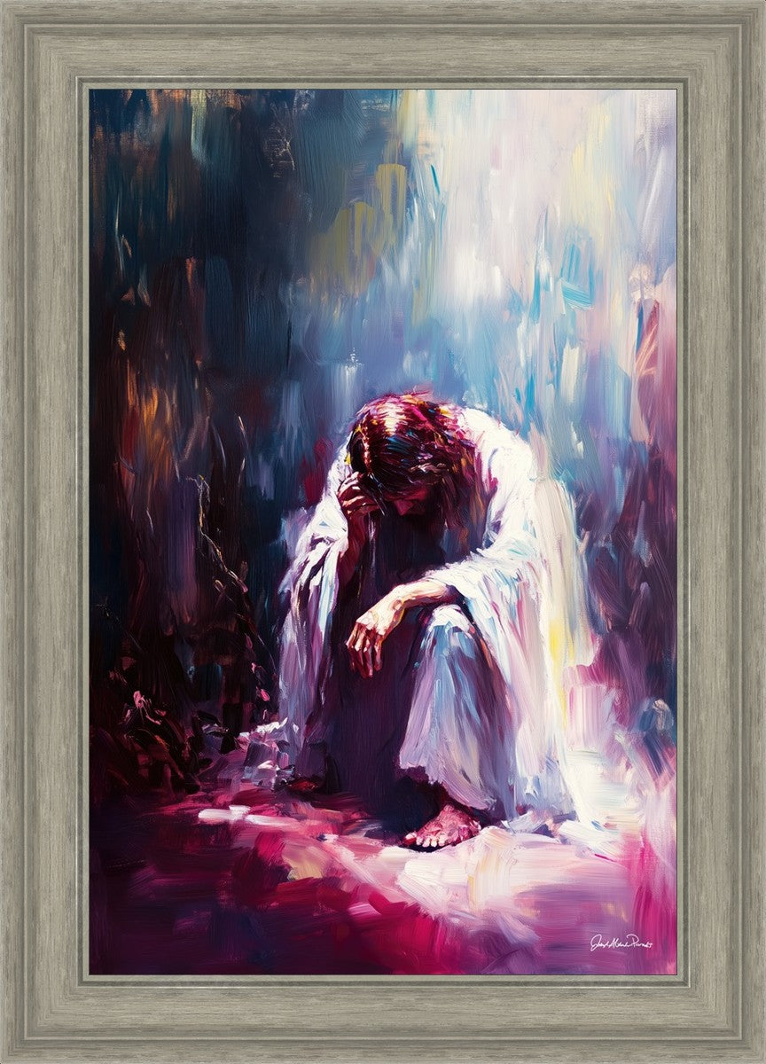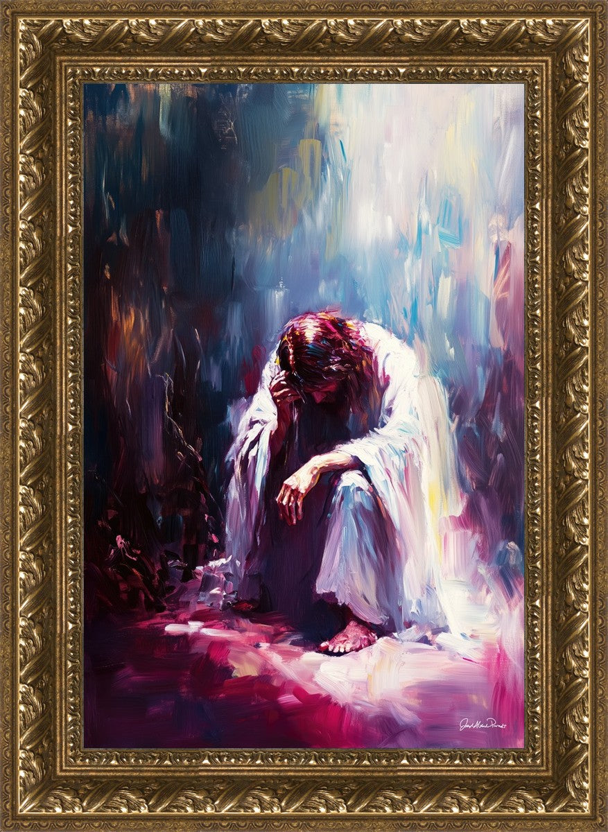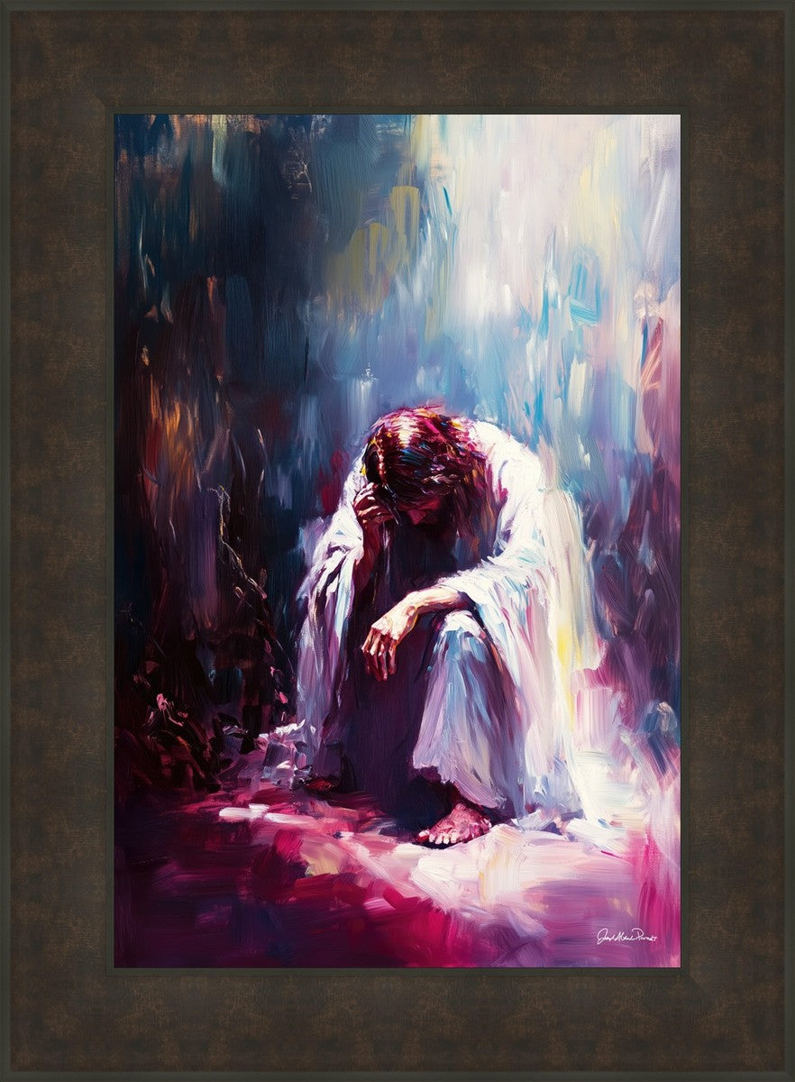 This artwork is a very intimate and poignant moment depicting the Lord resting between His miracle of performing the Atonement in the Garden of Gethsemane, having drunk from that bitter cup. It is a heartfelt reminder of what the Lord did for each of us, and is meant to invoke gratitude for His ultimate act of charity.