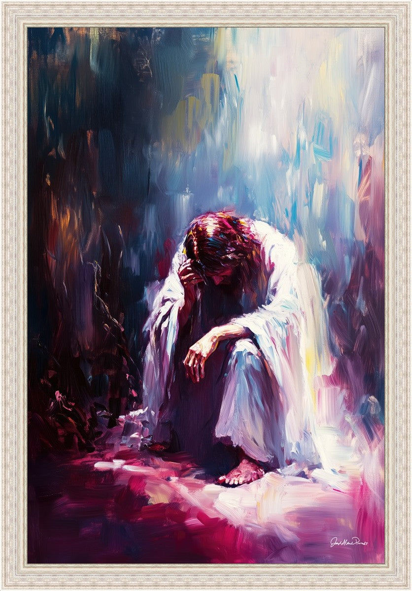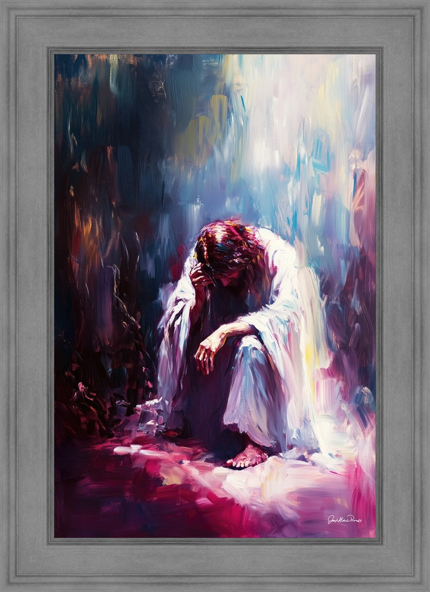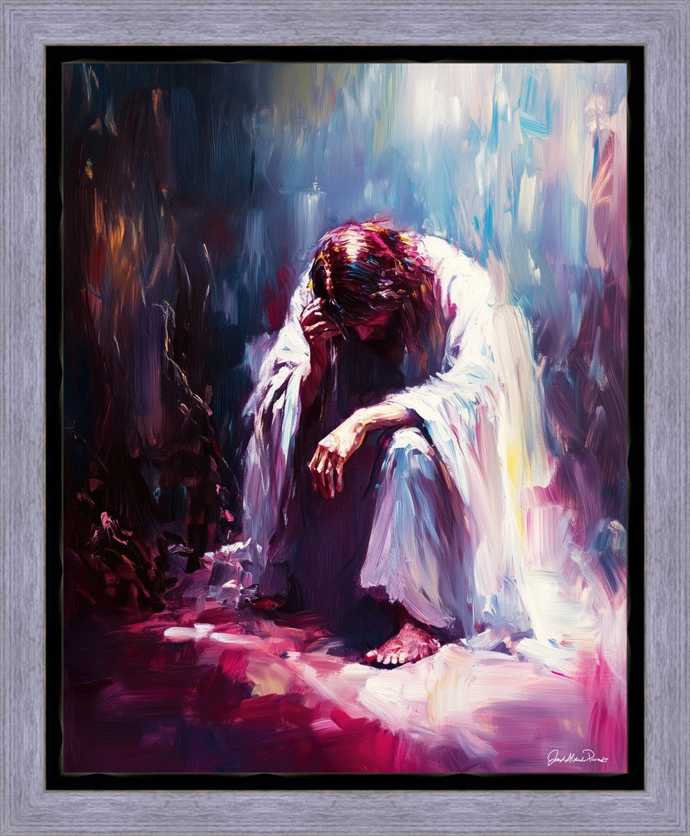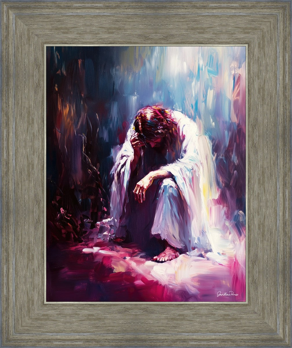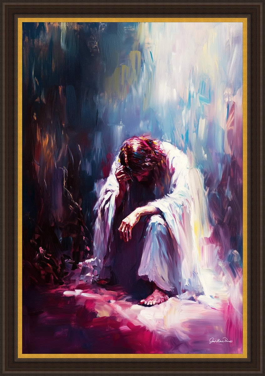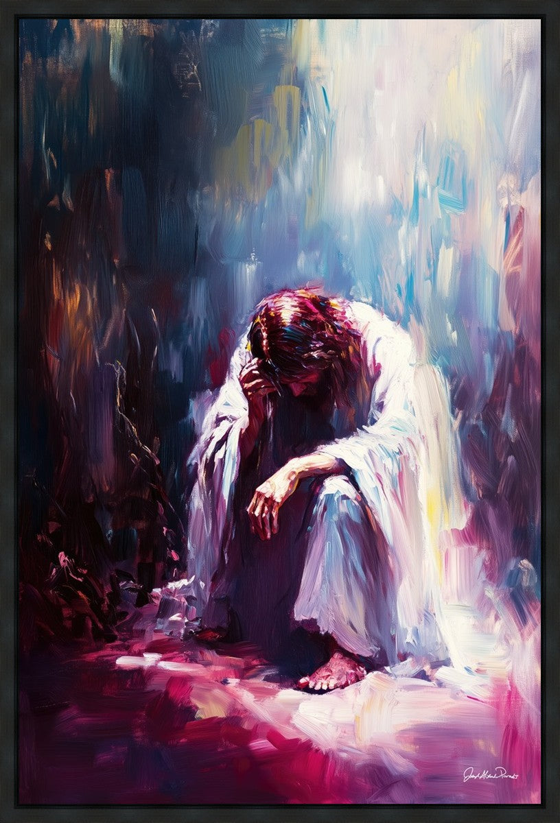 This artwork is a very intimate and poignant moment depicting the Lord resting between His miracle of performing the Atonement in the Garden of Gethsemane, having drunk from that bitter cup. It is a heartfelt reminder of what the Lord did for each of us, and is meant to invoke gratitude for His ultimate act of charity.