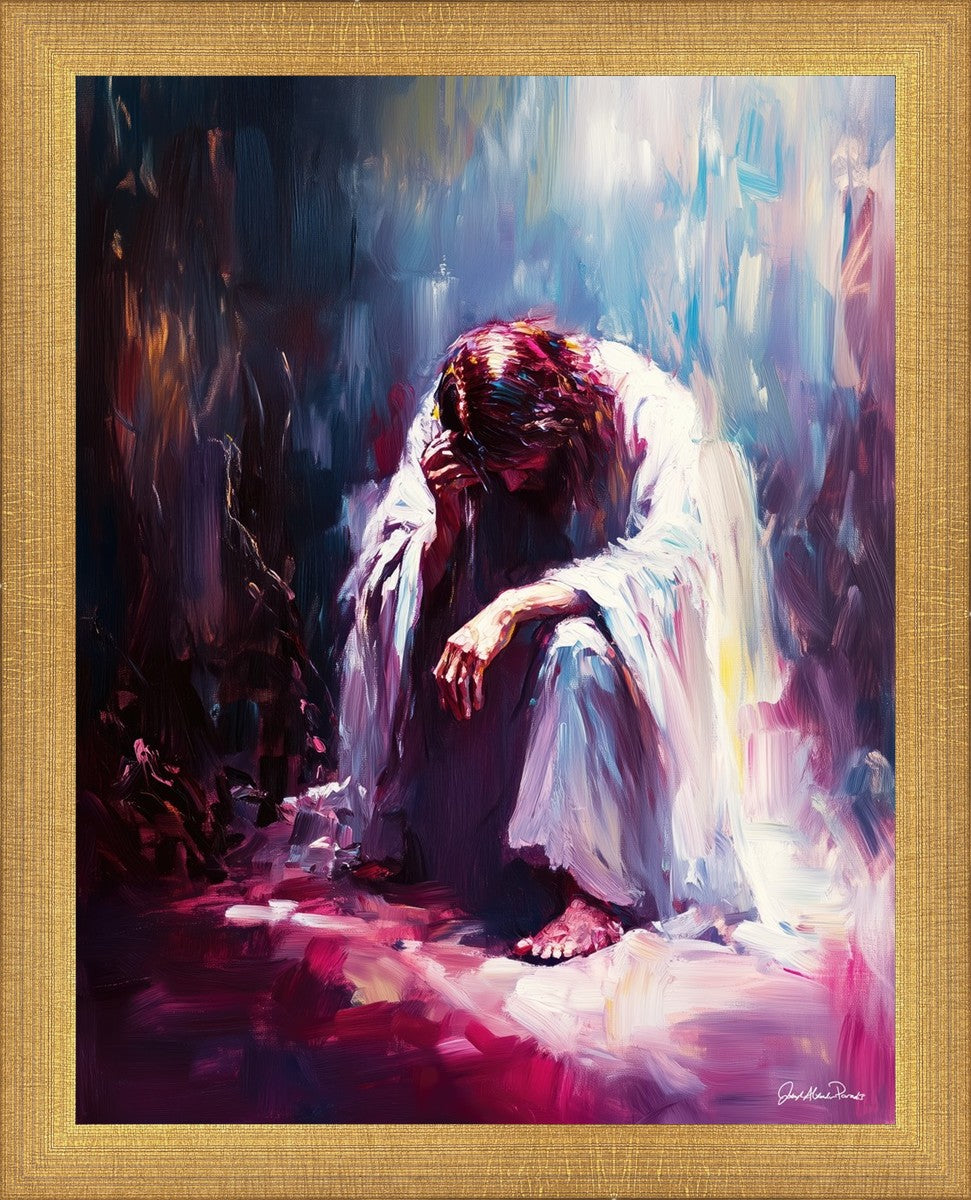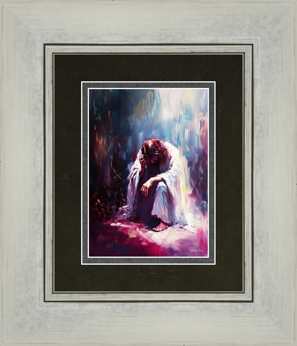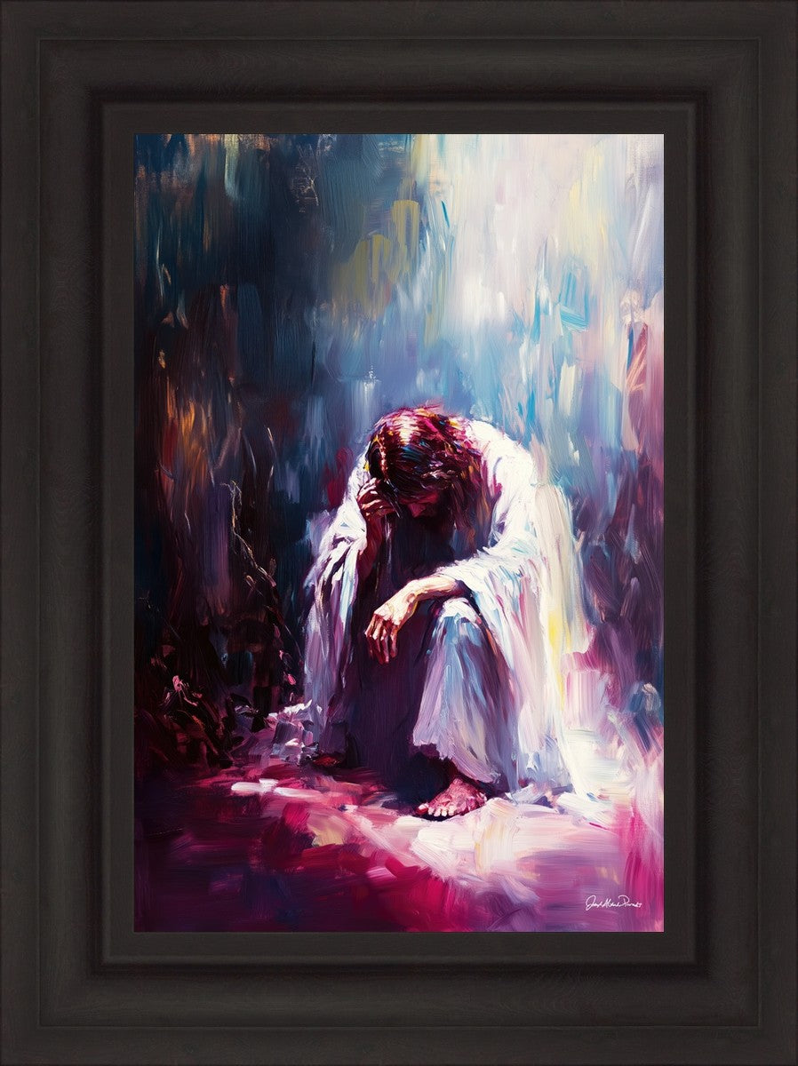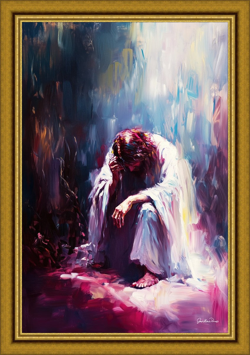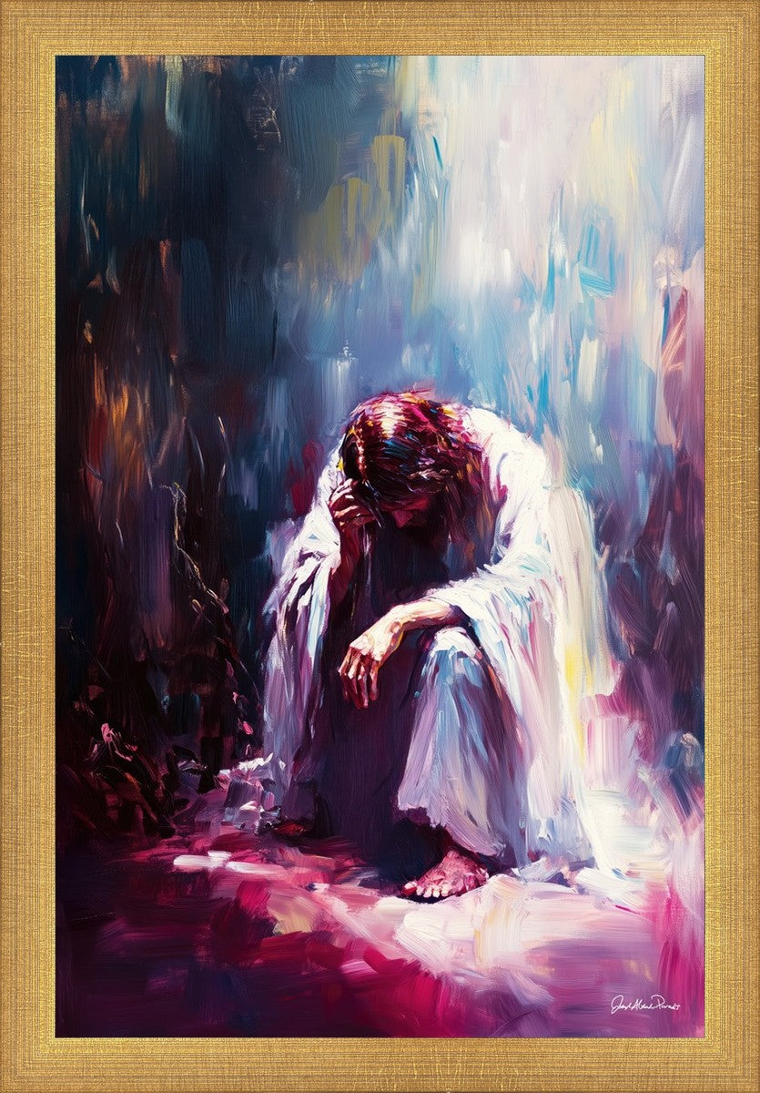 This artwork is a very intimate and poignant moment depicting the Lord resting between His miracle of performing the Atonement in the Garden of Gethsemane, having drunk from that bitter cup. It is a heartfelt reminder of what the Lord did for each of us, and is meant to invoke gratitude for His ultimate act of charity.