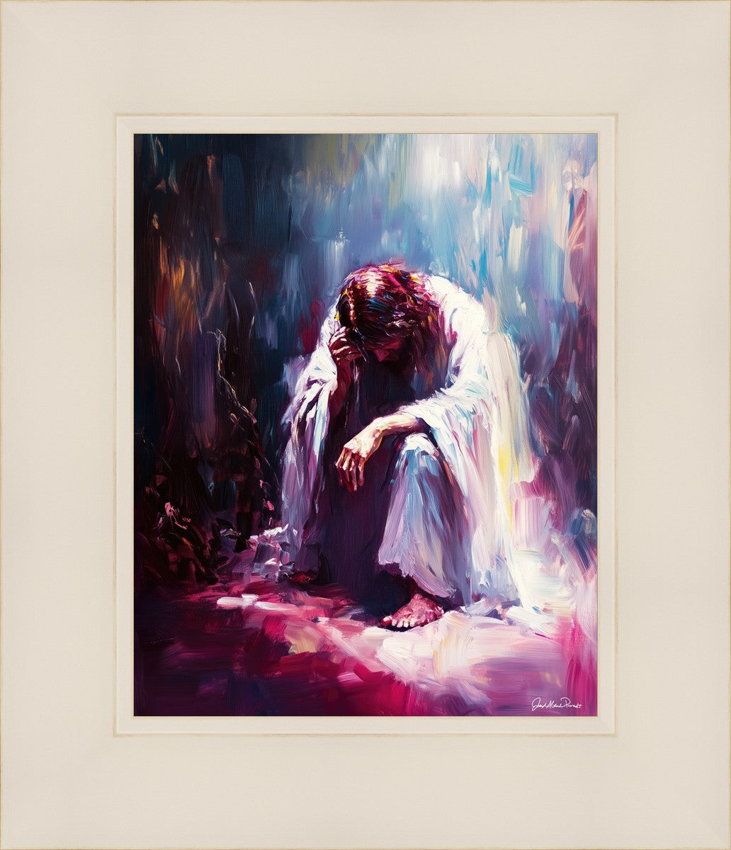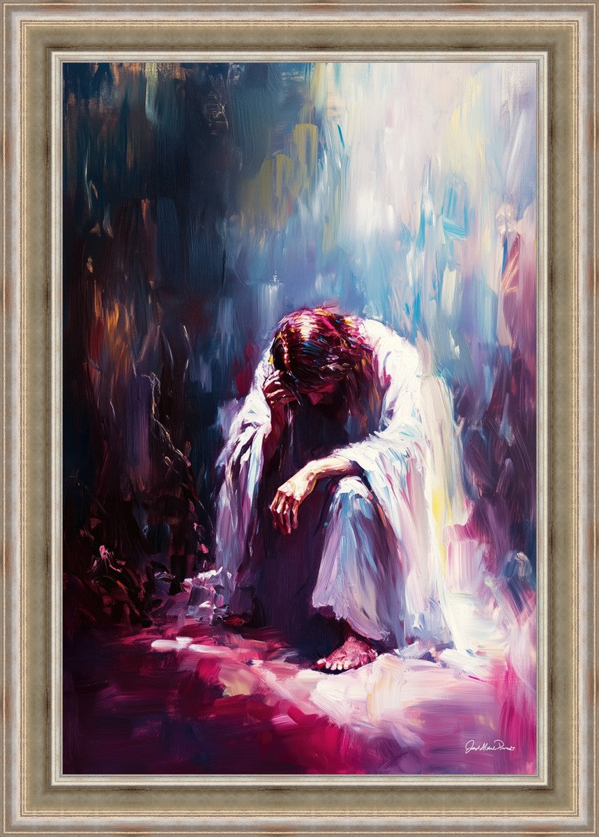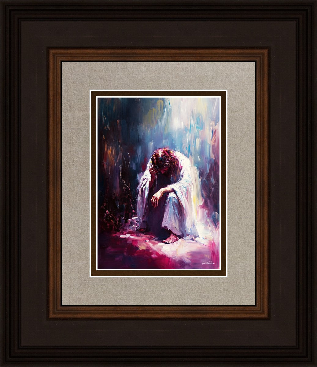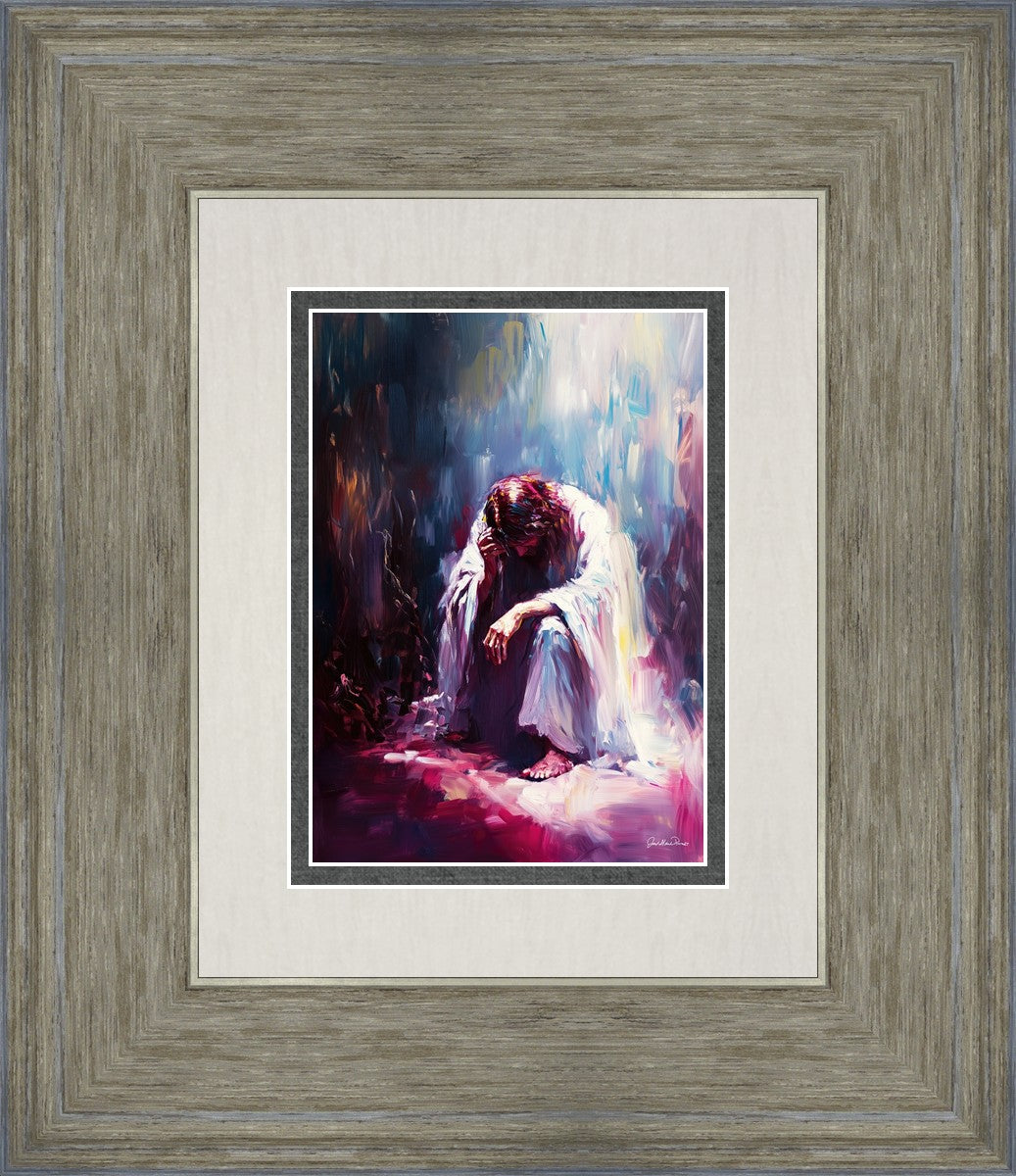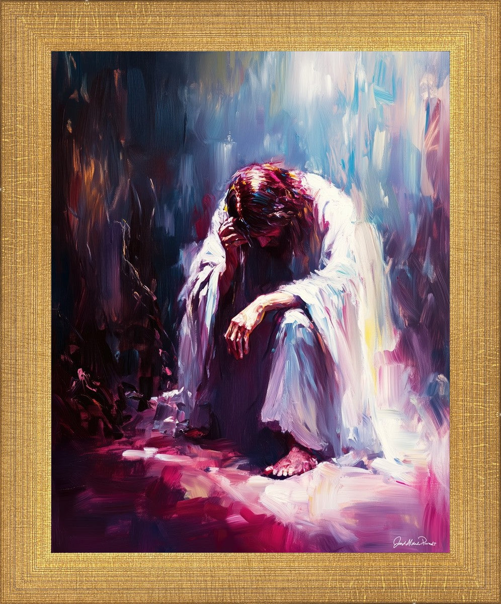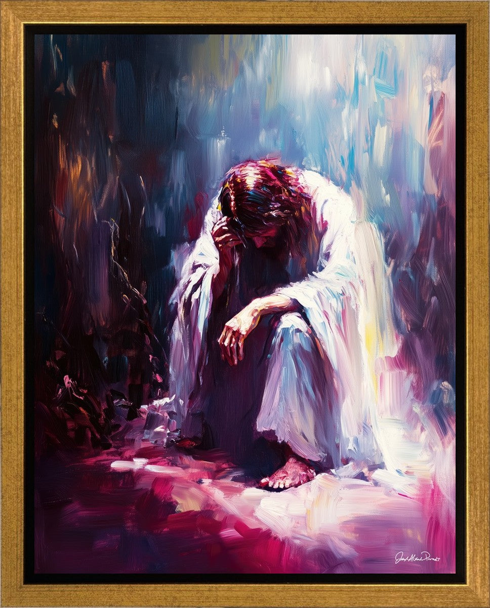This artwork is a very intimate and poignant moment depicting the Lord resting between His miracle of performing the Atonement in the Garden of Gethsemane, having drunk from that bitter cup. It is a heartfelt reminder of what the Lord did for each of us, and is meant to invoke gratitude for His ultimate act of charity.