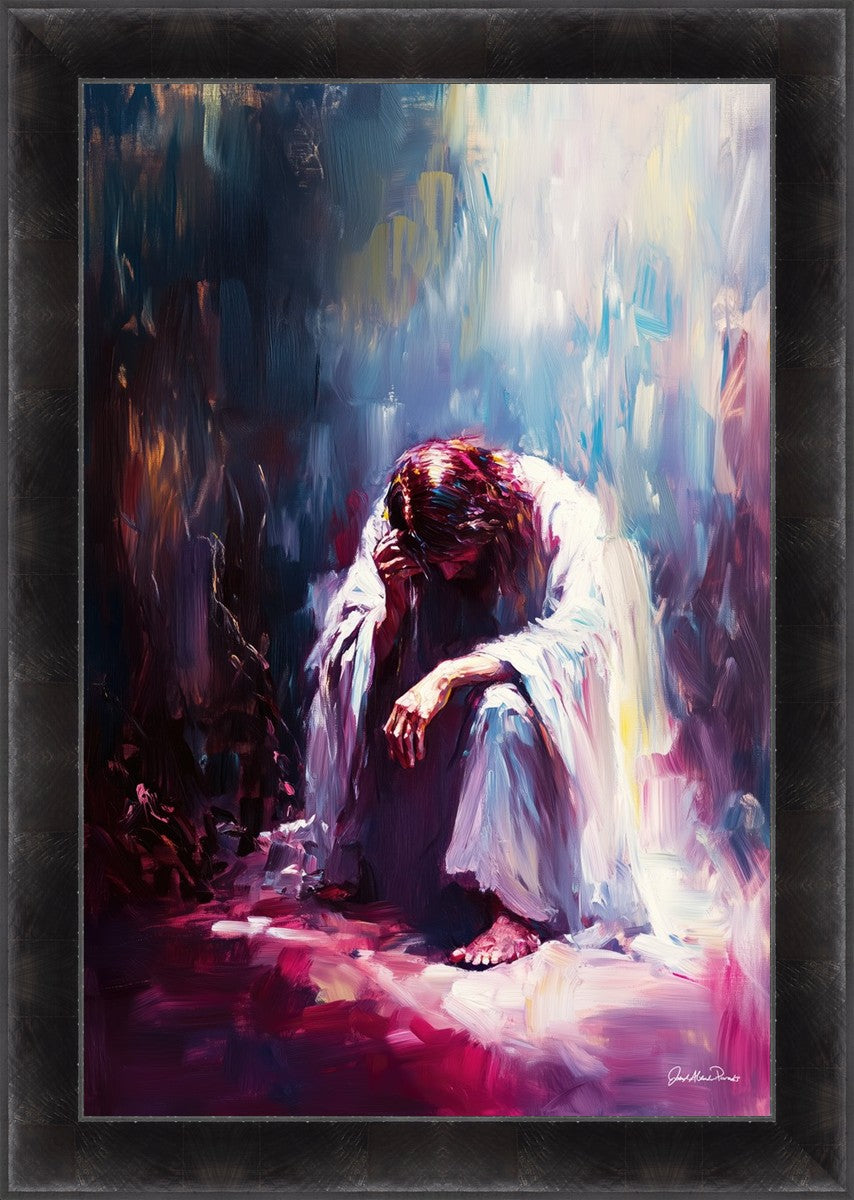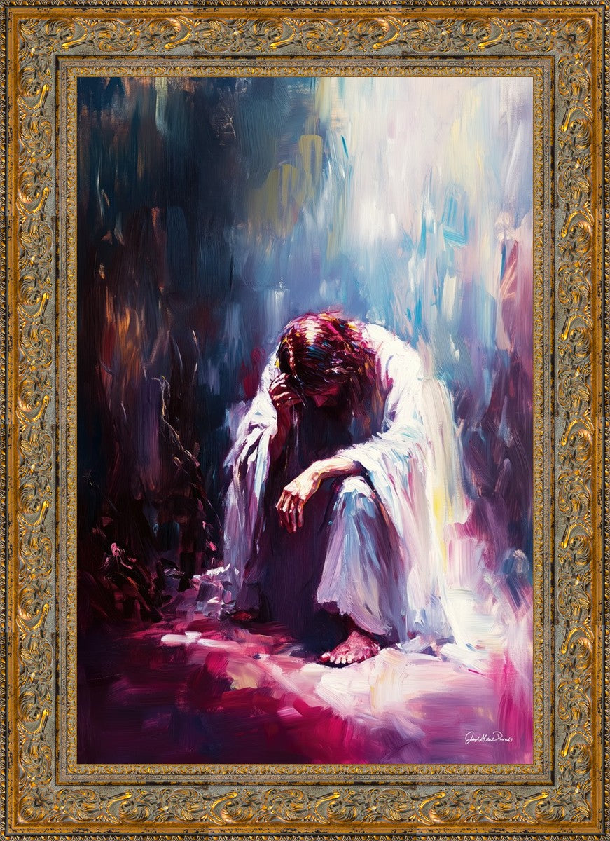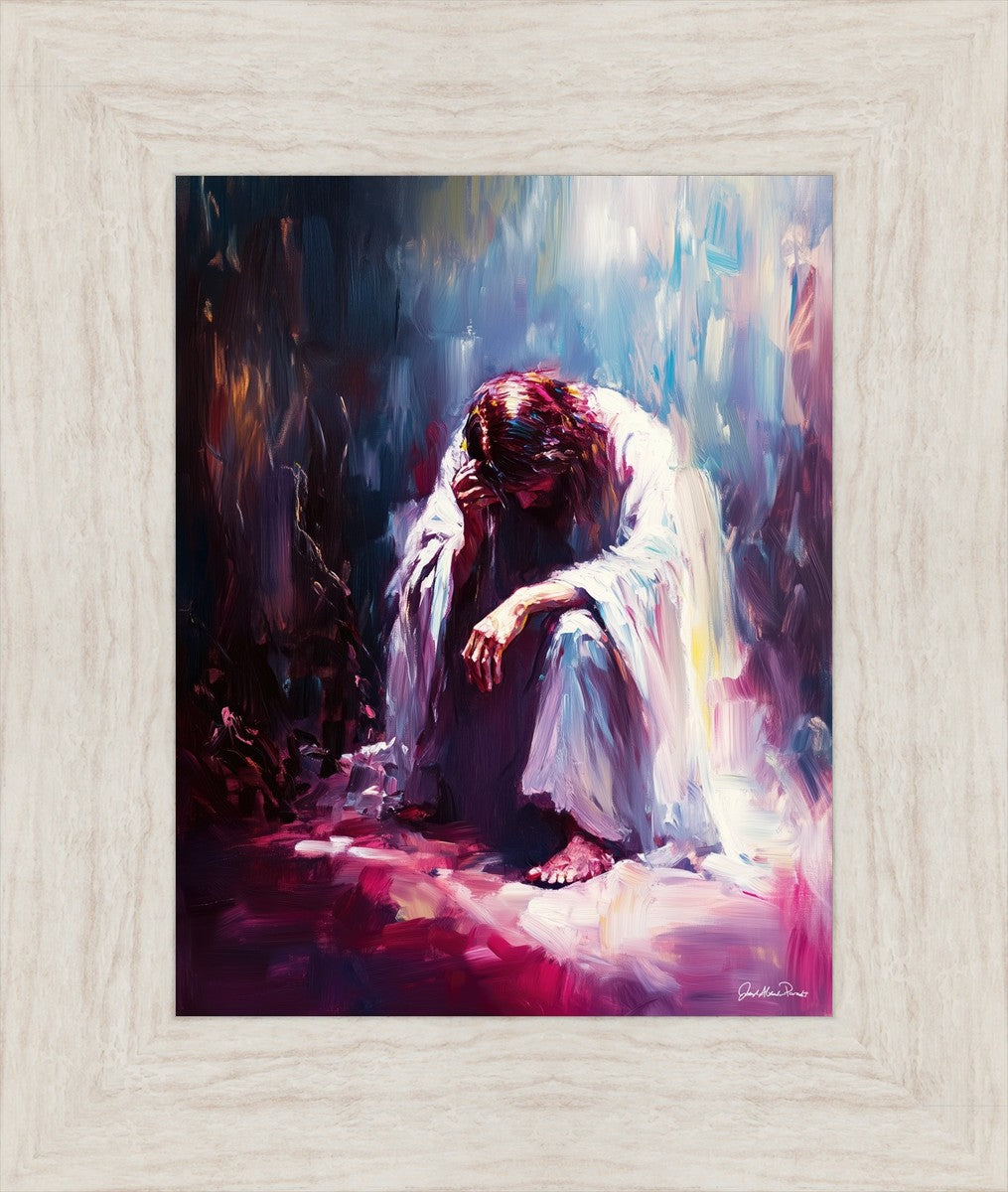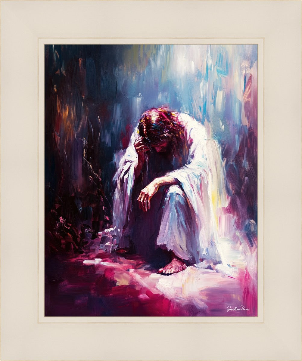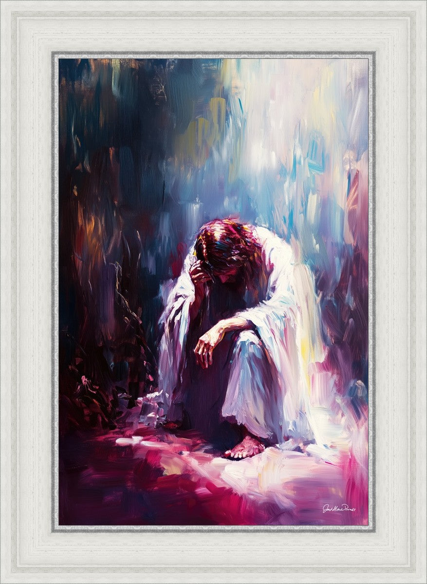 This artwork is a very intimate and poignant moment depicting the Lord resting between His miracle of performing the Atonement in the Garden of Gethsemane, having drunk from that bitter cup. It is a heartfelt reminder of what the Lord did for each of us, and is meant to invoke gratitude for His ultimate act of charity.