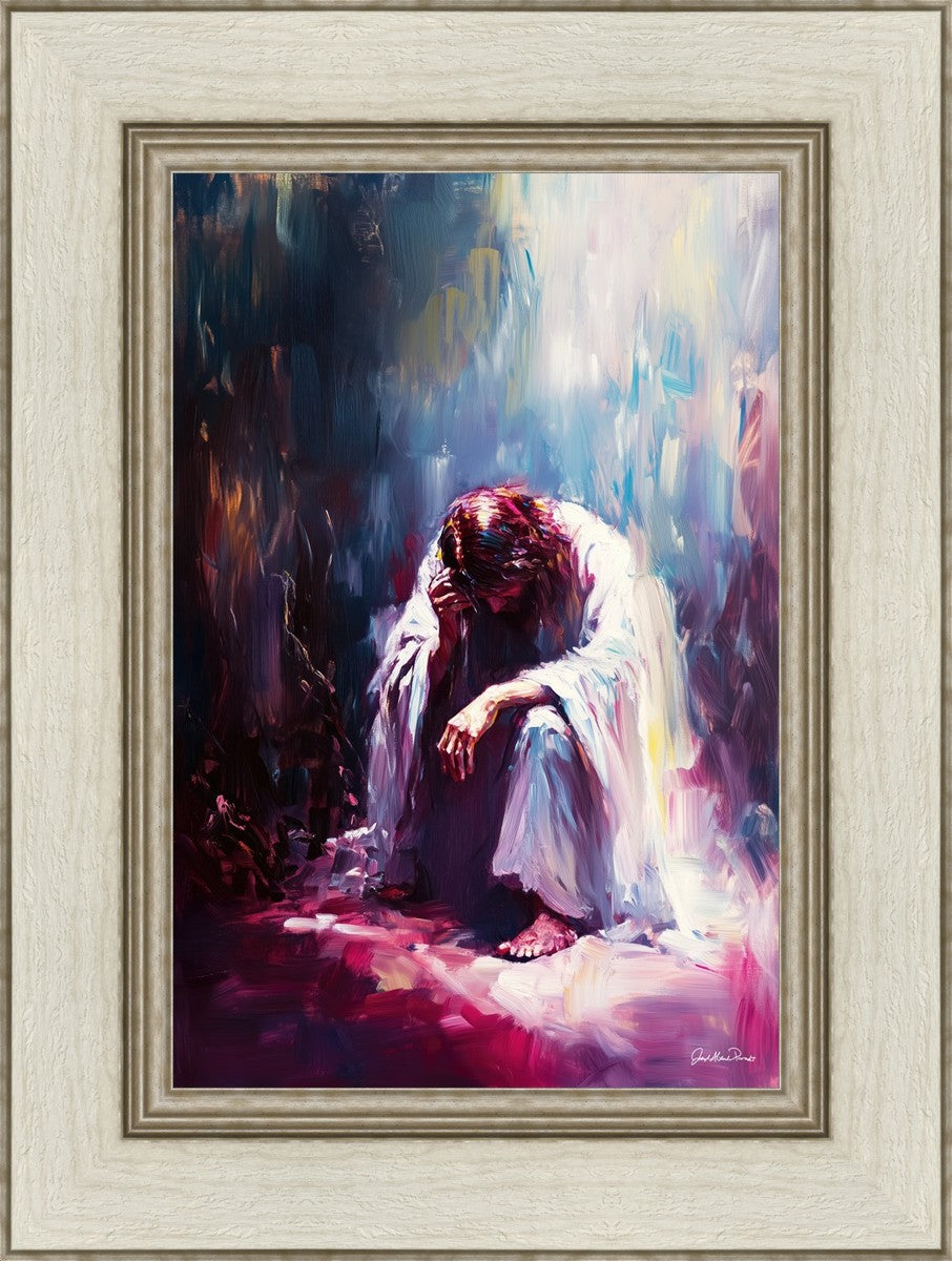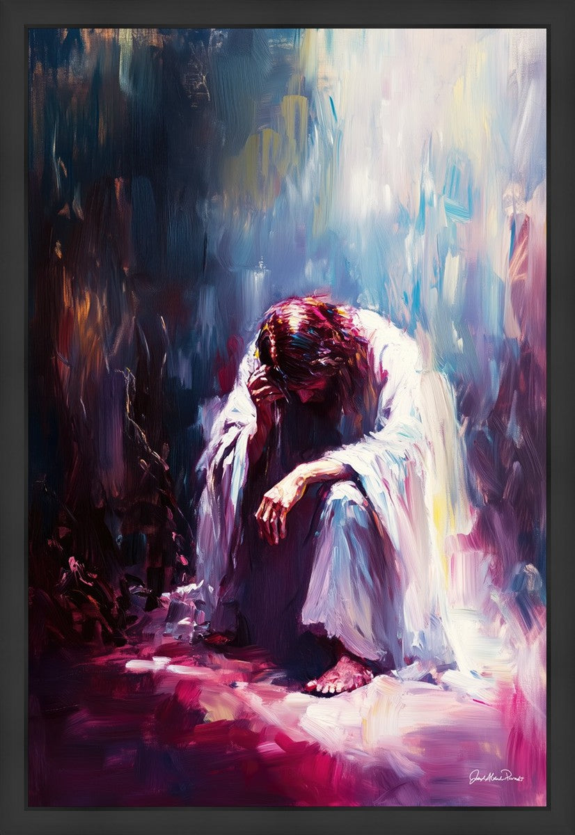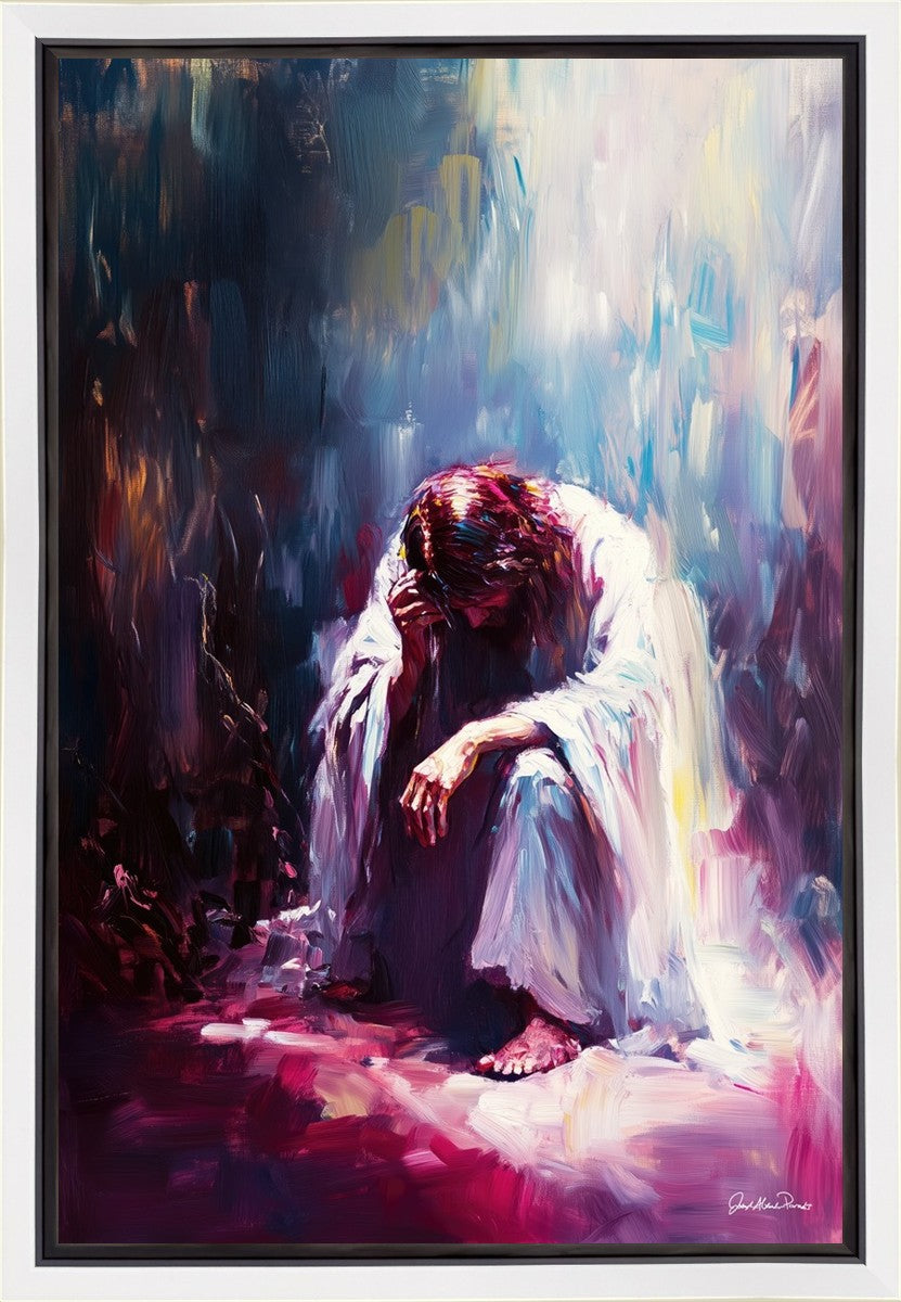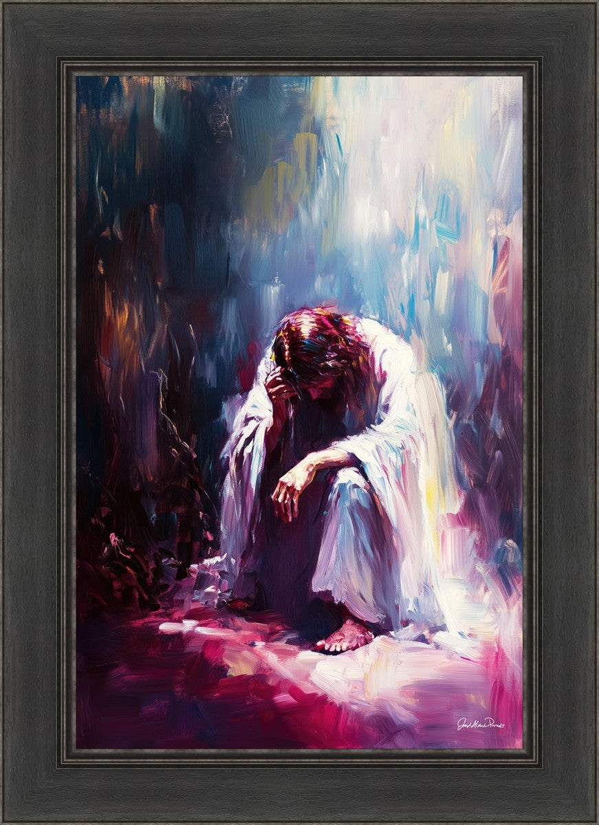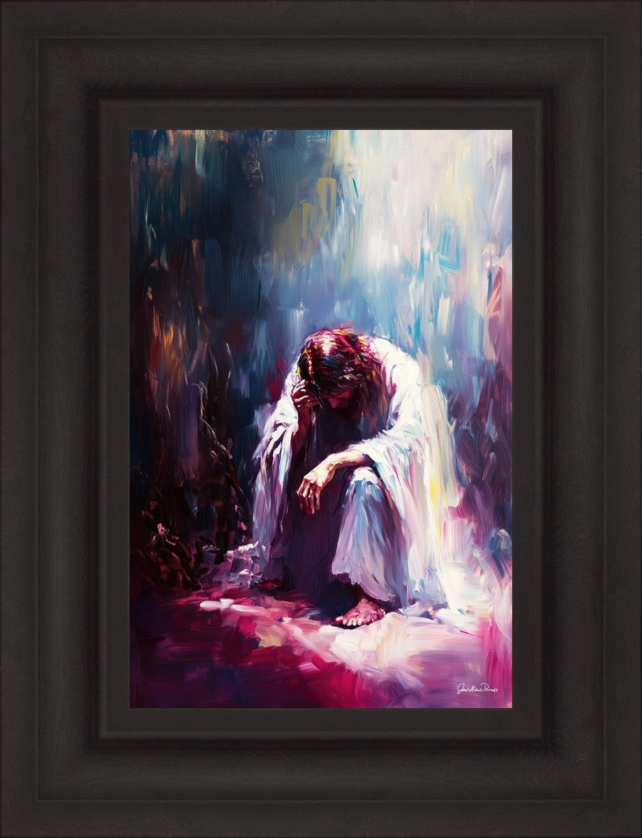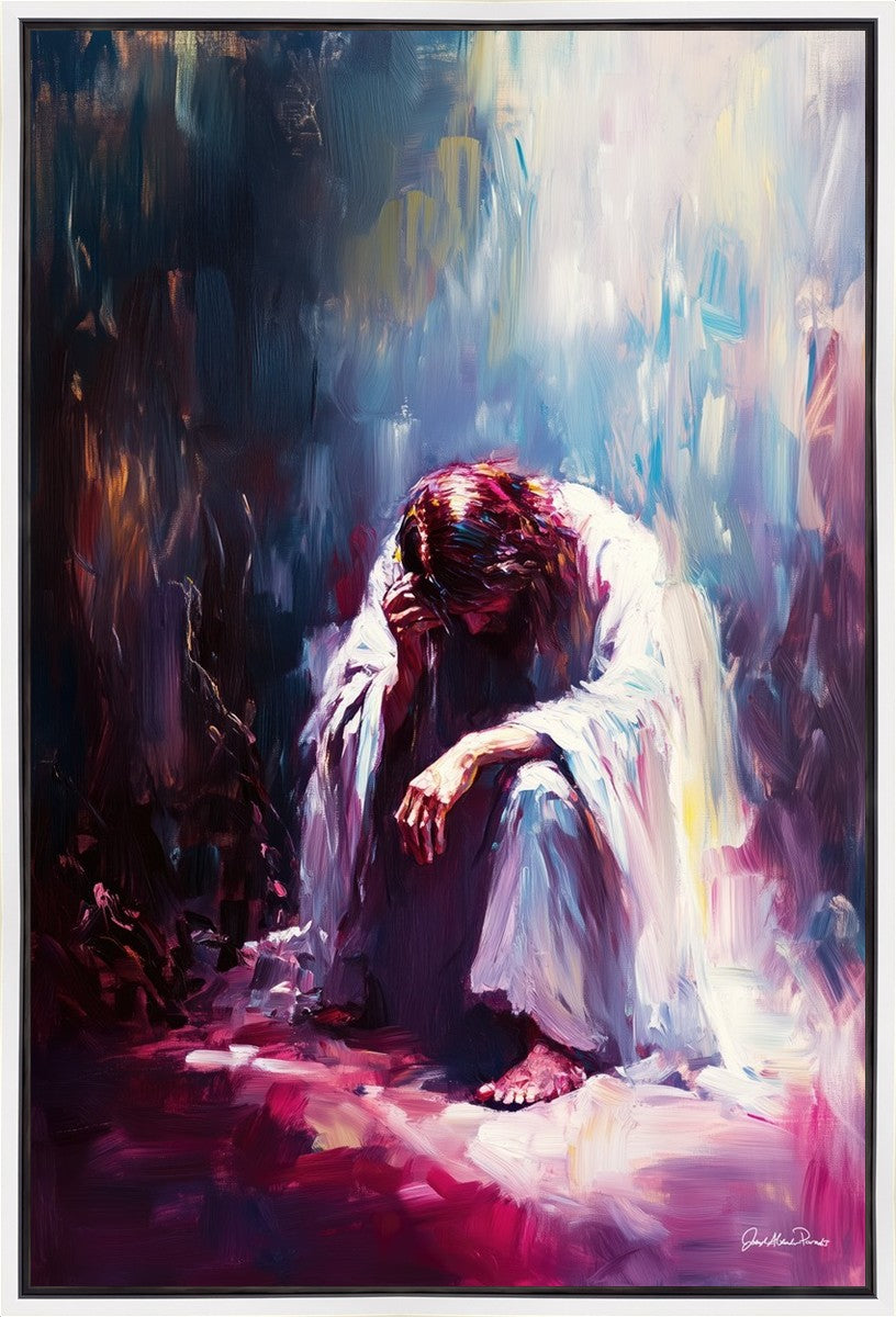 This artwork is a very intimate and poignant moment depicting the Lord resting between His miracle of performing the Atonement in the Garden of Gethsemane, having drunk from that bitter cup. It is a heartfelt reminder of what the Lord did for each of us, and is meant to invoke gratitude for His ultimate act of charity.