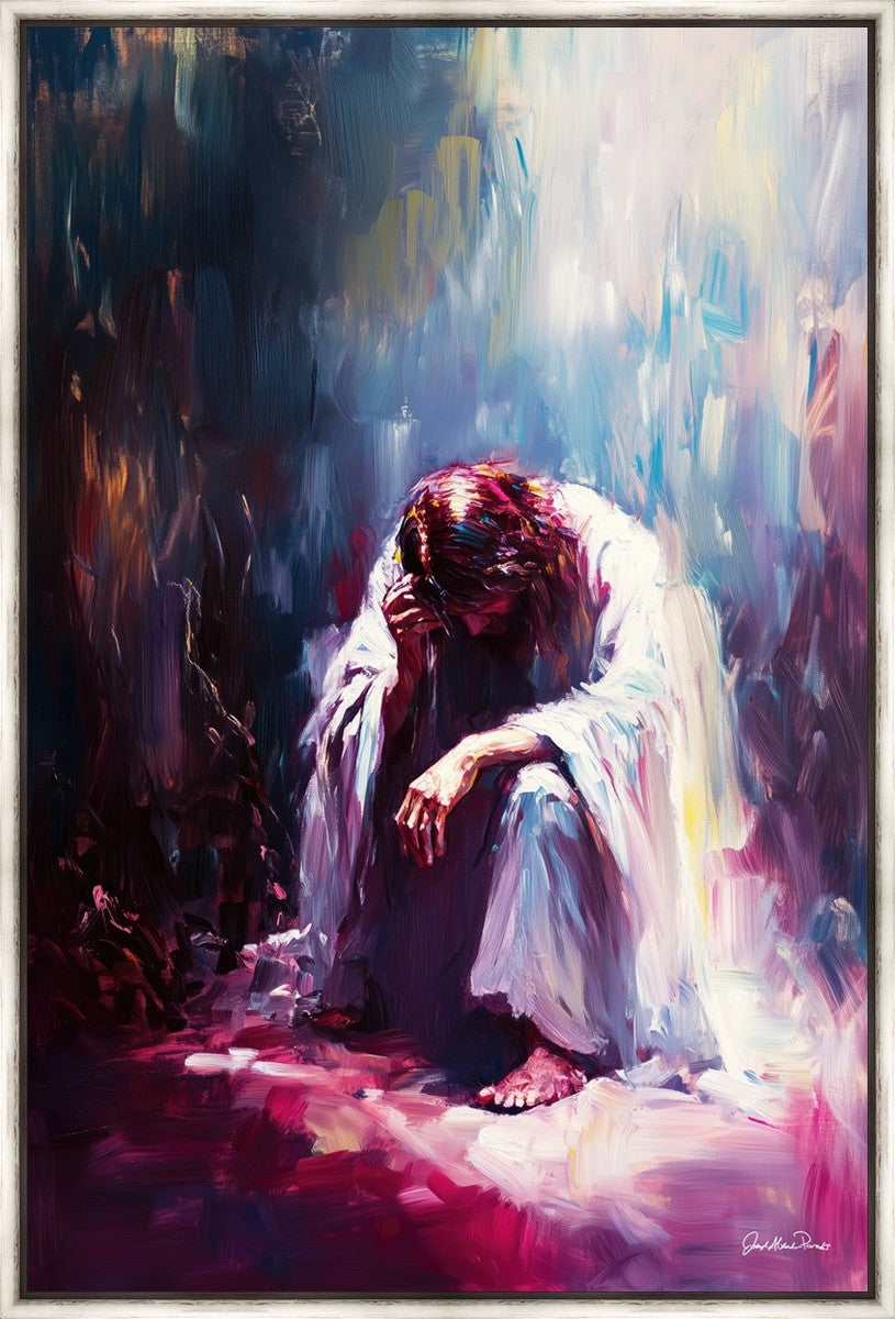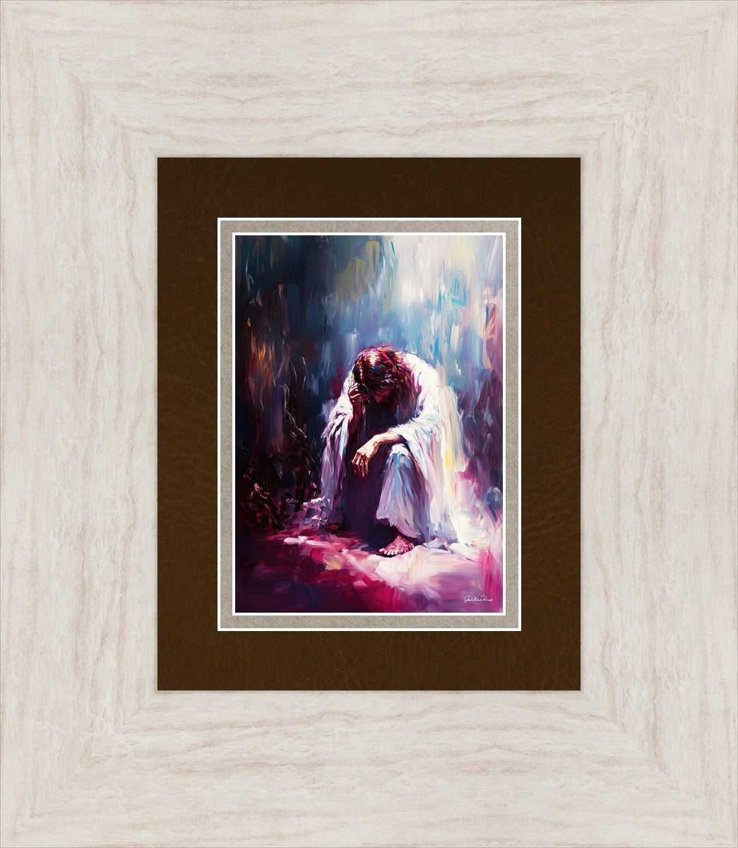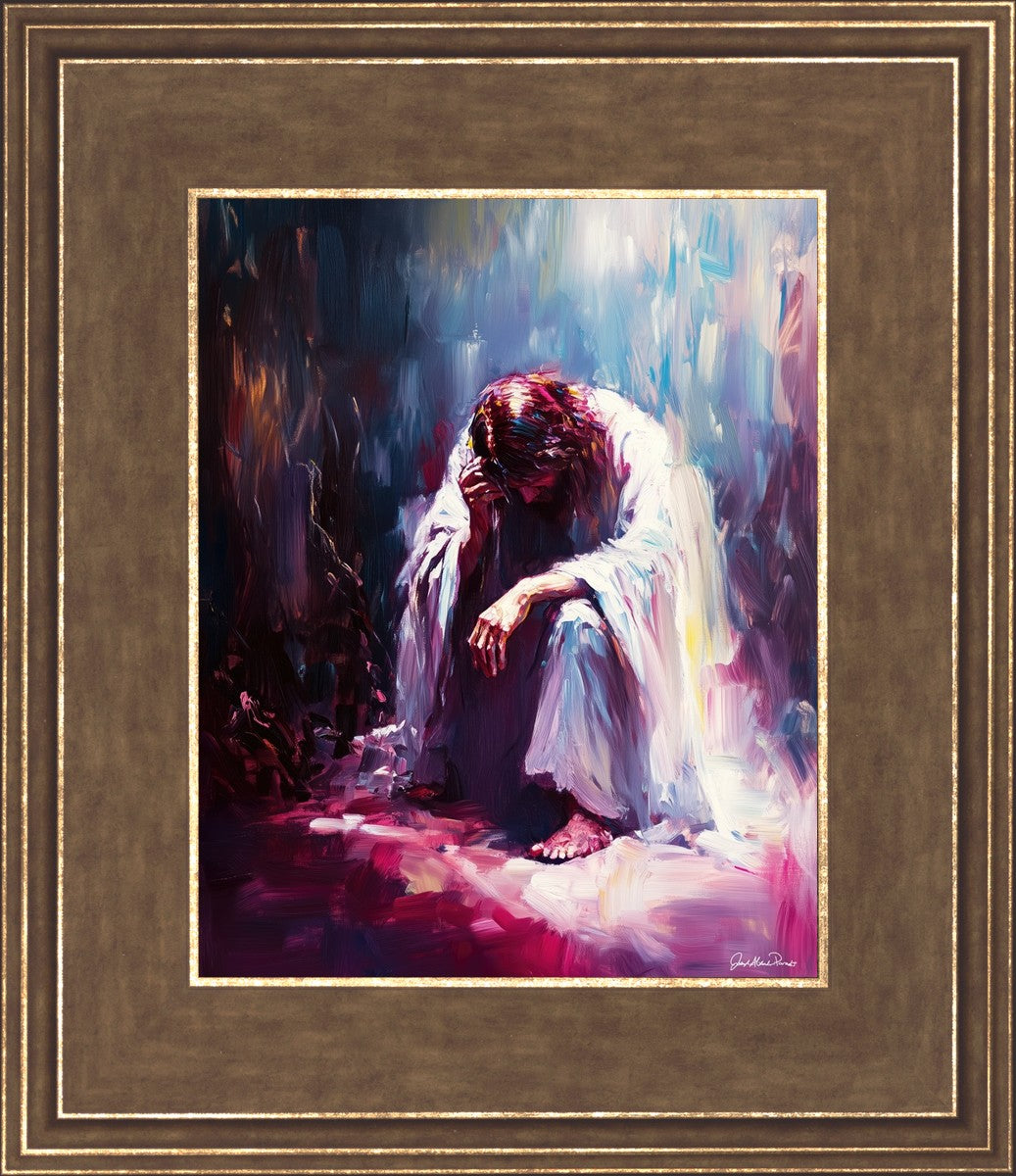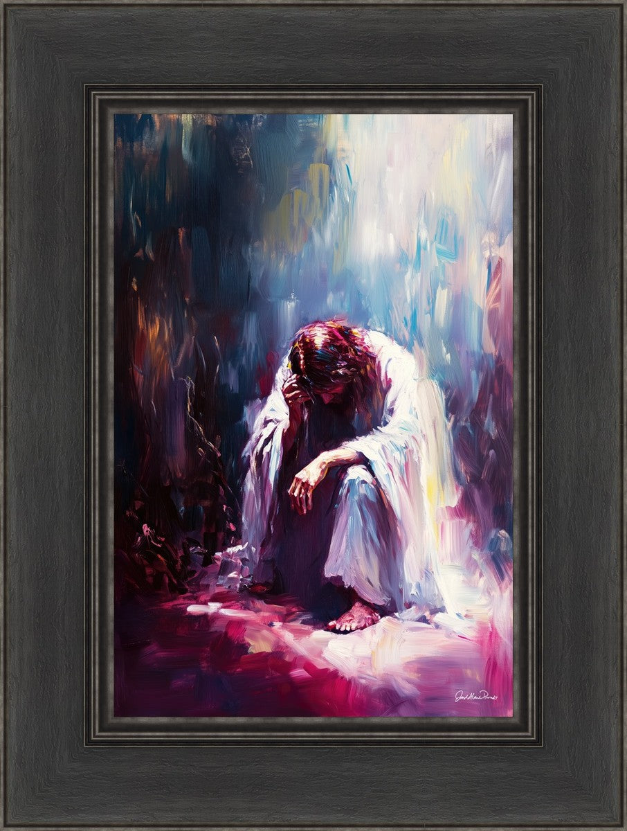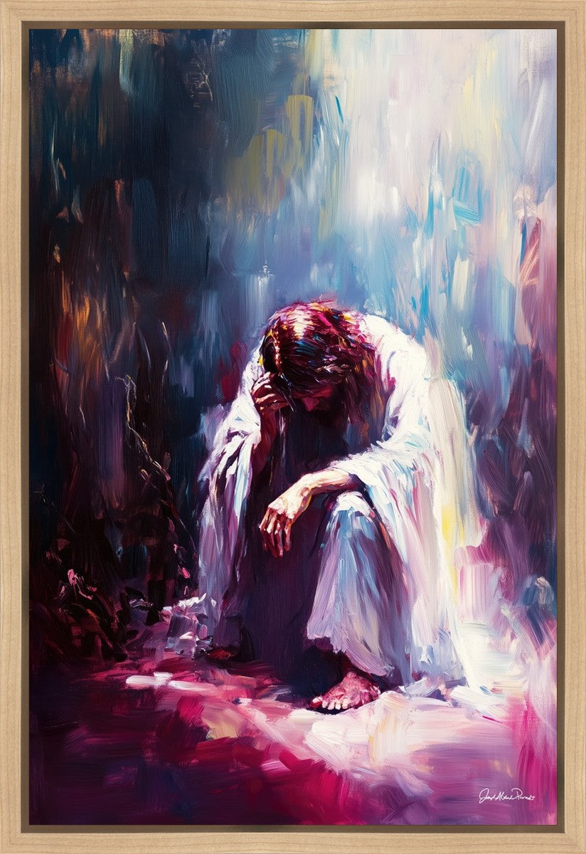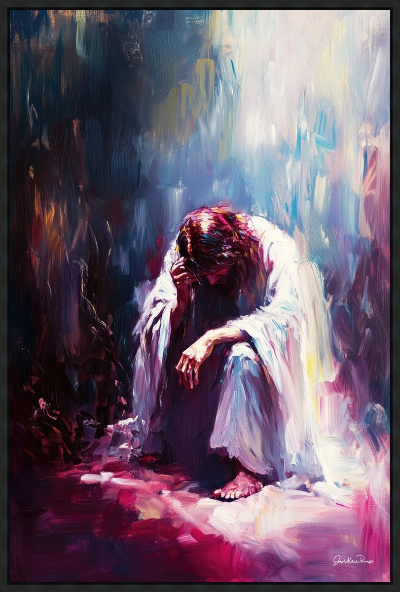 This artwork is a very intimate and poignant moment depicting the Lord resting between His miracle of performing the Atonement in the Garden of Gethsemane, having drunk from that bitter cup. It is a heartfelt reminder of what the Lord did for each of us, and is meant to invoke gratitude for His ultimate act of charity.