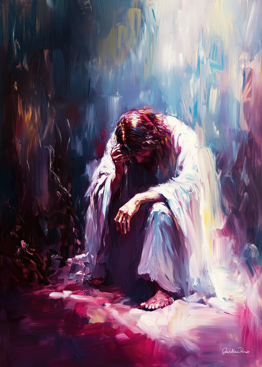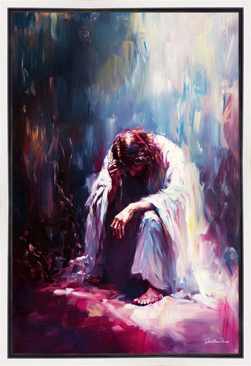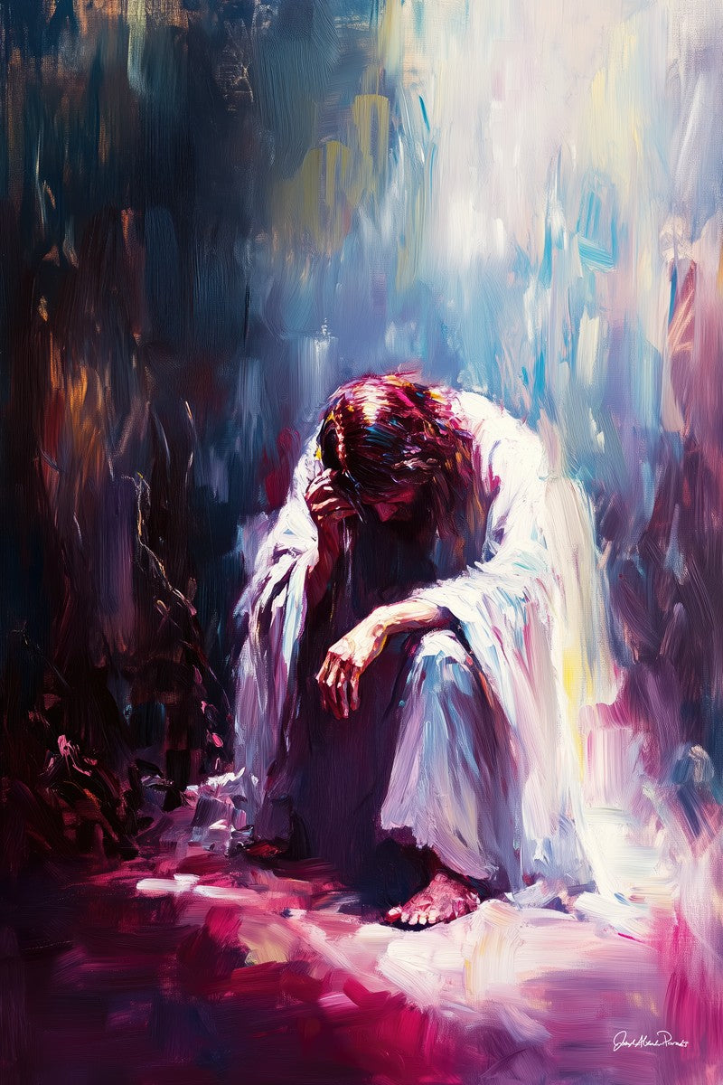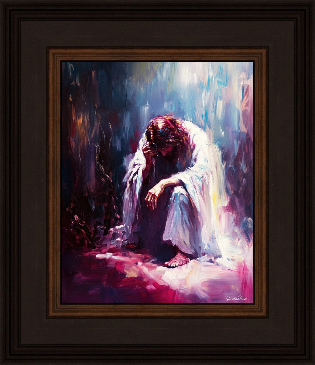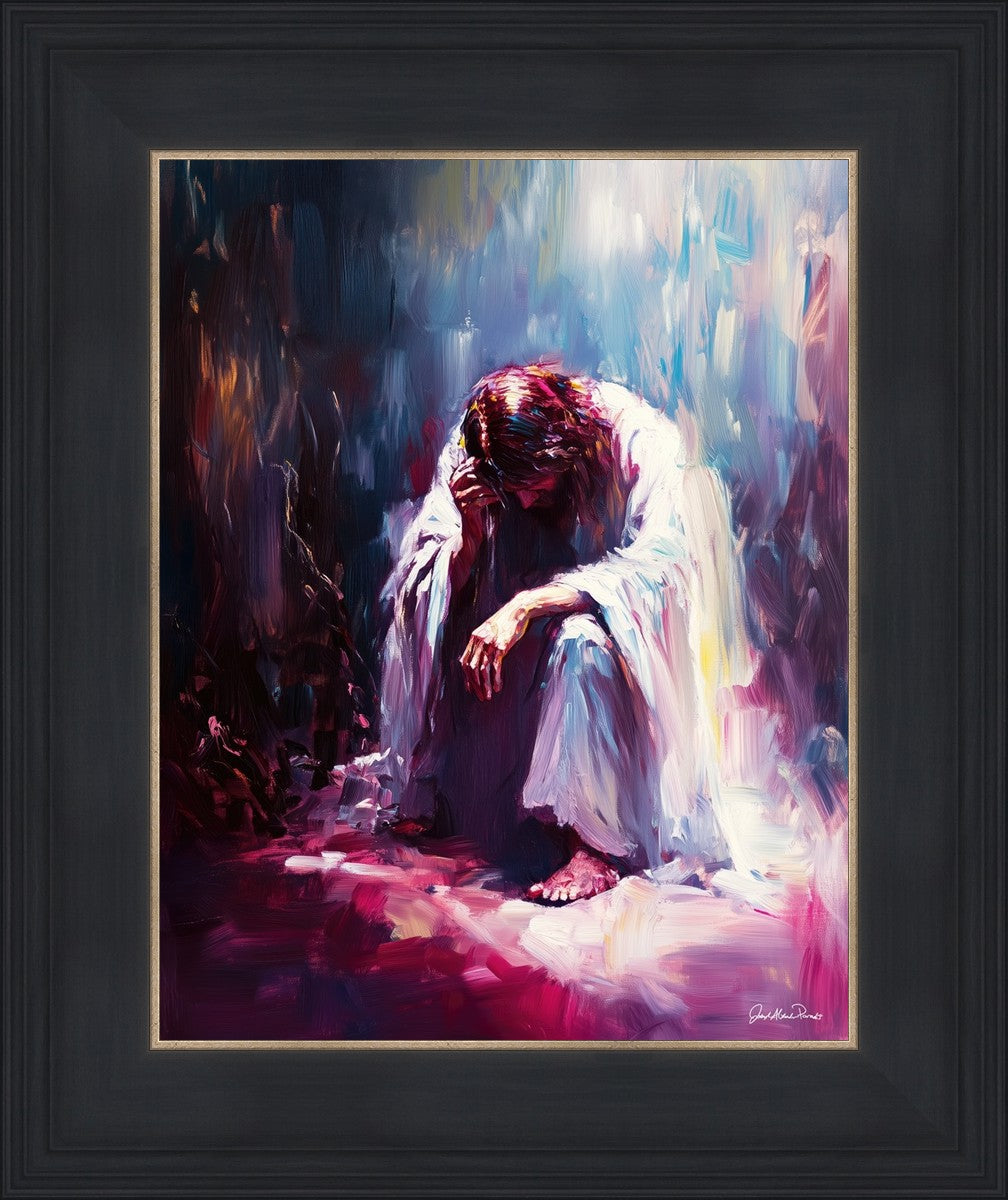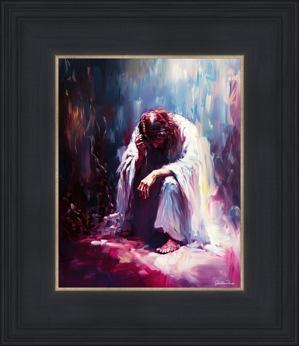 This artwork is a very intimate and poignant moment depicting the Lord resting between His miracle of performing the Atonement in the Garden of Gethsemane, having drunk from that bitter cup. It is a heartfelt reminder of what the Lord did for each of us, and is meant to invoke gratitude for His ultimate act of charity.
