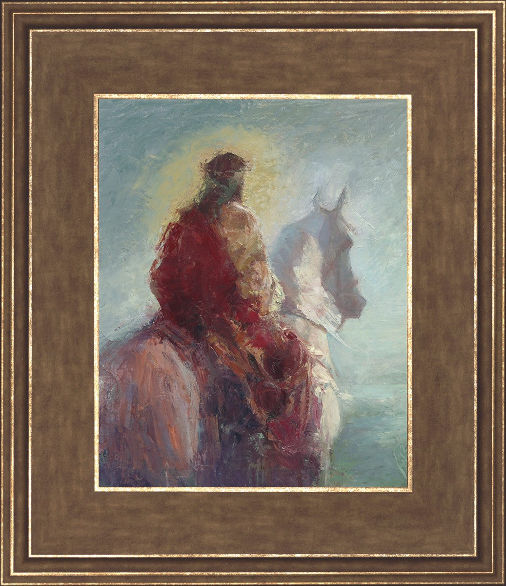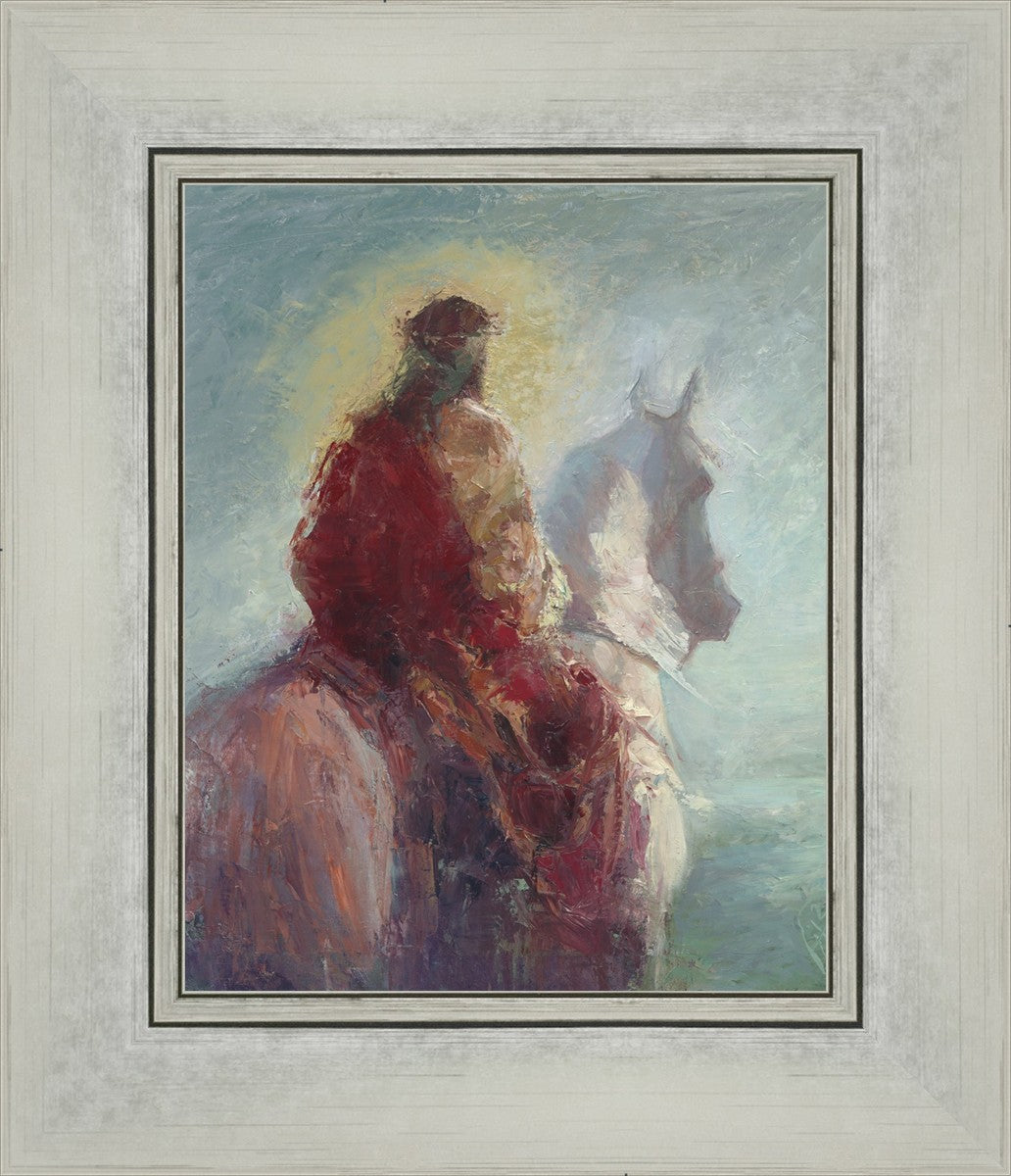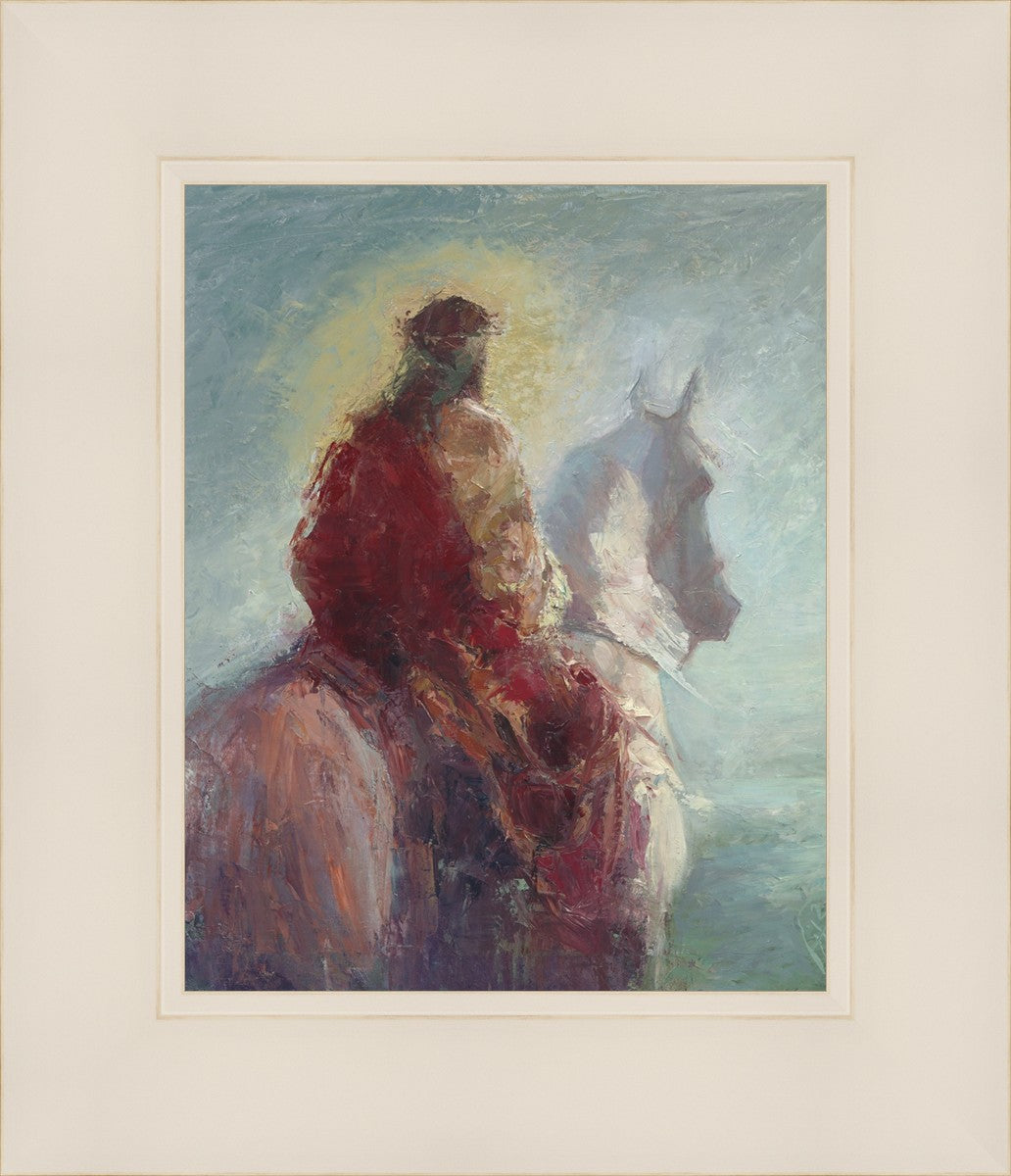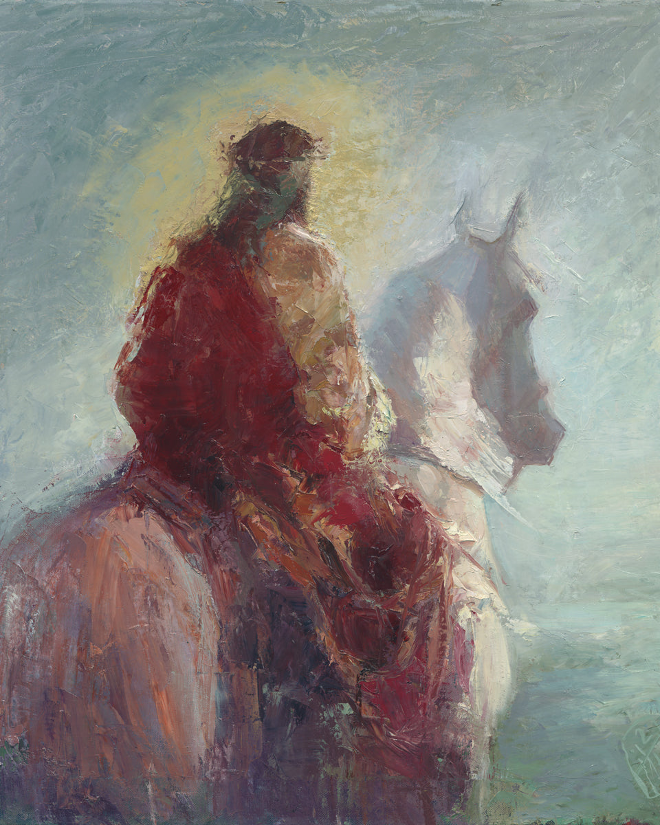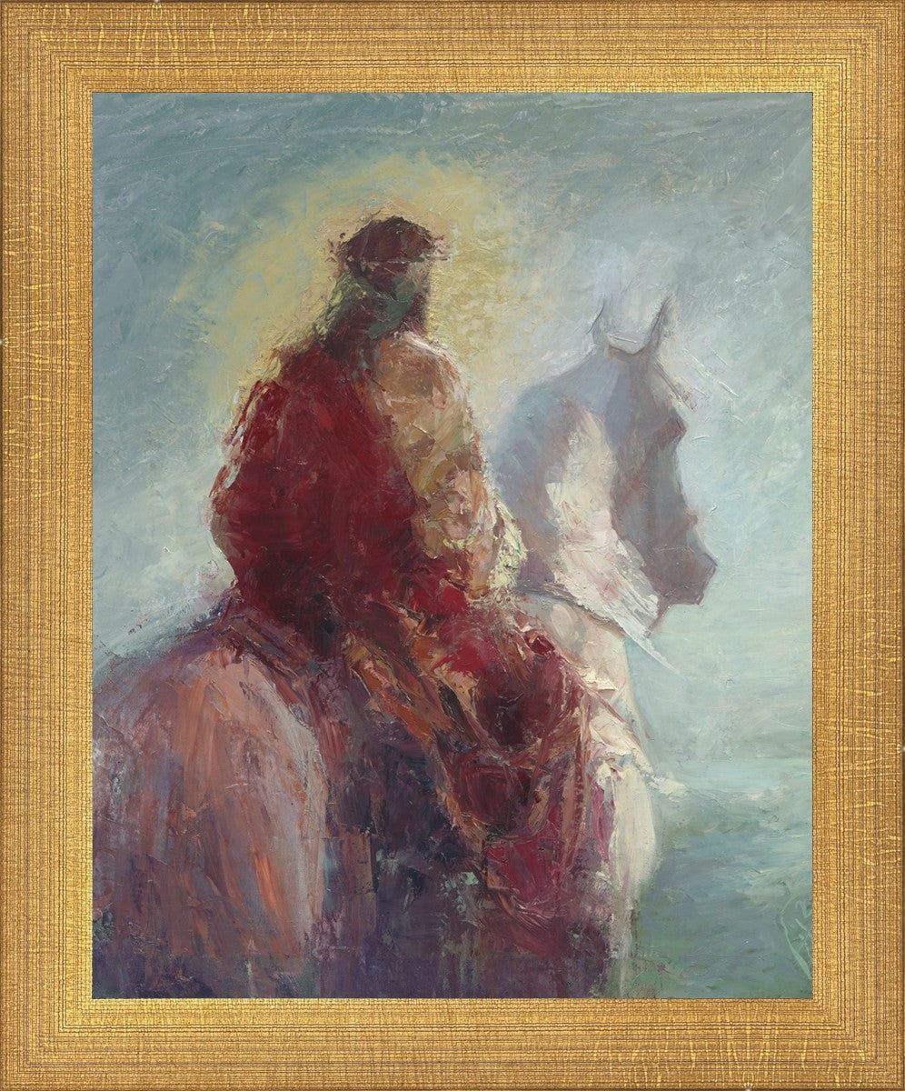 Based upon my dream, where I saw the Messiah riding a white horse. I have never seen His face, only saw Him from the back. I would never dare to paint His portrait, since it's very personal for everyone. In this painting He is painted during His Second Coming as a King who is leading the Heavenly hosts. As my friend mentioned, to be behind Messiah's back is the best location one can find himself during His Second Coming.