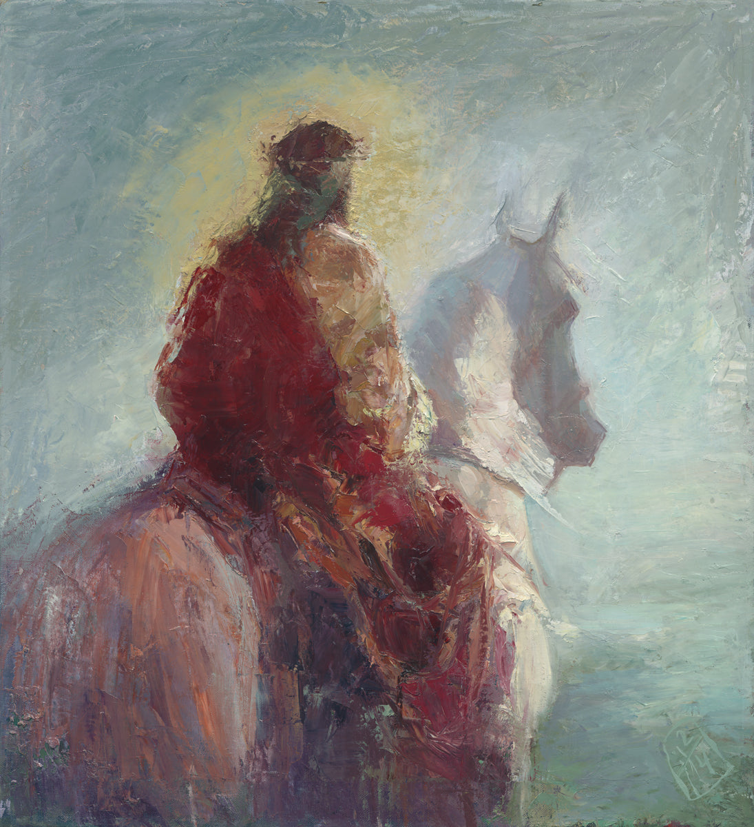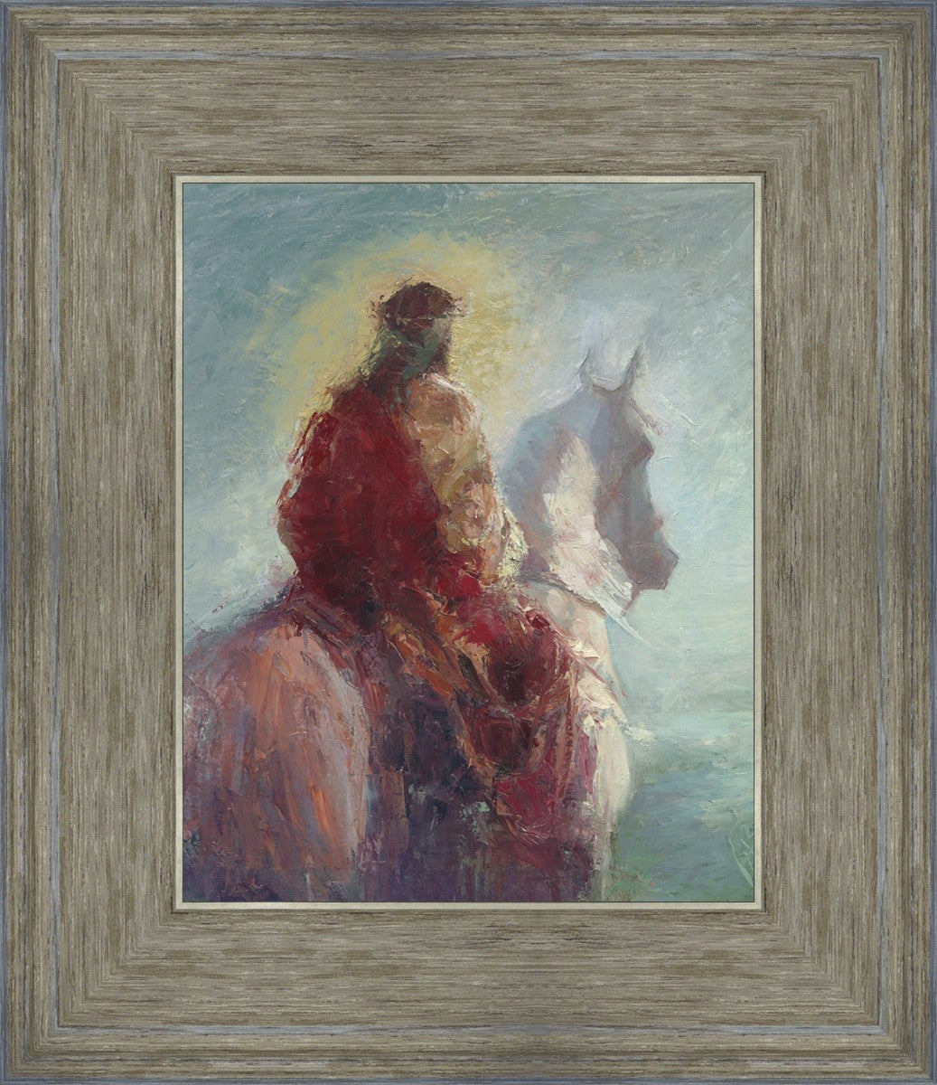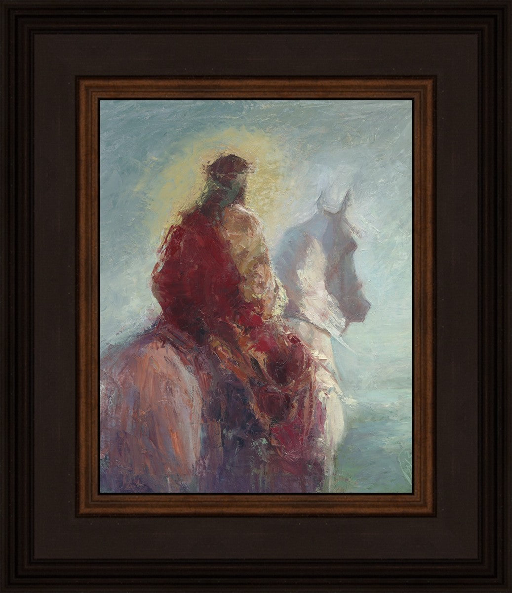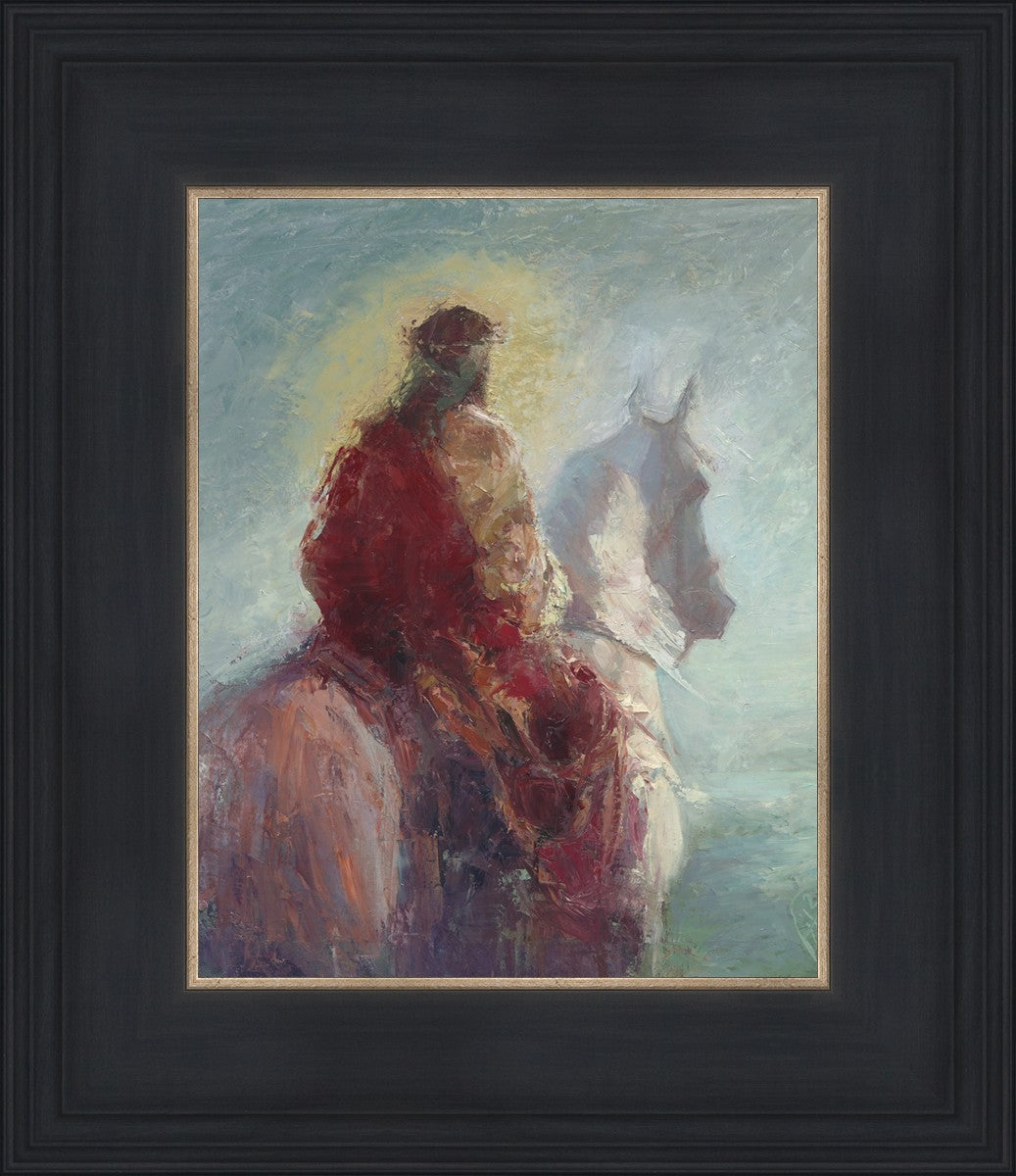Based upon my dream, where I saw the Messiah riding a white horse. I have never seen His face, only saw Him from the back. I would never dare to paint His portrait, since it's very personal for everyone. In this painting He is painted during His Second Coming as a King who is leading the Heavenly hosts. As my friend mentioned, to be behind Messiah's back is the best location one can find himself during His Second Coming.