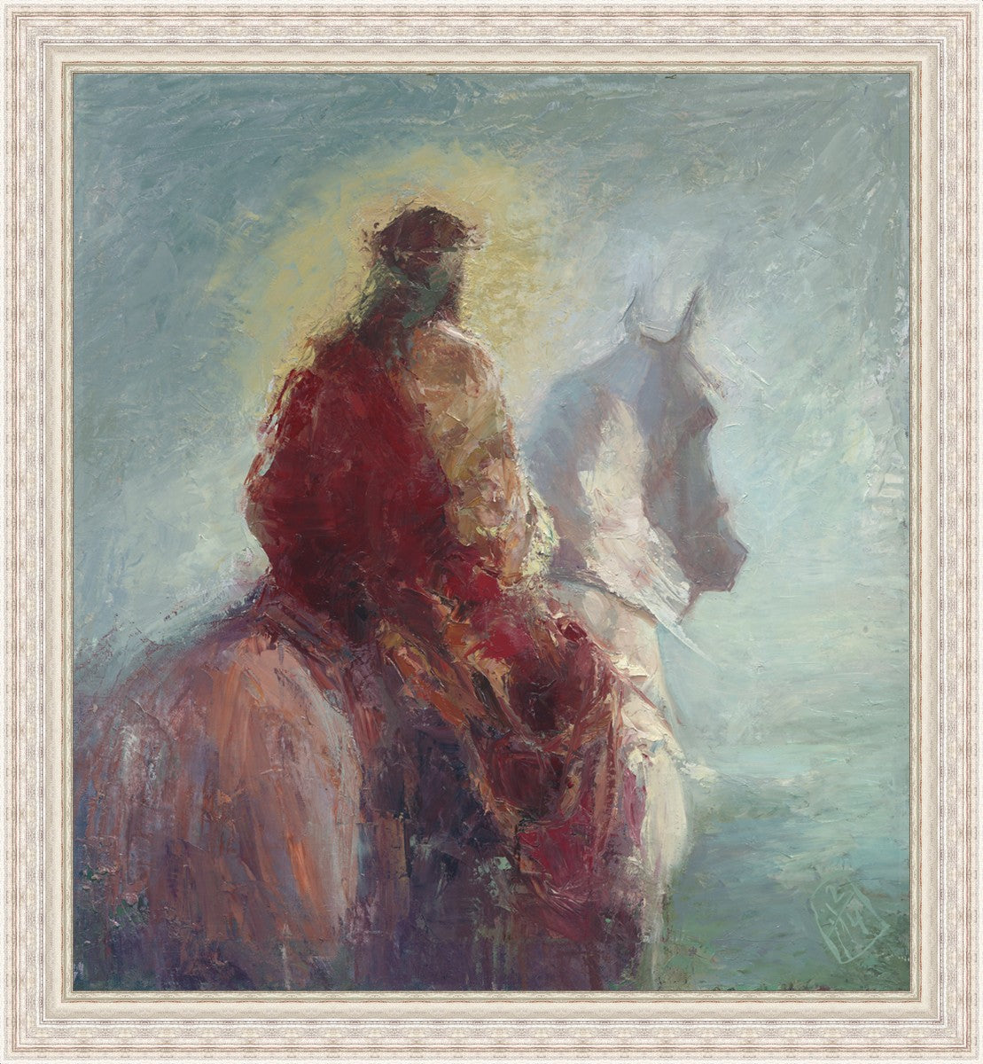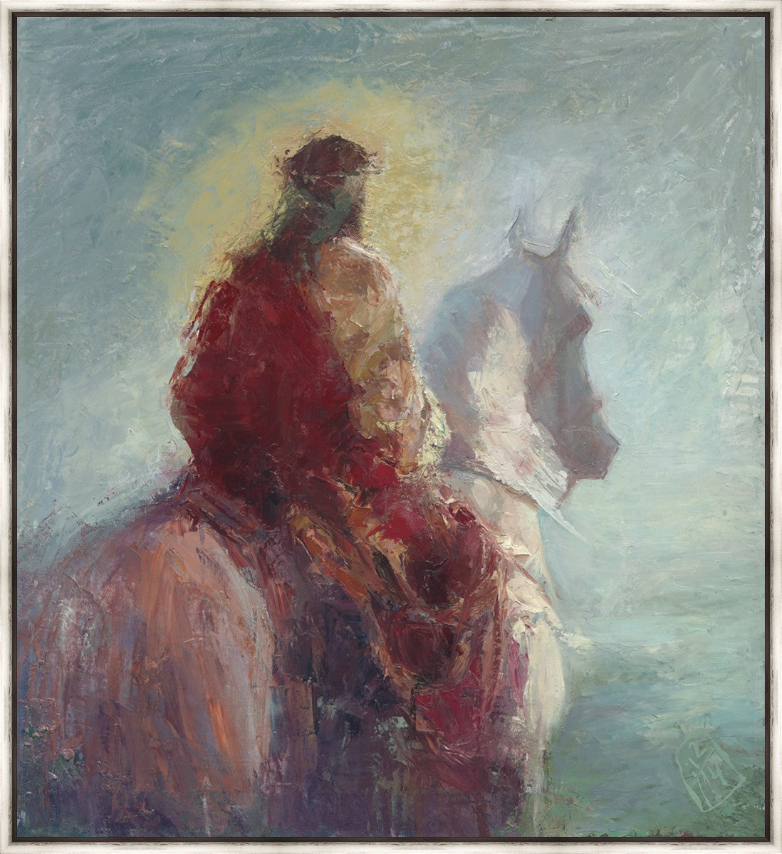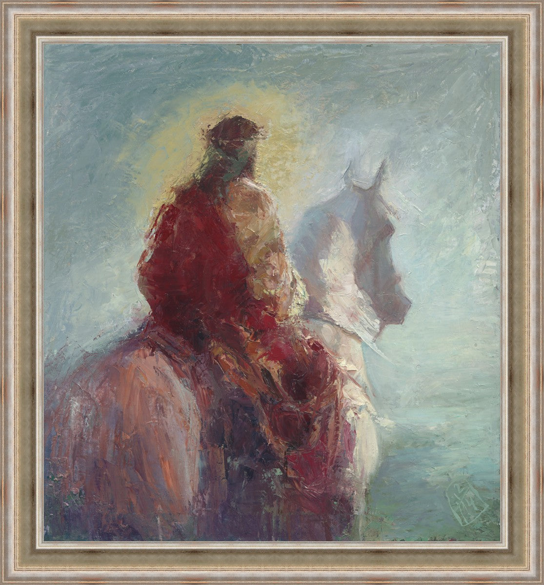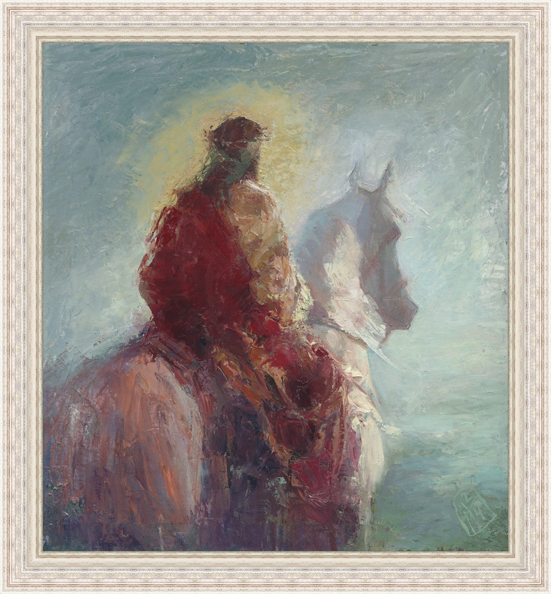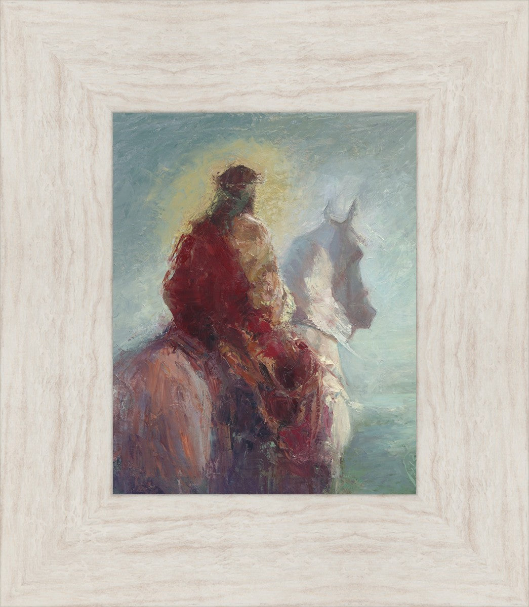 Based upon my dream, where I saw the Messiah riding a white horse. I have never seen His face, only saw Him from the back. I would never dare to paint His portrait, since it's very personal for everyone. In this painting He is painted during His Second Coming as a King who is leading the Heavenly hosts. As my friend mentioned, to be behind Messiah's back is the best location one can find himself during His Second Coming.