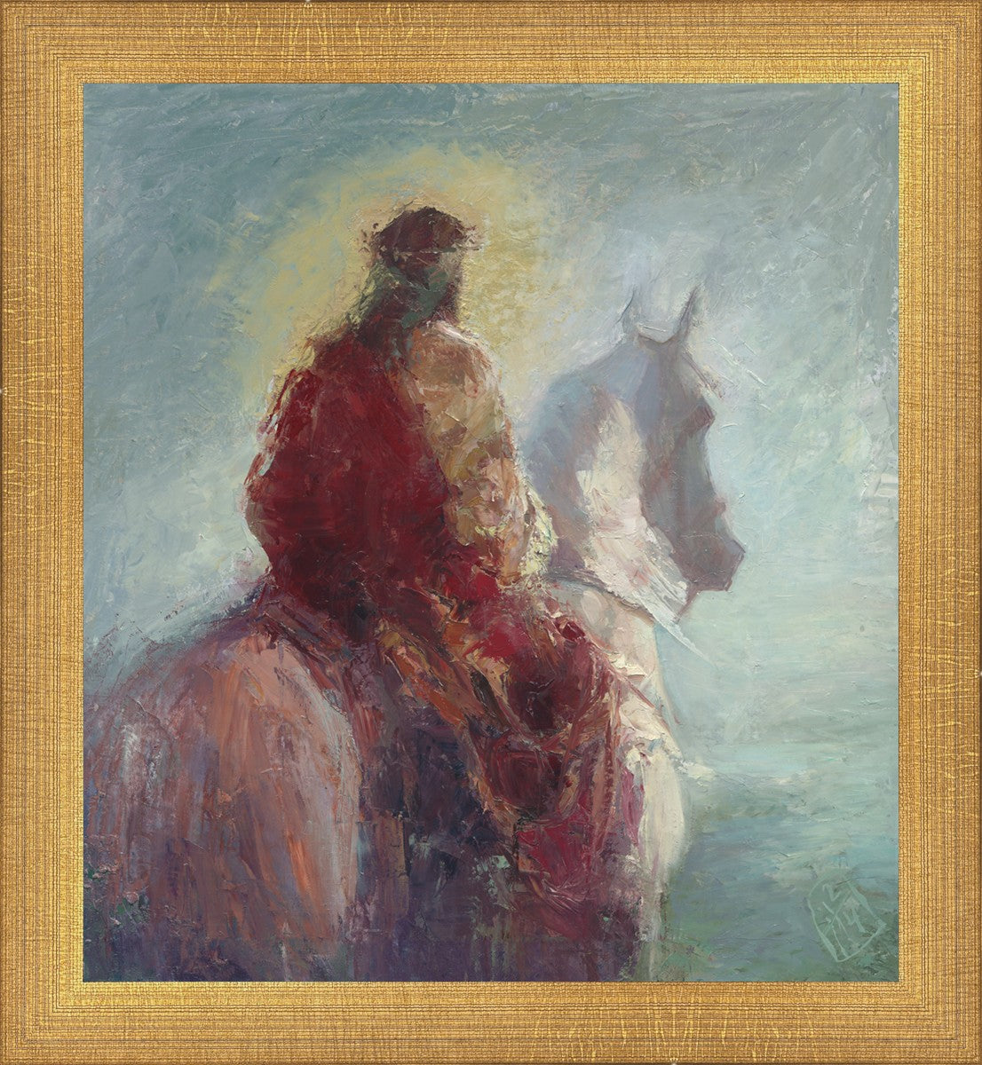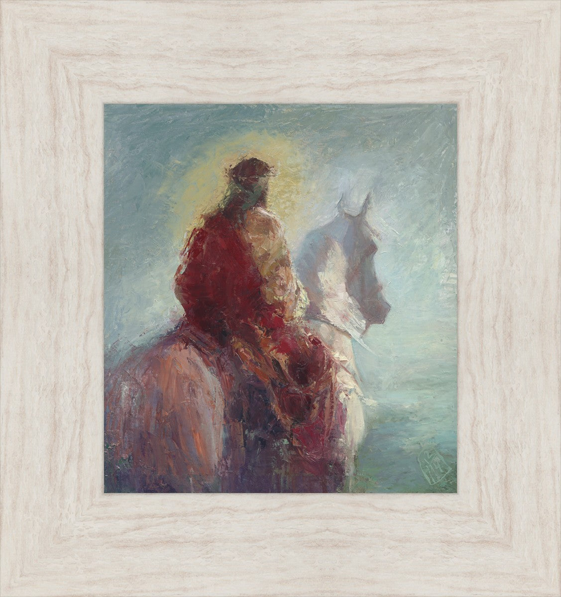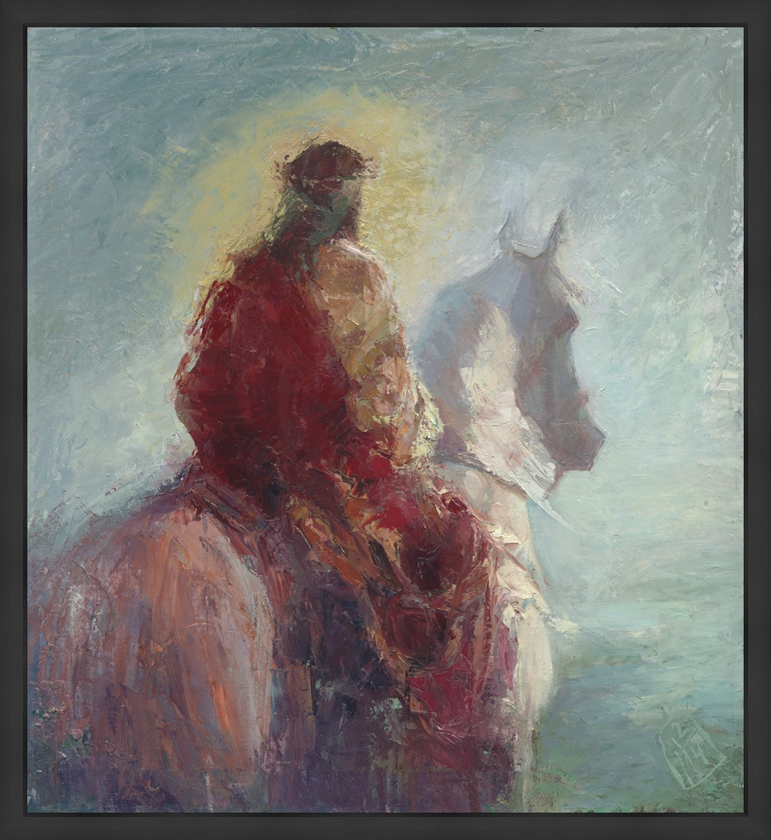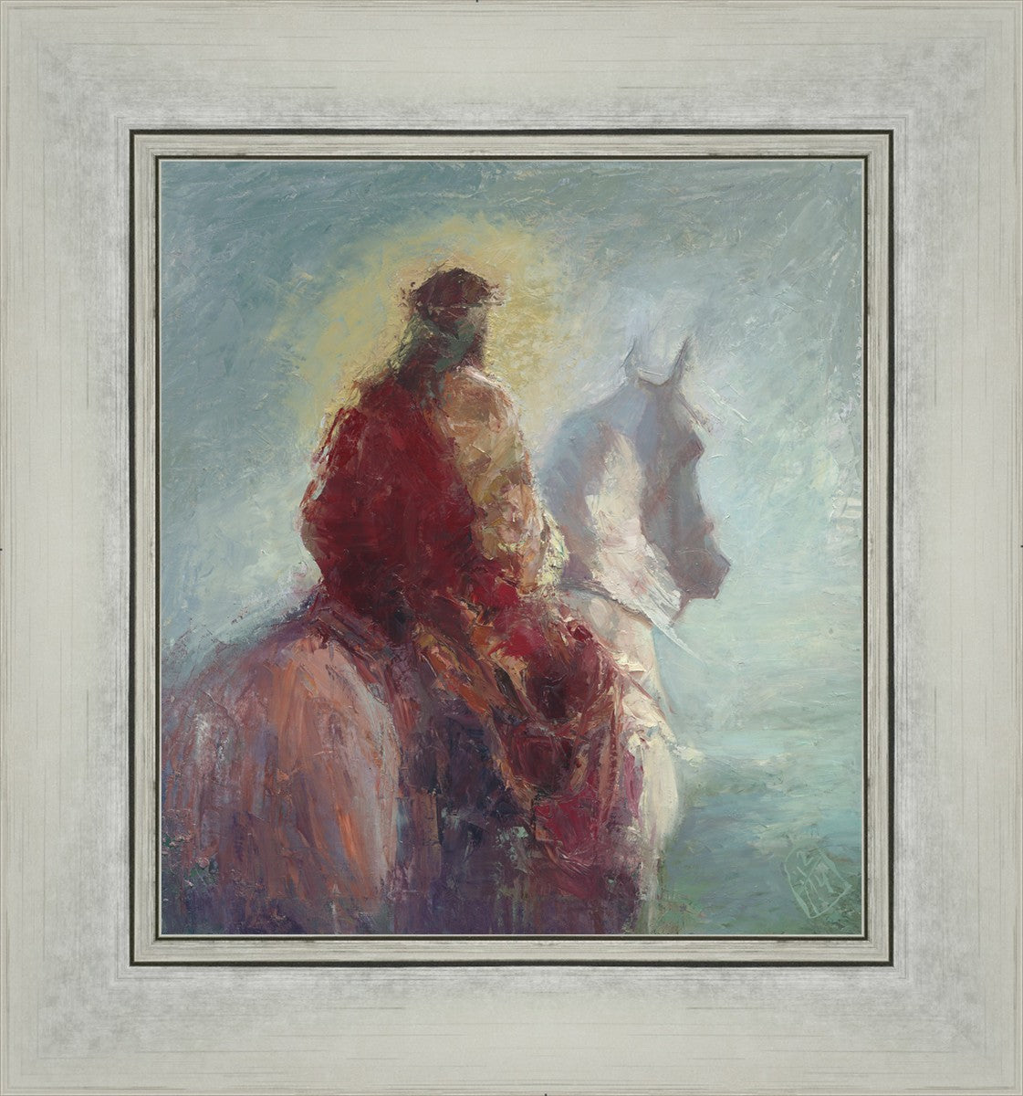 Based upon my dream, where I saw the Messiah riding a white horse. I have never seen His face, only saw Him from the back. I would never dare to paint His portrait, since it's very personal for everyone. In this painting He is painted during His Second Coming as a King who is leading the Heavenly hosts. As my friend mentioned, to be behind Messiah's back is the best location one can find himself during His Second Coming.