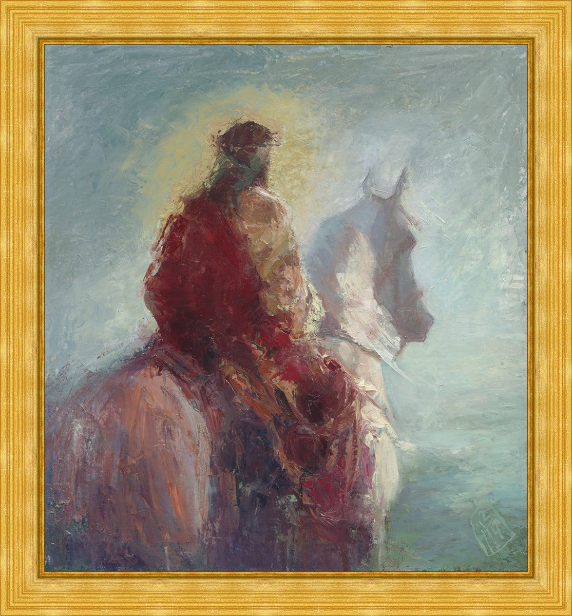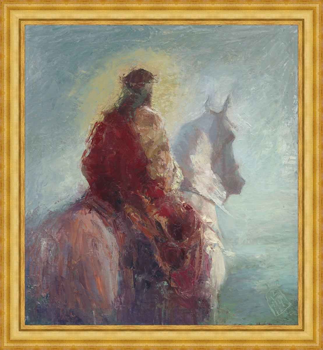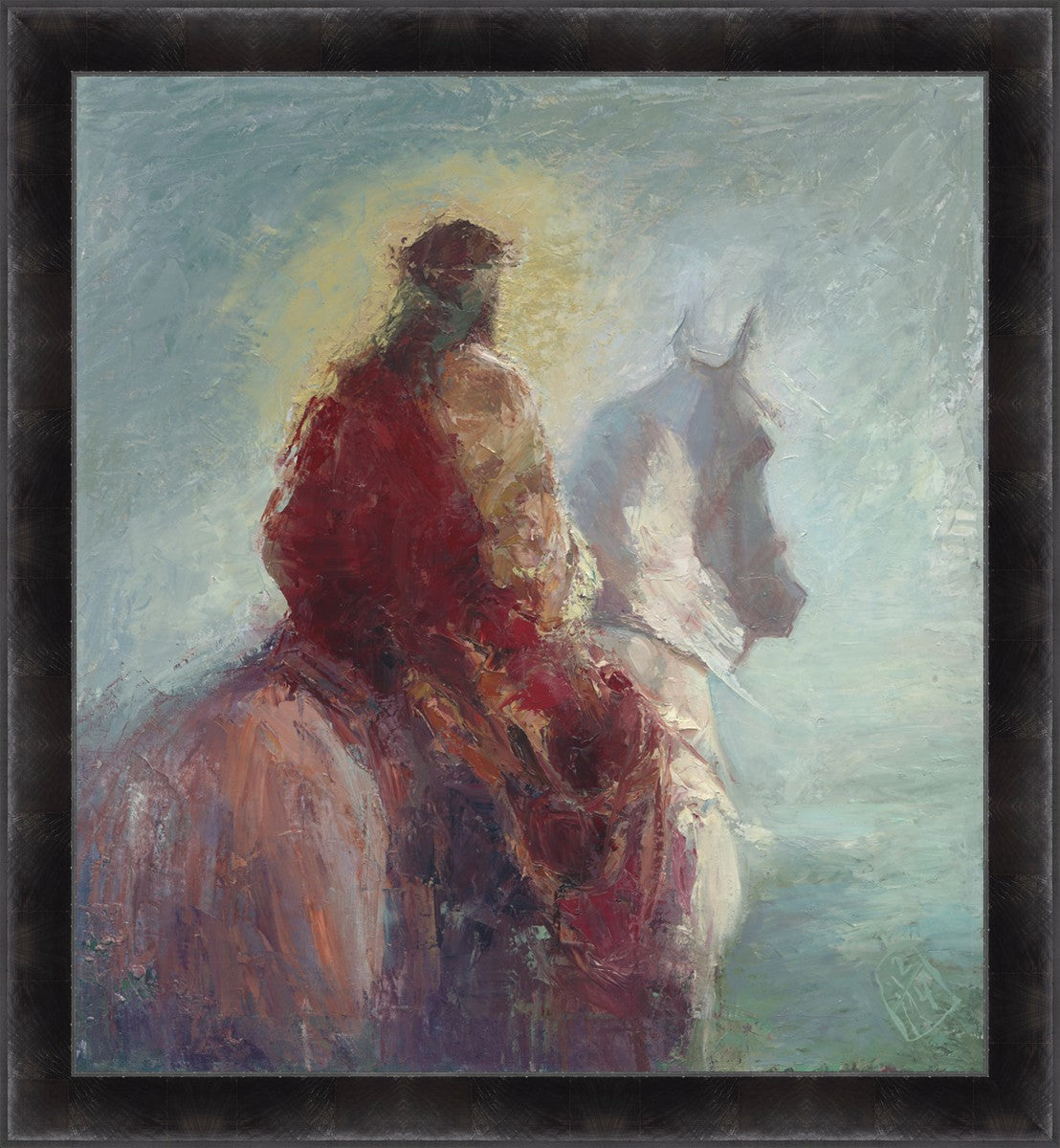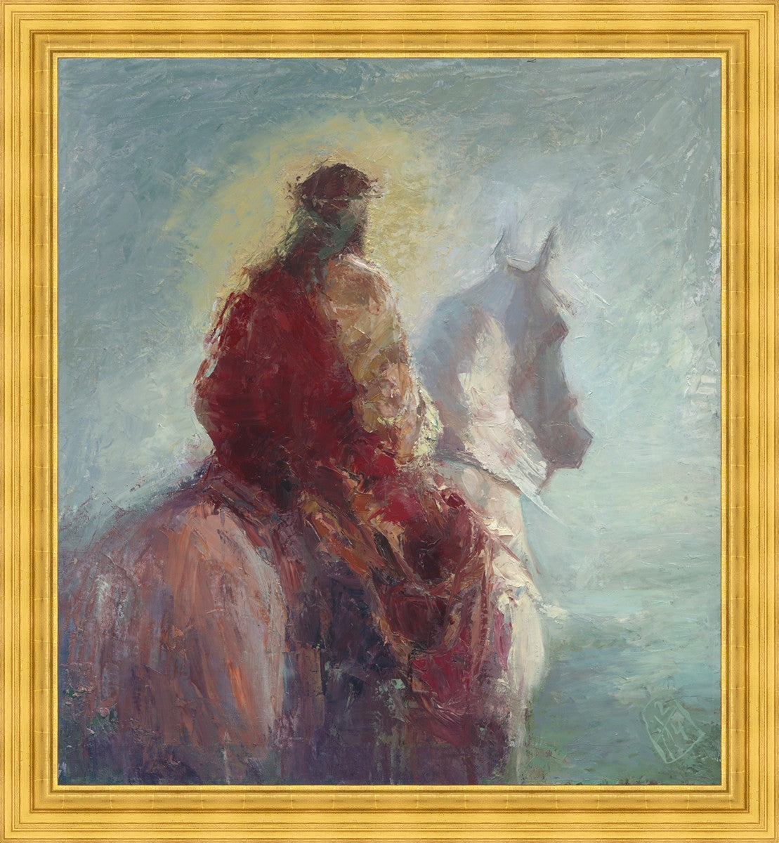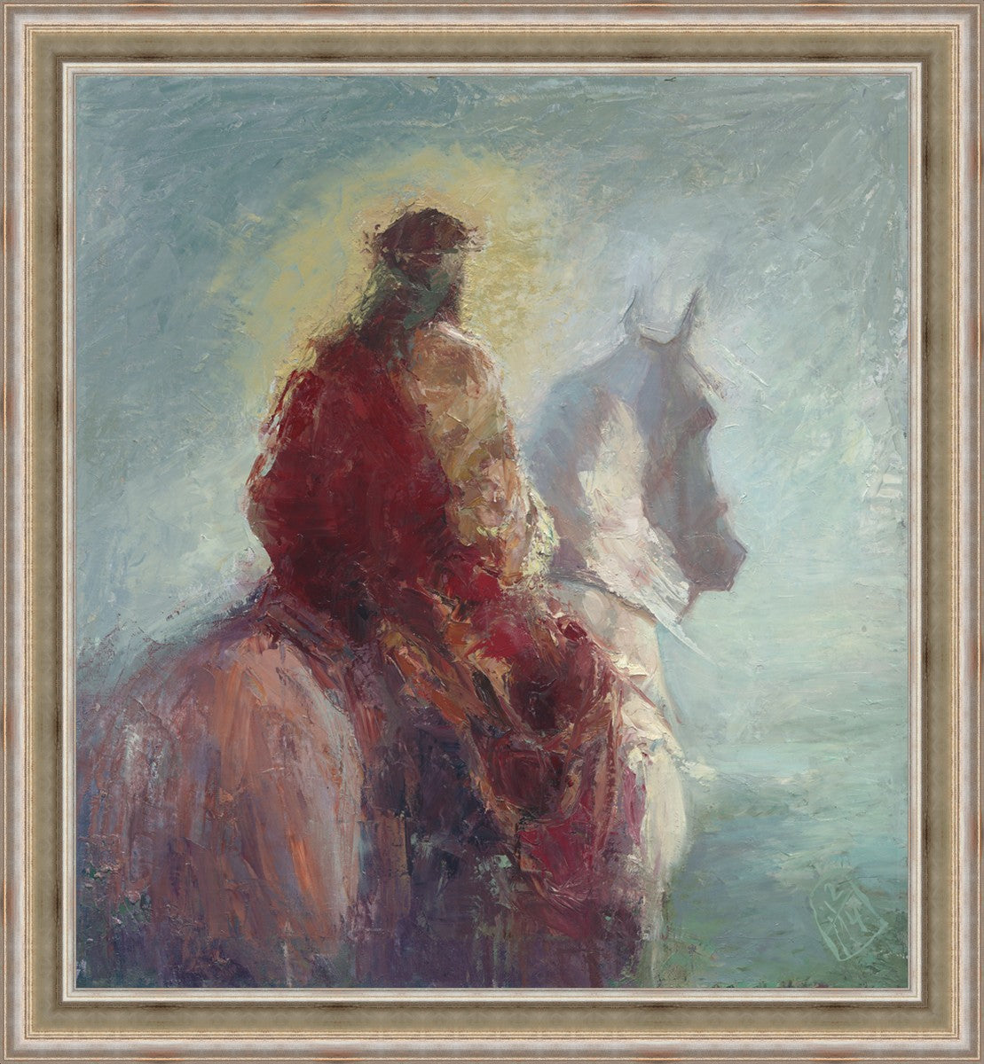 Based upon my dream, where I saw the Messiah riding a white horse. I have never seen His face, only saw Him from the back. I would never dare to paint His portrait, since it's very personal for everyone. In this painting He is painted during His Second Coming as a King who is leading the Heavenly hosts. As my friend mentioned, to be behind Messiah's back is the best location one can find himself during His Second Coming.