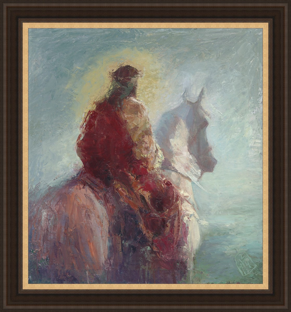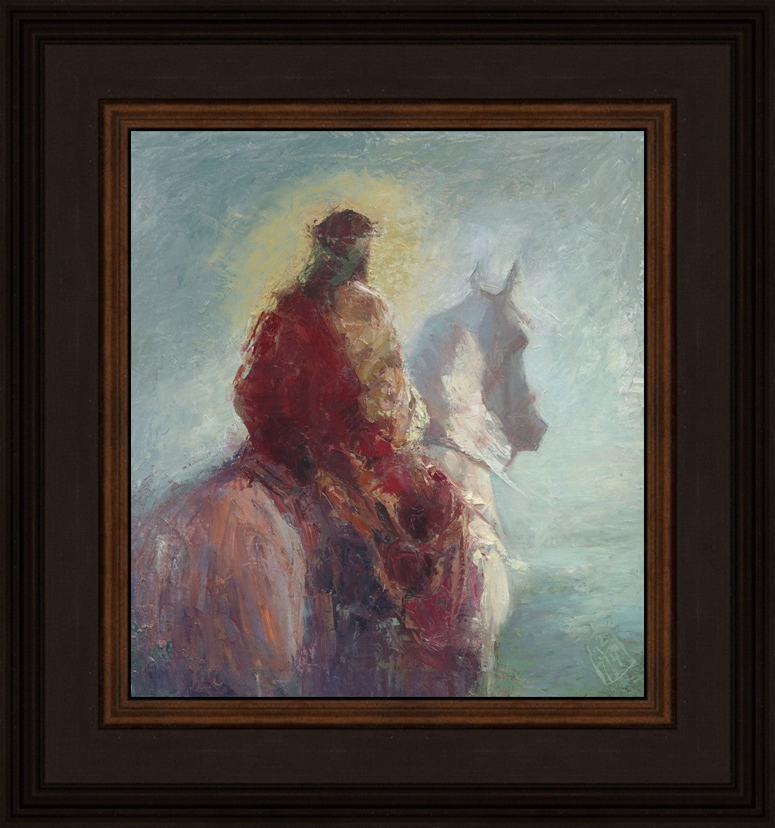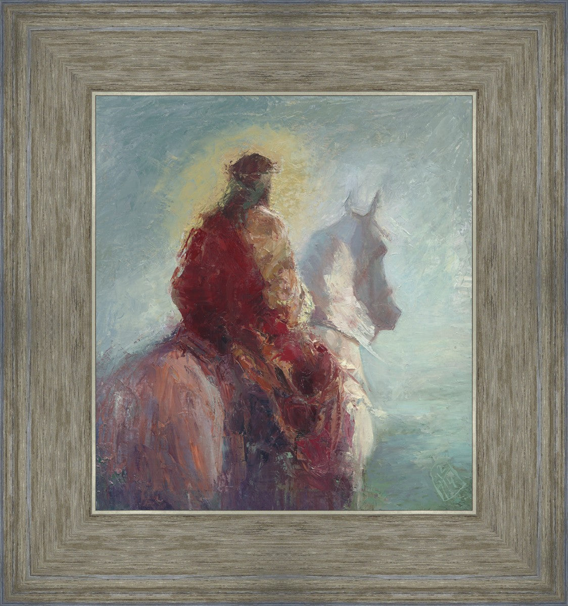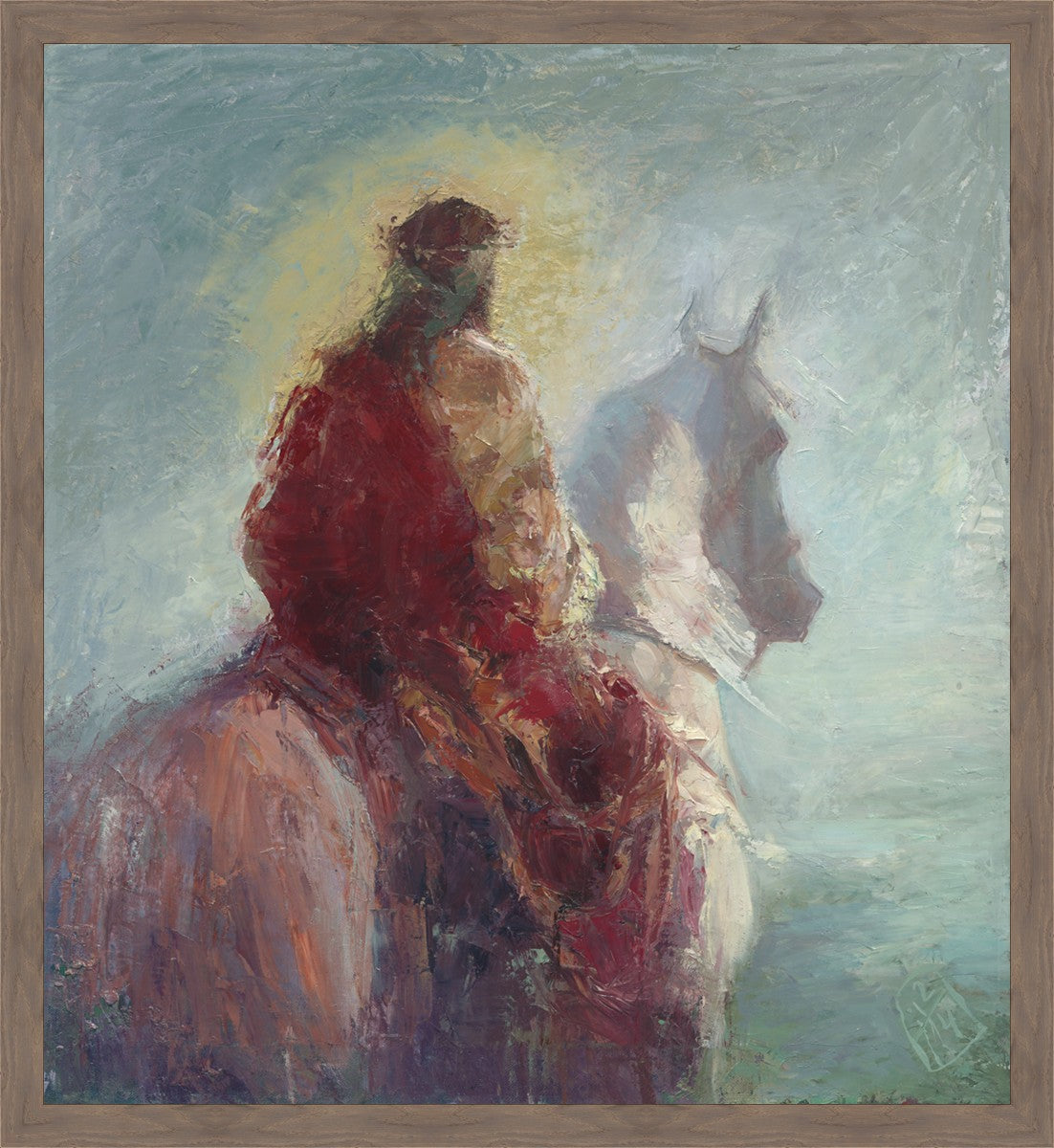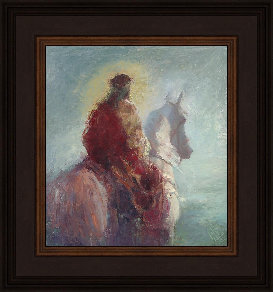 Based upon my dream, where I saw the Messiah riding a white horse. I have never seen His face, only saw Him from the back. I would never dare to paint His portrait, since it's very personal for everyone. In this painting He is painted during His Second Coming as a King who is leading the Heavenly hosts. As my friend mentioned, to be behind Messiah's back is the best location one can find himself during His Second Coming.