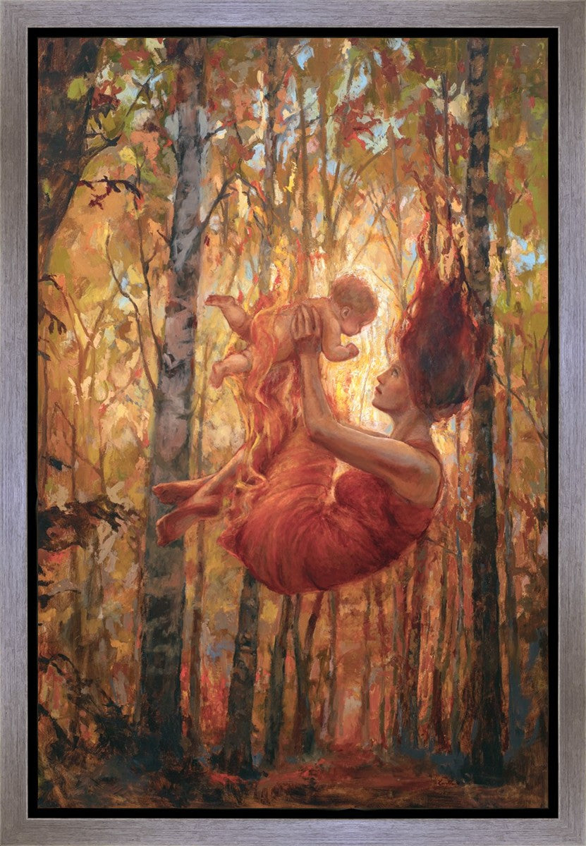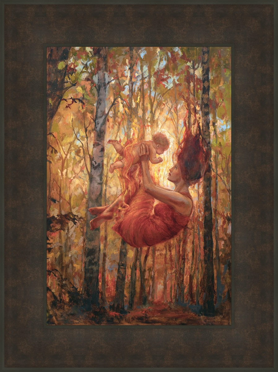 This woman represents Eve bringing all of humanity to earth. I set this fall of humankind in the season of fall. The season that reminds us of the beauty that can be found in change. The fire is a representation of the Holy Spirit or the presence of God. It is also an indication of the refiners fire that we will experience while during our mortality.