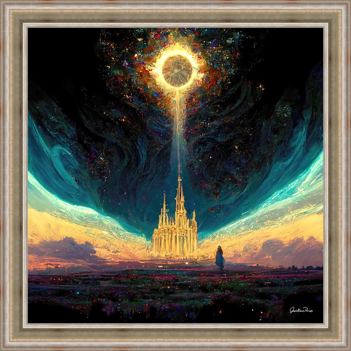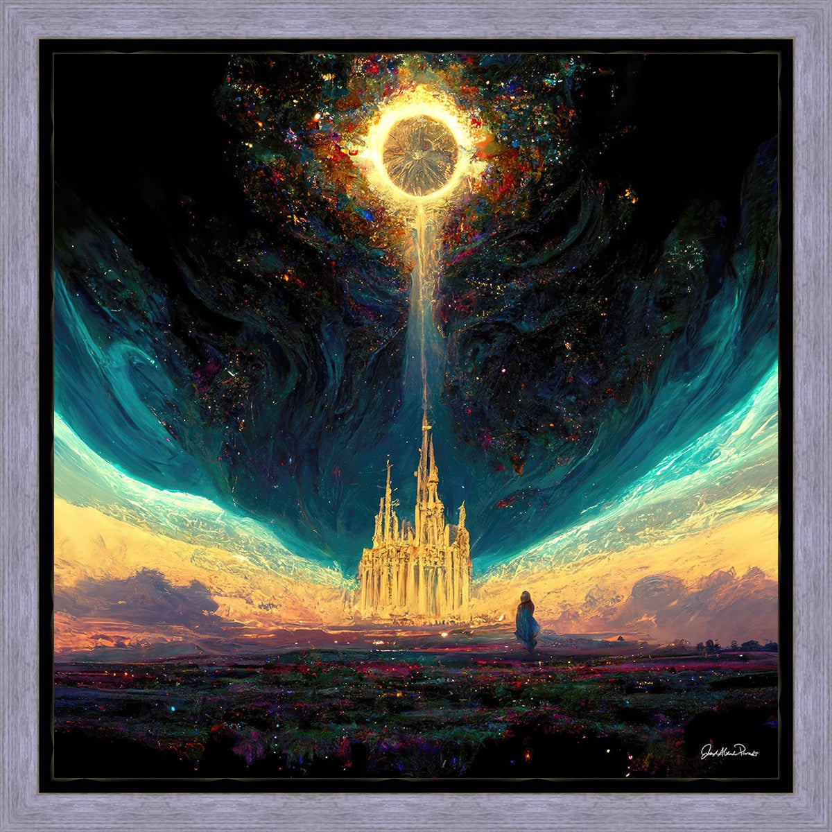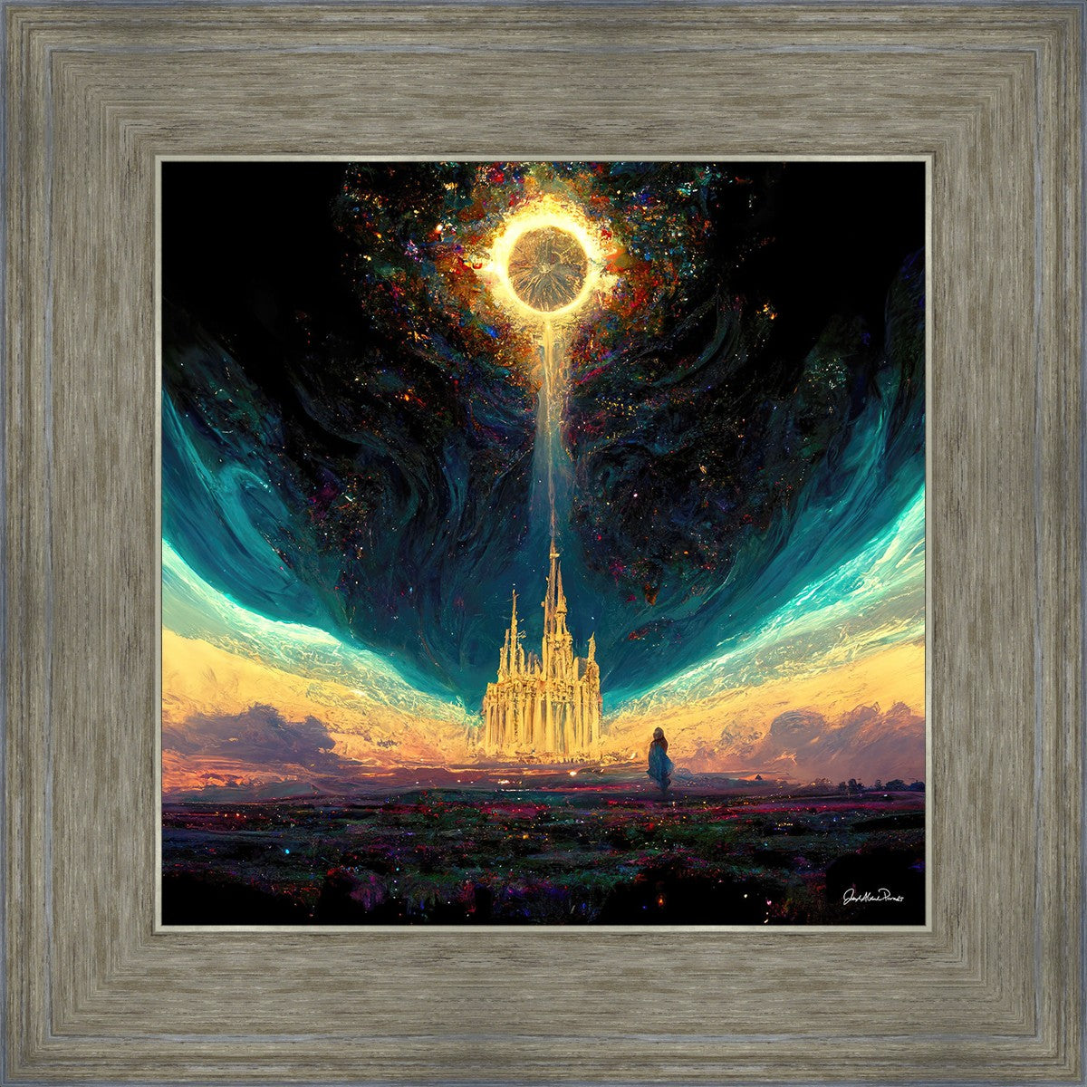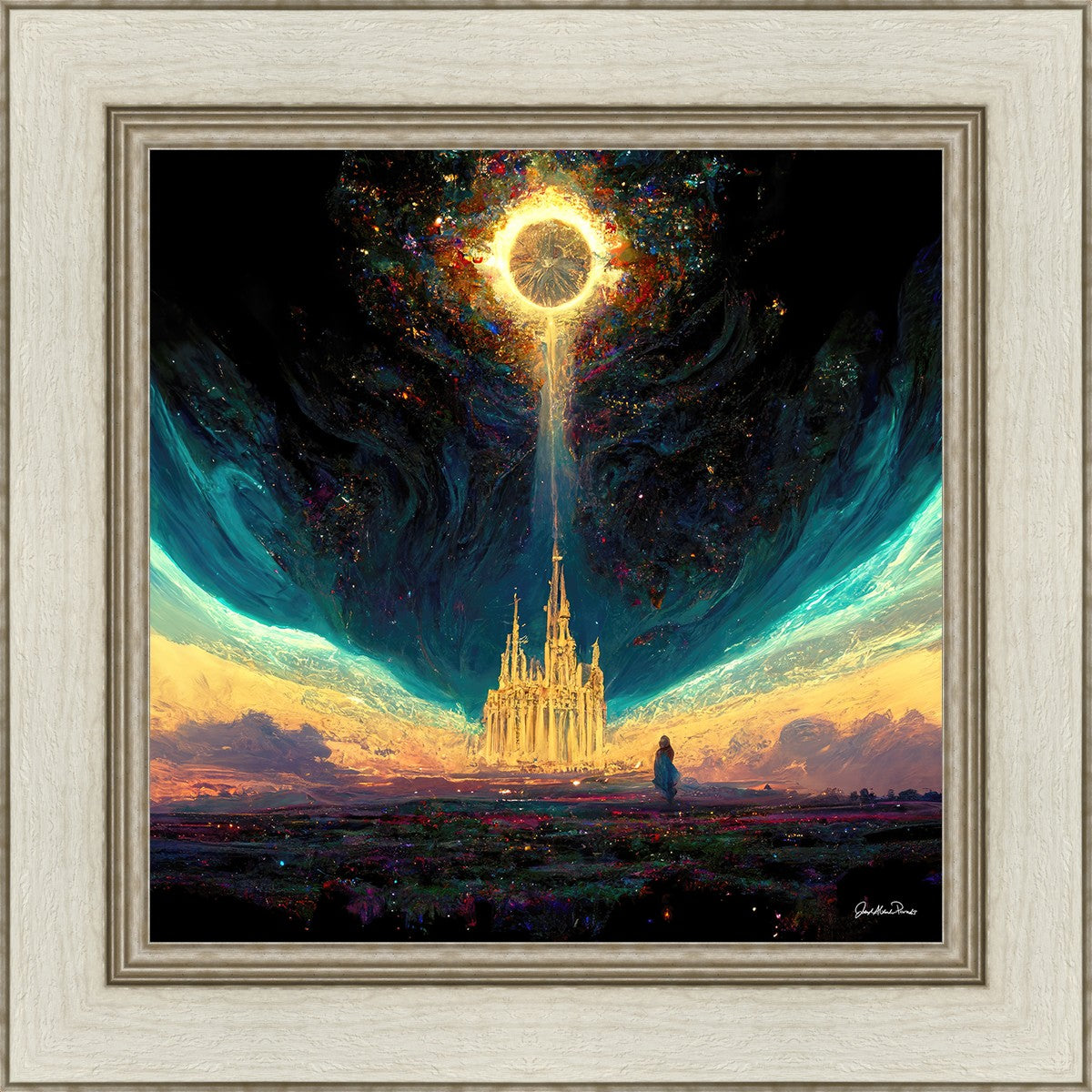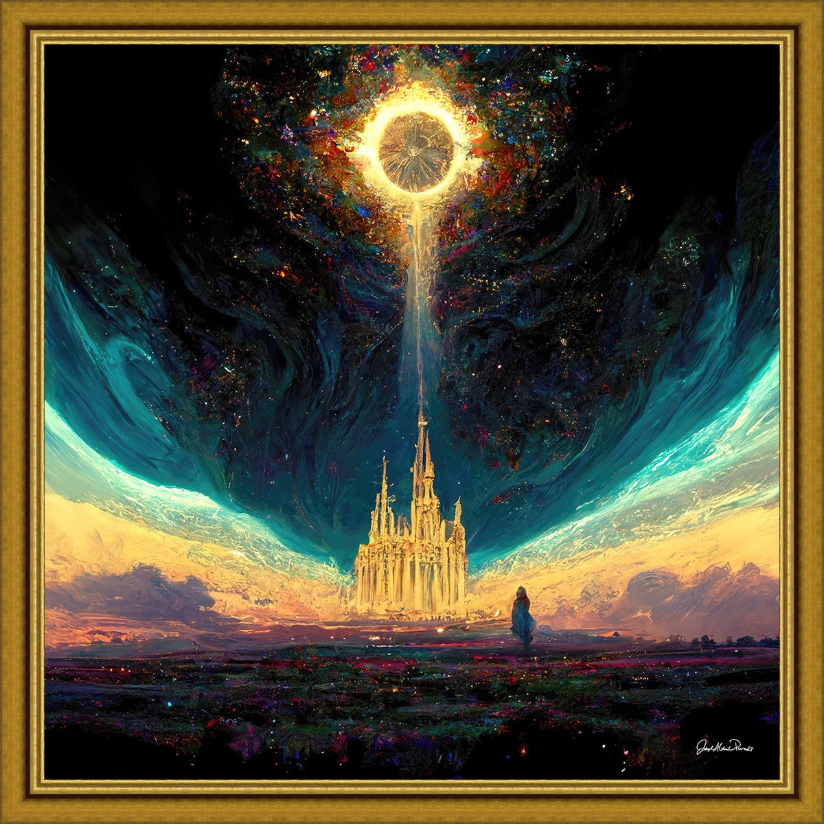A depiction of the Light of Christ emanating from His throne down to all of His creations and His church. The wake of which, parts the clouds in similitude of the parting of the Red Sea. A solitary woman stands in the awe of this bewildering sight in which she is blessed to behold.