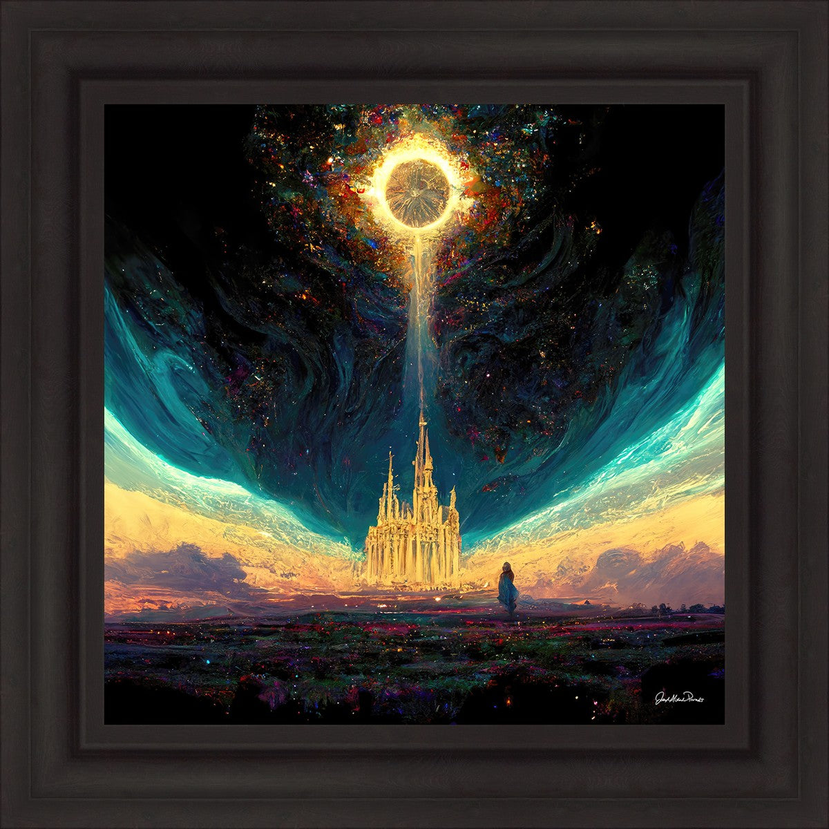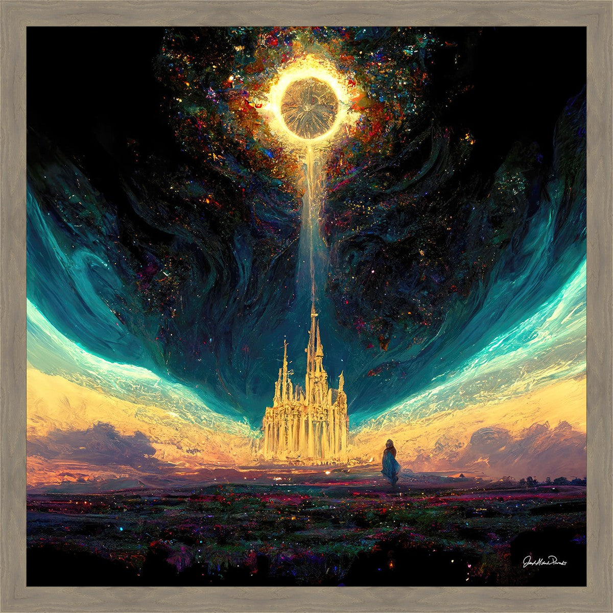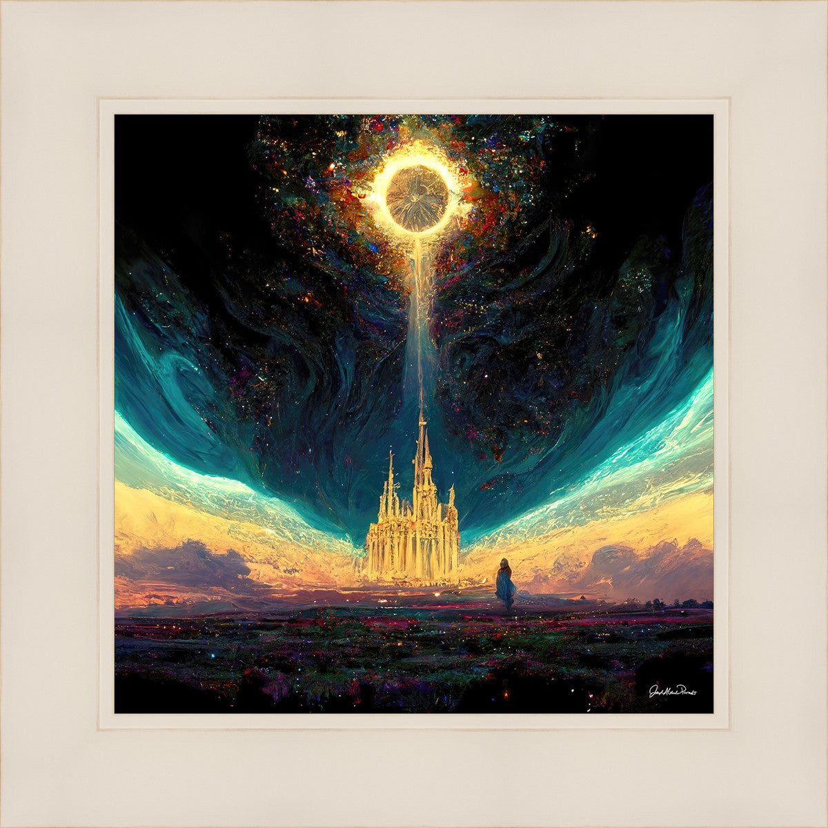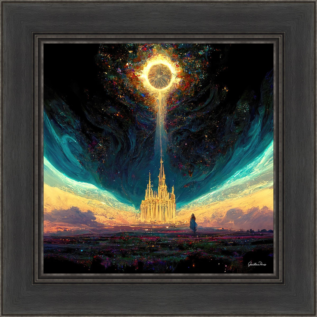 A depiction of the Light of Christ emanating from His throne down to all of His creations and His church. The wake of which, parts the clouds in similitude of the parting of the Red Sea. A solitary woman stands in the awe of this bewildering sight in which she is blessed to behold.