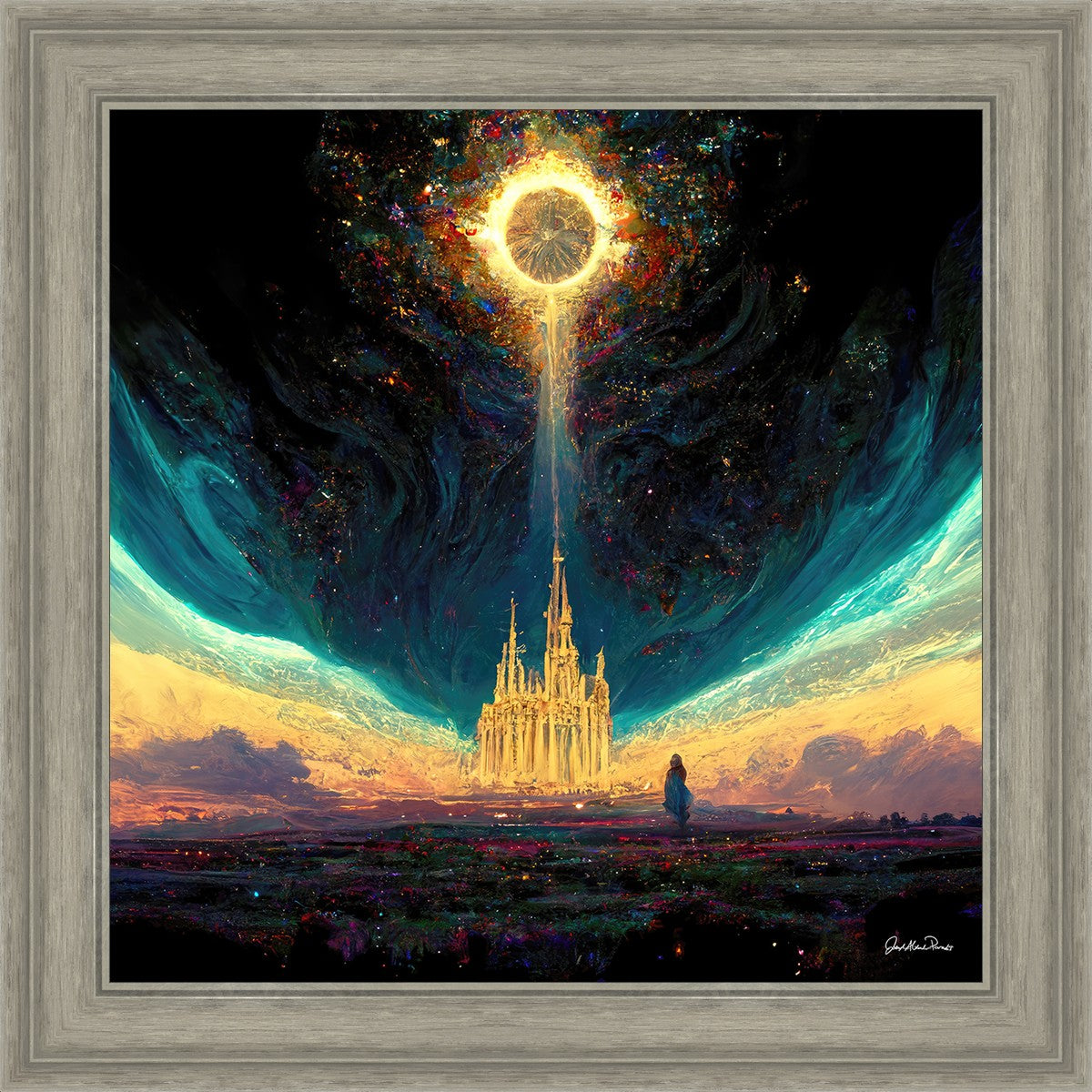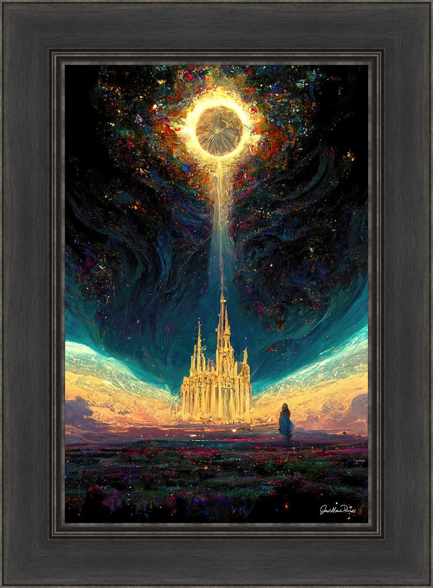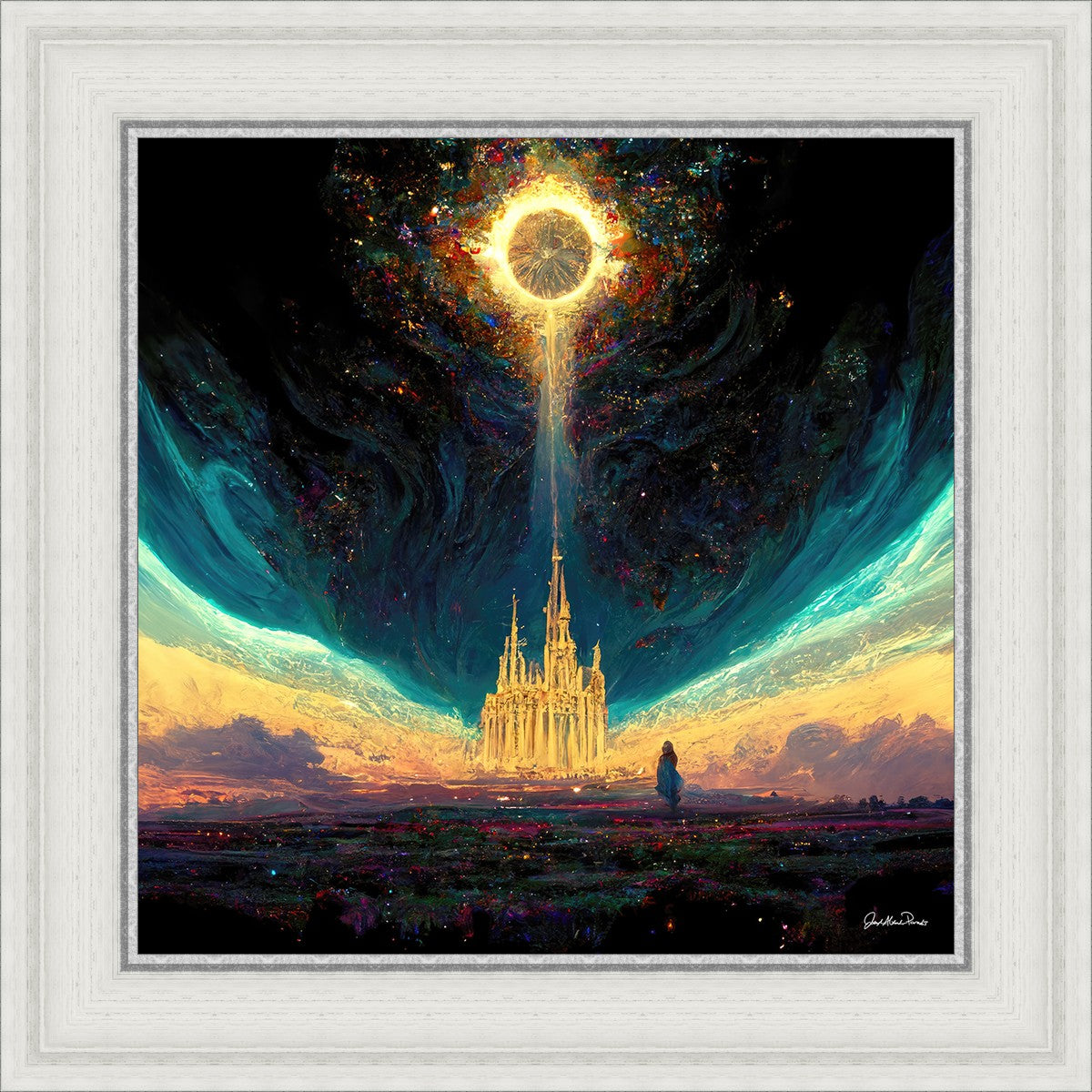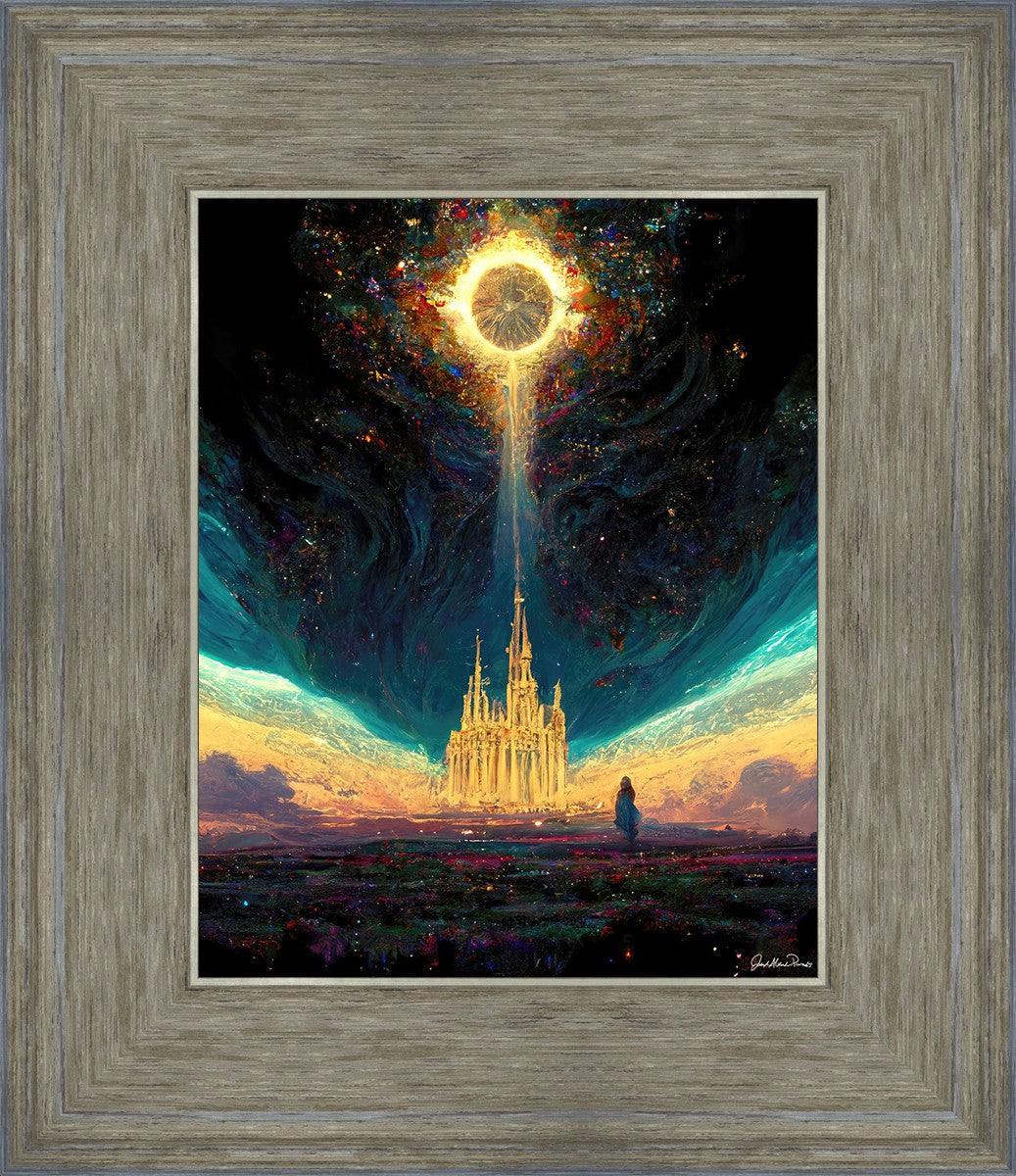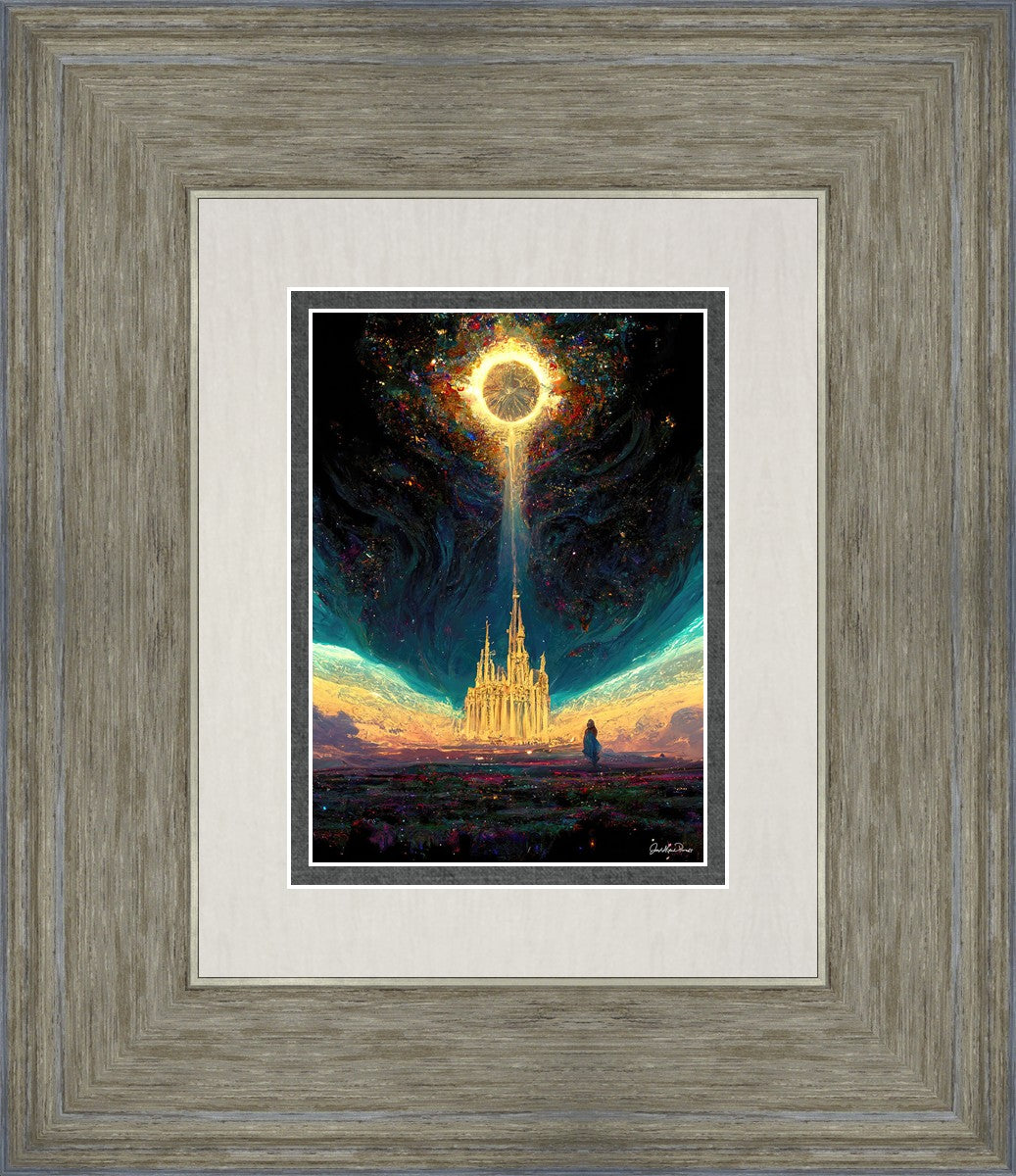 A depiction of the Light of Christ emanating from His throne down to all of His creations and His church. The wake of which, parts the clouds in similitude of the parting of the Red Sea. A solitary woman stands in the awe of this bewildering sight in which she is blessed to behold.