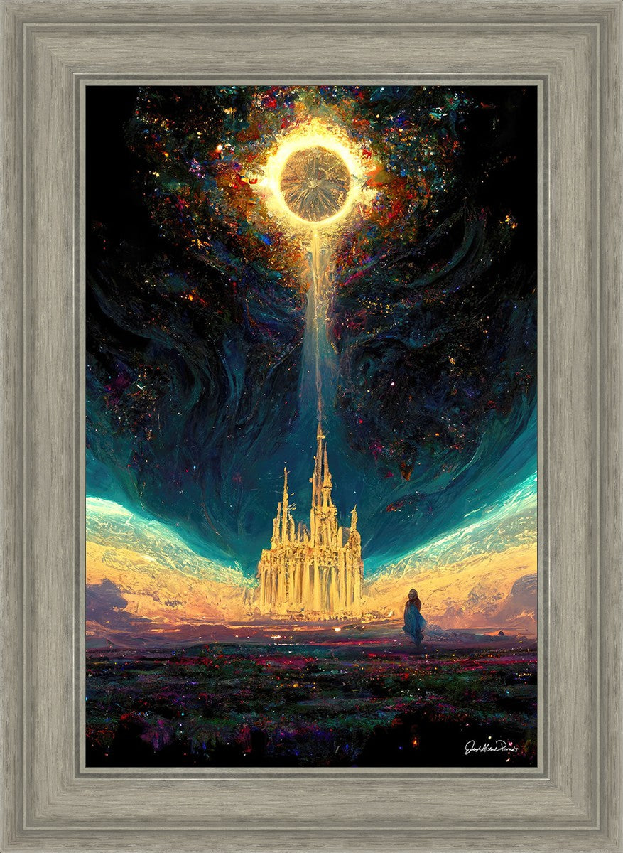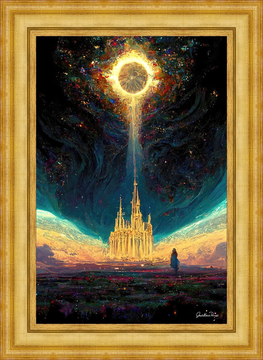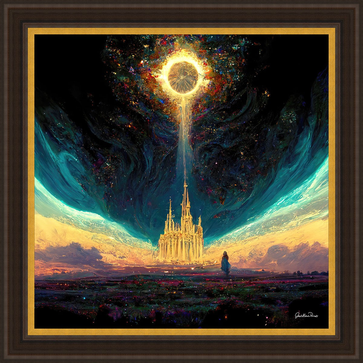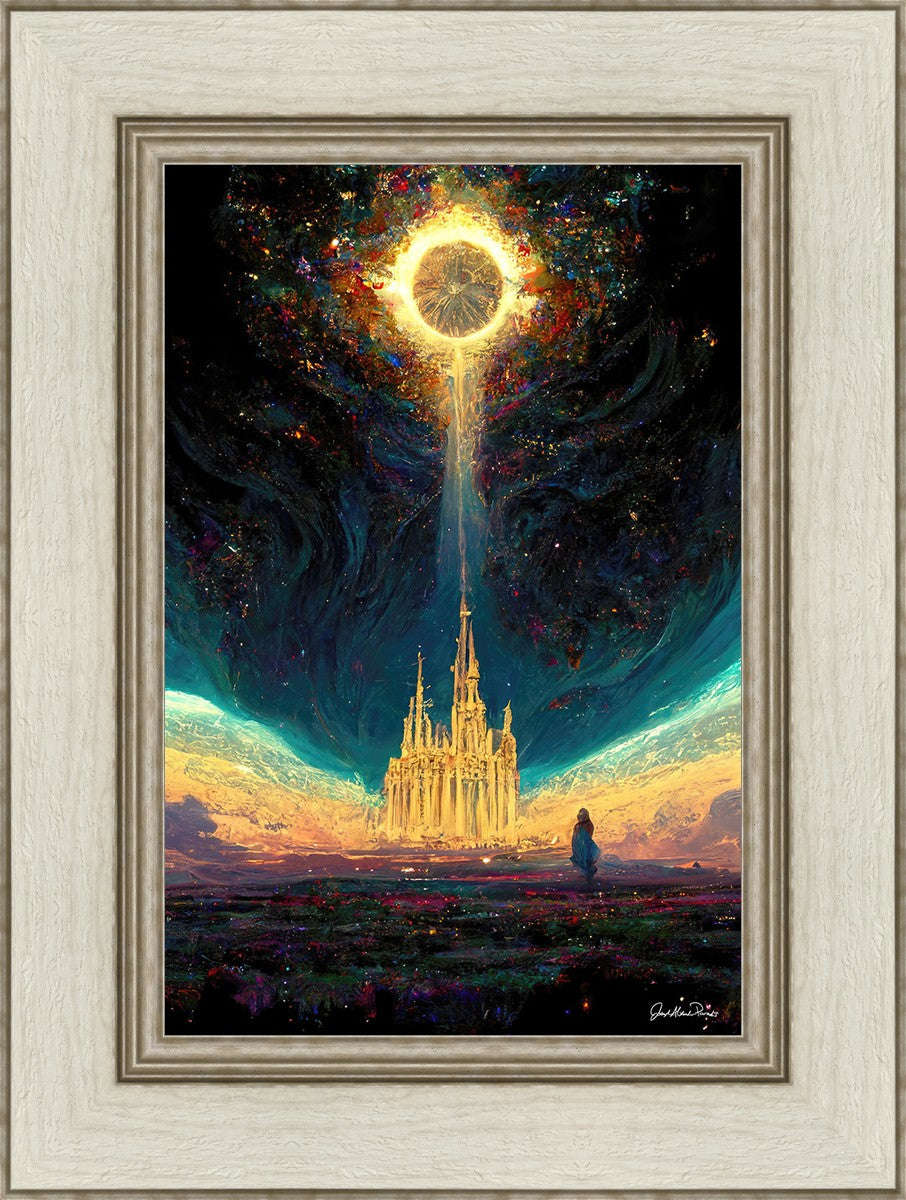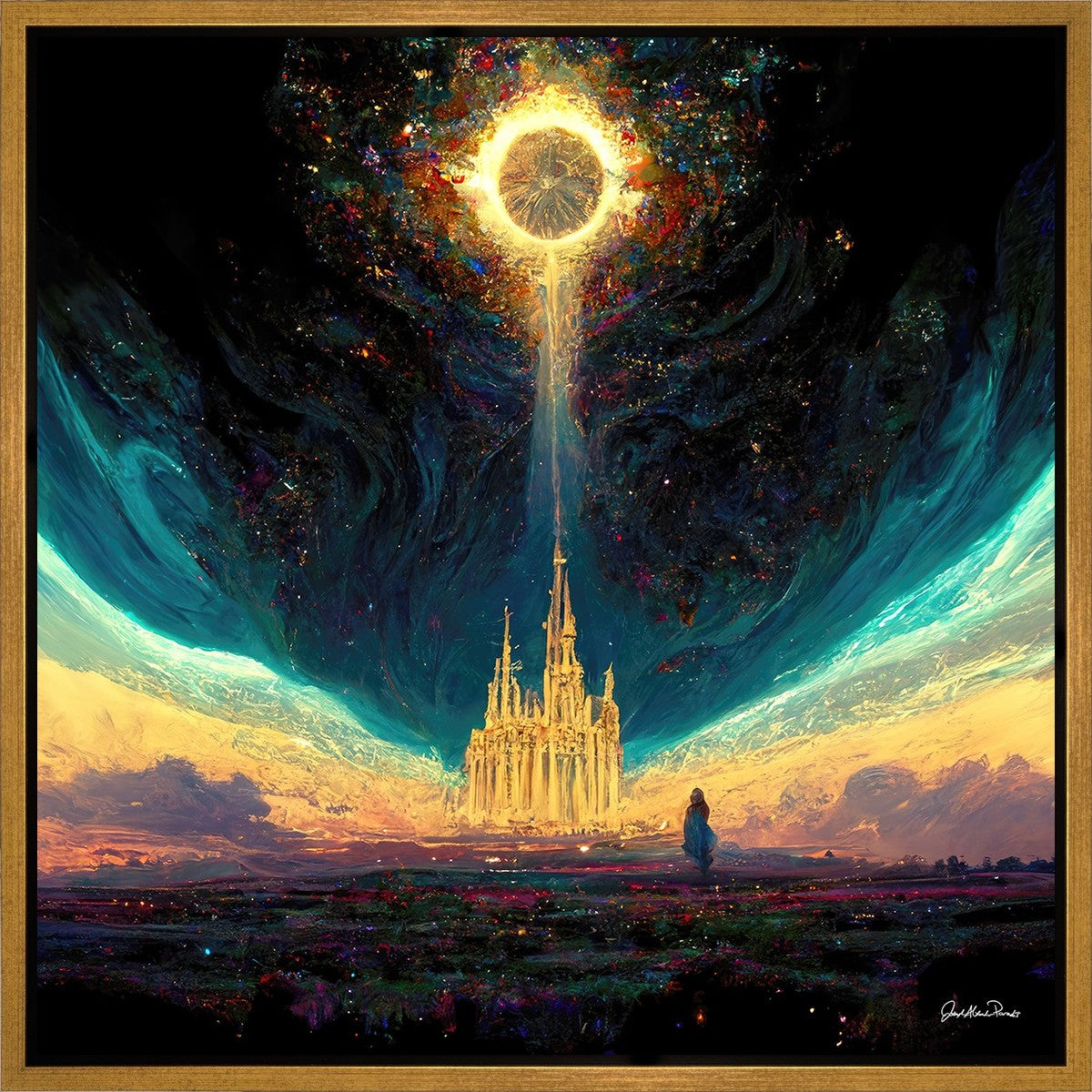 A depiction of the Light of Christ emanating from His throne down to all of His creations and His church. The wake of which, parts the clouds in similitude of the parting of the Red Sea. A solitary woman stands in the awe of this bewildering sight in which she is blessed to behold.