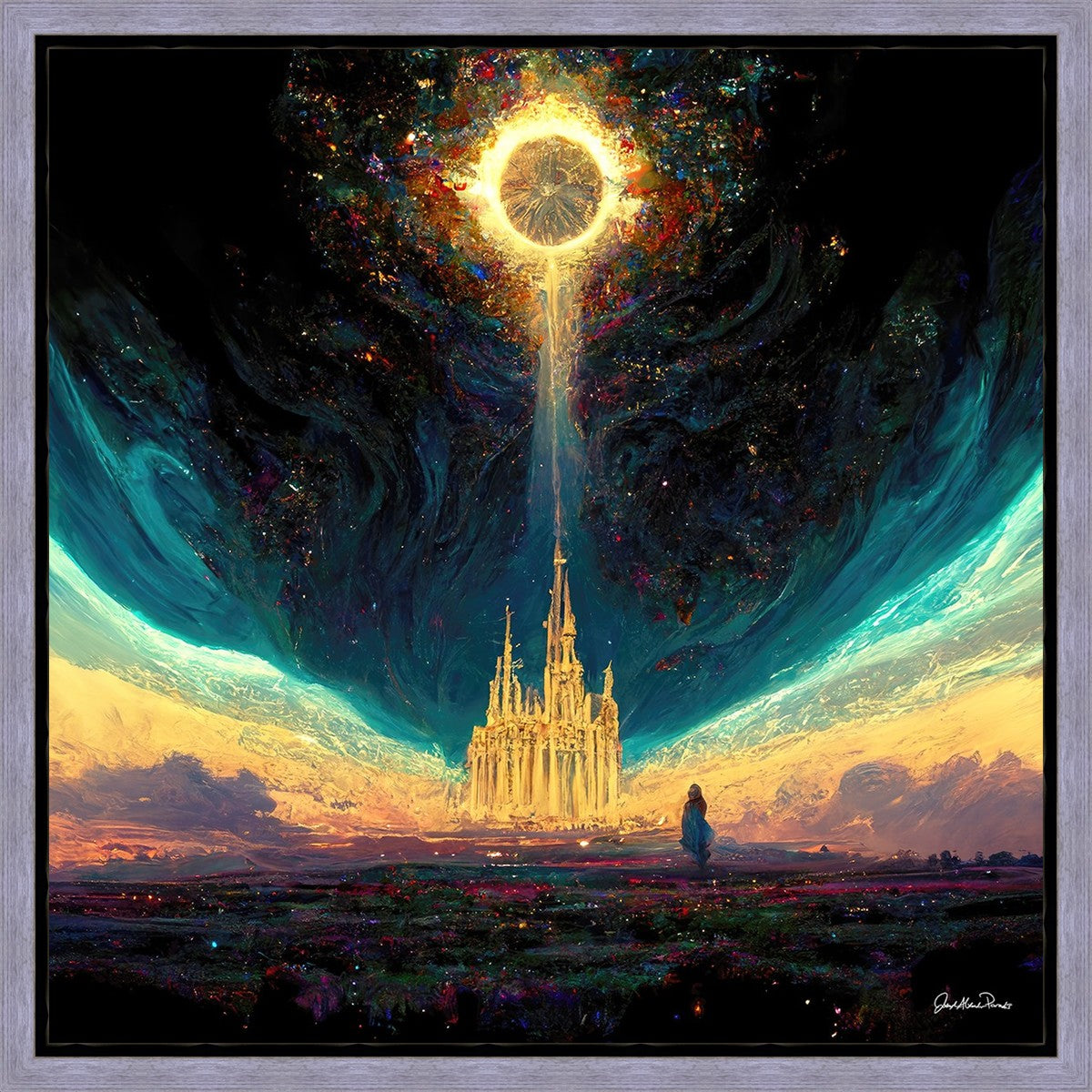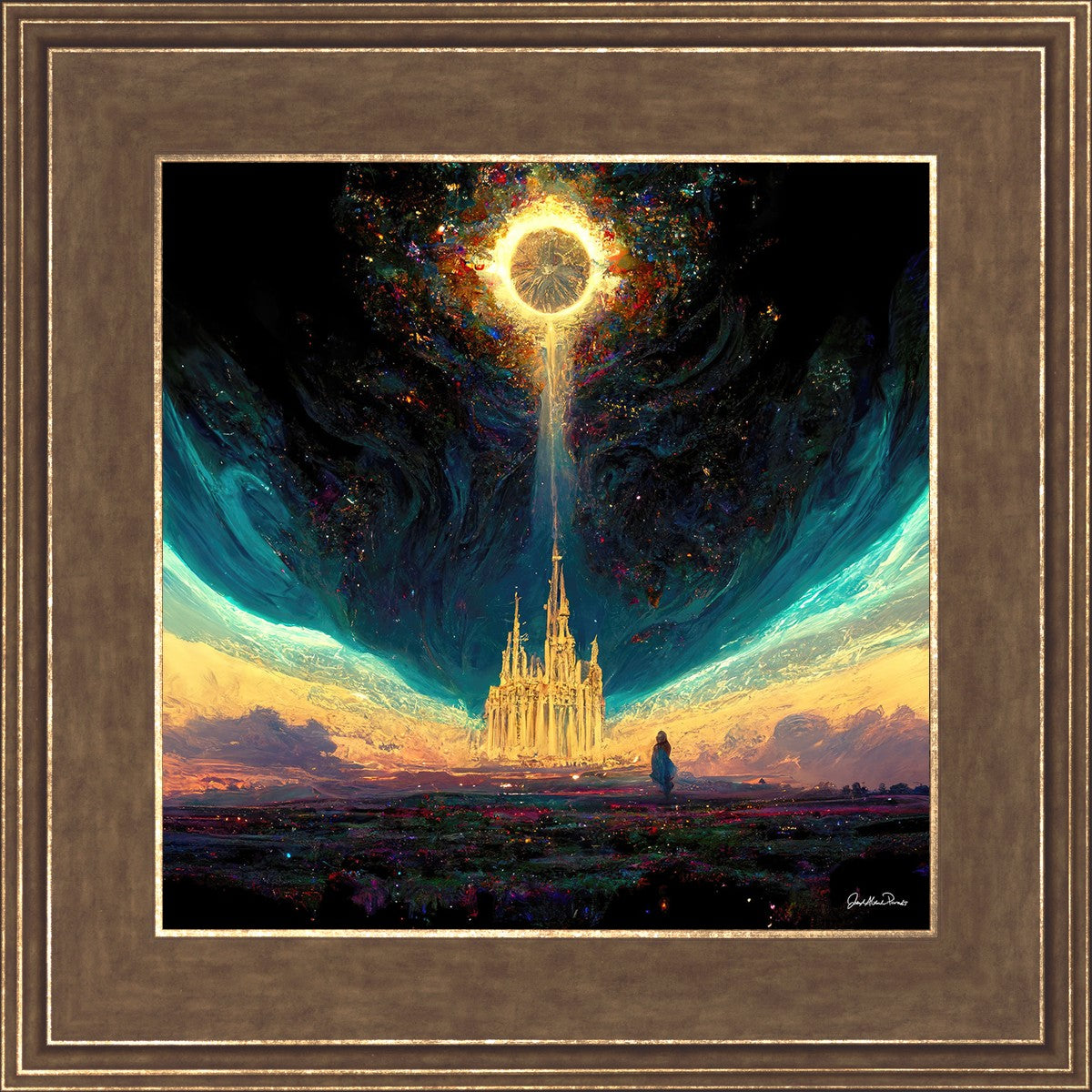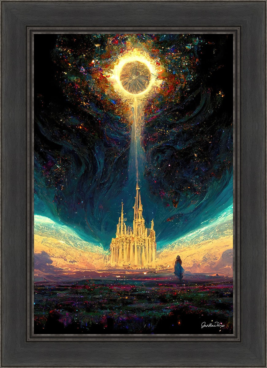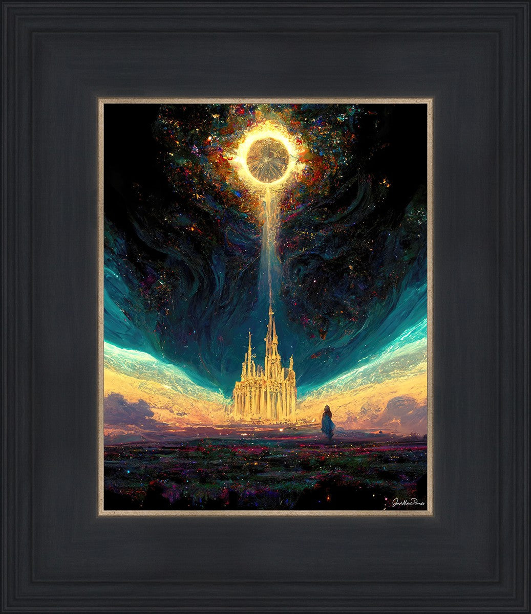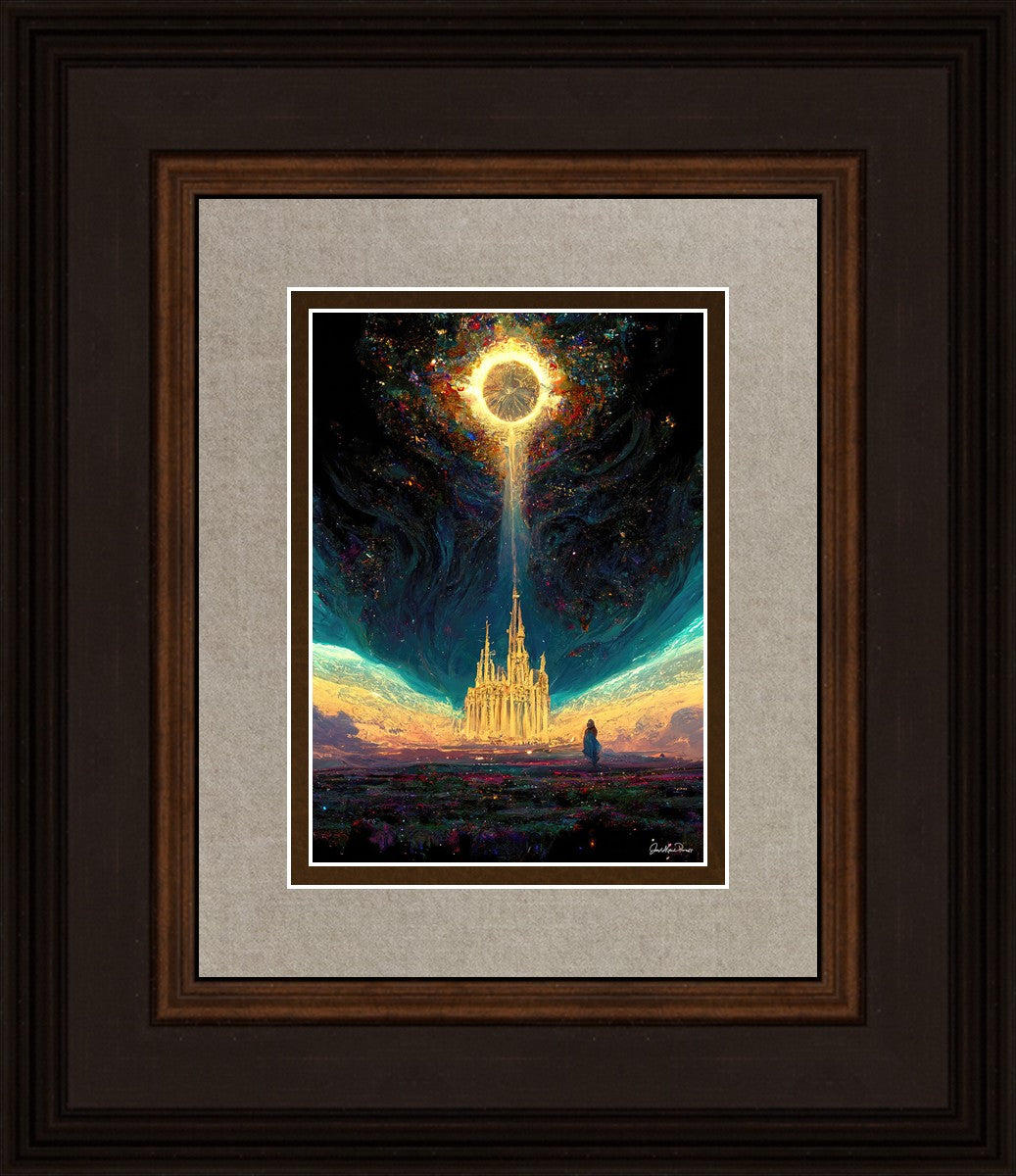 A depiction of the Light of Christ emanating from His throne down to all of His creations and His church. The wake of which, parts the clouds in similitude of the parting of the Red Sea. A solitary woman stands in the awe of this bewildering sight in which she is blessed to behold.