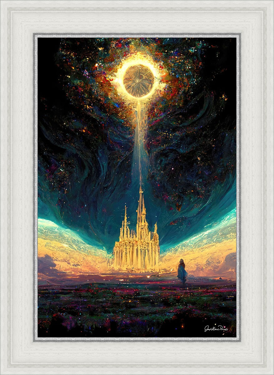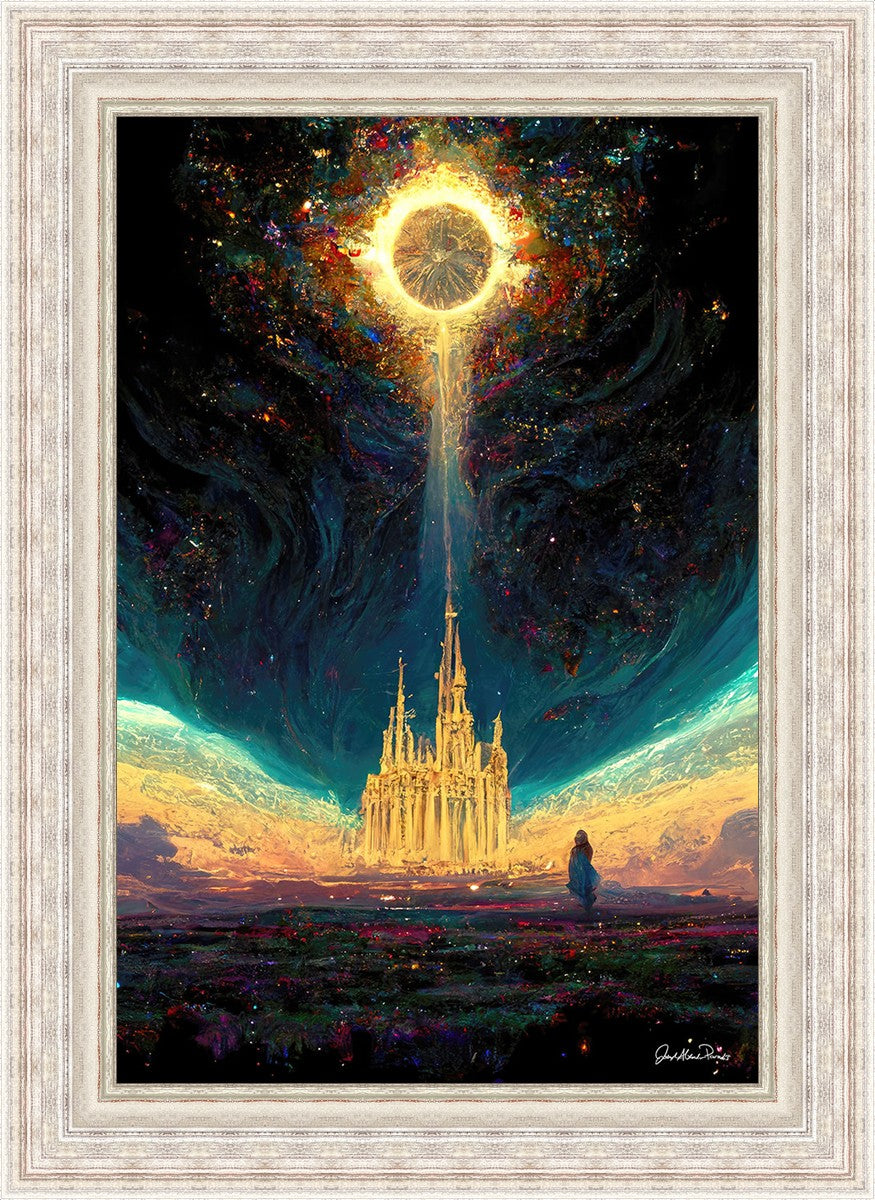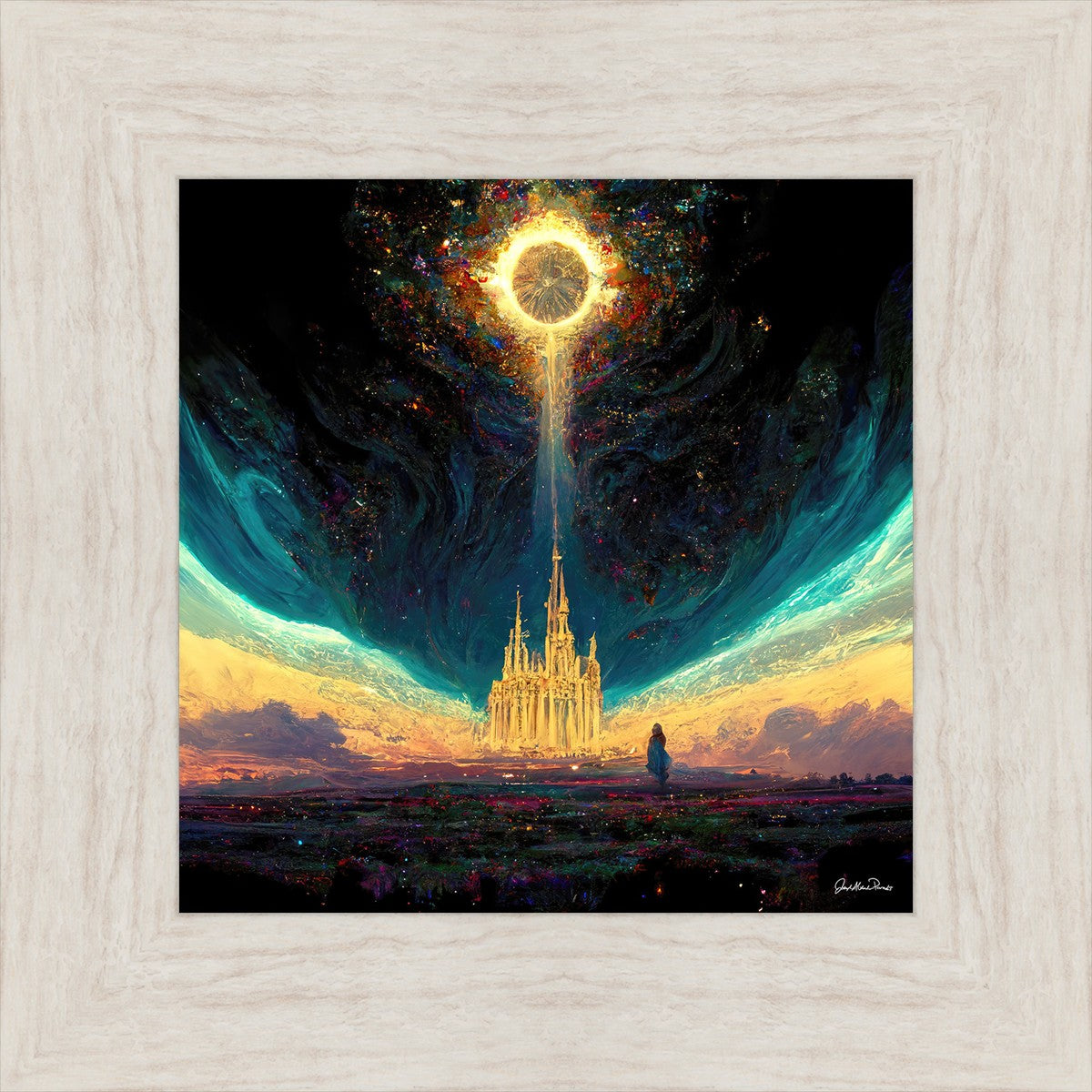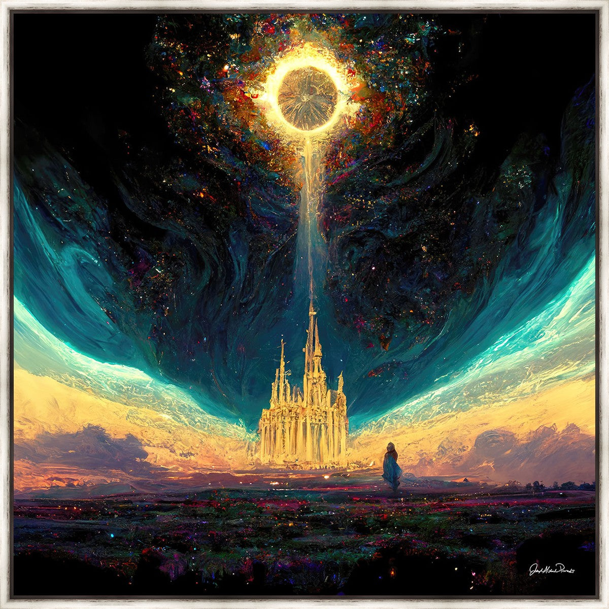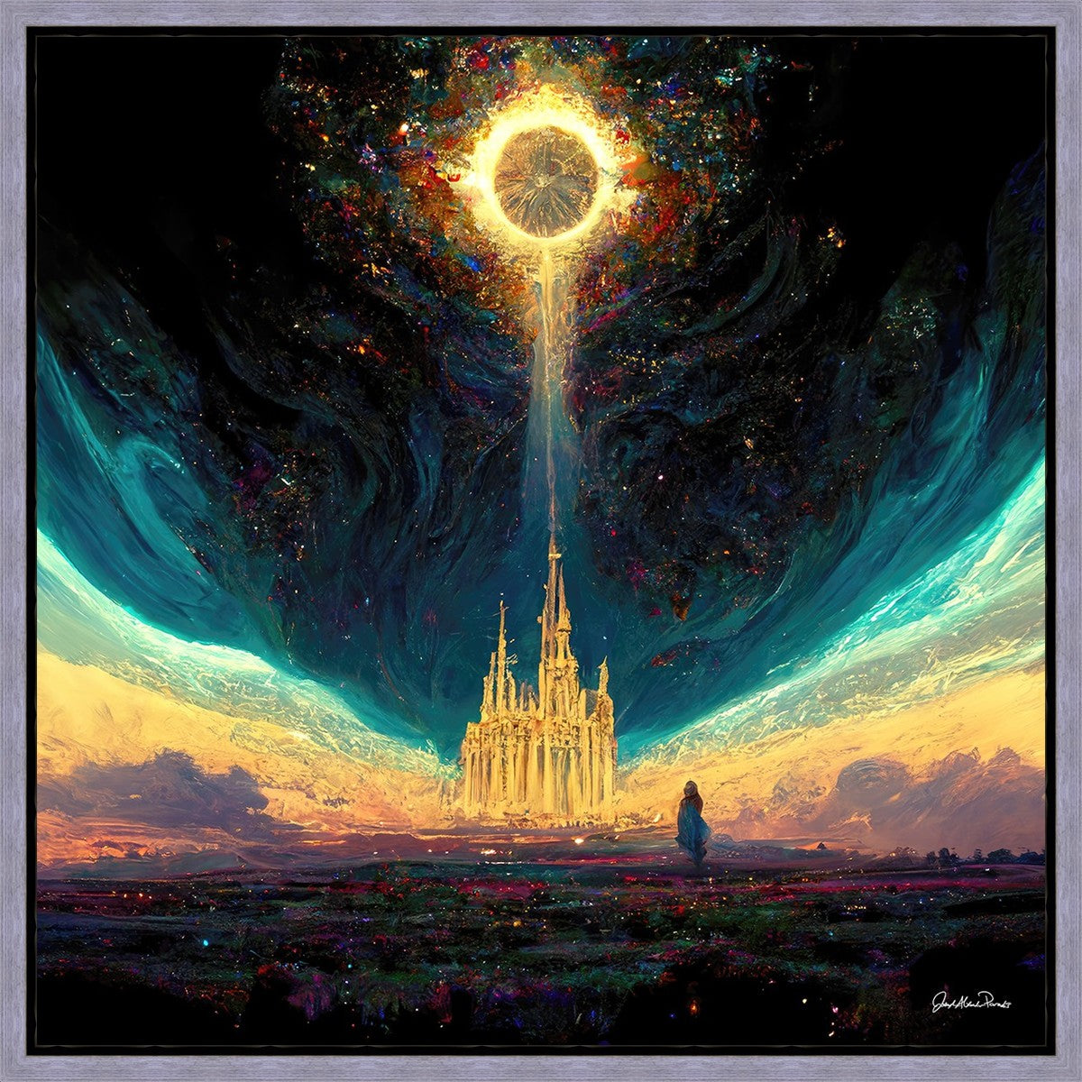 A depiction of the Light of Christ emanating from His throne down to all of His creations and His church. The wake of which, parts the clouds in similitude of the parting of the Red Sea. A solitary woman stands in the awe of this bewildering sight in which she is blessed to behold.
