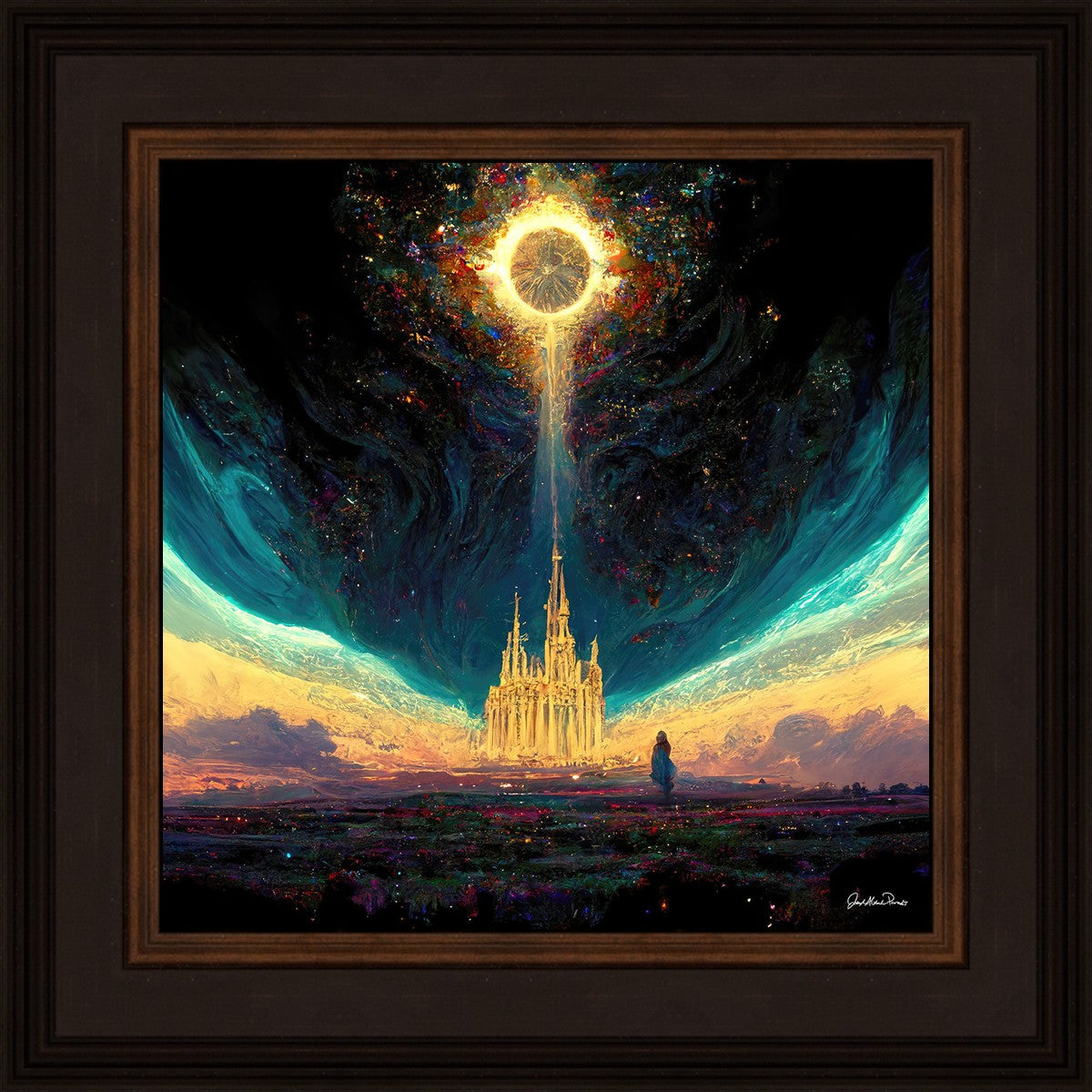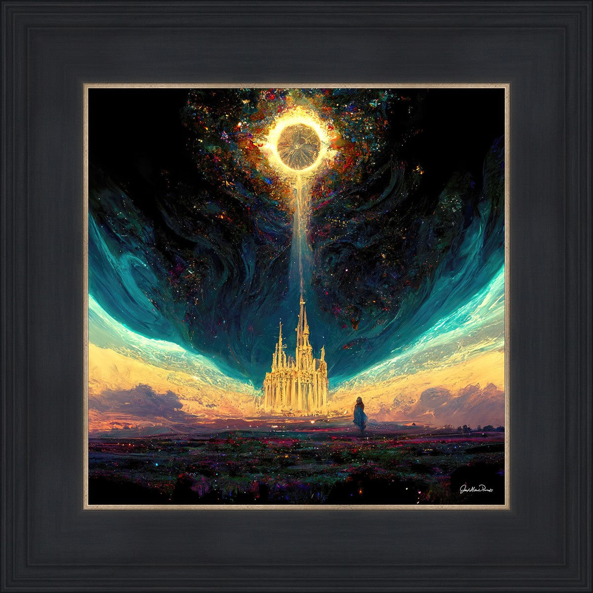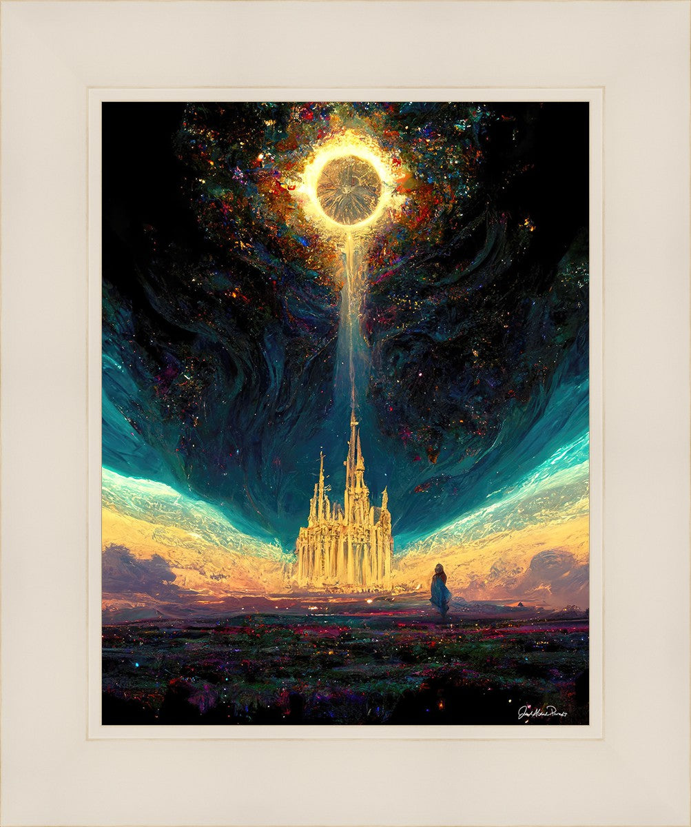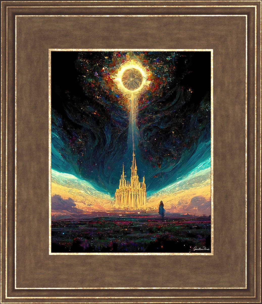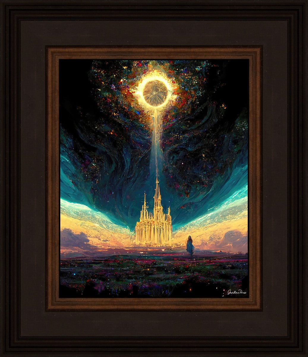 A depiction of the Light of Christ emanating from His throne down to all of His creations and His church. The wake of which, parts the clouds in similitude of the parting of the Red Sea. A solitary woman stands in the awe of this bewildering sight in which she is blessed to behold.