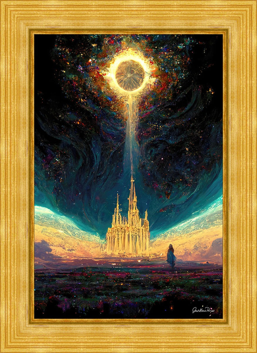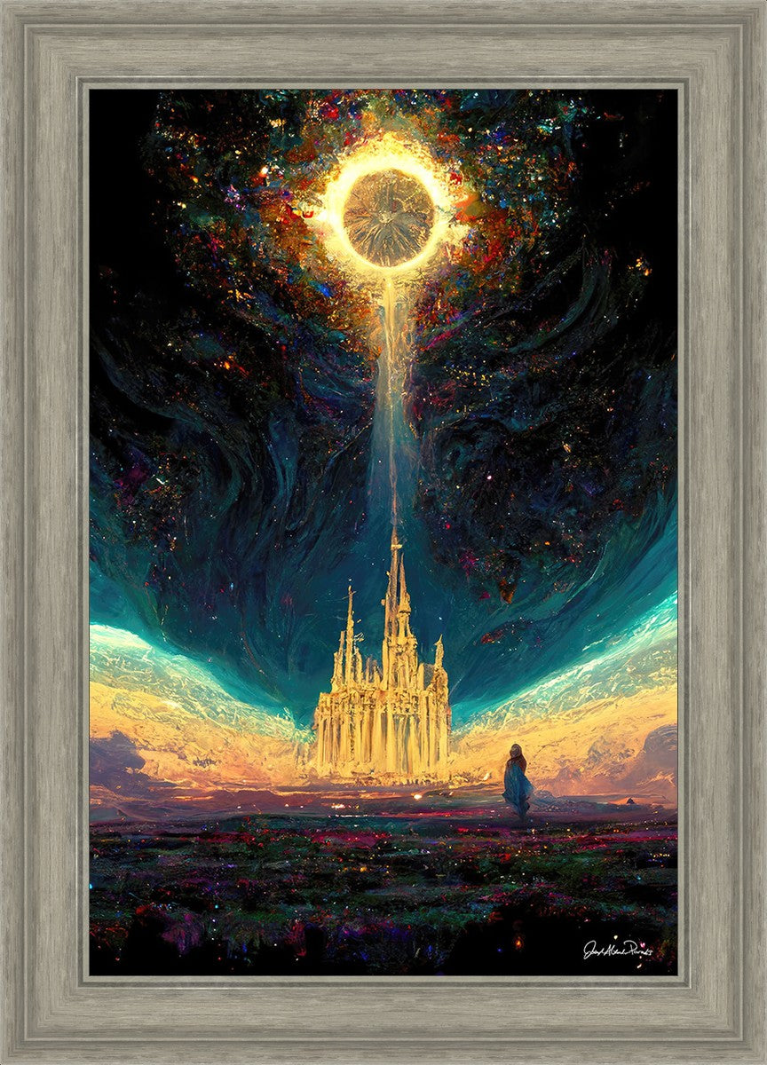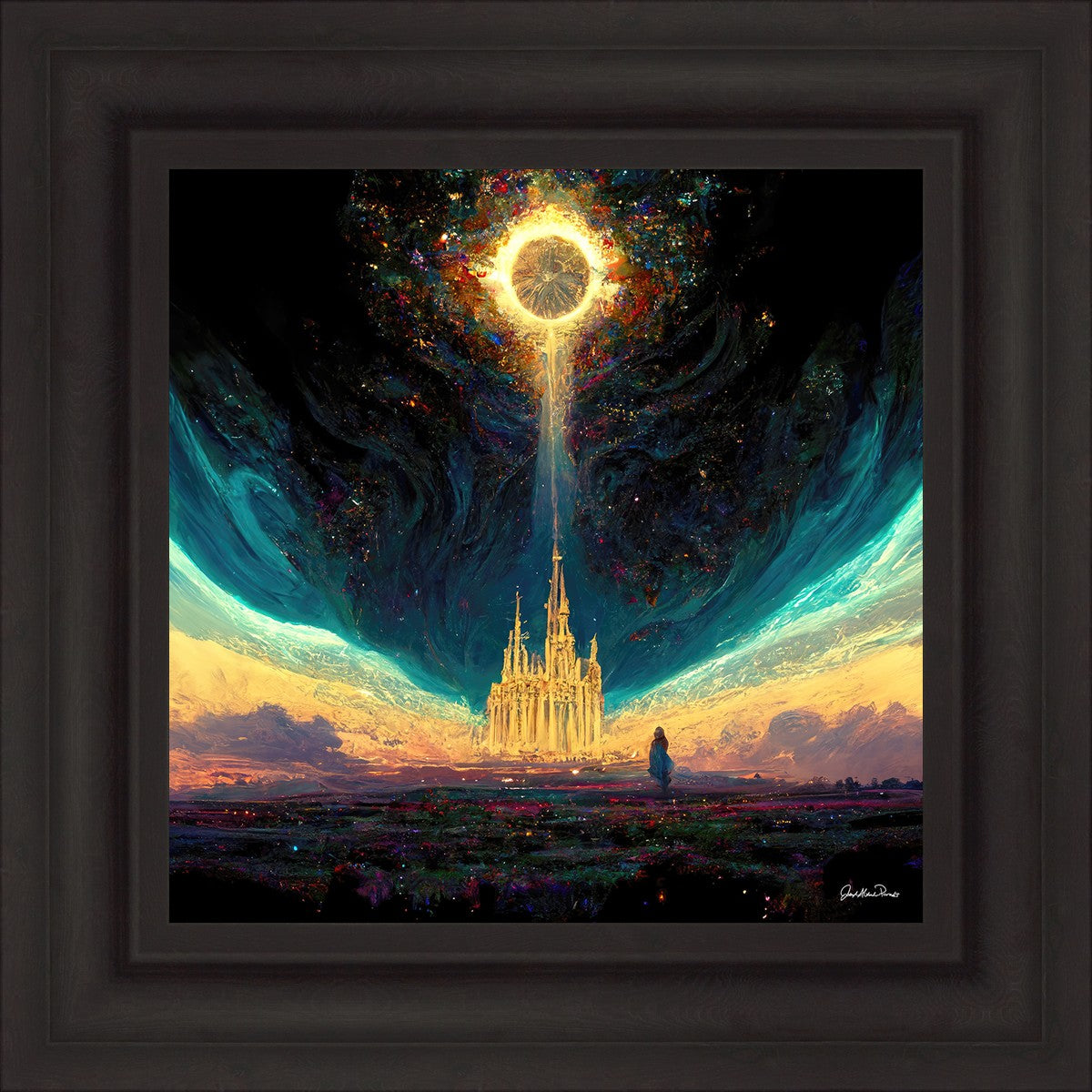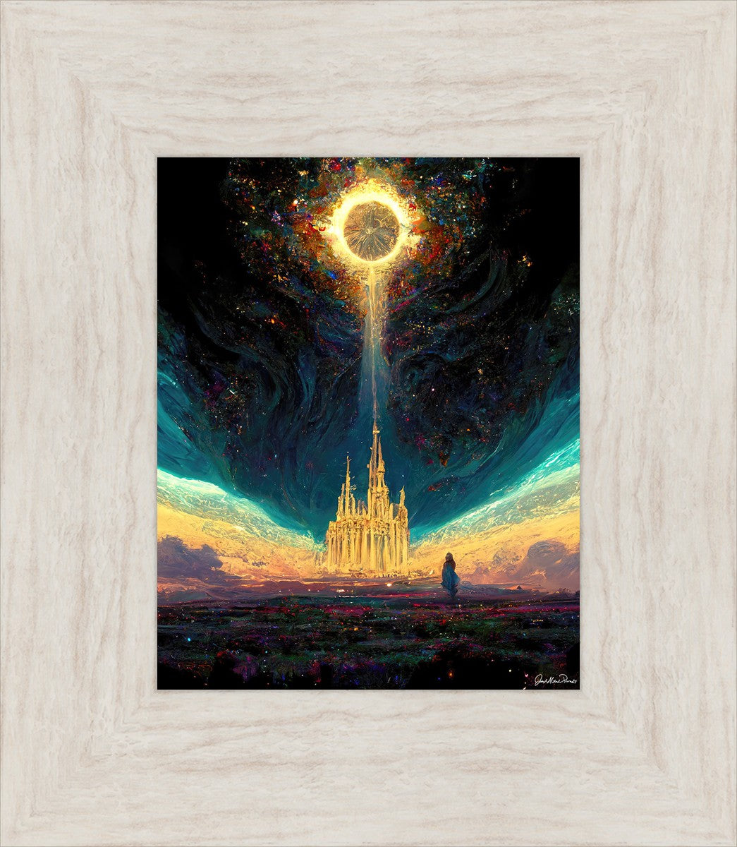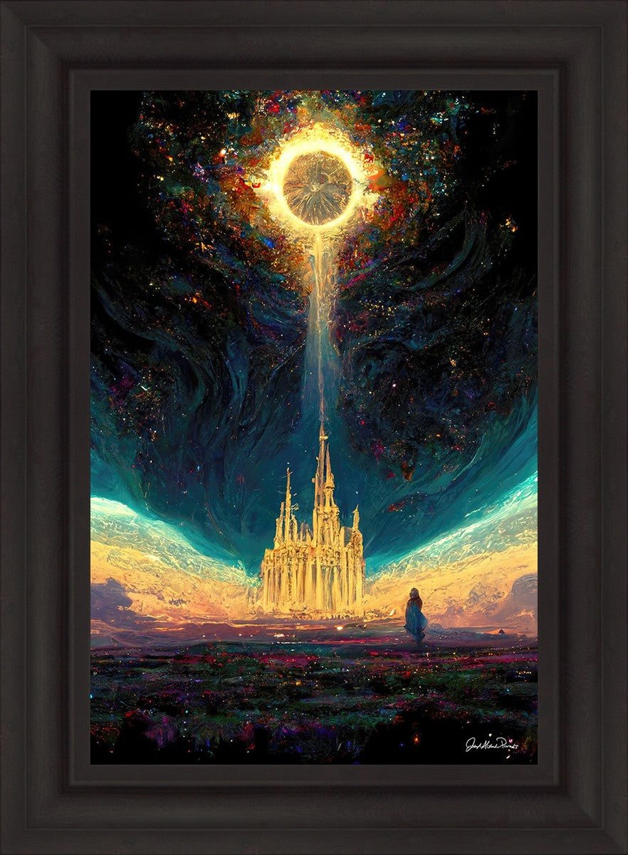 A depiction of the Light of Christ emanating from His throne down to all of His creations and His church. The wake of which, parts the clouds in similitude of the parting of the Red Sea. A solitary woman stands in the awe of this bewildering sight in which she is blessed to behold.